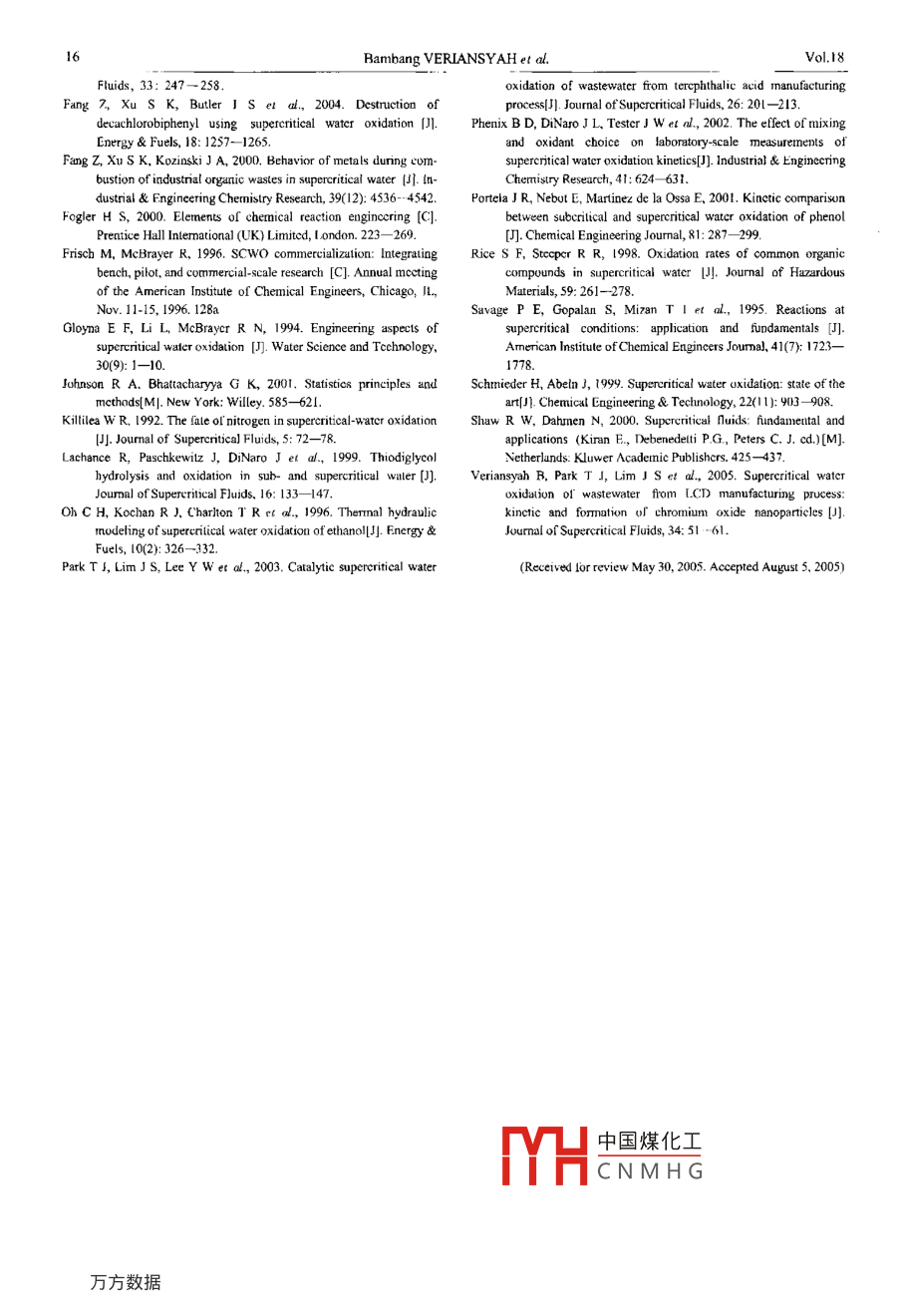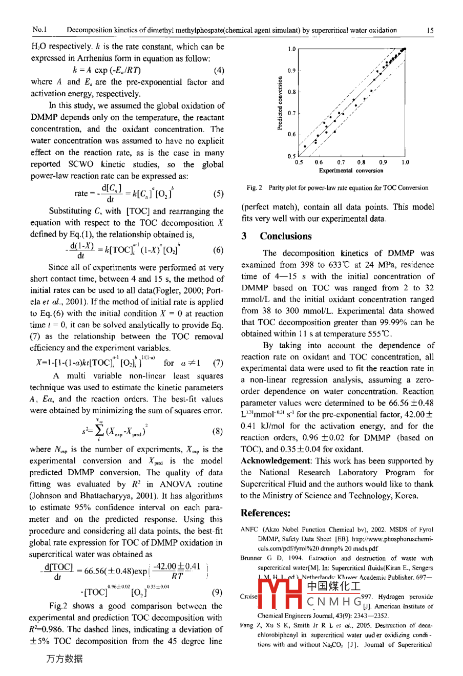 ISSN 1001-0742Jounnl of Emrironmental Sciences Vol. 18, No. 1, pp.13- 16, 2006CN 11-2629/XArticle ID: 1001-0742006)01-0013-04CIC mumber: X703Document code:ADecomposition kinetics of dimethyl methylphospate(chemical agentsimulant) by supercritical water oxidationBambang VERIANSY AH', Jae-Duck KIM', Youn-Woo LEE2(1. Supercnticat Fluid Research Laboratory, Korea lnstitute of Science and Tcchnology (KIST), 39-1 Hawolgok-dong, Seoungbuk-gu, Scoul 136-791,Korea. E-mail; jdkim@kisl.re.kr; 2. School o[ Chemical and Bivlogical Engineering. Seoul National University (SNU), San 56-1 Sllim-dong,Giwanak-gu, Seoul 151-744, Korea)Abstract: Supereritical water oxidation (SCWO) has been drawing much attention due t(0 effectively destroy a large variety ofhigb-risk wastes resulting from munitions demilitarization and complex industrial chemical. An imporant design consideration in ihedevelopment of supereritical water oxidation is the informnation of decomposition rate. In this paper, the decomposition rate ofdimethyl methylphosphonate(DMMP), which is similar to the nerve agent VX and GB(Sarin) in is struclure, was investigated underSCWo conditions. The experiments were performed in an isothermal lubular reactor with a H2O2 as an oxidant. The reactiontcmpcraturcs were ranged from 398 to 633"C at a fixed pressure of 24 MPa. The conversion of DMMP was monitored by analyzingtotal organic carbon (TOC) on the liquid efluent samples. It is found that the oxidative decomposition of DMMP proceeded rapidlyand a high TOC decomposition up to 9.99% was obtained within 11 s at 555C. On the basis of data derived from experiments, a .global kinetic cquation for the decomposition of DMMP was developed. The model predictions agreed well with the experimentalKeywords: supercritical water; oxidation kinetics; chemical agent; DMMPand Abeln, 1999; Gloyna et al., 1994; Savage el al.,lntroduction1995).Under the provisions of the 1993 InternationalKnowledge of the kinetics of the chemicalChemical Weapon Convention, all stockpiled chemi-reactions that occur during SCWO is required tocal warfare agents (CWAs) are to be irreversiblydesign and analyze SCWO reactors and process(Oh eldestroyed. Studies of supercritical water oxidational., 1996). This rcalization has motivated numerous(SCWO) for treating and destroying CWAs areprevious studies of SCWO kinetics, nearly all ofunderway in support of an international program forwhich havc conccntratcd in the kinetics of reactantthe destruction of these CWAs stockpiles. SCWO hasdisappearance. Simply making the reactant disappcar,een known as an efficient and clean technology forhowever, by converting into a sct of diffcrcnt organicthe treatment of aqueous organic wastes that derivescompounds is insufficicnt for waste treatment byits effectiveness from the unique solvent properties ofSCWO. Moreover, it is potcntially dangcrous if thewater at conditions well above its critical point ofproducts of incompletc oxidation arc more toxic OI374.3C and 22.1 MPa(Fang et al, 2005, 2004, 2000;hazardous than the starting material. [t is the oxidationVeriansyah et al, 2005; Park et al, 2003; Shaw andralc of the lotal organic carbon (TOC) to CO2, not theDahmen, 2000; Lachance et al., 1999; Rice anddisappearance ratc of the initial organic rcactant itself,Steeper, 1998). When organic compounds and oxygenwhich is of primary applicability to the commercialare brought together in supercritical water (SCW), theSCWO process (Frisch and McBrayer, 1996). Indeed,oxidation of the organic is rapid and complete todestruction and removal ofTOC is the utimate goal ofcarbonr dioxide and water. Heteroatom such as CI, S,some SCWO. Thus, the kinetics of TOCand P are converted to their corresponding mineraldisappearance assumes particular sigmificance.acids (HCl, H2SO4, and H,PO), which can beIn this paper we describe experiments ofneutralized by using a suitable base to produce salts ofdimethyl methylphosphonate(DMMP) which was desrelatively low solubility at supercritical conditions. Ifigned to identify kinetic oxidation rate in supcreriticalany organic nitrogen presents the resulting product iswater. DMMP was chosen as a simulant for the nerveprimarily molecular N2 with some N2O(Killilea, 1992).agent such as yX and GB since it is structurallyNOx gases, typicalundesired byproducts ofsimil中國煤化工operties that arecombustion processes, are not formed because thcomp|YHC N M H Qe chemical structuretemperature is too low for these oxidation pathways towhich can be descnbed DMMI', VX and GB is shownbe favored. Detailed reviews of the technology arein Fig.I where R and R2 are differing functionalavailable from Brunner (Brunner, 1994; Schmiedergroups. For DMMP, R: = OCH3 and R2= CH; for GB,4Bambang VERIANSYAH et al.Vo.18R=FandR:=CH(CH);andforVX,R,=a shell and tube heat exchanger and thenSCHLCH2N (C;H) and R2 = CH2CH3 Selected physi-depressurized to ambient condition by a back-prcssurecal properties of DMMP and Agent GB are listed inregulator (Tescom Co. 26-1721-24). The productTable l(ANFC, 2002).stream was then separated into liquid and vaporphases. The liquid products were collected in agraduated cylinder, and their volumetric flow rateswere mcasured at ambient laboratory conditions.1.2 Materials and analytical methodsRORzCHsDMMP (Aldrich, 97 wt. %) was the reagent usedin the experimcnts. Hydrogen peroxide (Junsei, 35%Fig. 1 Structure of chemical agent welfarew/v aqueous solution) was used as an oxidant. Dilutedoxidant solutions were preparcd using deionizedTable 1 Physical propertes of DMMP and GBwater. .DMMPMolecular weight124.08140.1The conccntration of DMMP and liquid-phaseBoiling point,心180158reactor efluents werc analyzed by TOC AnalyzerMeclting point, cPour poinl:<-50 -56(Shimadzu TOC-VCPN), which is based on combus-Density al 25C, g/ml .1.J71.09tion catalytic oxidation method and highly sensitiveSolubility in dsited water at 25C,MiscibieMisciblcnon-dispersive infrared (NDIR) gas analysis,/100grespectively. Destr