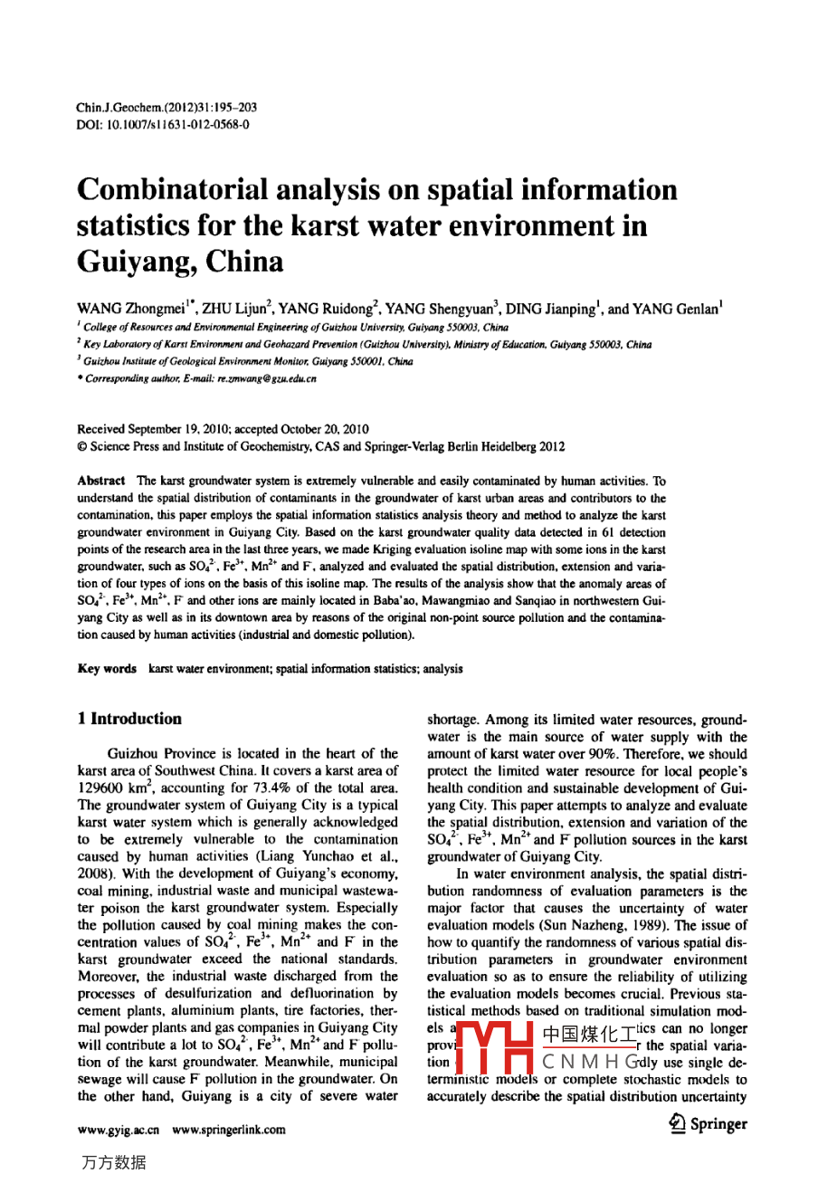 Chin.JGeochem.(2012)31:195- 203DOL: 10.1007/511631-012-0568-0Combinatorial analysis on spatial informationstatistics for the karst water environment inGuiyang, ChinaWANG Zhongmeil' , ZHU Lijun' , YANG Ruidong'. YANG Shengyuan', DING Jianping', and YANG Genlan'' College of Resources and Envionmental Engineering of Gutzhou Universiry, Giuiyang 50003, China2 Key Laboralory of Karsi Enmironment and Geohazard Preverion (Guizhou Universiry,. Ministry of Educarion, Gulyang 50003,. China3 Gwizhou lnsiute of Geological Environment Monion, Guiyang 50001.0 China●Coresponding author, E-mail: re.zmwang@gzu.edu.cnReceived September 19, 2010; accepted October 20. 2010◎Science Press and Institute of Gcochemistry. CAS and Springer-Verlag Berlin Heidelberg 2012Abstract The karst groundwater system is extremely vulnerable and easily contaninaled by human activities. Toundersland the spatial distribution of contaminants in the groundwater of karst urban areas and contributors to thecontamination, this paper employs the spatial informnation statistics analysis theory and method to analyze the karstgroundwater environment in Guiyang City. Based on the karsl groundwater quality data detected in 61 detectionpoints of the research area in the last three years, we made Kriging evaluation isoline map with some ions in the karstgroundwater, such as so. , Fe'*, Mn2+ and F, analyzed and evaluated the spatial distribution, extension and varia-tion of four types of ions on the basis of this isoline map. The results of the analysis show that the anomaly areas ofsoz",Fe2*, Mn2*.F and other ions are mainly located in Baba' a0. Mawangmiao and Sanqiao in northwestern Gui-yang City as well as in its downtown area by reasons of the original non-point source pollution and the contamina-tion caused by human activities (indutial and domestic pollution).Key words karst water environment; spaial information saisics; analysis1 Introductionshortage. Among its limited water resources, ground-water is the main source of water supply with theGuizhou Province is located in the heart of theamount of karst water over 90%. Therefore, we shouldkarst area of Southwest China. It covers a karst area ofprotect the limited water resource for local people's129600 km', accounting for 73.4% of the total area.health condition and sustainable development of Gui-The groundwalter system of Guiyang City is a typicalyang City. This paper attempts to analyze and evaluatekarst water system which is generally acknowledgedthe spatial distribution, extension and variation of theto be extremely vulnerable to the contaminationSO4", Fe", Mn' and F pollution sources in the karstcaused by human activities (Liang Yunchao et al..groundwater of Guiyang City.2008). With the development of Guiyang's economy,coal mining, industrial waste and municipal wastewa-bution randomness of evaluation parameters is theter poison the karst groundwater system. Especiallymajor factor that causes the uncertainty of waterthe pollution caused by coal mining makes the con-evaluation models (Sun Nazheng, 1989). The issue ofcentration values of so2, Fe'*, Mn2+ and F in thehow to quantify the randomness of various spatial dis-karst groundwater exceed the national standards.tribution parameters in groundwater environmentMoreover, the industrial waste discharged from theevaluation so as to ensure the reliability of utilizingprocesses of desulfurization and defluorination bythe evaluation models becomes crucial. Previous sta-cement plants, aluminium plants, tire factories, ther-tistical methods based on traditional simulation mod-mal powder plants and gas companies in Guiyang Cityels中國(guó)煤化工lics can no longerwill contributea lot to SO4 , Fe"*, Mn2* and F pollu-provithe spatial varia-tion of the karst groundwater. Meanwhile, municipaltionCNMHGdly use single de-MHsewage will cause F pollution in the groundwater. Onterministic models or complete stochastic models tothe other hand, Guiyang is a city of severe wateraccurately describe the spatial distribution uncertaintywww.gyig.ac.cn ww w.springerink .com勾Springer.196Chin.J.Geochem.(2012)31:195- 203of various parameters in water environmental assess-2.2 Evaluation model of spatial information statis-ment. Nevertheless, based on regionalized variableticstheory, spatial informnation statistics with variablefunction as its main tool is the science to study naturalThe model applied to analyzing the spatial varia-phenomena with randomness and structural character-tion of parameters in water environmental assessmentistics in their spatial distribution (Wang Renduo andshould help provide the structural information aboutHu Guangdao, 1989). As a result of applying this newspatial distribution parameters in water environmentalstatistical method, the deficiency of classical statisticsassessment, and practically display the spatial correla-in analysis on randomness of spatial distribution pa-tion of various evaluated parameters as well as therameters in water environmental assessment can bereciprocal transformational and synergic relationshipremedied, the spatial structural information and thebetween their randomness and structural characteris-spatial optimum estimation of the distributed parame-tics within the relevant spatial coverage. In actualters can be gained, and the analysis and evaluation ofpractice, we usually provide corresponding theoreticalthe spatial distribution uncertainty of various parame-models for discrele data of variable functions, in orderters in water environmental assessment tends to beto produce a quantitative analysis on the spatial varia-more rational. This paper thus adopts the spatial in-tion of parameters in water environmental assessment.formnation statistics theory and method to analyze andThe frequently used models are Spherical Model,evaluate the karst groundwater environment in Gui-Gaussian Model and Exponential Model (Zhangyang City.Zhengtong and Liu Shuchun, 1999; Jourmel and Hui-jbregts, 1982). Gaussia