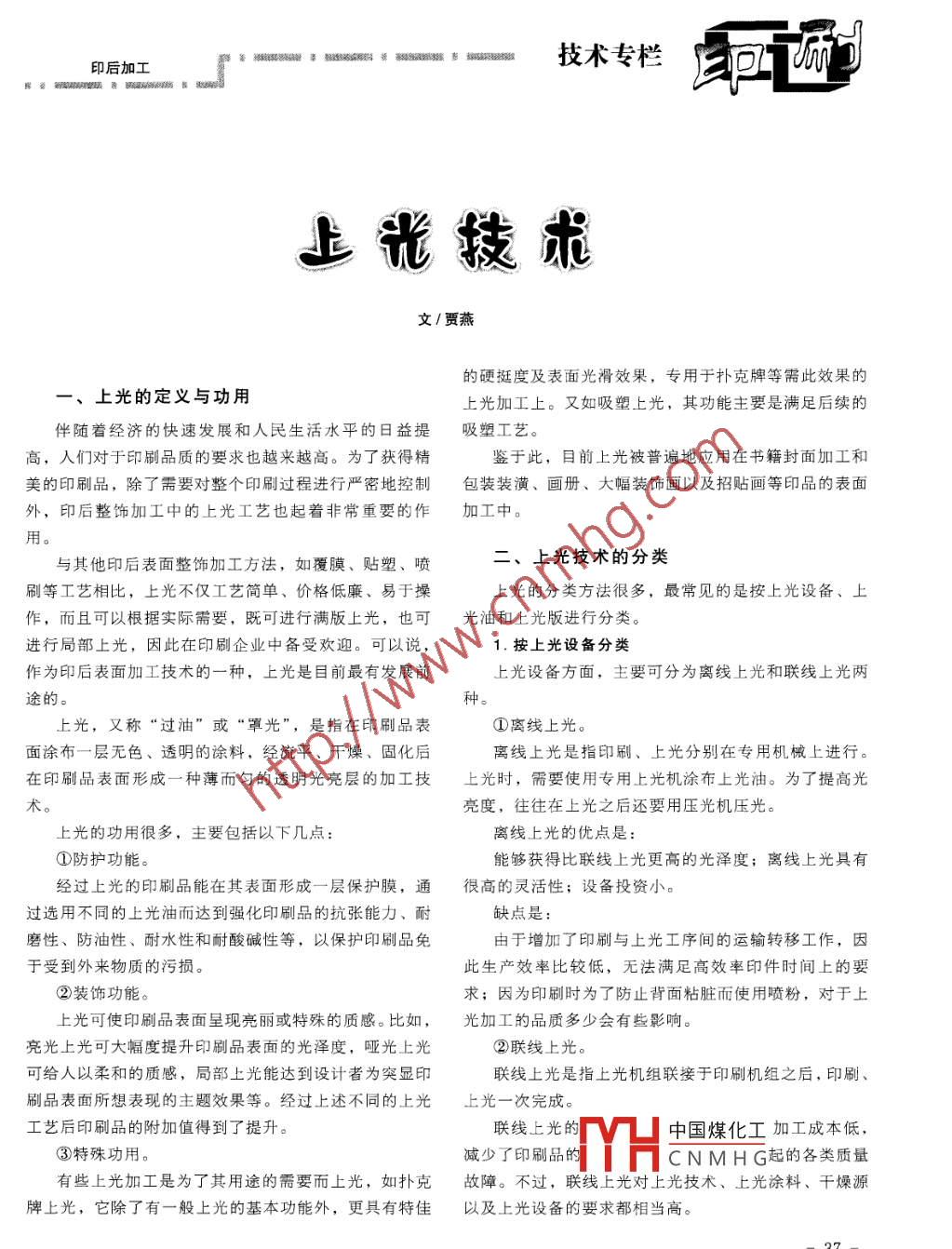 技術(shù)專欄印后加工面上張技術(shù)文/賈燕的硬挺度及表面光滑效果,專用于撲克牌等需此效果的一、上光的定義與功用上光加工上。又如吸塑上光,其功能主要是滿足后續(xù)的伴隨著經(jīng)濟(jì)的快速發(fā)展和人民生活水平的日益提吸塑工藝。高,人們對(duì)于印刷品質(zhì)的要求也越來越高。為了獲得精鑒于此,目前上光被普遍地應(yīng)用在書籍封面加工和美的印刷品,除了需要對(duì)整個(gè)印刷過程進(jìn)行嚴(yán)密地控制包裝裝潢、畫冊(cè)、大幅裝飾畫以及招貼畫等印品的表面外,印后整飾加工中的上光工藝也起著非常重要的作加工中。與其他印后表面整飾加工方法,如覆膜、貼塑、噴二、上光技術(shù)的分類.刷等工藝相比,上光不僅工藝簡單、價(jià)格低廉、易于操上光的分類方法很多,最常見的是按上光設(shè)備、上作,而且可以根據(jù)實(shí)際需要,既可進(jìn)行滿版上光,也可光油和上光版進(jìn)行分類。進(jìn)行局部上光,因此在印刷企業(yè)中備受歡迎??梢哉f,1.按上光設(shè)備分類作為印后表面加工技術(shù)的一種,上光是目前最有發(fā)展前上光設(shè)備方面,主要可分為離線上光和聯(lián)線上光兩途的。種。上光,又稱“過油”或“罩光”,是指在印刷品表①離線.上光。面涂布一層無色、透明的涂料,經(jīng)流平、干燥、固化后離線上光是指印刷、上光分別在專用機(jī)械上進(jìn)行。在印刷品表面形成一種薄而勻的透明光亮層的加工技上光時(shí),需要使用專用上光機(jī)涂布上光油。為了提高光術(shù)。亮度,往往在上光之后還要用壓光機(jī)壓光。上光的功用很多,主要包括以下幾點(diǎn):離線上光的優(yōu)點(diǎn)是:①防護(hù)功能。能夠獲得比聯(lián)線上光更高的光澤度;離線上光具有經(jīng)過上光的印刷品能在其表面形成一層保護(hù)膜,通很高的靈活性; 設(shè)備投資小。過選用不同的上光油而達(dá)到強(qiáng)化印刷品的抗張能力、耐缺點(diǎn)是:磨性、防油性、耐水性和耐酸堿性等,以保護(hù)印刷品免由于增加了印刷與上光工序間的運(yùn)輸轉(zhuǎn)移工作,因于受到外來物質(zhì)的污損。此生產(chǎn)效率比較低,無法滿足高效率印件時(shí)間上的要②裝飾功能。求;因?yàn)橛∷r(shí)為了防止背面粘臟而使用噴粉,對(duì)于上上光可使印刷品表面呈現(xiàn)亮麗或特殊的質(zhì)感。比如,光加工的品質(zhì)多少會(huì)有些影響。亮光上光可大幅度提升印刷品表面的光澤度,啞光上光②聯(lián)線.上光??山o人以柔和的質(zhì)感,局部.上光能達(dá)到設(shè)計(jì)者為突顯印聯(lián)線.上光是指上光機(jī)組聯(lián)接于印刷機(jī)組之后,印刷、刷品表面所想表現(xiàn)的主題效果等。經(jīng)過上述不同的上光上光一次完成。工藝后印刷品的附加值得到了提升。聯(lián)線上光的中國煤化工加工成本低,③特殊功用。減少了印刷品的HCNMHG起的各類質(zhì)量有些上光加工是為了其用途的需要而上光,如撲克故障。不過,聯(lián)線上光對(duì)上光技術(shù)、上光涂料、干燥源牌上光,它除了有一般上光的基本功能外,更具有特佳以及.上光設(shè)備的要求都相當(dāng)高。-37-廣東印刷2012.4技術(shù)專欄印后加工乖面2.按上光油分類涂布紫外線固化光油的優(yōu)點(diǎn)是:上光涂布中,最常用的上光油主要有三種:油基清可以產(chǎn)生極高的光澤度;徐層堅(jiān)固耐久,耐磨性和漆、水性光油和紫外線固化光油。耐化學(xué)品性能極佳;環(huán)保性好,幾乎不存在有機(jī)溶劑的①油基清漆。揮發(fā);只要紫外燈管能滿足使用要求,涂布在印品上的油基清漆的組成基本上和膠印油墨相同,但不含顏?zhàn)贤饩€固化光油就能即時(shí)干燥,因此生產(chǎn)效率高;可進(jìn)料,約含75%的固體成分。油基清漆的涂布大多采用行精確的局部上光。離線方式,在專門的上光機(jī)上進(jìn)行,有些還可經(jīng)過高溫涂布紫外線固化光油的缺點(diǎn)是:熱壓輥筒進(jìn)行壓光。油基清漆也可以像普通膠印油墨那機(jī)械設(shè)備費(fèi)用昂貴;紫外線固化光油成本高,消耗樣在普通的印刷機(jī).上聯(lián)線涂布。能量費(fèi)用也高;紫外線對(duì)人有傷害,而且固化時(shí)會(huì)產(chǎn)生油基清漆大部分通過化學(xué)(氧化)方法干燥,小部臭氧;印刷了普通膠印油墨的印刷品很難直按聯(lián)機(jī)涂布分通過物理方法干燥,即其中的礦物油被印刷紙張吸紫外線固化光油,必須占用兩個(gè)涂布上光單元,前一個(gè)收。氧化作用使涂布在印品表面的油基清漆形成一層堅(jiān)打底,后一個(gè)上光。Uv涂層難于回收分解。硬的聚合物薄膜,此薄膜是由樹脂和油類物質(zhì)組成的。3.按上光版分類氧化干燥過程一般需要幾個(gè)小時(shí)才能完成。若在油基清根據(jù)上光版面積的大小,上光可分為滿版上光和局漆中加入一些固體物料,并在干燥過程中進(jìn)行加熱和吹部上光。風(fēng),則可以加速聚合物薄膜的形成,提高干燥速度。①滿版上光。徐布油基清漆的優(yōu)點(diǎn)是:滿版上光是指對(duì)印品的整個(gè)版面進(jìn)行上光。滿版上壓光后平滑度和光澤度較高;使用簡單,處理方法光比較容易實(shí)現(xiàn)。從滿版上光版的使用情況來看,主要和一般的膠印油墨印刷-一樣;成本低;有普通膠印橡皮布和專用橡皮布兩種。徐布油