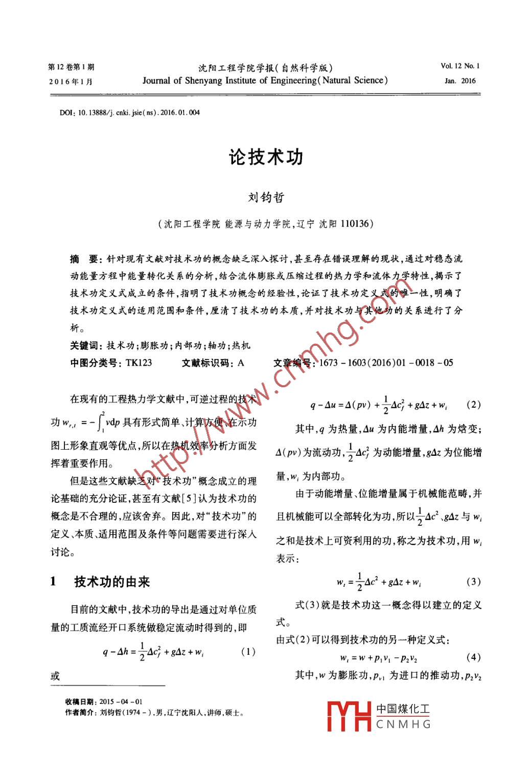 第12卷第1期沈陽工程學院學報(自然科學版)Vol. 12 No. I2016年1月.Jourmal of Shenyang Institute of Engineering( Natural Science)Jan. 2016DOI: 10. 1388/j cnki. jsie( ns).2016. 01.004論技術功劉鈞哲(沈陽工程學院能源與動力學院,遼寧沈陽110136)摘要:針對現有文獻對技術功的概念缺乏深入探討,甚至存在錯誤理解的現狀,通過對穩(wěn)態(tài)流動能量方程中能量轉化關系的分析,結合流體膨脹或壓縮過程的熱力學和流體力學特性,揭示了技術功定義式成立的條件,指明了技術功概念的經驗性,論證了技術功定義式的唯一性,明確了技術功定義式的適用范圍和條件,厘清了技術功的本質,并對技術功與其他功的關系進行了分析。關鍵詞:技術功;膨脹功;內部功;軸功;熱機中圖分類號: TK123文獻標識碼: A文章編號: 1673 - 1603(2016)01 -0018 -05在現有的工程熱力學文獻中,可逆過程的技術q-Su=O(pv) +20c;+gQz+w,(2)功w.. =-「,vdp具有形式簡單、計算方便、在示功其中,q為熱量,Ou為內能增量,Oh為焓變;圖上形象直觀等優(yōu)點,所以在熱機效率分析方面發(fā)Q(pv)為流動功,Ac}為動能增量,g4z為位能增揮著重要作用。但是這些文獻缺乏對“技術功”概念成立的理量,w為內部功。論基礎的充分論證,甚至有文獻[ 5]認為技術功的由于動能增量、位能增量屬于機械能范疇,并概念是不合理的,應該舍棄。因此,對“技術功”的且機械能可以全部轉化為功,所以一0c2、gOz 與w.定義本質、適用范圍及條件等問題需要進行深人之和是技術上可資利用的功,稱之為技術功,用w.討論。表示:技術功的由來w,=-0c2 +gOz +W;(3)目前的文獻中,技術功的導出是通過對單位質式(3)就是技術功這- - 概念得以建立的定義量的工質流經開口系統(tǒng)做穩(wěn)定流動時得到的,即式。由式(2)可以得到技術功的另-種定義式:q-Ah=-Ac} +gSz +w,w,=w+P1Vy - P2V2(4)中,W為膨脹功,Pv1為進口的推動功,P2收稿日期: 2015 -04-01作者簡介:劉鈞哲(1974-).男,遼寧沈陽人,講師,碩士。中國煤化工MHCNMH G.第1期劉鈞哲:論技術功為出口的推動功。相當于耗功機械的情況。對于可逆過程,式(3)、(4)中的技術功還可以根據這些判斷可以得出如下結論:表示為1)對于動力機,即w,>0時,如果一Sc2 + gAzw, =-|. vdp(5)<0,w,>0,必然導致w, < w,這就表明系統(tǒng)對外其中, w.,為可逆過程的技術功。界做功時,外界可資利用的功w,比實際利用的功w,還小,這顯然與技術功的定義相悖。2對技術功的分析2)對于耗功機械,即w, <0,如果一0c2 +8Qz2.1定義 式成立的條件<0,必然導致w,0。另外,從鍋爐過熱器和再熱器流穩(wěn)定流動能量方程中,一0c2、gAz的數值可正、可過來的蒸汽速度C不能很大,否則會導致振動噪聲以及過大的阻力損失;且c,也不能太小,否則會負、可為零,那么技術功定義式中一4c2、8Sz似乎導致設備尺寸太大,即c應為“經濟流速”。同時從汽輪機低壓缸排出的蒸汽速度C2不能太低,否也是可正、可負、可為零的,也即是說技術功的定義則很難推動轉子對外做功。于是,對于絕大多數情式成立與否,并不需要什么附加條件。既然技術功的定義是“技術上可資利用的況,就有C2 >C,從而號sc2≥0,因此必有一4c2 +功”,這就可以得出以下判斷:gAz≥0。實際工程的數據也證明了這一一點,例如某1)w, >0時,有可供外界利用的功,并且w;>蒸汽動力廠鍋爐蒸汽量為40 Vh,汽輪機進口速度0,這相當于動力機的情況。為70 m/s,出口速度為140 m/s,蒸汽進出口高差2)w, =0時,無可利用的功。.為1.6 m。中國煤化工:3)w, <0時,外界對工質做功,并且w,<0,這以耗功“壓氣機進出MYHCNMH G●20沈陽工程學院學報(自然科學版)第12卷口的尺寸相差不大,所以4c2≈0。壓氣機主要用致的一0c2≥0,8Az≥0為條件,并且保證這個條件于氣體的儲存和輸送,所以出口高度往往略高于進是成立的。由此也可以看出,技術功不是一一個理論口高度,所以gAz≥0。顯然,大多數情況下,壓氣上嚴格成立邏輯自洽的概念,它與焓熱量功、動機也是滿足這個條件的。能、位能等這一-類‘ 理論概念”不同,它是-一個基于對于動力機來說,工質離開動力機出口時,動工程實際的“經驗概念”。力機的一Sc2和gOz實際上都大于0,說明這兩者另外,使用技術功這一- 概念必須以熱功轉換為基本前提,換句話說,正是由于熱功轉換過程的特還沒有轉化為內部功。假如條件具備的話(實際點,決定了技術功的條件得以滿足;而后幾個概念上很難做得到) ,這兩者就可以由正值變?yōu)?(不可并不限于熱功轉換過程,對于非熱功轉換過程仍能能變?yōu)樨撝?,從而完全轉化為內部功。也就是成立。說,一0c2和8Qz變?yōu)閣;是-一個“虛擬式”,即處于2.2 技術功定義的形式實際工作狀態(tài)的動力機進出口的一4c2和gOz可流動功s(pv)也是機械能,也可以完全轉化為功,但在現有的文獻中,技術功的定義式卻不采用能并沒有變?yōu)?,但是它們理論上可以變?yōu)?,或者w,=Q(pv)+一0c2+gQz+w,的形式,其原因如.說在實踐上近似被看做0,從而完全轉化為內部功。同樣地,在耗功機械中,w,是實際發(fā)生的輸人功,它是由外界最初輸人的w',轉化而來,一Sc2和1)如前所述,熱機進出口的一0c≥0、8Sz≥0gOz也同樣由w':化而來。當工質離開壓氣機出口始終成立,也就是說w,中沒有現實地包含50c2時,壓氣機的號Sc2和8Sz實際上仍都大于0,說明和8Az。2)對于動力機來說,內部功的獲得要靠工質w'l中的-部分轉化成了一和gAz,假如條件具備膨脹來實現,由理想氣體可逆膨脹過程方程pv, =
