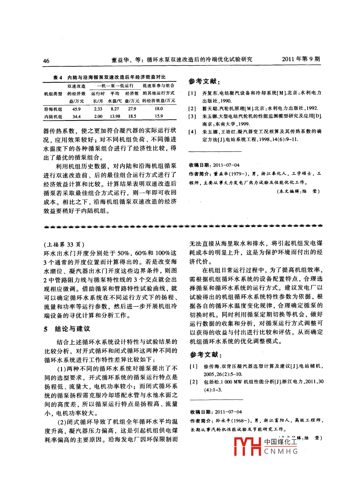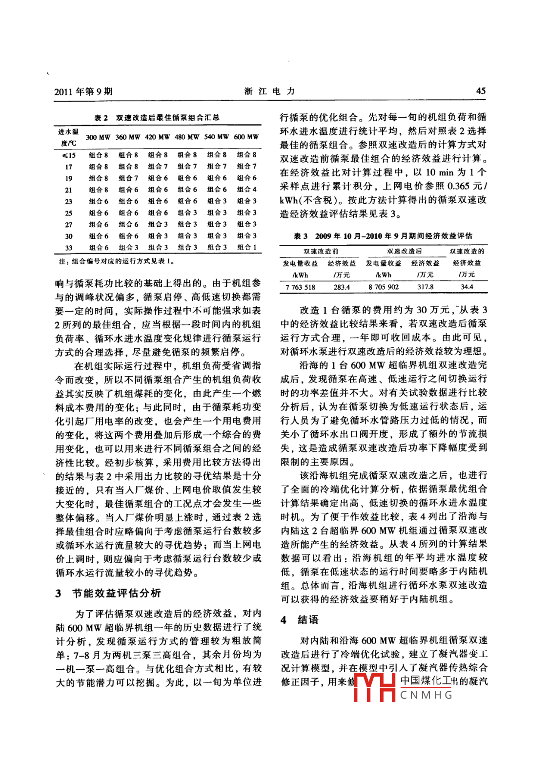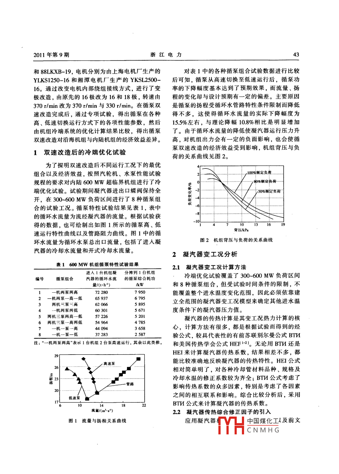 浙江電力42ZHEJIANG ELECTRIC POWER2011年第9期循環(huán)水泵雙速改造后的冷端優(yōu)化試驗研究董益華,樓可煒,孫永平,秦攀(浙江省電力試驗研究院,杭州310014)摘要:介紹了循環(huán)水泵雙速改造后的冷端優(yōu)化試驗情況,并結合理論分析對凝汽器進行了變工況計算。在理論計算過程中,引人了凝汽器傳熱綜合修正因子對別爾曼公式的傳熱系數(shù)進行了修正,使計算結果更加符合實際試驗情況,取得了較好的效果。根據(jù)循環(huán)水泵雙速改造后增加了高、低速切換運行功能的實際情況,重新進行冷端優(yōu)化計算,得出不同機組負荷、不同循環(huán)水進水溫度條件下的循環(huán)水泵最優(yōu)組合,分析了循環(huán)水泵雙速改造后可能產(chǎn)生的經(jīng)濟效益。關鍵詞:循環(huán)水泵;雙速改造;冷端優(yōu)化;傳熱計算;修正方法中圖分類號: TK264.1文獻標志碼: B文章編號: 1007-1881 (201 1)09 -0042-05Research on Optimization Tests of Cold-end System After Double-speed Retroftof Circulating Water PumpDONG Yi-hua', LOU Ke-wei', SUN Yong-ping', QIN Pan'(Zhejiang Electric Power Test and Research Istitute, Hangzhou 310014, China)Abstract: This paper introduces the optimization tests of cold-end system after the double-speed retroft of thecireulating water pump and carries out the calculation of variable working condition for the condenser throughthe theoretical analysis. It modifes the BTM heat transfer coefficient by introducing the comprehensive corec-tion factor of condenser heat transfer during theoretical calculation to make the calculation result conform toactual test situation and the desirable efect is achieved. The cold end system optimization calculation is per-formed again according to the actual situation that high and low-speed switching operation function is addedafter the retofit. The oplimal combination under different unit loads and circulating water inlet temperatures isobtained and the economic benefit after the retrofit is analyzed.Key words: eirculating water pump; double-speed retroft; optimization of cold- end system; heat transfercalculation; correction method式的選擇余地,從而可以獲得明顯的節(jié)能臧排效0引言益。從熱力循環(huán)角度可以認為冷端損失是制約發(fā)浙江省內(nèi)陸、沿海各有1臺600 MW超臨界電廠熱效率的主要影響因素,因此,如何降低冷機組于2010年進行了循泵的雙速改造,并進行端損失一直是節(jié)能降耗的重要方向。循環(huán)水泵(簡了冷端優(yōu)化試驗。內(nèi)陸機組的循環(huán)水系統(tǒng)為閉式稱循泵)的雙速改造是近些年一些發(fā)電廠循環(huán)水系系統(tǒng),沿海機組為開式系統(tǒng)。每臺機組均配置2統(tǒng)優(yōu)化的熱門方向之一,對原先僅靠增減循泵臺臺循泵,相鄰機組之間設中間聯(lián)絡閥,由此形成數(shù)來調(diào)節(jié)循環(huán)水流量的方式而言,將單轉速循泵了擴大單元制供水系統(tǒng)。改造成雙轉速后,豐富了調(diào)節(jié)手段,提供了不同兩家發(fā)電廠的循泵均為長沙水泵廠生產(chǎn)的立機組負荷、不同進水溫度下多種循泵組合運行方式單級導葉式"中國煤化工KXA-25.4YHCNMHG2011年第9期浙江電力43和88LKXB- -19,電機分別為由上海電機廠生產(chǎn)的對表1中的各種循泵組合試驗數(shù)據(jù)進行比較YLKS1250-16和湘潭電機廠生產(chǎn)的YKSL2500-后可知,循泵從高速切換至低速運行后,循泵功16。通過改變電機內(nèi)部繞組接線方式,進行了變率的下降幅度基本達到了預期效果,而流量、揚極改造,由原先的16極改為16和18極,轉速由程的變化卻與設計預期有一-定的偏差。主要原因370 r/min改為370 r/min與330 r/min。在循泵雙是循泵的揚程受循環(huán)水管路特性條件限制而降低速改造完成后,通過專項試驗,得出循泵在各種得不多,這使得循環(huán)水流量的實際下降幅度為高、低速切換運行方式下的各項性能參數(shù),然后15.5%左右,與理論降幅10.8%相比是明顯增加.由機組冷端系統(tǒng)的優(yōu)化計算結果比較,得出循泵了。由于循環(huán)水流量的降低使凝汽器運行壓力升雙速改造對沿海機組與內(nèi)陸機組的經(jīng)濟效益差異。高,對機組出力會有一定的負面影響,也會使循泵雙速改造的經(jīng)濟效益受到影響,機組背壓與負1雙速改造后的冷端優(yōu)化試驗荷的關系曲線見圖2。為了探明雙速改造后不同運行工況下的最優(yōu)組合以及經(jīng)濟效益,按照汽輪機、水泵性能試驗, 100%額定負荷規(guī)程的要求對內(nèi)陸600 MW超臨界機組進行了冷; 80%額定負荷.端優(yōu)化試驗。試驗期間凝汽器進出口蝶閥保持全,50%顆定負荷開,在300~600 MW負荷區(qū)間進行了8種循泵組合的試驗工況。循泵特性試驗結果見表1,表中的循環(huán)水流量為流經(jīng)凝汽器的流量。根據(jù)試驗獲-10得的數(shù)據(jù),也可繪制出如圖1所示的循泵高、低10131619背EkPa速運行特性曲線以及管路阻力曲線。圖1中的循環(huán)水流量為循環(huán)水泵總出口流量,包括了進入凝圖2機組背壓與負荷的關系曲線汽器的冷卻水流量和開式冷卻水流量。2凝汽 器變工況分析表1600MW機組循泵特性試驗結果進入1臺機組凝分攤到1 臺機組2.1凝汽器 變工況計算方法冷端優(yōu)化試驗覆蓋了300~600MW負荷區(qū)間循泵組合汽器的循環(huán)水流的循泵 綜合耗功量(.h)/kW和8種循泵組合,但受試驗時間條件的限制,不一機兩泵兩高72 2807 950能覆蓋整個進水溫度變化范圍,因此必須依靠建一機兩泵一高一低65 9376 795兩機三泵=