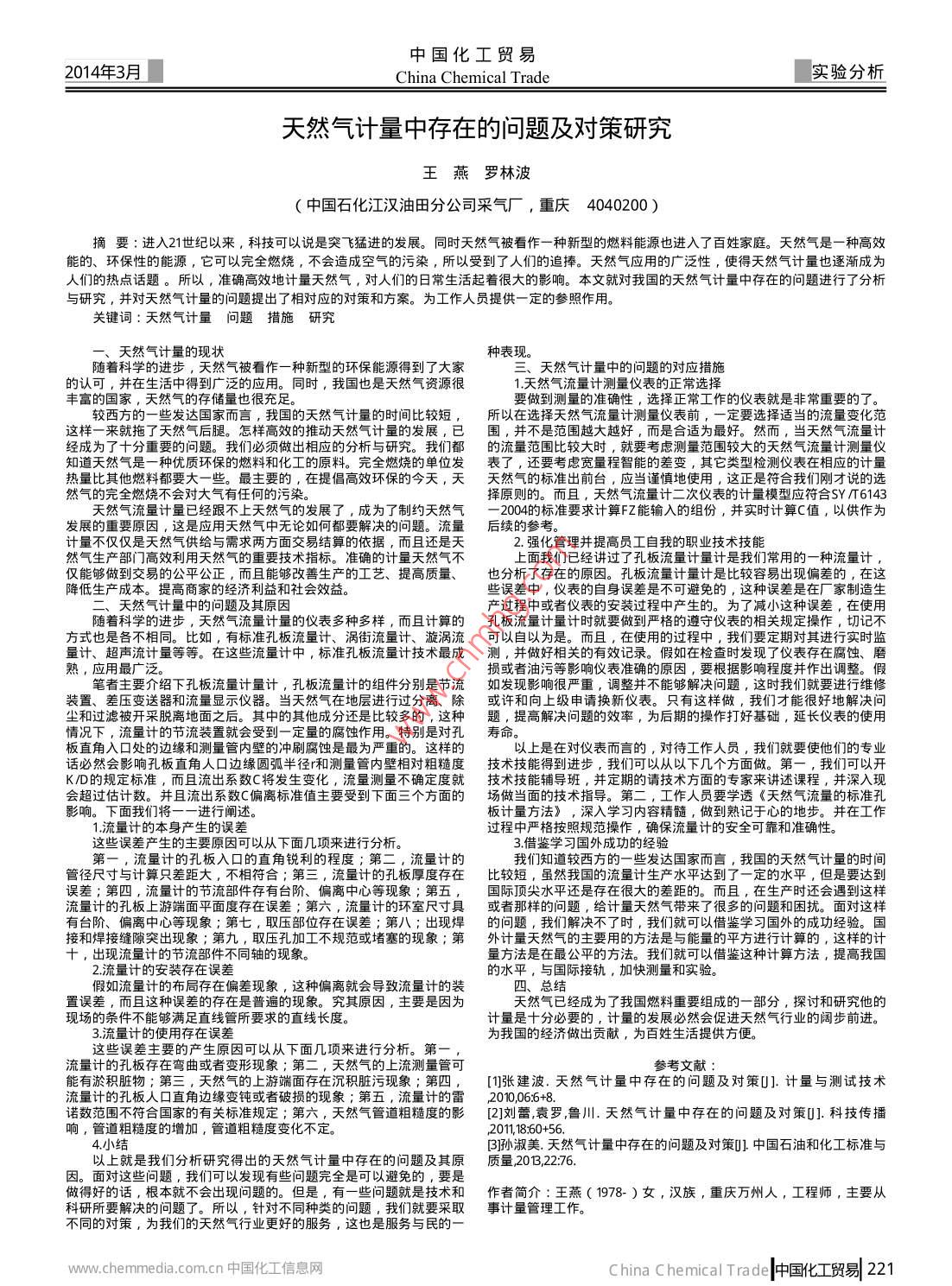 中國化工貿(mào)易2014年3月China Chemical Trade實(shí)驗(yàn)分析天然氣計(jì)量中存在的問題及對策研究王燕羅林波(中國石化江漢油田分公司采氣廠,重慶4040200 )摘要:進(jìn)入21世紀(jì)以來,科技可以說是突飛猛進(jìn)的發(fā)展。同時(shí)天然氣被看作- -種新型的燃料能源也進(jìn)入了百姓家庭。天然氣是一種高效能的、環(huán)保性的能源,它可以完全燃燒,不會(huì)造成空氣的污染,所以受到了人們的追捧。天然氣應(yīng)用的廣泛性,使得天然氣計(jì)量也逐漸成為人們的熱點(diǎn)話題。所以,準(zhǔn)確高效地計(jì)量天然氣,對人們的日常生活起著很大的影響。本文就對我國的天然氣計(jì)量中存在的問題進(jìn)行了分析與研究,并對天然氣計(jì)量的問題提出了相對應(yīng)的對策和方案。為工作人員提供一定的參 照作用。關(guān)鍵詞:天然氣計(jì)量問題措施研究、天然氣計(jì)量的現(xiàn)狀隨著科學(xué)的進(jìn)步,天然.種新型的環(huán)保能源得到了大家三、天然氣計(jì)量中的問題的對應(yīng)措施的認(rèn)可,并在生活中得到廣泛的應(yīng)用。同時(shí),我國也是天然氣資源很1.天然氣流量計(jì)測量儀表的正常選擇豐富的國家,天然氣的存儲(chǔ)量也很充足。要做到測量的準(zhǔn)確性,選擇正常工作的儀表就是非常重要的了。較西方的一些發(fā)達(dá)國家而言,我國的天然氣計(jì)量的時(shí)間比較短,所以在選擇天然氣流量計(jì)測量儀表前,-定要選擇適當(dāng)?shù)牧髁孔兓哆@樣一來就拖了天然氣后腿。怎樣高效的推動(dòng)天然氣計(jì)量的發(fā)展,已圍 ,并不是范圍越大越好,而是合適為最好。然而,當(dāng)天然氣流量計(jì)經(jīng)成為了十分重要的問題。我們必須做出相應(yīng)的分析與研究。我們都的流 量范圍比較大時(shí),就要 考慮測量范圍較大的天然氣流量計(jì)測量儀知道天然氣是一種優(yōu)質(zhì)環(huán)保的燃料和化工的原料。完全燃燒的單位發(fā)表了,還要考慮寬量程智能的差變,其它類型檢測儀表在相應(yīng)的計(jì)量熱量比其他燃料都要大一一些。最主要的,在提倡高效環(huán)保的今天,天天 然氣的標(biāo)準(zhǔn)出前臺(tái),應(yīng)當(dāng)謹(jǐn)慎地使用,這正是符合我們剛才說的選然氣的完全燃燒不會(huì)對大氣有任何的污染。擇原則的。而且,天然氣流量計(jì)二次儀表的計(jì)量模型應(yīng)符合SY /T6143天然氣流量計(jì)量已經(jīng)跟不上天然氣的發(fā)展了,成為了制約天然氣-2004的標(biāo)準(zhǔn) 要求計(jì)算FZ能輸入的組份,并實(shí)時(shí)計(jì)算C值,以供作為發(fā)展的重要原因,這是應(yīng)用天然氣中無論如何都要解決的問題。流量后續(xù)的參考。計(jì)量不僅僅是天然氣供給與需求兩方面交易結(jié)算的依據(jù),而且還是天2.強(qiáng)化管理并提高員工自我的職業(yè)技術(shù)技能然氣生產(chǎn)部門高效利用天然氣的重要技術(shù)指標(biāo)。準(zhǔn)確的計(jì)量 天然氣不上面我們已經(jīng)講過了孔板流量計(jì)量計(jì)是我們常用的- -種流量計(jì) ,僅能夠做到交易的公平公正,而且能夠改善生產(chǎn)的工藝、提高質(zhì)量、也分析了 存在的原因。孔板流量計(jì)量計(jì)是比較容易出現(xiàn)偏差的,在這降低生產(chǎn)成本。提高商家的經(jīng)濟(jì)利益和社會(huì)效益。些誤差中,儀表的自身誤差是不可避免的,這種誤差是在廠家制造生二、天然氣計(jì)量中的問題及其原因產(chǎn)過程中或者儀表的安裝過程中產(chǎn)生的。為了減小這種誤差,在使用隨著科學(xué)的進(jìn)步,天然氣流量計(jì)量的儀表多種多樣,而且計(jì)算的孔板流 量計(jì)量計(jì)時(shí)就要做到嚴(yán)格的遵守儀表的相關(guān)規(guī)定操作,切記不方式也是各不相同。比如,有標(biāo)準(zhǔn)孔板流量計(jì)、渦街流量計(jì)、漩渦流可以自 以為是。而且,在使用的過程中,我們要定期對其進(jìn)行實(shí)時(shí)監(jiān)計(jì)、超聲流計(jì)量等等。在這些流量計(jì)中,標(biāo)準(zhǔn)孔板流量計(jì)技術(shù)最成 測,并做好相關(guān)的有效記錄。假如在檢查時(shí)發(fā)現(xiàn)了儀表存在腐蝕、磨熟,應(yīng)用最廣泛。損或者油污等影響儀表準(zhǔn)確的原因,要根據(jù)影響程度并作出調(diào)整。假筆者主要介紹下孔板流量計(jì)量計(jì),孔板流量計(jì)的組件分別是節(jié)流如發(fā) 現(xiàn)影響很嚴(yán)重,調(diào)整并不能夠解決問題,這時(shí)我們就要進(jìn)行維修裝置、差壓變送器和流量顯示儀器。當(dāng)天然氣在地層進(jìn)行過分離、除或許和向上級(jí)申請換新儀表。只有這樣做,我們才能很好地解決問塵和過濾被開采脫離地面之后。其中的其他成分還是比較多的,這種題 ,提高解決問題的效率,為后期的操作打好基礎(chǔ),延 長儀表的使用青況下,流量計(jì)的節(jié)流裝置就會(huì)受到一定量的腐蝕作用。特別是對孔: 壽命。板直角入口處的邊緣和測量管內(nèi)壁的沖刷腐蝕是最為嚴(yán)重的。這樣的以 上是在對儀表而言的, 對待工作人員,我們就要使他們的專業(yè)話必然會(huì)影響孔板直角人口邊緣圓弧半徑r和測量管內(nèi)壁相對粗糙度技 術(shù)技能得到進(jìn)步,我們可以從以下幾個(gè)方面做。 第一,我們可以開K/D規(guī)定標(biāo)準(zhǔn),而且流出系數(shù)C將發(fā)