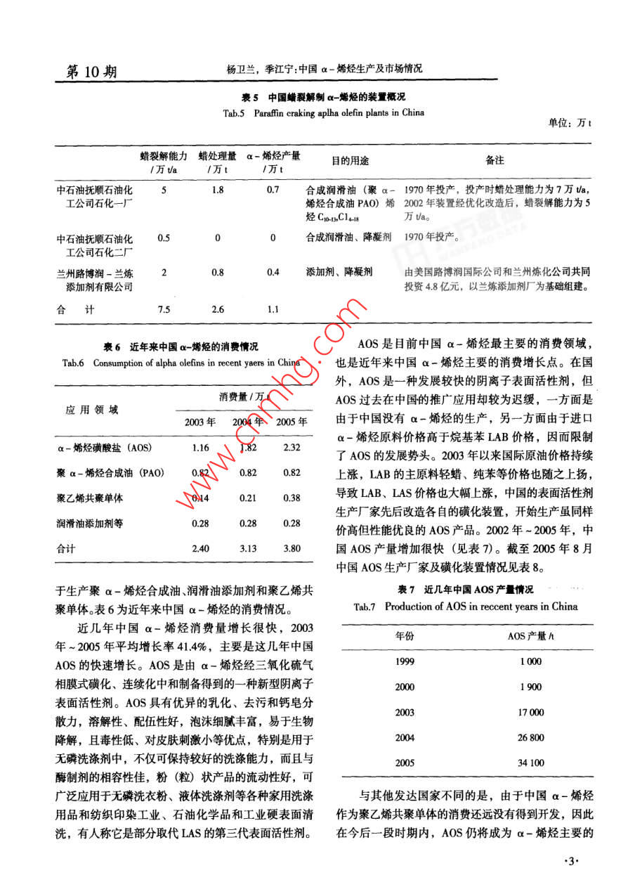 日用化學(xué)品科學(xué)第29卷表2全球 LAO生產(chǎn)商(截至2003年底)Tab.2 LAO producers in the world,2003生產(chǎn)商生產(chǎn)能力1萬(wàn)va工藝路線(xiàn)備注Ineos Chemical Pasadena,TX美國(guó)50.8B1992年7月投產(chǎn),1998年擴(kuò)產(chǎn), 2005年12月關(guān)閉。Jfre,Alberta加拿大24.9BP2001年底投產(chǎn)。Feluy比利時(shí)30.0BI1992年投產(chǎn)。Chevron Pillips Chemical LP (CPChem)70.3CPChem1997年1月從29.5萬(wàn)/a擴(kuò)產(chǎn)至34萬(wàn)Va, 2000 年第3CedarBayou,TX美國(guó)季度再擴(kuò)大34萬(wàn)Uao 2000年8月-套新的34萬(wàn)Ua的裝置投產(chǎn)。Idermitsu Petrochemical Company, Ltd.5.Idemitsu1989年投產(chǎn)。.Ichihara,ChibaPrefecture 日本Mitsubishi Chemical Corporation6.02001年擴(kuò)產(chǎn)。Kurashiki,Okayama Prefecture日本Nizhnekamskneftekhim Nizhnekamsk 俄羅過(guò)去產(chǎn)能為18萬(wàn)tla,僅生產(chǎn)1-己烯(以乙烯為原料)。斯Q-ChemMasaieed 卡塔爾4.72003年2月投產(chǎn)。Sasol Chemical Industries Secunda南非23.6煤氣化1994年投產(chǎn),目前僅有1-已烯和辛烯-1。Shell Chemnical Company Geismar,LA美國(guó)92.1Shell(SHOP) 2002 年擴(kuò)產(chǎn)。EllesmerePort英國(guó)33.0Shell(SHOP) 2003 年擴(kuò)產(chǎn)。合350表3 2003 年LAO分地區(qū)供求情況烴,但該裝置建成后一直沒(méi)生產(chǎn),其他以乙烯為原料Tab.3 Supply/demand of LAO by area, 2003生產(chǎn)a-烯烴的裝置仍處于試驗(yàn)階段。單位:萬(wàn)va中國(guó)目前仍以石蠟裂解法為主生產(chǎn)a-烯烴。北美西歐 俄羅斯南非卡塔爾日本合計(jì)主要生產(chǎn)廠有中石油下屬的撫順石化一廠、石油二廠能力238.1 63.0.023.64.11.8 350.2和蘭州路博潤(rùn)-蘭煉添加劑有限公司,總蠟裂解能力產(chǎn)量173.3 47.517.510.6 254.9為7.5萬(wàn)tla。 中國(guó)蠟裂解裝置蠟處理量約為2.6萬(wàn).進(jìn)口量0.7 24.8 01.6 27.1Va,年生產(chǎn)蠟裂解a-烯烴產(chǎn)品1.1萬(wàn)t,產(chǎn)品主要出口量29.74.5 3.4 17.03.0 57.6用于制造合成潤(rùn)滑油、降凝劑和潤(rùn)滑油添加劑。中國(guó)消費(fèi)量144.3 67.82.60.9.2 224.4蠟裂解制a-烯烴的裝置概況見(jiàn)表5。1980年,世界范圍內(nèi)采用熱裂解法制a-烯烴表4 2003年世界主要地區(qū)LAO消費(fèi)情況的有美國(guó)、法國(guó)和荷蘭等國(guó),生產(chǎn)能力約30萬(wàn)UaoTab.4 Consumption of LAO by main areas of world, 2003國(guó)外由于原料精蠟的來(lái)源有限以及a-烯烴產(chǎn)品質(zhì).北美1%西歐1%日本1%量差,隨著乙烯低聚法的發(fā)展,熱裂解法已逐漸被淘聚乙烯共聚單體39.832.458.7汰。到1986年,美國(guó)和西歐的蠟裂解生產(chǎn)裝置已全合成醇25.830.27.6部停產(chǎn),改用乙烯低聚法制取高質(zhì)量的a-烯烴。PAO12.328.94中國(guó)c-烯烴消費(fèi)情況其他22.18.533.7中國(guó)a-烯烴(含蠟裂解a-烯烴和進(jìn)口a-烯合計(jì)10000烴產(chǎn)品)主要用于生產(chǎn)a-烯烴磺酸鹽AOS,其次用.2.第10期楊衛(wèi)蘭,季江寧:中國(guó)a-烯烴生產(chǎn)及市場(chǎng)情況表5中國(guó)蠟裂解制a烯烴的裝t概況Tab.5 Parafin craking aplha olein plants in China單位:萬(wàn)t蠟裂解能力蠟處理量 a-烯烴產(chǎn)量目的用途備注1萬(wàn)tla1萬(wàn)t中石油撫順石油化1.8).7合成潤(rùn)滑油(聚a- 1970 年投產(chǎn),投產(chǎn)時(shí)蠟處理能力為7萬(wàn)tla,工公司石化一廠烯烴合成油PAO)烯2002 年裝置經(jīng)優(yōu)化改造后,蠟裂解能力為5烴Crors,C1ui8萬(wàn)Vao0.50合成潤(rùn)滑油、降凝劑1970 年投產(chǎn)。工公司石化二廠蘭州路博潤(rùn)-蘭煉0..4添加劑、降凝劑由美國(guó)路博潤(rùn)國(guó)際公司和蘭州煉化公司共同添加劑有限公司投資4.8億元,以蘭煉添加劑廠為基礎(chǔ)組建。合計(jì)7.52.6.1表6近年來(lái)中國(guó)ax烯烴的消費(fèi)情況AOS是目前中國(guó)a-烯烴最主要的消費(fèi)領(lǐng)域,Tab.6 Consumption of alpha olefins in recent yaers in China也是近年來(lái)中國(guó)a-烯烴主要的消費(fèi)增長(zhǎng)點(diǎn)。在國(guó)外,AOS 是一種發(fā)展較快的陰離子表面活性劑,但消費(fèi)量/萬(wàn)tAOS過(guò)去在中國(guó)的推廣應(yīng)用卻較為遲緩,一方面是應(yīng)用領(lǐng)域2003年2004年 2005 年由于中國(guó)沒(méi)有a-烯烴的生產(chǎn),另一方面由于進(jìn)口a-烯烴原料價(jià)格高于烷基苯LAB價(jià)格,因而限制a-烯烴磺酸鹽(AOS)1.161.822.32了AOS的發(fā)展勢(shì)頭。2003 年以來(lái)國(guó)際原油價(jià)格持續(xù)聚a-烯烴合成油(PAO)0.82上漲,LAB的主原料輕蠟、純苯等價(jià)格也隨之上揚(yáng),導(dǎo)致LAB、LAS價(jià)格也大幅上漲,中國(guó)的表面活性劑聚乙烯共聚單體0.140.210.38生產(chǎn)廠家先后改造各自的磺化裝置,開(kāi)始生產(chǎn)雖同樣潤(rùn)滑油黍加劑等0.28價(jià)高但性能優(yōu)良的AOS產(chǎn)品。2002 年~ 2005年,中2.403.133.80國(guó)AOS產(chǎn)量增加很快(見(jiàn)表7)。截至2005年8月中國(guó)AOS生產(chǎn)廠家及磺化裝置情況見(jiàn)表8。于生產(chǎn)聚a-烯烴合成油、潤(rùn)滑油添加劑和聚乙烯共表7近幾年中國(guó)AOS產(chǎn) 情況聚單體。表6為近年來(lái)中國(guó)u -烯烴的消費(fèi)情況。Tab.7 Production of AOS in reccent years in China近幾年中國(guó)a-烯烴消費(fèi)量增長(zhǎng)很快,2003年份AOS產(chǎn)量h年~ 2005年平均增長(zhǎng)率41.4%,主要是這幾年中國(guó)AOS的快速增長(zhǎng)。AOS是由a-烯烴經(jīng)三氧化硫氣19991000相膜式磺化、連續(xù)化中和制備得到的- -種新型陰離子0001 900表面活性劑