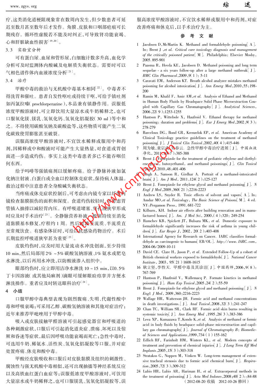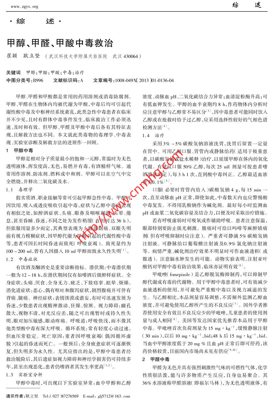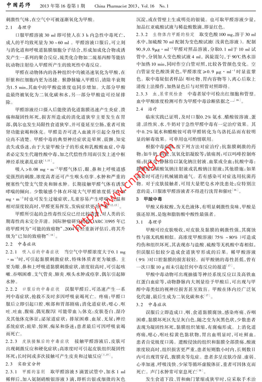 中國藥師2013年第16卷第1期China Pharmacist 2013, Vol.16 No. 1刺激性氣味,在空氣中可被逐漸氧化為甲酸。沉淀,或在管壁上生成明亮的銀鏡。也可取甲醛溶液少量,2.1毒理學加品紅亞硫酸試液與稀鹽酸數(shù)滴,即顯紅色。口服甲醛溶液30 ml即可使人在3 h內(nèi)急性中毒死亡,2.3.2 生物體內(nèi)甲醛的檢定 取變色酸100 mg,溶于30 ml成人的平均致死量為30~60 ml。甲醛溶液口服后,可立刻水中,加硫酸70 ml配制為變色酸試液(淺黃色溶液)。配制與消化道和呼吸道黏膜細胞分子結(jié)合,形成加成化合物或誘90,9,0.9μg.ml-'甲醛對照品溶液,分取0.1ml于10ml試.發(fā)產(chǎn)生一系列的聚合反應,巰類化合物如二巰基丙醇等能拮管中,分別加入變色酸試液4 ml,渦旋混勻,于90C熱水浴抗動物注射給人甲醛所產(chǎn)生的致死性中毒反應。中加熱10 min,同時作空白管對照,比較各管顏色變化??占兹┰趧游矬w內(nèi)的各種組織中均被迅速氧化為甲酸,在白管顯變色酸淡黃色,甲醛濃度≥0.9 μg●ml-' 時顯藍紫肝臟和紅細胞內(nèi)更為迅捷。猴靜脈輸人甲醛后,清除半衰期色。取中毒疑似者樣品(嘔吐物、胃內(nèi)容物等),離心后取上為1.5min,其血中的甲酸鹽濃度也同步增加。大部分甲酸清按上法操作,加熱顯色后與對照管對照即得。鹽最終被氧化為二氧化碳和水,另--部分甲酸鹽可經(jīng)尿排2.3.3血、尿常規(guī)檢查中毒者尿中可檢出紅細胞和管型。余。血中甲酸濃度檢測可作為甲醛中毒診斷依據(jù)之-I16]。甲醛溶液經(jīng)口攝人后能使消化道黏膜迅速產(chǎn)生炎癥、潰2.4治療瘍和凝固性壞死,損害所造成的消化道狹窄主要發(fā)生在胃臨床實踐已證明,及時口服0.2%氨水、醋酸銨溶液、蛋部,偶爾也發(fā)生局限性食道狹窄,并可蔓延至空腸,重者可致清、活性炭、水、牛奶對于急性甲醛中毒有- -定治療效果。其腎功能衰竭和休克。甲醛是否可進人血液并引起全身性反中0.2%氨水和醋酸銨可將甲醛轉(zhuǎn)化為烏洛托品而有較明應尚不清楚。甲醛中毒的典型神經(jīng)癥狀是暈厥、震顫、知覺顯的解毒效果??蓡斡靡部勺们槁?lián)用。喪失或昏迷,由于大量甲酸分子的形成和乳酸酸血癥,中毒根據(jù)中毒癥狀,按下列方法對癥治療:抗黏膜刺激的藥者必定發(fā)生代謝性酸中毒,加之代償性作用而引發(fā)上述中樞物:如牛奶、雞蛋、氫氧化鋁凝膠等;鎮(zhèn)痛劑:可以嗎啡控制疼神經(jīng)系統(tǒng)紊亂癥狀[ 11.痛;抗休克:靜脈給以氯化鈉注射液、血漿或全血;抗酸中毒:吸人>0.08 mg●m-3甲醛氣體后,眼、鼻和上呼吸道感靜脈給以碳酸氫鈉注射液或乳酸鈉注射液;其他措施:如果覺強烈的刺激,濃度高者還可產(chǎn)生喉頭痙攣、水腫和嚴重的需要時可進行機械輔助通氣。若有感染可對癥選用抗菌藥梗塞性氣管支氣管炎和肺水腫。長期接觸甲醛氣體有誘發(fā)物。對于皮膚接觸者,可用大量肥皂水沖洗患處;應特別注哮喘的傾向。少數(shù)敏感個體在環(huán)境大氣甲醛濃度低于0.08.意的是,口服濃甲醛溶液者不得進行洗胃和催吐16]mg. m-3時也可發(fā)生過敏癥狀,兒童容易產(chǎn)生哮喘,氣溫和.3甲酸中毒相對濕度較高時,甲醛更易揮發(fā),發(fā)病癥狀更為嚴重12.31。甲酸又稱蟻酸,為無色液體,有明顯刺激性臭味,甲酸是甲醛所引起的急性毒性反應已經(jīng)比較清楚,對人類的長強還原劑,是飽和脂肪酸中酸性最強者。期毒性尚未完全弄清。國際腫瘤研究機構(gòu)(IARC)1995年已3.1 毒理學將甲醛列為“可能的致癌物”,2004年經(jīng)重新評估后,將其升甲酸可經(jīng)皮膚吸收,對皮膚及黏膜的刺激性強,其腐蝕級為“已知的致癌物”[14]。性與強無機酸相似。高濃度甲酸溶液(75%~80%)可造成2.2中毒癥狀灼傷和組織壞死,其表現(xiàn)亦與鹽酸硫酸等無機酸中毒相似,2.2.1吸入后的中毒癥狀 當空氣中甲醛濃度大于0.1 mg但誤服后似較少造成食道狹窄形成的后果。稀甲酸溶液,m-3時,可引起黏膜刺激癥狀,特殊體質(zhì)者更為敏感。主( 9% )對口腔黏膜的損害較輕。而甲酸鈉的毒性甚低, 曾有要為眼、鼻和上呼吸道黏膜刺激癥狀,濃度較高時,可引起咳-次口服10g而未引起任何中毒反應的報道71。嗽、吞咽困難、支氣管炎、肺炎、喉頭水腫或痙攣,偶爾引起肺甲酸中毒動物可出現(xiàn)抽搐等神經(jīng)系統(tǒng)反應以及高鐵血水腫。紅蛋白血癥等,動物靜脈內(nèi)大劑量給予甲酸后,可出現(xiàn)與甲2.2.2口服后的中毒癥狀 誤服甲醛后 ,可迅速產(chǎn)生一系醇中毒類似的視神經(jīng)損害甚至致盲。甲酸在體內(nèi)經(jīng)廣泛氧列中毒癥狀,搶救不及時多因呼吸衰竭死亡。疼痛:甲醛口化代謝,最后生成為二氧化碳和水[7。服后立即引起口腔、喉部和胃部劇痛;消化道癥狀:嗯心、嘔3.2 中毒癥狀吐吐血腹痛、偶見腹瀉(可能帶血);休克:皮膚蒼白、濕冷誤服后立即造成口、咽、食道黏膜腐蝕,感染疼痛、吞咽及其他休克體征;泌尿道癥狀:排尿困難、血尿、無尿;神經(jīng)困難,黏膜壞死區(qū)先呈灰白色,隨之變?yōu)榛液谏珷?少數(shù)患者系統(tǒng)癥狀:眩暈、驚厥、癡呆和昏迷;患者最后可因呼吸衰竭表現(xiàn)為凝固性壞死,黏膜組織皺縮,有腐痂形成。上消化道而死亡。疼痛,唔心,嘔吐棕黃色黏狀物,胃出血明顯時,可吐鮮血。2.2.3皮膚接觸后的中毒癥狀 接觸甲醛溶液后,皮膚可患者自覺極度口渴。遭酸侵蝕的組織和黏膜全部潰瘍,酸