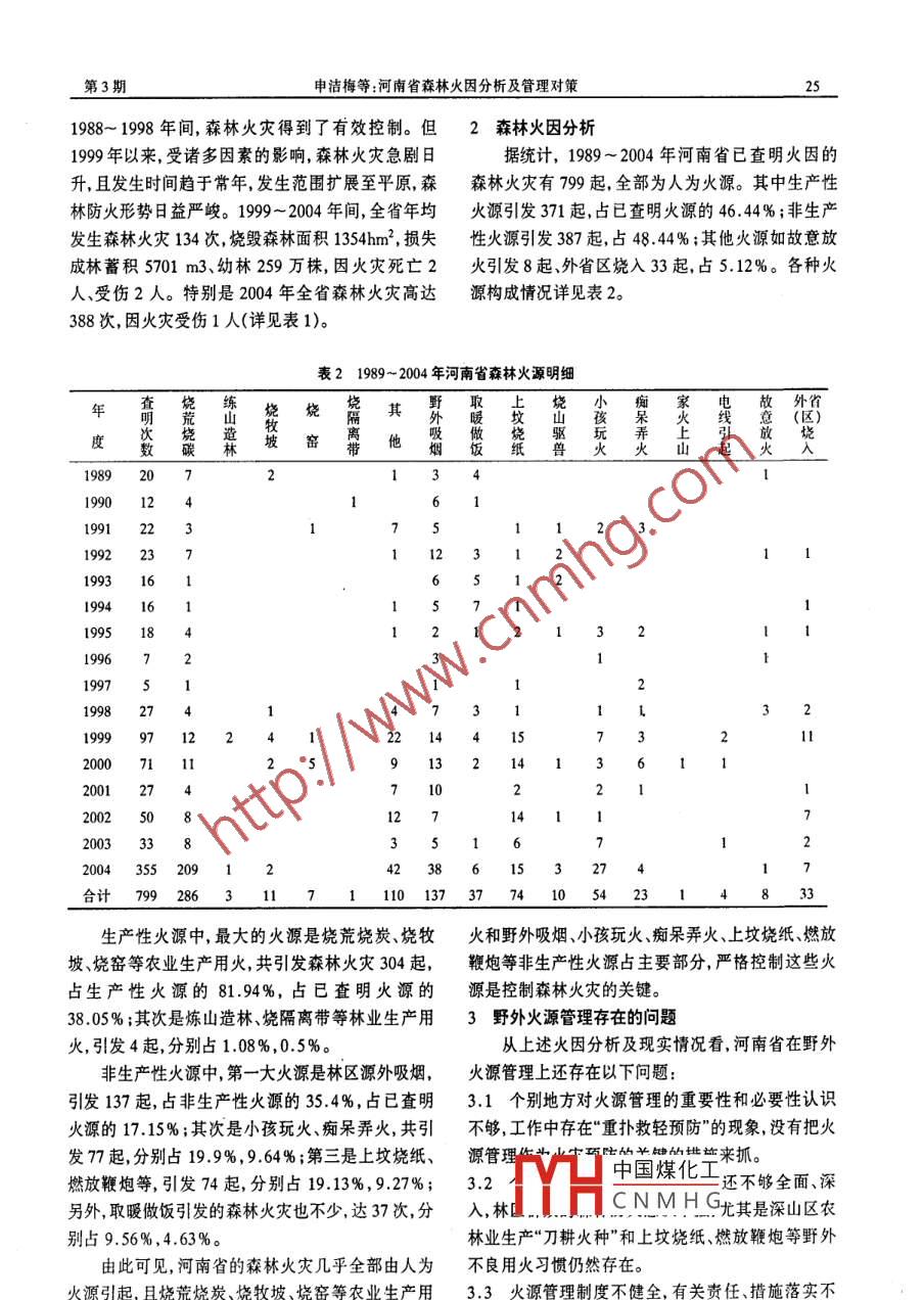 第25卷第3期河南林業(yè)科技Vol.25 No.32005年9月Journal of Henan Forestry Science and 1 echnologySep. 2005河南省森林火因分析及管理對(duì)策申潔梅',夏艷芳”,張麥記3(1.河南省野生動(dòng)物救護(hù)中心,鄭州40003;2.2河南省森林病蟲(chóng)害防治檢疫站;3.濟(jì)源市林業(yè)局)摘要:根據(jù)河南省16年來(lái)引發(fā)森林火災(zāi)的16種火源明細(xì)資料,統(tǒng)計(jì)出非生產(chǎn)性火源387起,占已查明火源的48.44%:生產(chǎn)性火源371起,占46.44%;其他火源33起占5.12%。依此分析了河南省森林火源的發(fā)生規(guī)律及野外火源管理方面存在的問(wèn)題,立足行政、法制、科技等角度提出了改進(jìn)措施和治理對(duì)策。關(guān)鍵詞:森林火災(zāi);火因分析;監(jiān)管對(duì)策中圖分類號(hào):S762.1文獻(xiàn)標(biāo)識(shí)碼;B .文章編號(hào):1003 - 2630(2005)03 - 0024-03河南省位于我國(guó)中東部,黃河中下游,全省土地1河南省的森林火災(zāi)情況總面積1670萬(wàn)hm2,現(xiàn)有林業(yè)用地面積456.41萬(wàn)河南地處中原,交通發(fā)達(dá),人口稠密,生態(tài)環(huán)境hm2,有林地面積270.30萬(wàn)hm2, 活立木總蓄積脆弱,森林火災(zāi)較為嚴(yán)重,始終是森林資源和國(guó)土安13370.51 萬(wàn)m,森林覆蓋率16.19%。森林資源中全及林區(qū)經(jīng)濟(jì)發(fā)展的重大隱患。據(jù)不完全統(tǒng)計(jì), .以油松、側(cè)柏為主的易燃針葉林和針闊混交林占有1950~ 1987年間,全省年均發(fā)生森林火災(zāi)202次,林地面積的59.7% ;以麻櫟、刺槐等為主的闊葉林年均受害森林面積1.01萬(wàn)hm2,占同期年均造林保占40.3%。全省80%的森林資源分布在太行山區(qū)、存面積的50.8%。以1987年大興安嶺“5.6"特大伏牛山區(qū)和大別桐柏山區(qū)。全省森林防火林地面積森林火災(zāi)為契機(jī),各級(jí)政府加強(qiáng)了對(duì)森林防火工作377.87萬(wàn)hm,其中I級(jí)火險(xiǎn)縣級(jí)單位11個(gè), I級(jí)的領(lǐng)導(dǎo),健全組織,完善制度,落實(shí)措施,嚴(yán)格管理,火險(xiǎn)單位17個(gè),I、I級(jí)火險(xiǎn)區(qū)森林面積分別占全森林消防隊(duì)伍不斷壯大,各項(xiàng)基礎(chǔ)設(shè)施建設(shè)穩(wěn)步推省森林總面積的45.5%和29.2%。進(jìn),全省預(yù)防和撲敕森林火災(zāi)的能力明顯加強(qiáng)。表1 1989~ 2004年河南省森林火災(zāi)有關(guān)數(shù)據(jù)統(tǒng)計(jì)森林火災(zāi)次數(shù)爻害裔損失林木;列撲火經(jīng)費(fèi)受害事年度合計(jì)火警火災(zāi)災(zāi)森林/hm2成林蓄積幼林株數(shù)人數(shù)人數(shù) 1萬(wàn)元1萬(wàn)元%/m’/萬(wàn)株198936 1 32 3 9351477936.22.10.351990110.218938.43.85.0.041991 34 23 10139911706210.151992 33 17 1614577311120.051993 2293.91310.9359.1653.5770.0336190.355239.87356.570.071995 22 10 12129.61 .437.69.9824.8812.34199642.761762.047.151.0.0219970.93102.770.00041998 33 20 1330.0816.45.0213.7838.160.011999 1835 54500.6137325.284631.4214.590.192000 91311590.111313.16.849446.08568.0920.222001 32 24 830.62904.90.210.58.42.012002 6(66.0913.5926 .中國(guó)煤化工i.74200316.615.55200.814YHCNMH Gis2004 388 359 29149.982094. S411.7571.06_合計(jì)1041 792 244_ 53430.8425612.09346. 902794391. 998250.869收稿日期:2005 -07 - 10第3期申潔梅等:河南省森林火因分析及管理對(duì)策251988~ 1998年間,森林火災(zāi)得到了有效控制。但2森林火因分析1999年以來(lái),受諸多因素的影響,森林火災(zāi)急劇日據(jù)統(tǒng)計(jì),1989~2004年河南省已查明火因的升,且發(fā)生時(shí)間趨于常年,發(fā)生范圍擴(kuò)展至平原,森森林火災(zāi)有799起,全部為人為火源。其中生產(chǎn)性林防火形勢(shì)日益嚴(yán)峻。1999~ 2004年間,全省年均火源引發(fā) 371起,占已查明火源的46.44% ;非生產(chǎn)發(fā)生森林火災(zāi)134次,燒毀森林面積1354hm2,損失性火源引發(fā)387起,占48.44%;其他火源如故意放成林蓄積5701 m3、 幼林259萬(wàn)株,因火災(zāi)死亡2火引發(fā)8 起、外省區(qū)燒入33起,占5.12%。各種火人、受傷2人。特別是2004年全省森林火災(zāi)高達(dá)源構(gòu)成情況詳見(jiàn)表2。388次,因火災(zāi)受傷1人(詳見(jiàn)表1)。表21989~ 2004年河南省森林火源明細(xì)年明山線變窯他館起1989202131990121991223512319922319931619941995213199619971998274732199997|224122 1415120007120011020025012 77200333620043555 20938合計(jì)99 286i101374生產(chǎn)性火源中,最大的火源是燒荒燒炭、燒牧火和野外吸煙、小孩玩火、癡呆弄火、上墳燒紙、燃放坡、燒窯等農(nóng)業(yè)生產(chǎn)用火,共引發(fā)森林火災(zāi)304起,鞭炮等非生產(chǎn)性火源占主要部分,嚴(yán)格控制這些火占生產(chǎn)性火源的81.94%, 占已查明火源的源是控制森林火災(zāi)的關(guān)鍵。38.05% ;其次是煉山造林、燒隔離帶等林業(yè)生產(chǎn)用3野外火源 管理存在的問(wèn)題火,引發(fā)4起,分別占1.08%,0.5%。從上述火因分析及現(xiàn)實(shí)情況看,河南省在野外非生產(chǎn)性火源中,第一大火源是林區(qū)源外吸煙,火源管理 上還存在以下問(wèn)題:引發(fā)137起,占非生產(chǎn)性火源的35.4%,占已查明3.1 個(gè)別地方對(duì)火源管理的重要性和必要性認(rèn)識(shí)火源的17.15% ;其次是小孩玩火、癡呆弄火,共引不夠,工作中存在“重?fù)渚容p預(yù)防”的現(xiàn)象,沒(méi)有把火發(fā)77起,分別占19.9%,9.64%;第三是 上墳燒紙、源管理華來(lái)抓。燃放鞭炮等,引發(fā)74起,分別占19.13%, 9.27%;3.2中國(gu