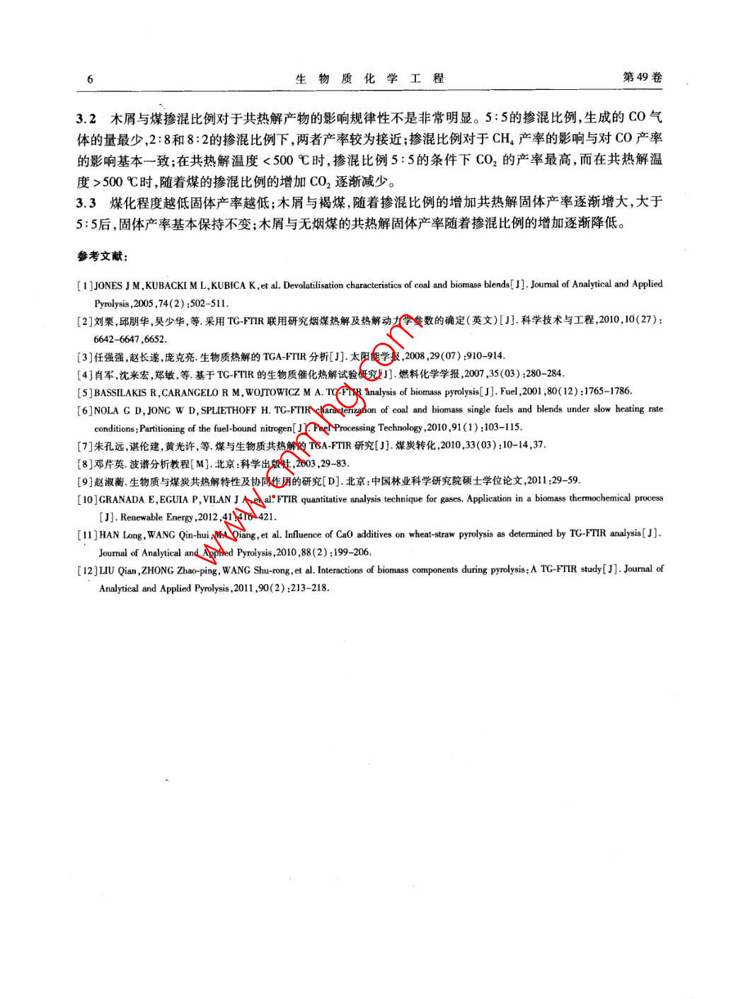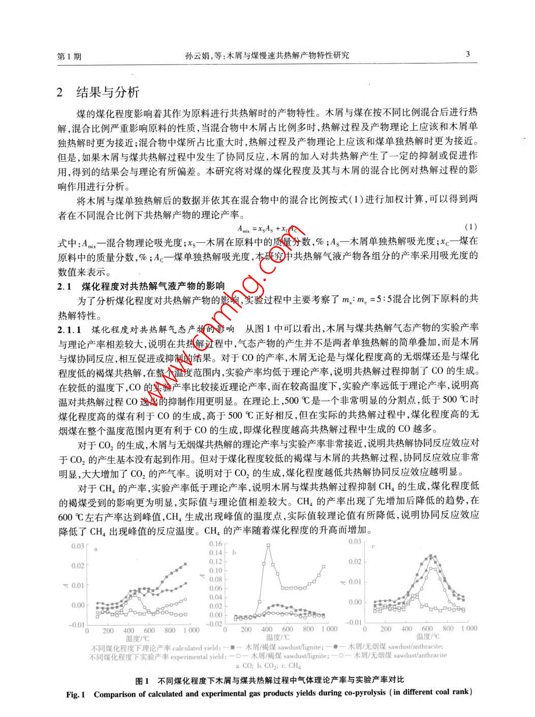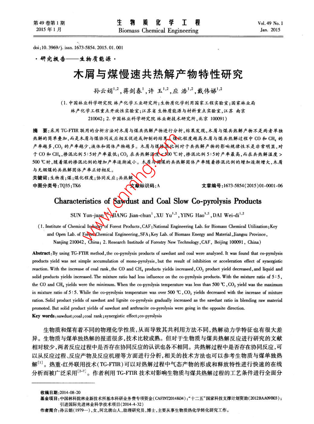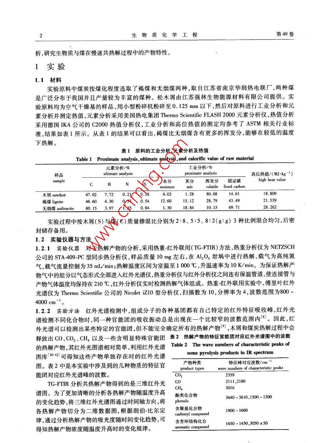 第49卷第1期生物質(zhì)化學(xué)工程Vol. 49 No. 1015年1月Biomass Chemical EngineeringJan.2015doi:10.3969/jisa.16735854.2015.01.001研究報(bào)告—一生物質(zhì)能源木屑與煤慢速共熱解產(chǎn)物特性研究孫云娟2,蔣劍春',許玉12,應(yīng)浩·2,戴偉娣12(1.中國林業(yè)科學(xué)研究院林產(chǎn)化學(xué)工業(yè)研究所;生物質(zhì)化學(xué)利用國家工程實(shí)驗(yàn)室;國家林業(yè)局林產(chǎn)化學(xué)工程重點(diǎn)開放性實(shí)驗(yàn)室;江蘇省生物質(zhì)能源與材料重點(diǎn)實(shí)驗(yàn)室,江蘇南京210042;2.中國林業(yè)科學(xué)研究院林業(yè)新技術(shù)研究所,北京100091)摘要;采用TG-FIR聯(lián)用的分析方法對(duì)木屑與煤共熱解產(chǎn)物進(jìn)行分析,結(jié)果發(fā)現(xiàn),木屑與煤共熱解產(chǎn)物不是兩者單獨(dú)熱解的簡單疊加,而是木屑與煤協(xié)同反應(yīng)相互促進(jìn)或抑制的結(jié)果。煤化程度越高木屑與煤共熱解過程中CO和CH,的產(chǎn)率越多,CO2的產(chǎn)率越少,液體和固體產(chǎn)物越多。木屑與煤摻混比例對(duì)于共熱解產(chǎn)物的影響規(guī)律性不是非常明顯,對(duì)于CO和CH4,摻混比例5:5時(shí)產(chǎn)率最低;CO2在共熱解溫度<500℃時(shí),摻混比例5:5時(shí)產(chǎn)率最高,而在共熱解溫度>00℃時(shí),隨著煤的摻混比例的增加產(chǎn)率逐漸減小。木屑與褐煤的共熱解固體產(chǎn)率隨著摻混比例的增加逐漸增大,木屑與無煙煤的共熱解固體產(chǎn)率正好相反。關(guān)鍵詞:生物質(zhì);煤;煤化程度;協(xié)同反應(yīng);共熱解中圖分類號(hào):TQ35;TK6文獻(xiàn)標(biāo)識(shí)碼:A文章編號(hào):1673-5854(2015)010001-06Characteristics of Sawdust and Coal Slow Co-pyrolysis ProductsSUN Yun-juan",JIANG Jian-chun, XU Yu", YING Hao, DAI Wei-di,2(1. Institute of Chemical Industry of Forest Products, CAF; National Engineering Lab for Biomass Chemical Utilization; Keyand Open Lab of Forest Chemical Engineering SFA; Key Lab. of Biomass Energy and Material, Jiangsu ProvinceNanjing 210042, China; 2. Research Institude of Forestry New Technology, CAF, Beijing 100091, China)Abstract: By using TG-FTIR method, the co-pyrolysis products of sawdust and coal were analyzed. It was found that co-pyrolysisproducts yield was not simple accumulation of mono-pyrolysis, but the result of inhibition or acceleration effect of synergisticreaction. With the increase of coal rank, the CO and CHa products yields increased, cO2 product yield decreased, and liquid andsolid products yields increased. The mixture ratio had less influence on the co-pyrolysis products. With the mixture ratio of 5: 5the CO and CH4 yields were the minimum. When the co-pyrolysis temperature was less than 500C, cO, yield was the maximumin mixture ratio of 5: 5. While the co-pyrolysis temperature was over 500C, CO, yields decreased with the increase of mixtureration. Solid product yields of sawdust and lignite co-pyrolysis gradually increased as the sawdust ratio in blending raw materialpromoted. But solid product yields of sawdust and anthracite co-pyrolysis were going in the opposite directionKey words: sawdust; coal; coal rank; synergistic effect co-pyrolysis生物質(zhì)和煤有著不同的物理化學(xué)性質(zhì),從而導(dǎo)致其共利用方法不同,熱解動(dòng)力學(xué)特征也有很大差異。生物質(zhì)與煤單獨(dú)熱解的報(bào)道很多,技術(shù)比較成熟。但對(duì)于生物質(zhì)與煤共熱解反應(yīng)進(jìn)行研究的文獻(xiàn)相對(duì)較少,兩者反應(yīng)過程中是否存在協(xié)同反應(yīng)的認(rèn)識(shí)也各不相同。共熱解過程中是否存在協(xié)同反應(yīng),可以從反應(yīng)過程、反應(yīng)產(chǎn)物及反應(yīng)機(jī)理等方面進(jìn)行分析,相關(guān)的技術(shù)方法也可以參考生物質(zhì)與煤單獨(dú)熱解口。熱重紅外聯(lián)用技術(shù)( TG-FTIR)可以對(duì)熱解過程中氣態(tài)產(chǎn)物的形成和釋放特性進(jìn)行快速的在線分析而被廣泛采用27。作者利用TGFR技術(shù)對(duì)影響生物質(zhì)與煤共熱解過程的工藝條件進(jìn)行全面分收稿日期:2014-08-20基金項(xiàng)目:中國林科院林業(yè)新技術(shù)所基本科研業(yè)務(wù)費(fèi)專項(xiàng)資金( CAFIN204K04);“十二五”國家科技支撐計(jì)劃資助(2012BAA09B03);引進(jìn)國際先進(jìn)林業(yè)科學(xué)技術(shù)項(xiàng)目(2014-4-32)作者簡介:孫云娟(1979),女,河北唐山人,助理研究員博士,主要從事生物質(zhì)熱化學(xué)轉(zhuǎn)化研究工作2生物質(zhì)化學(xué)工程第49卷析研究生物質(zhì)與煤在慢速共熱解過程中的產(chǎn)物特性。1實(shí)驗(yàn)1.1材料實(shí)驗(yàn)原料中煤炭按煤化程度選取了褐煤和無煙煤兩種,取自江蘇省南京華潤熱電聯(lián)廠,兩種煤是廣泛分布于我國并且產(chǎn)量較為豐富的煤種。松木屑由江蘇強(qiáng)林生物能源材料有限公司提供。實(shí)驗(yàn)原料均為空氣干燥基的樣品,用小型粉碎機(jī)粉碎至0.125mm以下,然后對(duì)原料進(jìn)行工業(yè)分析和元素分析并測定熱值,元素分析采用美國熱電集團(tuán) Thermo Scientific FLASH2000元素分析儀,熱值分析采用德國KA公司的C2000熱值分析儀,工業(yè)分析和高位熱值的測定均參考了ASTM相關(guān)行業(yè)標(biāo)準(zhǔn),結(jié)果如表1所示。從表1的結(jié)果可以看出褐煤比無煙煤含有更多的揮發(fā)分,能夠在較低的溫度下熱解。表1原料的工業(yè)分析、元素分析及熱值Table 1 Proximate analysis, ultimate analysis, and calorific value of raw materia
