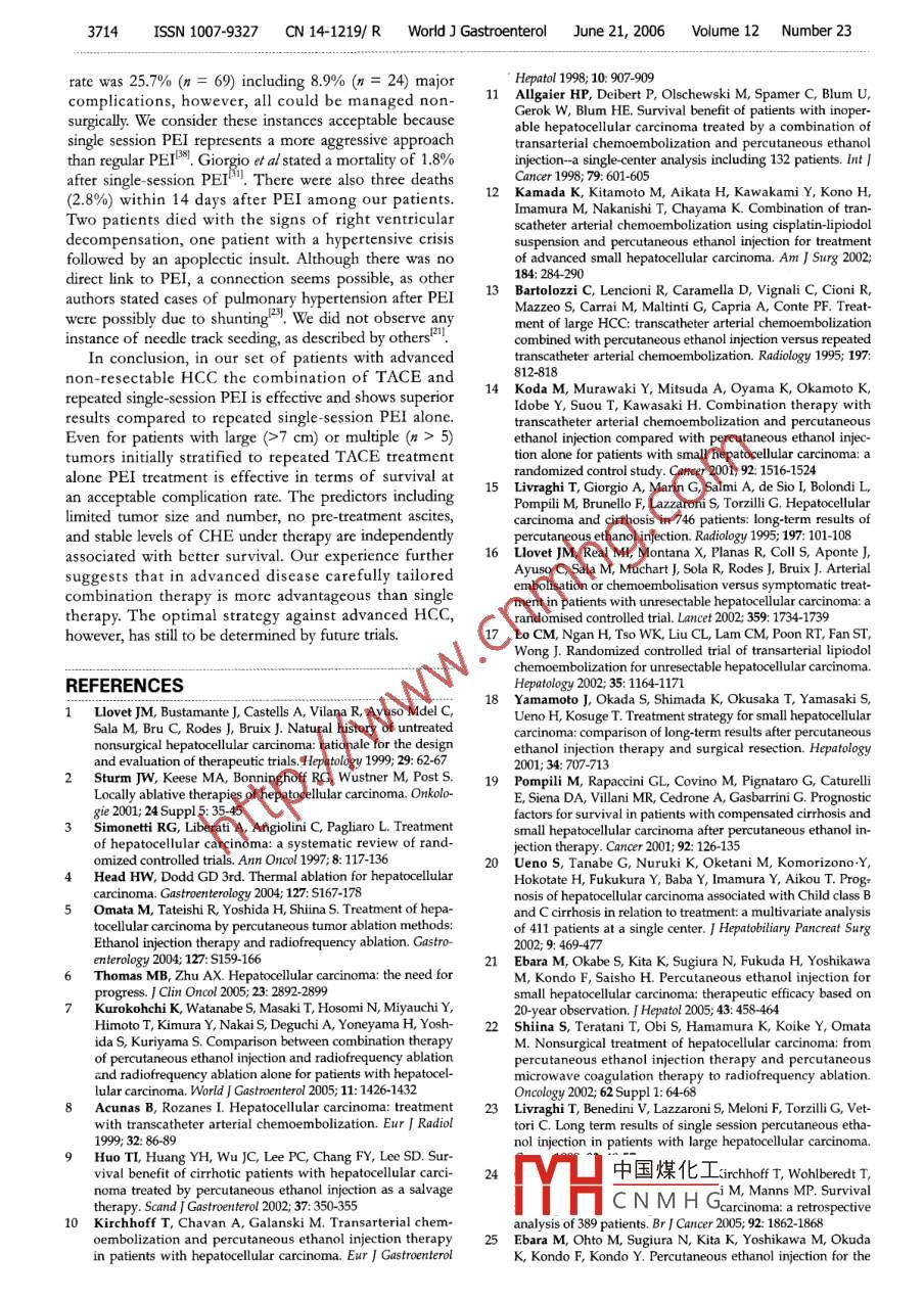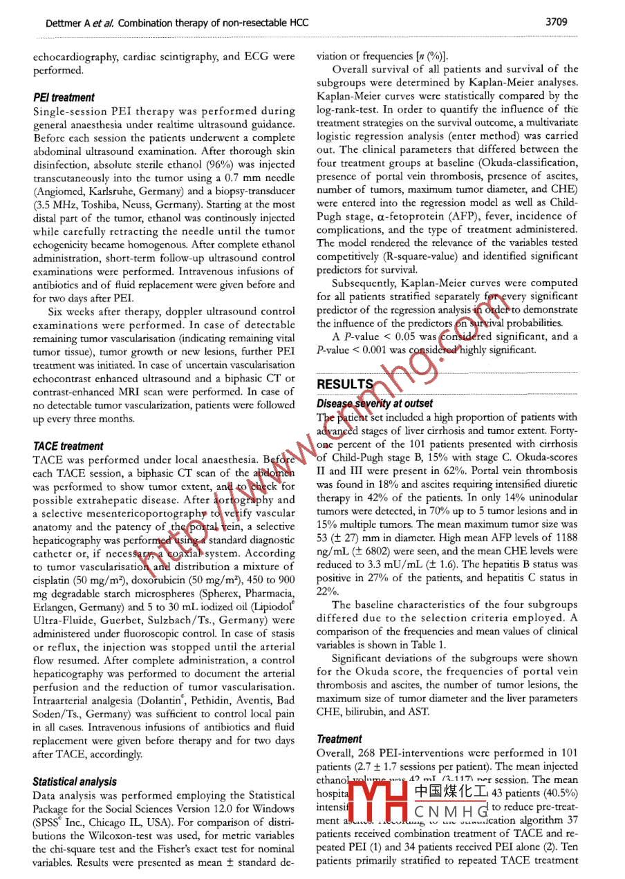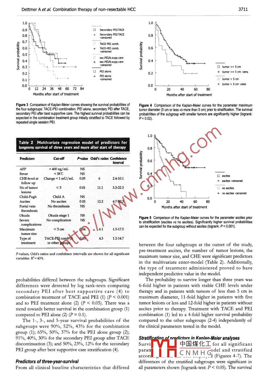 PO Box 2345, Beijing 100023, ChinaWorld Gastroenterol 2006 June 21: 12(23): 3707-3715orld Joumal of Gastroenterology ISSN 1007-9327Tjgwwignet.com@2006 The wJG Press. All rights reserved.CⅣ RCACERCombination of repeated single-session percutaneous ethanolinjection and transarterial chemoembolisation compared torepeated single-session percutaneous ethanol injection itpatients with non-resectable hepatocellular carcinomaArne Dettmer, Timm D Kirchhoff, Michael Gebel, Lars Zender, Nisar P Malek, Bernhard Panning, Ajay Chavan,Herbert Rosenthal, Stefan Kubicka, Susanne Krusche, Sonja Merkesdal, Michael Galanski, Michael P MannJoerg s BleckArne Dettmer, Michael Gebel, Lars Zender, Nisar P Malek, RESULTS: The 1-and 3-year survival of all patientsStefan Kubicka, Susanne Krusche, Michael P Manns, Joerg was 73% and 47%. In the subgroup analyses, theS Bleck, Department of Gastroenterology, Hepatology and combination of TACE and PEI(1)was associated withEndocrinology, Hannover Medical School, GermarTimm D Kirchhoff, Herbert Rosenthal, Michael Galanski, and 43%)compared to PEI treatment alone(2)(1-,3,ermanyBernhard Panning Department of Anaesthesiology, hannoveafter initial stratification to TACE(3) yielded comparableMedical School, Germanyresults(1-,3-5-year survival: 91%, 40%, and 30%)Ajay Chavan, Department of Diagnostic and Interventional while PEI after stratification to best supportive care(4)Radiology, Klinikum Oldenburg, Germanywas associated with decreased survival (1-,3-5-yearSonja Merkesdal, Division of Rheumatology, Hannover Medical survival: 50%, 23%, 12%). Apart from the chosenSchool, Germanytreatment modalities, predictors for better survival wereCo-first-authors: Timm d Kirchhofftumor number(n< 5),tumor size(< 5 cm), no ascitesCorrespondence to: Timm D Kirchhoff, MD, Hannover Medi- before PEI, and stable serum cholinesterase after PEI (Pal School, Department of Diagnostic Radiology OE 8220, Car<0.05). The mortality within 2 wk after PEI was 2.8%euberg-Str. 1, D-30625 HannoverGermany. kirchhoff. timm @mh-hannover de(n 3). There were 24(8.9%)major complicationsTelephone:+49511-32342lFax:+49-511-5323885after PEI including segmental liver infarction, focal liverReceived:2005-11-29Accepted: 2006-01-09necrosis, and liver abscess. All complications could bemanaged non-surgicallyCONCLUSION: Repeated single-session PEI is effectiveAbstractin patients with advanced HCc at an acceptable andmanageable complication rate. Patients stratified to aAIM: To evaluate the treatment effect of percutaneous combination of TACE and PEI can expect longer survivalethanol injection(PEI) for patients with advanced, than those stratified to repeated PEI alone. Furthermorenon-resectable HCC compared with combination of patients with large or multiple tumors in good clinicaltransarterial chemoembolisation(TACE)and repeated status may also profit from a combination of TAce andsingle-session PEI, repeated single-session PEI alone, reconsideration for secondary PEIrepeated TACE alone, or best supportive carec 2006 The WJG Press. All rights reservedMETHODS: All patients who received PEI treatmentduring the study period were included and stratified to Key words: HCC; Single-session PEI; TACE; Survivalone of the following treatment modalities according to Predictionphysical status and tumor extent: combination of TACEand repeated single-session PEI, repeated single-session Dettmer A, Kirchhoff TD, Gebel M, Zender L, Malek NPPEI alone, repeated TACE alone, or best supportive Panning B, Chavan A, Rosenthal H, Kubicka S, Krusche $carePrognosticvalueofclinicalparametersincludingMerkesdalS,GalanskiM,MannsMp,BleckJs.combinAtionOkuda-classification, presence of portal vein thrombosis, of repeated single-session percutaneous ethanol injectionpresence of ascites, number of tumors, maximum tumor and trardiameter, and serum cholinesterase(CHE), as well as single-sl中國(guó)煤化工 -njection in patientsChild-Pugh stage, a-fetoprotein(AFP), fever, incidence of with nCNMH GarcinomaWorldcomplications were assessed and compared between the Gastroergroups. Survival was determined using Kaplan-Meier andmultivariate regression analyses.http://www.wjgnet.com/1007-9327/12/3707.asp3708 ISSN 1007-9327 CN 14-1219/R World J Gastroenterol June 21, 2006 Volume 12 Number 23INTRODUCTIONLimitedThe prognosis of untreated HCC remains poor. The3-year survival ranges from 21% to 28% and declinesto about 8% for advanced tumors". The only therapiesTACE-PEIthat currently offer potential cure are surgical resectionand liver transplantation. Despite improved surgicalstatusTACE(3)(date not shown)techniques, only about 20% of HCC are amenable toresection, mainly due to advanced tumor growth andReducedthe underlying cirrhosis 2. Systemic chemotherapy hasPEI alonedinicalbest supportive fi supportive careficant survival benefit in comparisonstatuscare(4best supportive care. Hence, locoregional modalities liketransarterial chemoembolization ( TACE, percutaneousure 1 Stratification algorithm for the treatment of advanced unresectable HCCethanol injection(PED), laser induced thermo therapyITT), and radiofrequency ablation(RFA) are employedidely in non-resectable HCC in an attempt to prolong treatment from July 1999 until July 2003 in our institutionrred mocwith large and disseminated HCC in good physical status, were included into the present study.whereas repeated PEI has shown efficacy in cases of smalltumors Both modalities have proven their effectiveneStratificationin terms of tumor response and survival, even moreIn an interdisciplinary gastroenterological-radiologicalconference, patients were stratified to one of the followingn combinetreatment modalities according to physical status andPEI has gained importance in small HCC due to its tumor extent( Figure 1): combination of TACE andsafety and ease of operation. The method is both effectiveand economically sound. The survival data of patients alone, repeated TACE alone, or best supportive care. Afterafter 