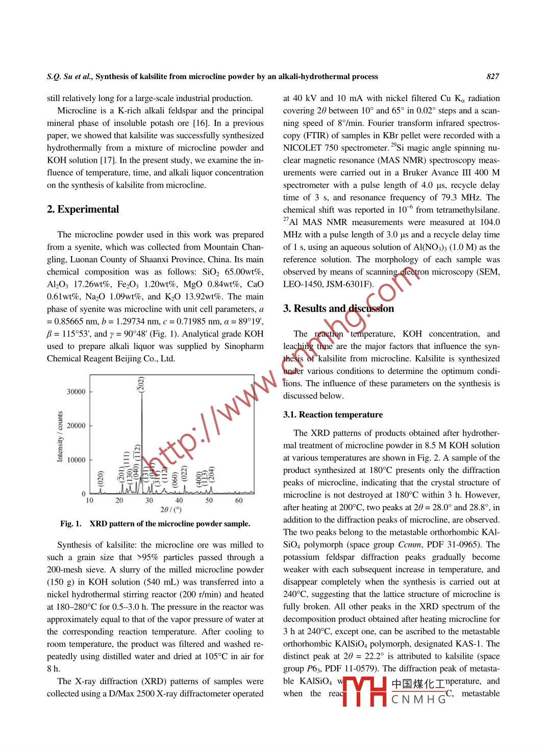 International Journal of Minerals, Metallurgy and MaterialsVolume 21, Number 8, August 2014, Page 826DOI: 10.1007/s12613-01 4-0977-7Synthesis of kalsilite from microcline powder by an alkali-hydrothermalprocessShuang qing Sul?2, Hong-wen Ma", Jing Yang", Pan Zhang2), and Zheng Luo2)1) National Laboratory of Mineral Materials, China University of Geosciences, Beiing 10083, China2) Blue Sky Technology Corporation, Beijing 100083, China(Received: 20 December 2013; revised: 26 February 2014; accepted: 27 February 2014)Abstract: The properties of aluminosilicate kalsilite have atracted the interest of researchers in chemical synthesis, ceramic industry, biofu-els, etc. In this study, kalilite was hydrothermally synthesized from microcline powder in a KOH solution. The microcline powder, rich inpotassium, aluminum, and silicon, was collected from Mountain Changling in Northwestem China. The effects of temperature, time, andKOH concentration on the decomposition of microcline were investigated. The kalsilite and intermediate products were characterized bymeans of wet chemistry analysis, X-ray Diffraction (XRD), infrared spectrormetry (R), 29Si magic angle spinning nuclear magnetic reso-nance (2"si MAS NMR), 27Al MAS NMR, and scanning elctron microscope (SEM). With increasing temperature, the microcline powdertransforms into a metastable KAISiO4 polymorph before transforming further into pure kalsilite. A mixture of both kalsilite and metastableKAISiO4 polymorph is obtained when the hydrothermal reaction is carried out within 2 h; but after 2 h, kalsilite is the predominant product.The concentration of KOH, which needs to be larger than 4.3 M, is an important parameter influencing the synthesis of kalsilie.Keywords: kalsilte; microcline; potassium hydroxide; hydrothermal synthesisminosilicate kalsilite is finding potential utilization in sev-1. Introductioneral applications.The main techniques for synthesizing kalsilite includeKalsilite (a polymorphic form of KAISiO4) is a feld-cation exchange from nepheline [7], solid-state sintering re-spathoid that exists mainly in K-ich silica undersaturatedaction from zeolite, kaolinite, or other silicate compoundsvolcanic rocks, and is usually accompanied by olivine, meli-[8- 10], sol-gel methods using ethyl silicate or a SiO2 sol aslite, clinopyroxene, phlogopite, nepheline, and leucite [1].a Si source and aluminum salt as an Al source [11-12], andKalsilite is macroporous, contains strongly basic potassiumhydrothermal methods from muscovite or kaolinite [13- 15].active sites, and is weakly soluble in methanol and oils. It isHowever, cation exchange and solid state reactions generateused as a catalyst additive in ammonia synthesis and hydro-mixtures of kalsilite polymorphs, while kalsilite synthesizedgen production from steam reforming and as a heterogene-by sol- gel methods often has poor crystal structures withous catalyst for transesterification of soybean oil withigher costs. Among these methods, hydrothermal synthesismethanol to biodiesel [2]. Kalsilite, with its high thermalis economical and produces the pure material with a fineexpansion coefficient, can also be prepared as a thermal ce-particle size at low temperature. However, when muscoviteramic for bonding to metals [3]. Nanokalsilite shows excel-is used as the starting materials, the hydrothermal methodlent and highly improved activity toward oxidation of car-needs a high pressure (100 MPa), a relatively high tempera-bon in diesel soot [4]. Kalsilite is also a precursor of leucite,ture (approximately 6009C), and a long reaction time (15 d)an important component of porcelain-fused-to-metal and[13]. Recently, Becerro e1 al. [14-15] showed that the kal-ceramic restoration systems [5]. Recently, kalsilite has beensilite can be synthesized at 300°C in 12 h when kaolinite re-shown to be a source for potassium sulfate [6]. Hence, alu.places muscovite as the raw material. The reaction time isCorresponding author: Hong-wen Ma E-mail: mahw @ cugb.edu.cn◎University of Science and Technology Bejjing and Springer- Verlag Berlin Heidelberg 2014中國(guó)煤化工包SpringerMHCNM HGS.Q. Su et al, Synthesis of kalsilite from microcline powder by an alkali-hydrothermal process827still relatively long for a large-scale industrial production.at 40 kV and 10 mA with nickel filtered Cu Ka radiationMicrocline is a K rich alkali feldspar and the principalcovering 20 between 10° and 65° in 0.02° steps and a scan-mineral phase of insoluble potash ore [16]. In a previousning speed of 8%/min. Fourier transform infrared spectros-paper, we showed that kalsilite was successfully synthesizedcopy (FTIR) of samples in KBr pellet were recorded with ahydrothermally from a mixture of microcline powder andNICOLET 750 spectrometer. 29si magic angle spinning nu-KOH solution [17]. In the present study, we examine the in-clear magnetic resonance (MAS NMR) spectroscopy meas-fluence of temperature, time, and alkali liquor concentrationurements were carried out in a Bruker Avance II 400 Mon the synthesis of kalsilite from microcline.spectrometer with a pulse length of 4.0 us, recycle delaytime of 3 s, and resonance frequency of 79.3 MHz. The2. Experimentalchemical shift was reported in 10 from tetramethylsilane.27Al MAS NMR measurements were measured at 104.0The microcline powder used in this work was preparedMHz with a pulse length of 3.0 μus and a reeycle delay timefrom a syenite, which was collected from Mountain Chan-of 1 s, using an aqueous solution of Al(NO3)3 (1.0 M) as thegling, Luonan County of Shaanxi Province, China. Its main reference solution. The morphology of each sample waschemical composition was as follows: SiO2 65.00wt%,observed by means of scanning electron microscopy (SEM,Al2O3 17.26wt%, Fe2O3 1.20wt%, MgO 0.84wt%, CaOLEO-1450, JSM-6301F).0.61wt%, Na2O 1.09wt%, and K2O 13.92wt%. The mainphase of syenite was microcline with unit cell parameters, a3. Results and discussion= 0.85665 nm, b= 1.29734 nm, c =0.7198