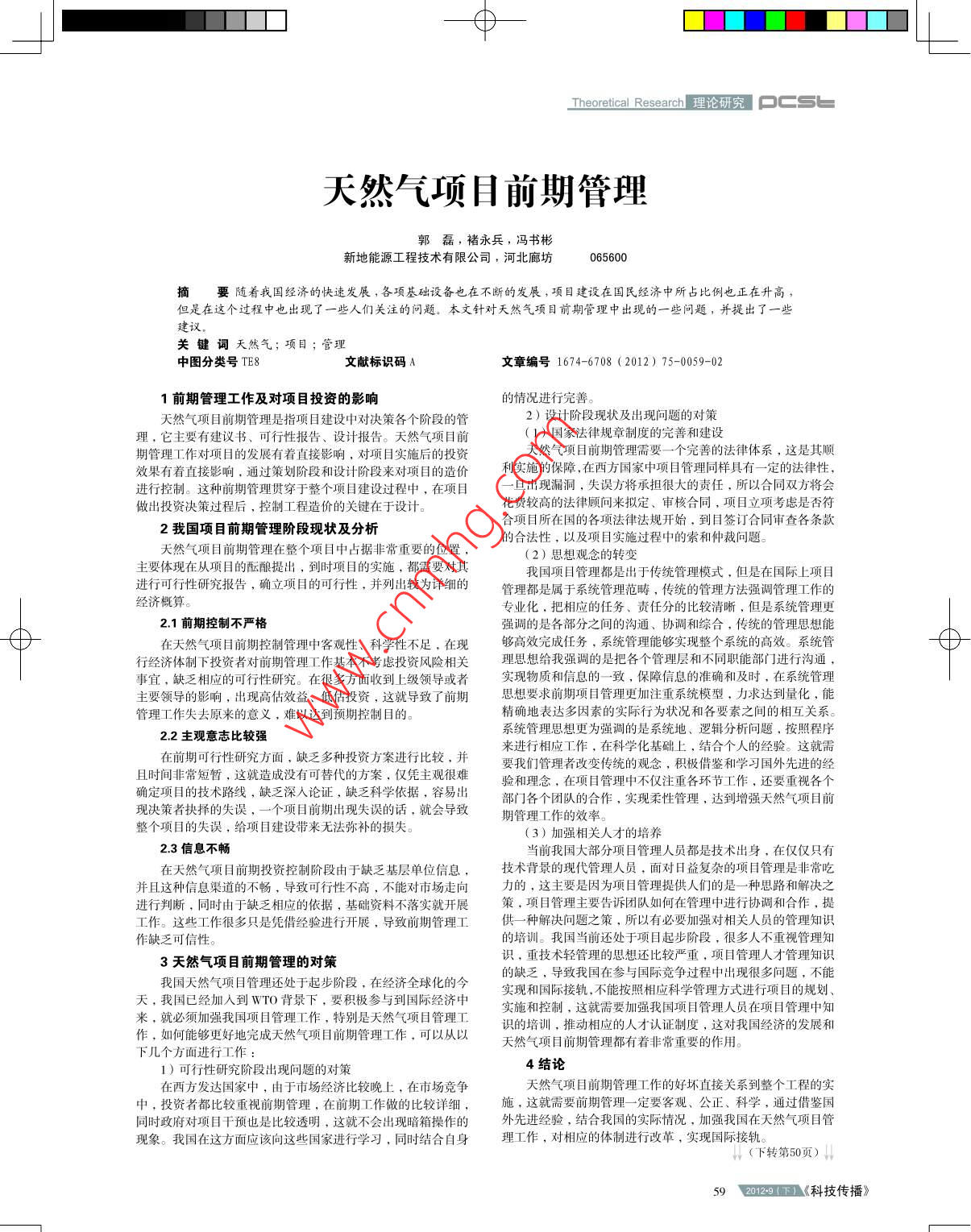 一φ-Theoretical ResearchI 理論研究pCSL天然氣項(xiàng)目前期管理郭磊,褚永兵,馮書(shū)彬新地能源工程技術(shù)有限公司,河北廊坊065600摘要隨著我國(guó)經(jīng)濟(jì)的快速發(fā)展,各項(xiàng)基礎(chǔ)設(shè)備也在不斷的發(fā)展,項(xiàng)目建設(shè)在國(guó)民經(jīng)濟(jì)中所占比例也正在升高,但是在這個(gè)過(guò)程中也出現(xiàn)了一些人們關(guān)注的問(wèn)題。本文針對(duì)天然氣項(xiàng)目前期管理中出現(xiàn)的一些問(wèn)題,并提出了一些建議。關(guān)鍵詞天然氣;項(xiàng)目;管理中圖分類號(hào)TE8文獻(xiàn)標(biāo)識(shí)碼A文章編號(hào)1674-6708 (2012) 75-0059-021前期管理工作及對(duì)項(xiàng)目投資的影響的情況進(jìn)行完善。天然氣項(xiàng)目前期管理是指項(xiàng)目建設(shè)中對(duì)決策各個(gè)階段的管2)設(shè)計(jì)階段現(xiàn)狀及出現(xiàn)問(wèn)題的對(duì)策理,它主要有建議書(shū)、可行性報(bào)告、設(shè)計(jì)報(bào)告。天然氣項(xiàng)目前(1)國(guó)家法律規(guī)章制度的完善和建設(shè)期管理工作對(duì)項(xiàng)目的發(fā)展有著直接影響,對(duì)項(xiàng)目實(shí)施后的投資天然氣項(xiàng)目前期管理需要一個(gè)完善的法律體系 ,這是其順效果有著直接影響,通過(guò)策劃階段和設(shè)計(jì)階段來(lái)對(duì)項(xiàng)目的造價(jià)利實(shí)施的保障,在西方國(guó)家中項(xiàng)目管理同樣具有一定的法律性,進(jìn)行控制。這種前期管理貫穿于整個(gè)項(xiàng)目建設(shè)過(guò)程中,在項(xiàng)目一旦出現(xiàn)漏洞,失誤方將承擔(dān)很大的責(zé)任.所以合同雙方將會(huì)做出投資決策過(guò)程后,控制工程造價(jià)的關(guān)鍵在于設(shè)計(jì)?;ㄙM(fèi)較高的法律顧問(wèn)來(lái)擬定、審核合同,項(xiàng)目立項(xiàng)考慮是否符合項(xiàng)目所在國(guó)的各項(xiàng)法律法規(guī)開(kāi)始,到目簽訂合同審查各條款2我國(guó)項(xiàng)目前期管理階段現(xiàn)狀及分析天然氣項(xiàng)目前期管理在整個(gè)項(xiàng)目中占據(jù)非常重要的位置,的合法性,以及項(xiàng)目實(shí)施過(guò)程中的索和仲裁問(wèn)題。(2)思想觀念的轉(zhuǎn)變主要體現(xiàn)在從項(xiàng)目的醞釀提出,到時(shí)項(xiàng)目的實(shí)施,都需要對(duì)其我國(guó)項(xiàng)目管理都是出于傳統(tǒng)管理模式,但是在國(guó)際上項(xiàng)目進(jìn)行可行性研究報(bào)告,確立項(xiàng)目的可行性,并列出較為詳細(xì)的管理都是屬于系統(tǒng)管理范疇,傳統(tǒng)的管理方法強(qiáng)調(diào)管理工作的經(jīng)濟(jì)概算。專業(yè)化.把相應(yīng)的任務(wù)、責(zé)任分的比較清晰,但是系統(tǒng)管理更2.1前期控制不嚴(yán)格強(qiáng)調(diào)的是各部分之間的溝通、協(xié)調(diào)和綜合,傳統(tǒng)的管理思想能在天然氣項(xiàng)目前期控制管理中客觀性、科學(xué)性不足,在現(xiàn)夠高效完成任務(wù),系統(tǒng)管理能夠?qū)崿F(xiàn)整個(gè)系統(tǒng)的高效。系統(tǒng)管行經(jīng)濟(jì)體制下投資者對(duì)前期管理工作基本不考慮投資風(fēng)險(xiǎn)相關(guān)理思想給我強(qiáng)調(diào)的是把各個(gè)管理層和不同職能部門(mén)進(jìn)行溝通,事宜,缺乏相應(yīng)的可行性研究。在很多方面收到上級(jí)領(lǐng)導(dǎo)或者實(shí)現(xiàn)物質(zhì)和信息的--致,保障信息的準(zhǔn)確和及時(shí),在系統(tǒng)管理主要領(lǐng)導(dǎo)的影響,出現(xiàn)高估效益、低估投資,這就導(dǎo)致了前期思想要求前期項(xiàng)目管理更加注重系統(tǒng)模型,力求達(dá)到量化,能管理工作失去原來(lái)的意義,難以達(dá)到預(yù)期控制目的。精確地表達(dá)多因素的實(shí)際行為狀況和各要素之間的相互關(guān)系。系統(tǒng)管理思想更為強(qiáng)調(diào)的是系統(tǒng)地、邏輯分析問(wèn)題,按照程序2.2主觀意志比較強(qiáng)在前期可行性研究方面,缺乏多種投資方案進(jìn)行比較,并來(lái)進(jìn)行相應(yīng)工作,在科學(xué)化基礎(chǔ)上, 結(jié)合個(gè)人的經(jīng)驗(yàn)。這就需且時(shí)間非常短暫,這就造成沒(méi)有可替代的方案,僅憑主觀很難要我們管理者改變傳統(tǒng)的觀念,積極借鑒和學(xué)習(xí)國(guó)外先進(jìn)的經(jīng)確定項(xiàng)目的技術(shù)路線,缺乏深人論證,缺乏科學(xué)依據(jù),容易出驗(yàn)和理念,在項(xiàng)目管理中不僅注重各環(huán)節(jié)工作,還要重視各個(gè)現(xiàn)決策者抉擇的失誤,一個(gè)項(xiàng)a前期出現(xiàn)失誤的話,就會(huì)導(dǎo)致部門(mén)各個(gè)團(tuán)隊(duì)的合作,實(shí)現(xiàn)柔性管理,達(dá)到增強(qiáng)天然氣項(xiàng)目前期管理工作的效率。整個(gè)項(xiàng)目的失誤,給項(xiàng)目建設(shè)帶來(lái)無(wú)法彌補(bǔ)的損失。(3)加強(qiáng)相關(guān)人才的培養(yǎng)2.3信息不暢當(dāng)前我國(guó)大部分項(xiàng)目管理人員都是技術(shù)出身,在僅僅只有在天然氣項(xiàng)目前期投資控制階段由于缺乏基層單位信息,技術(shù)背景的現(xiàn)代管理人員,面對(duì)日益復(fù)雜的項(xiàng)目管理是非常吃并且這種信息渠道的不暢,導(dǎo)致可行性不高,不能對(duì)市場(chǎng)走向力的,這主要是因?yàn)轫?xiàng)目管理提供人們的是-種思路和解決之進(jìn)行判斷,同時(shí)由于缺乏相應(yīng)的依據(jù