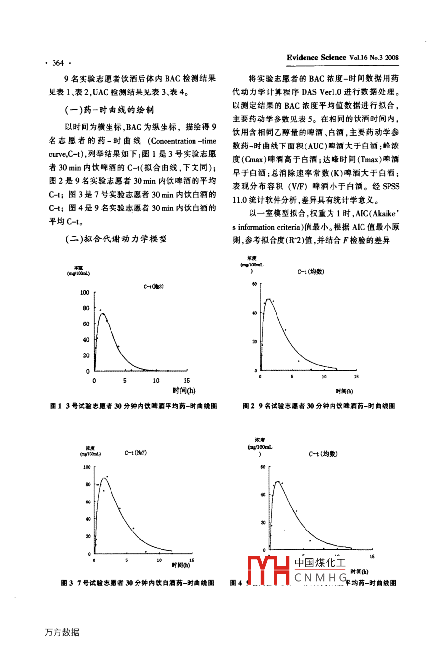 記得升學20年第16卷(第3期)酒的種類對乙醇代謝動力學的影響白璐‘廖林川“顏有儀*北京市疾病預防控制中心,北京100020;*四川大學華西醫(yī)學中心法醫(yī)學院成都610041)【摘要】目的乙醇代謝動力學受諸多因素形響,關(guān)于酒的種類對其彩響少見報道。方法本研究讓志愿者在相同的飲酒時間內(nèi),飲用含相同乙醇量的啤酒、白酒,將所得數(shù)據(jù)用藥代動力學計算程序DASver1.0進行處理。結(jié)果乙醇的體內(nèi)過程符合一級吸收、非線性消除、一室模型,權(quán)重為1。啤酒與白酒相比,嗄收速度快,濃度高,達峰時間早,消除速度快。姷論酒的種類對乙醇代謝動力學有彩響,如果根據(jù)乙醇的代謝動力學規(guī)律來推測飲酒個體某一時剡的BAC,或根據(jù)BAC推測實際飲酒量,應(yīng)該充分考慮到酒的種類財乙醇代謝動力學的影響【關(guān)鍵詞】乙醇;代謝動力學;酒的種奧;頂空氣相色譜法【中圖分類號】D9194【文獻標識碼】A【文章編號】1674-1226(2008)03-0361-06The Pharmacokinetic Effects of Beer and Liquor. Bai Lu, Liao Linchuan, Yan Youyi. Beiing Municipal Cen-ter for Disease Prevention and Control, Beying 100020, China.[Abstract] The pharmacokinetic effects of alcohol are subject to the influence of many factors. Differenttypes of alcohol products have varying effects, but are seldom reported. This study investigated in 9 healthy volun-teers the effects after their oral administration of 50g alcohol per capita according to the alcohol consistency ofliquor and beer. Blood and urine samples were collected to examine the concentration of alcohol at different inter-rals after administration. The result showed that during the same interval after drinking, compared with liquor, ab-sorption of alcohol is faster for beer, its Cmax is higher, and its Tmax is earlier with faster clearance. Thereforethe pharmacokinetic effects of various alcohol products should be considered when we conjecture the drinkingdose according to BAC, or BAC according to the total drinking dose in a certain time.[Key Words] Alcoho, Pharmacokinetic Efects, Alcohol Types, Headspace Gas Chromatography乙醇( Alcohol)俗稱酒精,是酒精飲料的主要循環(huán)運送至大腦作用于腦中樞神經(jīng)細胞膜上的成分,是世界范圍內(nèi)被普遍濫用的一種物質(zhì)。過某些酶影響細胞功能,從而影響自我行為控制量飲酒會損害健康,也可能會引起行為異常,導能力。因為血液中乙醇濃度( Blood alcohol致意外甚至犯罪,號比如車禍、吸入嘔吐物窒息 concentration,BAC)最能直接反映乙醇對人體造而死、酒后肇事等?,F(xiàn)有研究表明,乙醇進入人體成的影響,所以很多情況下都需對BAC進行檢后吸收、分布、代謝有一般的規(guī)律,通過血液測,并以BAC檢測結(jié)果作為正確處理與乙醇有中國煤化工CNMHG白璐,碩士,北京市疾病預防控制中心研究人員,主要從事毒(藥)物廖林川,四川大學華西醫(yī)學中心法醫(yī)學院教授博士生導師主要從事毒(藥)物分析方面研究。362Evidence science vol 16 No. 3 2008關(guān)的事(案)件的主要依據(jù)。同時,尿中乙醇濃度歲,身體健康肝、腎功能正常隨機編為1~9號,( Urine alcohol concentration,UAC)也能反映乙醇均體重64kg代謝動力學的情況。二、實驗方法和檢測方法飲酒后,BAC與乙醇代謝動力學密切相關(guān),以往有學者試圖揭示出普遍適用的乙醇代謝動實驗志愿者受試前3天禁酒。實驗開始前,力學規(guī)律,并由此來推測飲酒個體某一時刻的在肘部靜脈放入靜脈留置針用肝素鈉作為抗凝BAC,或根據(jù)BAC推測實際飲酒量。但實際上,劑。按50g乙醇/劑量讓志愿者在30mn內(nèi)勻乙醇代謝動力學受飲酒方式、飲酒的種類、飲酒速飲完酒邊飲酒邊進食食物葷素搭配。飲第一時所吃的食物種類以及肝酶活性等多種因素的口酒后開始計時在不同時間點采血,在實驗志影響此類問題受到眾多學者的關(guān)注,而愿者有尿意時采集尿液,記錄采尿時間和采尿有關(guān)這方面的研究又少見報道。本文通過研究酒量,應(yīng)用頂空氣相色譜法對血液和尿液進行檢的種類對乙醇代謝動力學的影響,為進一步揭示測。實驗分兩次進行;第一次仗啤酒,第二次飲白乙醇代謝動力學規(guī)律提供基礎(chǔ)研究資料。酒,兩次實驗間隔3天以上。采集的血液和尿液應(yīng)用頂空氣相色譜法進儀器、試劑、實驗材料及對象行檢測,以異丙醇為內(nèi)標。色譜條件如下:頂空平氣相色譜儀,頂空進樣儀。乙醇(色譜純),異衡溫度60℃,進樣環(huán)溫度125℃,傳輸線溫度丙醇(色譜純),超純水(電阻率≥183M)。白125℃,樣品平衡時間10min,進樣間隔時間10酒,酒精度56%(VN);啤酒,酒精度4%(VⅣ);min;WAX52CB毛細管柱(30mx0.25mmx0.25兩種酒的酒精度用文中所建乙醇檢測方法進行pm),柱溫48℃,進樣口溫度220℃;FID檢測器檢測并得到確認。溫度250℃,載氣為氮氣,流速1 ml/min,氫氣流根據(jù)實驗志愿者的一般情況調(diào)查表,結(jié)合實速30 ml/min,空氣流速300 ml/min,分流比20:1,際情況,選擇9名不經(jīng)常飲酒的男性實驗志愿者檢測時間8min(四川大學華西醫(yī)學中心在校學生),年齡22~28三、實驗結(jié)果和數(shù)據(jù)處理裹19名實驗志愿者30分鐘內(nèi)飲啤酒BAC檢測結(jié)果BAC檢測結(jié)果(mg/100mL)39平均值0080.25468028170.37292o0859702160.500677154641.50700003852%7249395658中國煤化工10.0000000030001200RHSCNMHG注:“一”未采到血。記學20年第16卷(第3期)饔29名實驗志愿者30分鐘內(nèi)飲白酒BAC檢測結(jié)果BAC檢測結(jié)果(mg/100mL)278平