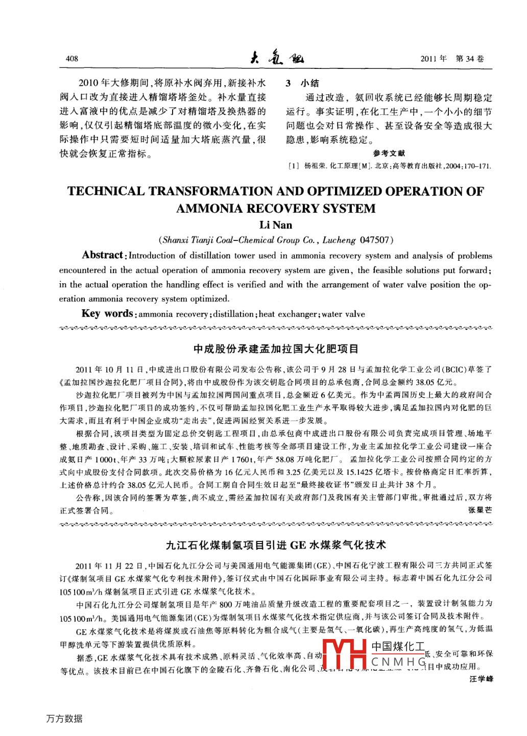 4082011年第34卷2010年大修期間,將原補(bǔ)水閥棄用,新接補(bǔ)水3小結(jié)閥入口改為直接進(jìn)入精餾塔塔釜處。補(bǔ)水量直接通過改造,氨回收系統(tǒng)已經(jīng)能夠長(zhǎng)周期穩(wěn)定進(jìn)人富液中的優(yōu)點(diǎn)是減少了對(duì)精餾塔及換熱器的運(yùn)行。事實(shí)證明,在化工生產(chǎn)中,一個(gè)小小的細(xì)節(jié)影響,僅僅引起精餾塔底部溫度的微小變化,在實(shí)問題也會(huì)對(duì)日常操作、甚至設(shè)備安全等造成很大際操作中只需要短時(shí)間適量加大塔底蒸汽量,很隱患,影響系統(tǒng)穩(wěn)定??炀蜁?huì)恢復(fù)正常指標(biāo)。參考文獻(xiàn)[1]楊祖榮.化工原理[M].北京:高等教育出版社,2004:170-171TECHNICAL TRANSFORMATION AND OPTIMIZED OPERATION OFAMMONIA RECOVERY SYSTEMLi Nan(Shanxi Tianyi Coal-Chemical Group Co., Lucheng 047507)Abstract: Introduction of distillation tower used in ammonia recovery system and analysis of problemsencountered in the actual operation of ammonia recovery system are given, the feasible solutions put forwardin the actual operation the handling effect is verified and with the arrangement of water valve position the operation ammonia recovery system optimizedKey words: ammonia recovery; distillation; heat exchanger; water valve中成股份承建孟加拉國(guó)大化肥項(xiàng)目2011年10月11日,中成進(jìn)出口股份有限公司發(fā)布公告稱,該公司于9月28日與盂加拉化學(xué)工業(yè)公司(BCIC)草簽了《孟加拉國(guó)沙迦拉化肥廠項(xiàng)目合同》,將由中成股份作為該交鑰匙合同項(xiàng)目的總承包商,合同總金額約3805億元。沙迦拉化肥廠項(xiàng)目被列為中國(guó)與孟加拉國(guó)兩國(guó)間重點(diǎn)項(xiàng)目,總金額近6億美元。作為中孟兩國(guó)歷史上最大的政府間合作項(xiàng)目,沙迦拉化肥廠項(xiàng)目的成功簽約,不僅可幫助孟加拉國(guó)化肥工業(yè)生產(chǎn)水平取得較大進(jìn)步,滿足孟加拉國(guó)內(nèi)對(duì)化肥的巨大需求,而且有利于中國(guó)企業(yè)成功“走出去”,促進(jìn)兩國(guó)經(jīng)貿(mào)關(guān)系進(jìn)一步發(fā)展。根據(jù)合同,該項(xiàng)目類型為固定總價(jià)交鑰匙工程項(xiàng)目,由總承包商中成進(jìn)出口股份有限公司負(fù)責(zé)完成項(xiàng)目管理、場(chǎng)地平整、地質(zhì)勘查、設(shè)計(jì)采購(gòu)、施工、安裝、培訓(xùn)和試車、性能考核等全部項(xiàng)目建設(shè)工作,為業(yè)主孟加拉化學(xué)工業(yè)公司建設(shè)一座合成氨日產(chǎn)1000t、年產(chǎn)33萬(wàn)噸;大顆粒尿素日產(chǎn)1760,年產(chǎn)5808萬(wàn)噸化肥廠。孟加拉化學(xué)工業(yè)公司按照合同約定的方式向中成股份支付合同款項(xiàng)。此次交易價(jià)格為16億元人民幣和3.25億美元以及15.1425億塔卡。按價(jià)格商定日匯率折算上述價(jià)格總計(jì)約合38.05億元人民幣。合同工期自合同生效日起至“最終接收證書”頒發(fā)日止共計(jì)38個(gè)月。公告稱,因該合同的簽署為草簽,尚不成立,需經(jīng)孟加拉國(guó)有關(guān)政府部門及我國(guó)有關(guān)主管部門審批。審批通過后,雙方將正式簽署合同。張星芒九江石化煤制氫項(xiàng)目引進(jìn)GE水煤漿氣化技術(shù)2011年11月22日,中國(guó)石化九江分公司與美國(guó)通用電氣能源集團(tuán)(CE)、中國(guó)石化寧波工程有限公司三方共同正式簽訂《煤制氫項(xiàng)目GE水煤漿氣化專利技術(shù)附件》,簽訂儀式由中國(guó)石化國(guó)際事業(yè)有限公司主持。標(biāo)志著中國(guó)石化九江分公司105100m3h煤制氫項(xiàng)目正式引進(jìn)GE水煤漿氣化技術(shù)。中國(guó)石化九江分公司煤制氫項(xiàng)目是年產(chǎn)800萬(wàn)噸油品質(zhì)量升級(jí)改遣工程的重要配套項(xiàng)目之一,裝置設(shè)計(jì)制氫能力為105100m3/h。美國(guó)通用電氣能源集團(tuán)(CE)為煤制氫項(xiàng)目水煤漿氣化技術(shù)指定供應(yīng)商,并與該公司簽訂合同及技術(shù)附件。GE水煤漿氣化技術(shù)是將煤炭或石油焦等原料轉(zhuǎn)化為粗合成氣(主要是氫氣、一氧化碳),再生產(chǎn)高純度的氫氣,為低溫甲醇洗單元等下游裝置提供優(yōu)質(zhì)原料。中國(guó)煤化工據(jù)悉,GE水煤漿氣化技術(shù)具有技術(shù)成熟、原料靈活、氣化效率高、自二氐、安全可靠和環(huán)保等優(yōu)點(diǎn)。該技術(shù)目前已在中國(guó)石化旗下的金陵石化、齊魯石化、南化公司dYESCNMHG目中成功應(yīng)用。汪學(xué)峰