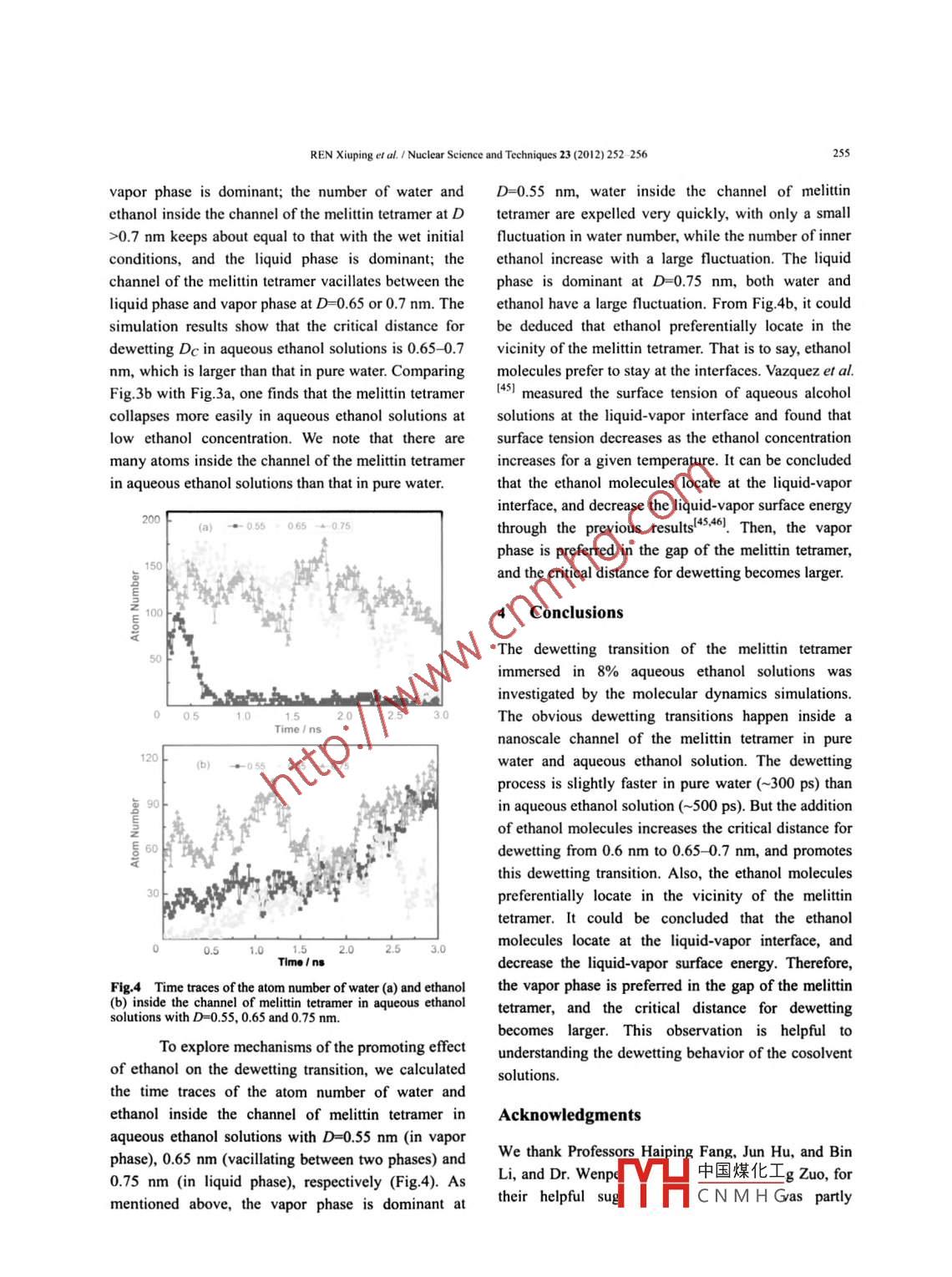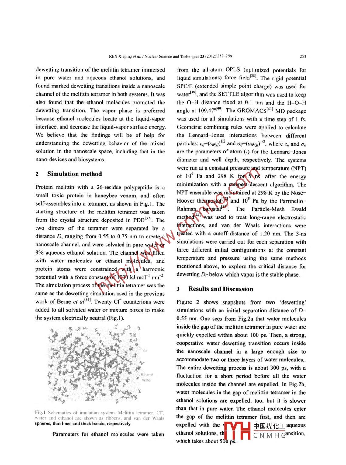 Nuclear Science and Techniques 23(2012)252- 256Promoting effect of ethanol on dewetting transition in the confinedregion of melittin tetramerREN XIuping" ZHOU Bo, WANG Chunle; lShanghai Institute of Applied Physics, Chinese Academy of Sciences, Shanghai 201800, ChinaGraduate School of the Chinese Academy of Sciences, Beijing 100080, ChinaAbstract To study the influence of ethanol molecules on the melittin tetramer folding, we investigated the dewettingtransition of the melittin tetramer immersed in pure water and 8% aqueous ethanol solution(mass fraction) by themolecular dynamics simulations We found that the marked dewetting transitions occurred inside a nanoscale channelof the melittin tetramer both in puoted thdewetting transition. We attributed this promoting effect to ethanol molecules which prefer to locate at the liquidvapor interface and decrease the liquid-vapor surface energy. The results provide insight into the effect of ethanol onthe water dewetting phenomena.Key words Dewetting transition, Melittin tetramer, Ethanol, Molecular dynamics simulationmuch more complicated than purely hydrophobic1 Introductionsystems by exerting electrostatic forces on water 27-291.Hydrophobic interactions playint role inBecause of the electrostatic forces, there is no strongmany physico-chemical processes, such as proteindewetting transition observed in the collapse of theBphC enzyme>. However, Berme et al.[133lfolding!, micelle formation/ 23, water permeation inmembrane channels 4. and separation of hydrophobicthe collapse of the melittin tetramer in water byparticles 6-8. In 1973, Stillinger F.H. '9 argued thatcomputer simulations and observed a marked waterwater molecules at ambient conditions did not wetdewetting transition inside a nanoscale channel of thehard wall, and formed a water-vapor interface near thetetramer with a channel size of up to two or threegroups studied this phenomenonwater-molecule diametersTheof small solute moleculusing computer simulations and theoretical analysis110-23I. It was found that large hydrophobic solutes oras denaturants and alcohols, may greatly affect theurfaces can cause reorganizations of water molecules,hydrophobic/hydrophilic interaction in aqueousand there is a nanoscale dewetting transition, when thesolutions, and thus may influence the thermal stabilithydrophobic interaction is extremely strong 24-26.Thisor solubility of proteins 52-34). The mechanism of howcosolvent molecules affect hydrophobic/hydrophilichappens when two nanoscale hydrophobic platesapproach each other and reach a critical distanceinteractions is a basic issue in the protein chemistrywhich is still large enough to accommodate several field, but remains a matter of some controversy/2, 35,layers of water molecules, so the water trappedThus, examining the impact of these solutes on thebetween the two hydrophobic surfaces evaporatesdewetting transition phenomenon can provide a newrspective regarding the microscopic mechaninIsmspontaneously in a very short period of time before thecollapse of the two plates. This transition occurring onIn order to study the influence of ethanola microscopic length scale is analogous to a first-ordermolecules on the melittin tetramer folding, weperformed molecuphase transition from liquid to vapor. Proteins are中國煤化 Tis on theCNMHGCorresponding author. E-mail address: wangchunlei@sinap acReceived date: 2012-02-25REN Xiuping ef al. Nuclear Science and Techniques 23(2012)252-256dewetting transition of the melittin tetramer immersed from the all-atom OPLS (optimized potentials forin pure water and aqueous ethanol solutions, and liciquid simulations)force field3 1, The rigid potentialfound marked dewetting transitions inside a nanoscale SPC/E (extended simple point charge) was used forchannel of the melittin tetramer in both systems. It was water1391. and the SETtle algorithm was used to keepalso found that the ethanol molecules promoted thethe O-H distance fixed at 0.I nm and the H-o-Hdewetting transition. The vapor phase is preferred angle at 109.47o4o The GROMACS 4II MD packagebecause ethanol molecules locate at the liquid-vapor was used for all simulations with a time step of I fsnterface, and decrease the liquid-vapor surface energyGeometric combining rules were applied to calculateWe believe that the findings will be of help for the Lennard-Jones interactions between differentunderstanding the dewetting behavior of the mixed particles: Ei(eEu)and oi (0o)", where e and oisolution in the nanoscale space, including that in the are the parameters of atom () for the Lennard-Jonesnano-devices and biosystemsdiameter and well depth, respectively. The systemswere run at a constant pressure and temperature(NPT)2 Simulation methodof 10 Pa and 298 K for 5 ns, after the energyProtein melittin with a 26-residue polypeptide is aminimization with a steepest-descent algorithm. Themall toxic protein in honeybee venom, and ofteNPT ensemble was maintained at 298 K by the Noseself-assembles into a tetramer, as shown in Fig. 1. TheHoover thermostat and 10 Pa by the Parrinello-starting structure of the melittin tetramer was takenRahman barostat -. The Particle-Mesh Ewaldfrom the crystal structure deposited in PDB37I.Themethod4 was used to treat long-range electrostatictwo dimers of the tetramer were separated by ainteractions , and van der Waals interactions weredistance D, ranging from 0.55 to 0.75 nm to create atreated with a cutoff distance of 1. 20 nm. The 3-nsnanoscale channel, and were solvated in pure water orsimulations were carried out for each separation with8% aqueous ethanol solution. The channel was filledthree different initial configurations at the constantwith water molecules or ethanol molecules. andtemperature and pressure using the same methodsprotein atoms were constrained with a harmonicmentioned above, to explore the critical distance forpotential with a force constant of 1000 kJ mol-nmdewetting Dc below which vapor is the stable phaseThe simula