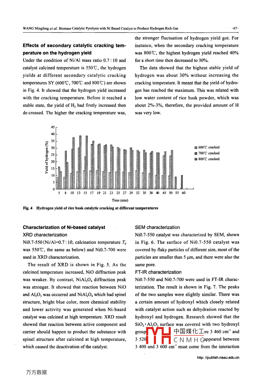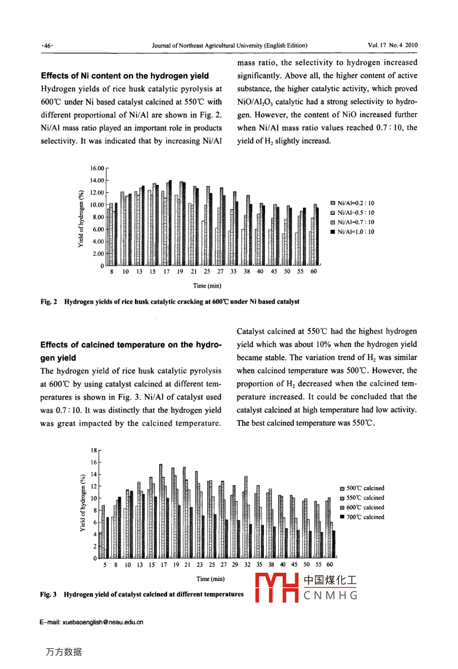 Dec. 2010Joumal of Northeast Agricultural University (English Edition)Vol.17 No.4 43-49Biomass Catalytic Pyrolysis with Ni Based Catalyst to ProduceHydrogen Rich GasWANG Mingfeng', LIU Min', XU Xiweir, LI Bosong, ZHANG Qiang', and JIAN Enchenl'20' Engineering College, Northeast Agricultural Uiversity, Harbin 150030, China' Engineering College, South China Agiculural University, Guangzhou 510642, ChinaAbstract: Hydrogen rich gas was produced using rice husk as biomass material on the continuous biomass pyrolysis apparatuswhich consisted of continuous pyrolysis reactor and secondary catalyie cracking reactor. Ni based catalysts of difent Ni/Al massratio and calcined temperature were prepared by impregnating mcthod. The catalysts were characterized by X ray diffaction (XRD),scan electron microscope (SEM) and FT-IR Spectrometer (FT-IR). Ni based catalyst showed good selectivity for H2 production frombiomass. Catalysts prepared under dfferent conditions had ltte infuence on the yields of three states products when used at the samecracking temperature. Ni/AI mass ratio played an important role in products setiviy. However, the content of NiO increased futherwhen Ni/AI mass ratio values reached 0.7: 10, and the yield ofH, slightly increased. Hydrogen yield was greatly impacted by calcinedtemperature. Catalyst calcined at 550C performed best. When the catalyst was calcined at high temperature, NiO in the catalysttransformned into NiAl20, and the acid site also changed, which caused the deactivation of the catalyst. The bydrogen yield increasedwith the cracking temperature. The highest stable yield of hydrogen was about 30% without increasing with the cracking temperature.Key words: biomass, continuous pyrolysis, catalytic cracking, hydrogenCLC number: S216 Document code: A Article ID: 1006-8104(2010)-04-0043-07pyrolysisl2 .IntroductionAmong various thermochemical conversion pro-cesses, the pyrolysis is considered to be an emergingHydrogen production plays a very important role intechnology for hydrogen production. In the pyrolysisthe development of hydrogen economy. One of theprocess, biomass is heated in the absence of oxygen,promising hydrogen production approaches is theor partially combusted in a limited oxygen supply, toconversion from biomass, which is abundant, cleanproduce a gas mixture containing mainly carbonand renewablel". Biomass as a source of renewableoxides, some methane and higher hydrocarbons inenergy has several environmental advantages overminor quantities, an oil-like liquid (named bio-oilfossil fuels. The main advantage is the lower netor tar) and a carbon rich solid residue. The influence ofemission of greenhouse gases. From a technical pointcarbon dioxide on the energy density and hydrogenof view, biomass resources (energy crops, agriculturalseparation can't be neglected. And what's more im-residues, organic, forestry, industrial or municipalportant, tar proposes a serious threaten to downstreamwastes) can be transformed into sustainable hydrogenfuel cell system, both for the electrodes and for theby thermo chemical processes like gasification and pipelines. The absence of catalyst is helpful for theReccived 11 November 2010中國(guó)煤化工Supported by Key Project of Natural Science in Guangdong Province (06Z004); ScierCNMHG_ng (0050000WANG Mingfeng (1982-). male, Ph. D, engaged in the research of biomass energy utMYH* Corresponding author. JIANG Enchen, professor, supervisor of Ph. D student, cengaged in the research of biomass energy utilization. E-mail:ecjiang@scau.edu.cnhttp: /pblish.eau.du.conJoumal of Northeast Agricultural University (English Edition)Vol.17 No.4 2010conversion of tar into an H-rich gas']. Various catalys-and cracking temperatures were concermed.ts have been introduced in pyrolysis'!. For economicreasons, the nickel catalyst is the most suitable choiceMaterials and Methodsamong metals like cobalt (Co), iron (Fe), platinum (Pt),ruthenium (Ru) and rthodium (Rh). Several nickel (Ni)Materialsbased on catalysts have been investigated and found toRice husk samples have been taken from the Ricebe very effective in terms of tar removal-91.Processing Plant in Zengcheng, Guangzhou City.In this paper, Ni based on catalysts were preparedBefore experiments, the samples were dried, milled,and the activity was evaluated on the continuous bio-sieved and then separated in fractions. Particles ofmass pyrolysis apparatus. XRD, SEM and FT-IR tech-biomass with a size smaller than 0.35 mm were used.nologies were used to characterize the catalyst. Diffe-The proximate analysis and ultimate analysis resultsrent Ni/Al mass ratios, catalyst calcined temperaturesare shown in Table 1.Table 1 Proximate analysis and ultimate analysis of rice husk (wt%)Industry analystElemental compositionMoistureVolatile material Carben fixationAshC0N2.4767.5717.312.6742.738.390.580.16can make active component more effective.In thisCatalyst preparation and characterizationpaper, XRD (x-ray diffraction), SEM (scanning elec-The reagents for catalyst preparation were as follows:tron microscope) and FT-IR (fourier transform infraredNi(NO3)2* 9H2O (≥98.50%) was purchased fromspectroscopy) were used to characterize the catalyst.Chemical Fu Chen Reagent Co, Ltd. in Tianjin;X-ray powder diffractograms were recorded followingy-Al2O3 (≥93%) was purchased from Xinyu Chemicalthe step-scanning procedure (step size=0.028, twoPacking Plant in Jiangxi, water used in experimenttheter degree scanning from 5 to 80) by using a com-was deionized. Ni based catalysts were prepared byputerised D/max-Ra diffractometer (Cu Ka radiation,impregnating method. The diameter of Al2O3 ball is1=0.15418 nm). SEM was performed with FEI-XL303-5 mm, the alumina purity is 93%, and specific surfaceenvironmental scanning electron microscope with acce-area is about 200 m'.g'. Steep the Al2O3 in deionizedlerating voltage 20 kV. FT-IR was tested on Brukerwater for 2 h at room temperature to make sure theVERTEX70 Spektrometer: samp