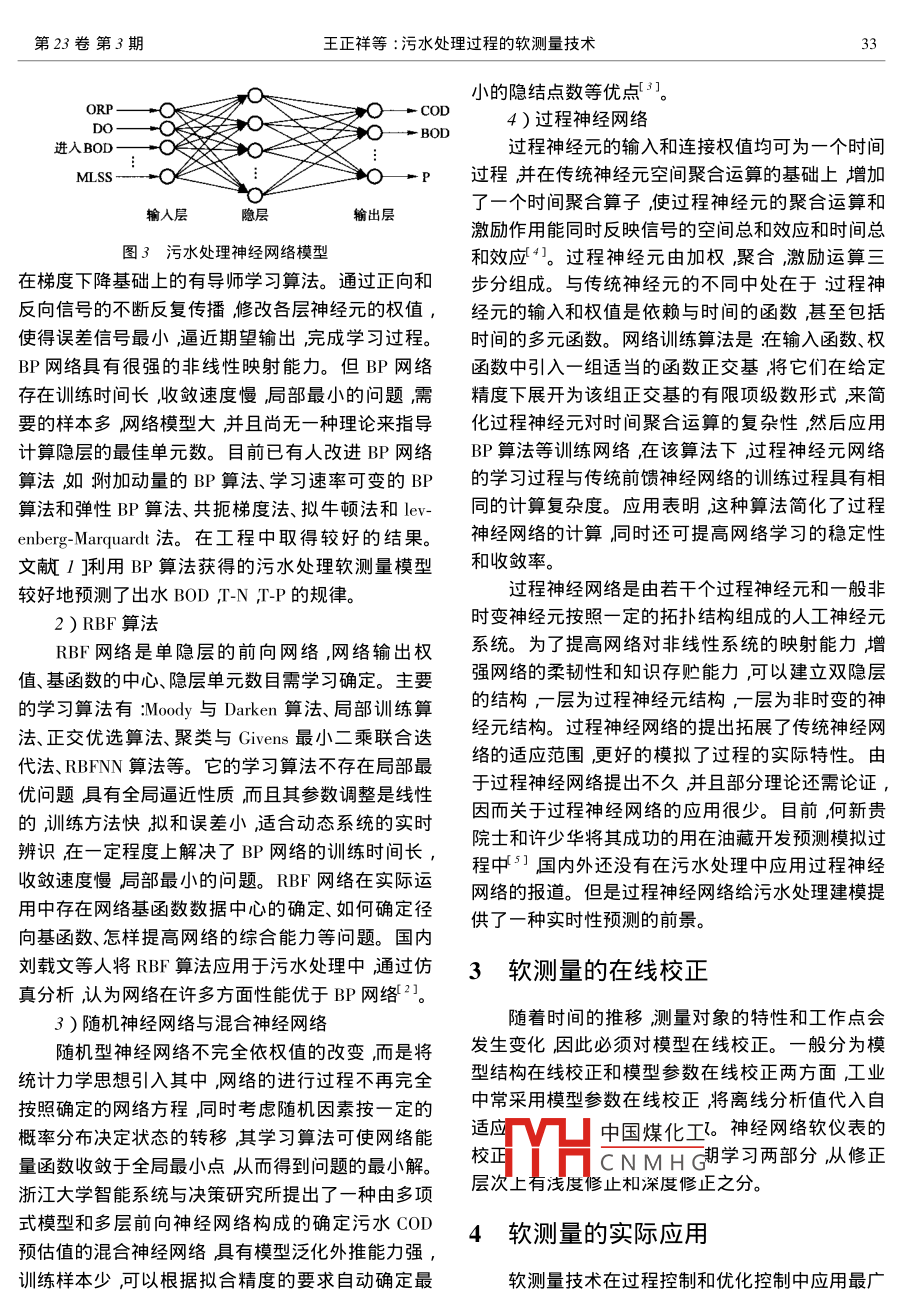 第23卷第3期北京工商大學(xué)學(xué)報(bào)(自然科學(xué)版)Vol. 23 Na 32005年5月Journal of Bejing Technology and Business University( Natural Science Edition )May 2005文章編號(hào):1671-1513( 2005 )03-0031-04污水處理過(guò)程的軟測(cè)量技術(shù)王正祥,劉載文,薛福霞(北京工商大學(xué)信息工程學(xué)院,北京 100037 )摘要:污水處理過(guò)程的軟測(cè)量技術(shù)是為解決污水處理出水水質(zhì)(如BOD,、COD等)難以在線(xiàn)實(shí)時(shí)檢測(cè)而提出的它為污水處理質(zhì)量參數(shù)的在線(xiàn)預(yù)測(cè)和閉環(huán)控制創(chuàng)造必要的前提條件并提供可行的解決方案,從而穩(wěn)定出水水質(zhì)和提高污水處理的效率。介紹軟測(cè)量技術(shù)的概念研究污水處理軟測(cè)量建模方法,以及工程設(shè)計(jì)方法。關(guān)鍵詞:污水處理;軟測(cè)量技術(shù);建模方法中圖分類(lèi)號(hào):X502 ;TP273*. 5文獻(xiàn)標(biāo)識(shí)碼:A目前污水生物處理廣泛使用的是活性污泥法,水處理過(guò)程的自動(dòng)監(jiān)測(cè)和預(yù)報(bào)系統(tǒng)實(shí)現(xiàn)出水的優(yōu)其實(shí)質(zhì)是以存在于污水中的有機(jī)物作為培養(yǎng)基(底化排放具有重要的實(shí)際意義和應(yīng)用價(jià)值。物)在有氧的條件下對(duì)各種微生物群體進(jìn)行混合連續(xù)培養(yǎng)通過(guò)凝聚、吸附、氧化分解、沉淀等過(guò)程去1軟測(cè)量的概念除有機(jī)物的一種污水處理方法。目前污水處理廠的所謂軟測(cè)量技術(shù)就是利用易測(cè)過(guò)程變量與難以出水水質(zhì)BOD,(生物化學(xué)需氧量) COD(化學(xué)耗氧直接測(cè)量的待測(cè)過(guò)程變量之間的數(shù)學(xué)關(guān)系通過(guò)各量)T-N(總含氮量)T-P(總含磷量)等濃度參數(shù)大種數(shù)學(xué)計(jì)算和估計(jì)方法,從而實(shí)現(xiàn)對(duì)待測(cè)過(guò)程變量多靠人工化驗(yàn)來(lái)確定尤其是BOD3需經(jīng)過(guò)5天之的測(cè)量。這樣建立的軟測(cè)量模型可以完成一些實(shí)際后才能得到化驗(yàn)結(jié)果。顯然化驗(yàn)結(jié)果大大滯后于硬件檢測(cè)所不能完成的測(cè)量任務(wù)。圖1中y代表主.污水的排放過(guò)程,也就是說(shuō)等到知道出水水質(zhì)指標(biāo)導(dǎo)變量R代表可測(cè)的輔助變量d和u分別表示可BOD,不合格時(shí)早已排出大量不合格的處理水造測(cè)的干擾和控制變量。軟測(cè)量的目的就是利用所有成二次污染。針對(duì)此情況國(guó)外少量污水處理廠采用了在線(xiàn)可獲得的信息求取主導(dǎo)變量的最優(yōu)" 估計(jì)值j ,即分析儀表進(jìn)行測(cè)量。但目前污水處理自動(dòng)控制系統(tǒng)構(gòu)造從可測(cè)信息集R到j(luò)的映射:中所采用的一些檢測(cè)專(zhuān)用儀器檢修與維護(hù)困難、價(jià)j( S)=K( S)k( S)格昂貴并且技術(shù)尚不完善,誤差較大,檢測(cè)精度達(dá)不到預(yù)期效果,以致于難以提供實(shí)時(shí)質(zhì)量信息作為對(duì)|一十 y質(zhì)量控制的反饋信號(hào)。而反映污水水質(zhì)的最重要參象R數(shù)有機(jī)污染物濃度( BOD或COD )還沒(méi)有實(shí)時(shí)在線(xiàn)圖1軟測(cè)量模型傳感器,因而直接影響了污水處理的效率與效果。因此將軟測(cè)量技術(shù)應(yīng)用于污水處理過(guò)程建立出水2污水處理軟測(cè)量模型建立水質(zhì)BOD,等參數(shù)的軟測(cè)量模型,以實(shí)現(xiàn)污水處理中國(guó)煤化工成較好的基礎(chǔ),但在應(yīng)過(guò)程的實(shí)時(shí)計(jì)算機(jī)監(jiān)測(cè)和預(yù)報(bào),在 此基礎(chǔ)上開(kāi)發(fā)污MYHCNMHG收稿日期:2005 -03 -01基金項(xiàng)目: 北京市優(yōu)秀人才項(xiàng)目北京市教育委員會(huì)科技發(fā)展項(xiàng)目(編號(hào)KM200310011040 )作者簡(jiǎn)介:王正祥( 1973- )男,甘肅金昌人碩士研究生研究方向?yàn)橹悄芸刂坪臀鬯幚磉^(guò)程控制。劉載文( 1954- )男廣東南海人教授主要從事智能控制與測(cè)控網(wǎng)絡(luò)方面的研究。3北京工商大學(xué)學(xué)報(bào)(自然科學(xué)版)2005年5月用方面卻缺乏系統(tǒng)的開(kāi)發(fā)思路。目前軟測(cè)量比較常ASMI ,ASM2 ,ASM3模型,但這些模型涉及的參數(shù)太用的設(shè)計(jì)方法如圖2。多,許多參數(shù)目前缺乏成熟的測(cè)量技術(shù)實(shí)際應(yīng)用相當(dāng)麻煩同時(shí)由于建模代價(jià)大,并且模型精度差,因| 機(jī)理分析,選擇輔助變量而很少應(yīng)用。目前提出的比較流行的觀點(diǎn)是:將良數(shù)據(jù)采集與預(yù)處理好的活性污泥數(shù)學(xué)模型與相應(yīng)的控制理論相結(jié)合,實(shí)現(xiàn)智能控制。建立軟測(cè):量模型2.3.2回歸分析設(shè)計(jì)校正模塊回歸分析是統(tǒng)計(jì)數(shù)學(xué)的一-個(gè)重要分支,在實(shí)驗(yàn)數(shù)據(jù)處理中又稱(chēng)為曲線(xiàn)擬和”?;貧w分析有多種在實(shí)踐中實(shí)現(xiàn)軟測(cè)量形式按因變量和自變量是否存在線(xiàn)性關(guān)系可分為軟測(cè)量效果評(píng)價(jià)線(xiàn)性回歸和非線(xiàn)性回歸。線(xiàn)性回歸的實(shí)質(zhì)是對(duì)象的函數(shù)關(guān)系在工作點(diǎn)附近-階泰勒展開(kāi)式,如果系統(tǒng)圖2軟測(cè)量設(shè)計(jì)流程非線(xiàn)性比較嚴(yán)重則無(wú)法選用。常用的線(xiàn)性回歸方2.1輔助變量的選擇依據(jù)圖2的設(shè)計(jì)