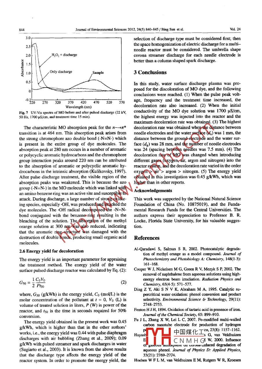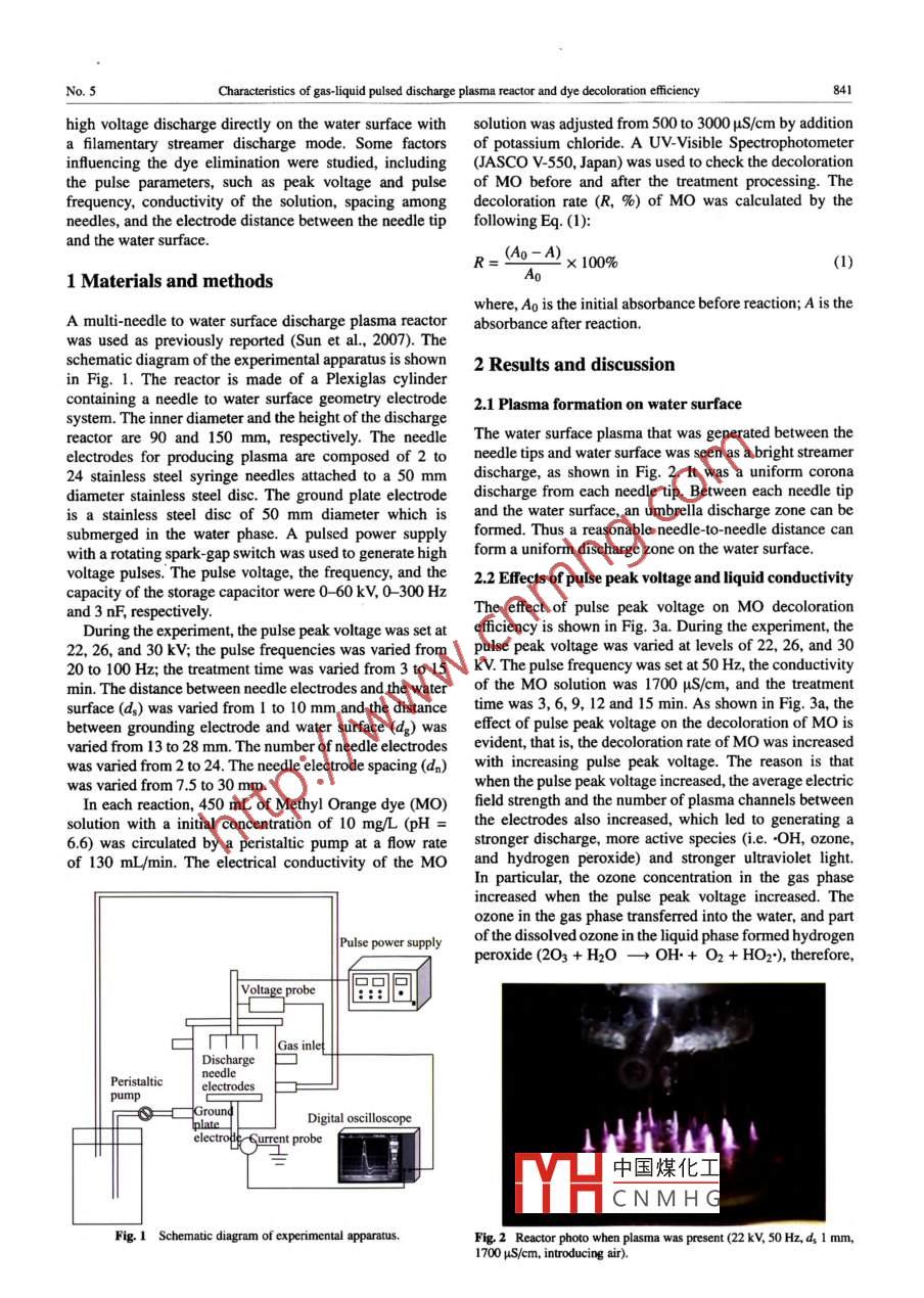 Availableonlineatwww.sciencedirectcomScienceDirectENTALournal of Environmental Sciences 24(2012)840-845Characteristics of gas-liquid pulsed discharge plasma reactor and dyedecoloration eficiencyBing Sun, Nyein Nyein Aye, Zhiying Gao, Dan Lv, Xiaomei Zhu, Masayuki SatoEnvironmentalScienceandEngineeringCollege,DalianMaritimeUniversityDalian116026,ChinaE-mail:sunb88@dlmu.edu.cnReceived 30 June 2011; revised 25 October 2011; accepted 02 November 2011AbstractThe pulsed high-voltage discharge is a new advanced oxidation technology for water treatment. Methyl Orange ( MO)dye wastewaterwas chosen as the target object. Some investigations were conducted on mo decoloration including the discharge characteristics of themulti-needle reactor, parameter optimization, and the degradation mechanism. The following results were obtained. The color groupof the azo dye MO was effectively decomposed by water surface plasma. The decoloration rate was promoted with the increase oftreatment time, peak voltage, and pulse frequency. When the initial conductivity was 1700 u S/cm, the decoloration rate was the highest.The optimum distance between the needle electrodes and the water surface was 1 mm, the distance between the grounding electrodeand the water surface was 28 mm, and the number of needle electrodes and spacing between needles were 24 and 7.5 mm, respectivelyThe decoloration rate of MO was affected by the gas in the reactor and varied in the order oxygen >air argon >nitrogen, and theenergy yield obtained in this investigation was 0.45 g/kwh.Key words: multi-needle plasma reactor; water surface plasma; decoloration efficiency; Methyl Orange decolorationDOI:10.106S10010742(1)60837-1Introductiontemperature and pressure, and low power consumption,thus is a promising technology for wastewater treatmentWith the rapid development of the production of textile Decoloration of dye solutions or decomposition of organicprinting and dyeing, petrochemical, fine chemical, pharma- compounds using plasma on a water surface has been re-ceutical and food industry, etc, large quantities of harmful ported (Sato et aL., 2008: Lukes and Locke, 2005; Hoebensubstances were released into the environment. Conse- et al., 1999; Hayashi et aL, 2000). Corona discharge plasmaquently, the development of efficient and environmentally on the water surface by the application of dc, ac, or pulsesfriendly elimination methods for refractory organic pol- produces active species which diffuse in the gas phase andlutants is a matter of great concem. Advanced oxidation dissolve in the water through the surface layer to reacttechnology effectively promotes the degradation or the with the organic materials in water. It takes some time formineralization of organic pollutants in water, which has the active species to diffuse from the plasma region to thereceived extensive attention. Recently, some advanced water surface. In that time period, short-lived active speciesoxidation technologies, such as Fenton reaction(Fenton, such as radicals would disappear before reaching the water1894), ozonation(Lei and Wang, 2001), UV/O3 oxida- surface. Therefore, filamentary streamer discharge thattion(Olson and Barbier, 1994), H2O/O3(Zhong et al., produces plasma near the water surface was tried to de-1998), UV/H2O2/O3(Kurbus, 2003), wet oxidation(Fu color the dye in water( Sato et al., 2008; Lukes and Locke,et al., 2007), electrochemical oxidation Johnson, 2000), 2005). Sato et al. (2008)reported that the water surfacesupercritical oxidation(Ding et al, 1995), photochemical plasma(wSP)with bright filamentary streamer dischargeoxidation( Nogueira and Guimaraes, 2000; Zhang et al., mode had a higher decoloration rate and a shorter treatment2006), E-beam irradiation( Cooper et al., 2002)and high- time than that with the corona mode Lukes and Lockevoltage pulse discharge plasma have been considered to (2005)investigated the degradation of phenol in a hybridbe promising alternatives for water treatment (Sun et gas-liquid electrical discharge reactor under different gasal., 1999, 2000). High-voltage pulsed discharge plasma condit中國煤化工 oosphere) and liqfor the degradation of organic pollutants in water has uidcharacteristics such as a non-selective high degradation phenolCNMHG in oxygen than inrate for organic pollutants, no secondary pollution, nornargon atmosphere in alkaline solution.In this study, a multi-needle plasma reactor was pro-sCorrespondingauthor.E-mail:sunb88@dlmu.edu.cnposed for decolorizing organic dye solution using a pulsedNo 5Characteristics of gas-liquid pulsed discharge plasma reactor and dye decoloration efficiencyhigh voltage discharge directly on the water surface with solution was adjusted from 500 to 3000 uS/cm by additiona filamentary streamer discharge mode. Some factors of potassium chloride. A UV-Visible Spectrophotometerinfluencing the dye elimination were studied, including (JASCO V-550, Japan) was used to check the decolorationthe pulse parameters, such as peak voltage and pulse of Mo before and after the treatment processing. Thefrequency, conductivity of the solution, spacing among decoloration rate(R, %)of Mo was calculated by theneedles, and the electrode distance between the needle tip following Eq. (1 ):and the water surfaceR=(4100%1 Materials and methodswhere, Ao is the initial absorbance before reaction; A is theA multi-needle to water surface discharge plasma reactor absorbance after reactionwas used as previously reported( Sun et al., 2007). Theschematic diagram of the experimental apparatus is shown 2 Results and discussionin Fig. 1. The reactor is made of aPlexiglas cylindercontaining a needle to water surface geometry electrode 21 Plasma formation on water surfacesystem. The inner diameter and the height of the dischargereactor are 90 and 150 mm, respectively. The needle The water surface plasma that was generated between theelectrodes for producing plasma are composed of 2 to needle tips and water surface was seen