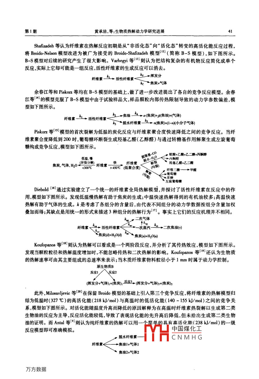 第44卷第1期生物質(zhì)化學(xué)工程Vol 44 No. 12010年1月Biomass Chemical EngineeringJan.2010生物質(zhì)熱解動(dòng)力學(xué)研究進(jìn)展黃承潔,姬登祥,于鳳文,艾寧,計(jì)建炳(浙江工業(yè)大學(xué)化學(xué)工程與材料學(xué)院;生物質(zhì)能源工程研究中心,浙江杭州310032)擴(kuò)要:本文橛迷了近年來一些生物質(zhì)熱裂解動(dòng)力學(xué)模型方面的研究,簡(jiǎn)要介紹了在熔鹽熱裂解生物質(zhì)研究中的應(yīng)用情況關(guān)鍵詞:生物質(zhì);熱解;機(jī)理;動(dòng)力學(xué);熔鹽;模型中圖分類號(hào):TQ424文獻(xiàn)標(biāo)識(shí)碼:A文章編號(hào):163-5854(2010)0-0039-05Research Progress on Kinetics of Biomass PyrolysisHUANG Cheng- jie, JI Deng-xiang, YU Feng-wen, AI Ning, JI Jian-bingResearch Center of Biomass Energy Engineering, College of Chemical Engineering and Materials ScienceZhejiang University of Technology, Hangzhou 310032, China)Abstract: The researches on kinetic models of biomass pyrolysis in recent years were summarized. The application status ofresearch on biomass pyrolysis by molten salt was briefly introduced.Key words: biomass Pyrolysis; mechanism; kinetic; molten salt能源危機(jī)、環(huán)境惡化的雙重壓力迫使人們急需去尋找一種清潔、方便的可再生替代能源。由于生物質(zhì)能具有環(huán)境友好利用方便等特點(diǎn)使其成為一種新的經(jīng)濟(jì)高效的非常規(guī)可再生能源,因此生物質(zhì)能的開發(fā)及利用備受關(guān)注。熱解是一種可將生物質(zhì)高效轉(zhuǎn)化為高品質(zhì)工業(yè)品能源及化學(xué)品的轉(zhuǎn)化技術(shù),可以把70%的生物質(zhì)轉(zhuǎn)化為液體生物質(zhì)能,也可以把75%的生物質(zhì)轉(zhuǎn)化成可燃?xì)怏w。生物質(zhì)熱解過復(fù)雜受熱解運(yùn)行條件和生物質(zhì)本身物化特性影響。生物質(zhì)熱解動(dòng)力學(xué)是熱解技術(shù)的基礎(chǔ)(,對(duì)掌握熱化學(xué)轉(zhuǎn)化機(jī)理和開發(fā)熱化學(xué)轉(zhuǎn)化技術(shù)具有重要意義,有助于裂解反應(yīng)器設(shè)計(jì)和工藝流程優(yōu)化,提高和改善生物質(zhì)熱解的主產(chǎn)物,具有顯著的經(jīng)濟(jì)和社會(huì)效益。1生物質(zhì)熱解過程生物質(zhì)的熱裂解過程24:1)熱量通過外部熱源以對(duì)流和輻射的方式傳遞給物料表面熱量從表面?zhèn)鲗?dǎo)到物料內(nèi)部,溫度升高;2)構(gòu)成生物質(zhì)的聚合物將裂解成更小、更具揮發(fā)性的氣體分子,同時(shí)伴隨著內(nèi)部自由水分的蒸發(fā),內(nèi)部壓力升高揮發(fā)性氣體將通過顆粒的微孔逸出進(jìn)入氣相;3)揮發(fā)分的逸出過程中,揮發(fā)分(熱)和未熱解的物料(較冷)之間會(huì)發(fā)生對(duì)流傳熱;4)傳熱的結(jié)果使得部分揮發(fā)分冷凝形成焦油;5)裂解過程總是導(dǎo)致碳元素的剩余以炭的形式留在顆粒內(nèi)揮發(fā)分氣體與炭的相互作用會(huì)導(dǎo)致二次熱解自催化反應(yīng)的進(jìn)行。2生物質(zhì)熱解動(dòng)力學(xué)研究方法熱解動(dòng)力學(xué)分析一般使用熱重天平測(cè)得的失重速率曲線分析其熱解機(jī)理,常用的有熱重法(TG)和差示掃描量熱法(DSC)。熱重法又分為靜態(tài)法(即等溫法)和動(dòng)態(tài)法(即非等溫法)1。動(dòng)力學(xué)研究中以建立全局表觀模型為主,假定 Arrhenius方程可用于熱分析反應(yīng),即對(duì)于A→B+C中國煤化工收稿日期:2009-10-20CNMHG金項(xiàng)目:國家自然科學(xué)基金資助項(xiàng)目(20876150);斷江省科技廳項(xiàng)目(200c01073);浙江工業(yè)大學(xué)?;?X01872)作者簡(jiǎn)介:黃承潔(1985-),男,廣西南寧人,碩士生,主要從事生物質(zhì)裂解研究;E-mail:hcj_hie@126.com通訊作者:于風(fēng)文(1967-),女教授,碩土生導(dǎo)師,主要從事生物質(zhì)裂解和資源化研究;Emal;yufw@ zjut. edu,cmo生物質(zhì)化學(xué)工程第44卷其反應(yīng)速率方程可表示為6do(a)f(a)為反應(yīng)機(jī)理函數(shù),一般認(rèn)為其與溫度T和時(shí)間t無關(guān),只與反應(yīng)程度a(反應(yīng)的失重率轉(zhuǎn)化率)有關(guān),按較為常見的假設(shè)為f(a)=(1-a),結(jié)合 Arrhenius方程得:Ae kr(1-a)將B=dT/dt代人(2)式得(3)式da A式中;a=(m-m)/(mo-m),m、m、m分別為樣品的初始、時(shí)刻的質(zhì)量和不能分解殘余物的質(zhì)量;k速率常數(shù);A—指前因子,min;E-活化能,kJ/mol;R-氣體常數(shù),8.314kJ/mol;t升溫時(shí)間min;T反應(yīng)溫度K;n-反應(yīng)級(jí)數(shù);B—升溫速率,Kmin。對(duì)(3)式取對(duì)數(shù)差分后得到常用表達(dá)式(4):A(1ad-)-1()-小n(4)式的左端對(duì)△(1/T)/An(1-a)作圖,從圖中可求得E、n,再結(jié)合(1)式和 Arrhenius方程及f(a)即能求出A以上是微分法,對(duì)于積分法,對(duì)(3)式采用 Coats和 Redfern積分得到G(BE/RT其中G(a)得到cn=1G(a)=(1-(1-a)-")/(1-n)n≠1若所假設(shè)的反應(yīng)級(jí)數(shù)n與真實(shí)的裂解反應(yīng)級(jí)數(shù)一致,則ln[G(a)/72]~1/T圖形應(yīng)該是一條直線,便可從直線的斜率和截距分別計(jì)算出樣品熱解的活化能E和指前因子A。3生物質(zhì)熱解動(dòng)力學(xué)研究生物質(zhì)主要由纖維素、半纖維素及木質(zhì)素組成。纖維素的熱裂解行為很大程度上體現(xiàn)了生物質(zhì)的整體熱裂解規(guī)律,因此生物質(zhì)熱解動(dòng)力學(xué)的研究基本都基于纖維素的熱解9。纖維素?zé)峤鈾C(jī)理的探索源于對(duì)纖維素燃燒過程的研究。1975年, Broido等在低溫條件