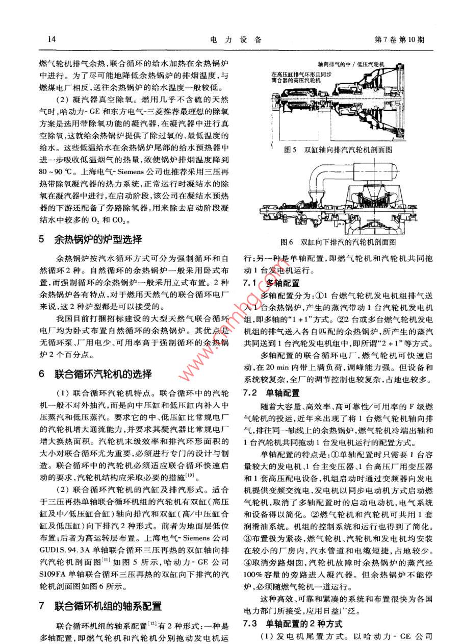 2006年10月電力設(shè)雀@eOct. 2006第7卷第10期Elecrical EquipmentVol.7 No. 10大型天然氣聯(lián)合循環(huán)電廠的設(shè)計優(yōu)化何語平(浙江省電力設(shè)計院,浙江省杭州市310014)摘要:為了使我國正在建設(shè)的一批大型天然氣聯(lián)合循環(huán)電廠投資省、效率高、投產(chǎn)后具有較好的經(jīng)濟效益,對其設(shè)計進行優(yōu)化至關(guān)重要。文章對影響大型天然氣聯(lián)合循環(huán)電廠效率的各種因素進行了深入的研究,對聯(lián)合循環(huán)系統(tǒng)、燃?xì)廨啓C選型蒸汽系統(tǒng)、參數(shù)選擇、余熱鍋爐和汽輪機選型、機組軸系配置、動力島布置等方面進行了設(shè)計優(yōu)化,并提出了明確的優(yōu)化結(jié)論。關(guān)鍵詞:發(fā)電廠;燃?xì)廨啓C;天然氣;聯(lián)合循環(huán)發(fā)電;設(shè)計優(yōu)化中圖分類號:TM611.24;TM611.31為了優(yōu)化能源結(jié)構(gòu)、改善環(huán)境,國家決定利用西循環(huán)就是利用燃?xì)廨啓C做功后的高溫排氣在余熱鍋爐氣東輸和進口液化天然氣( LNG)等清潔能源建設(shè)- -中產(chǎn)生蒸汽, 再送到汽輪機中做功,把燃?xì)庋h(huán)(勃萊批大型天然氣聯(lián)合循環(huán)電廠。我國在“十五”、“+一敦循環(huán)) 和蒸汽循環(huán)(郎肯循環(huán))聯(lián)合在一起的循環(huán)。五"規(guī)劃中把以天然氣為燃料的燃?xì)廨啓C發(fā)電列人重燃?xì)?蒸汽聯(lián)合循環(huán)流程圖見圖1,溫度-熵值(T-S)點發(fā)展項目,本著“以市場換技術(shù)"的原則,近幾年來圖見圖2。國家已先后進行了3次打捆招標(biāo),在實現(xiàn)燃?xì)廨啓C設(shè)備制造本土化和燃?xì)廨啓C技術(shù)開發(fā)國產(chǎn)化方面取得了良好成果。天然(是高效清潔能源,燃?xì)庹羝?lián)合循環(huán)機圖一蘭"組燃用天然氣將極大地改善環(huán)境污染問題。燃用天D2deq朝青棚環(huán)然氣沒有粉塵、沒有灰渣。天然氣幾乎不含硫,因而客。幾乎沒有SO,排放。由于采用低NO,燃燒器,NO.的排放也降到極低的程度。又由于天然氣成分中主要圖1燃?xì)?蒸汽聯(lián)合循環(huán)圖2燃?xì)?蒸汽聯(lián)合循環(huán)是CH,煙氣中CO2的排放也大大減少。流程圖的T-S圖目前我國打捆招標(biāo)實現(xiàn)國產(chǎn)化的大型燃?xì)廨啓C根據(jù)熱力學(xué)原理,理想熱力循環(huán)(卡諾循環(huán))的效率為的單機功率已超過250MW,熱效率已超過36%;所組η=1-T2/T(1)成的聯(lián)合循環(huán)的功率已達(dá)到390 MW ,熱效率已達(dá)到56.7%~58.5%,比目前先進的超臨界、超超臨界火式中,T為熱源平均吸熱溫度;T:為冷源平均放熱溫度。式(1)表明,熱源平均吸熱溫度越高,冷源平均放電機組的效率(40% -45% )高出了一個數(shù)量級。在電廠投資方面,根據(jù)華東地區(qū)西氣東輸?shù)拇笮?熱溫度越低,則循環(huán)效率越高。單軸聯(lián)合循環(huán)機組(江蘇戚墅堰、望亭、張家港、杭州燃?xì)庹羝?lián)合循環(huán)中的高溫?zé)嵩礈囟?透平初半山均為老廠擴建)的可行性研究統(tǒng)計,投資估算為溫)高達(dá)1100~1300C,其熱源平均吸熱溫度遠(yuǎn)遠(yuǎn)高3104~3356元/kW,比帶脫硫裝置的300MW燃煤蒸于蒸汽循環(huán)常采用的主蒸汽溫度540~603C的熱源平均吸熱溫度;聯(lián)合循環(huán)中的冷源平均放熱溫度(凝汽輪機電廠的造價低17. 8% ~ 23.9%。我國天然氣價格相對較高,為使建成后的電廠投汽器溫度)29 ~ 32 C遠(yuǎn)遠(yuǎn)低于一般燃?xì)庋h(huán)的排氣溫資最省、效率最高,投產(chǎn)后具有較好的效益,對大型天度450-640 C。也就是燃?xì)庹羝?lián)合循環(huán)從非常高然氣聯(lián)合循環(huán)電廠的設(shè)計進行全面而系統(tǒng)的研究和的高溫?zé)嵩次鼰?向盡可能低溫的冷源放熱,因此聯(lián)合循環(huán)的熱效率比組成它的任何一個循環(huán)的熱效率優(yōu)化至關(guān)重要。都要高得多。1聯(lián)合循環(huán)系統(tǒng)設(shè)計優(yōu)化目前蒸汽循環(huán)凝汽器的真空隨外部循環(huán)冷卻水的水溫、冷卻方式和真空系統(tǒng)的不同而略有變化,一1.1 提高聯(lián)合循環(huán)效率的途徑般為0. 04 ~0.05 kPa(a) ,其相應(yīng)的溫度為29 ~32 C,聯(lián)合循環(huán)是把2個使用不同工質(zhì)的獨立的動力循已難以降到更低。而燃?xì)庋h(huán)的透平初溫,近年來隨環(huán),通過能量交換聯(lián)合在一起的循環(huán)。燃?xì)庹羝?lián)合著葉片材料和冷卻技術(shù)的提高還在不斷提高。因此2電力設(shè)備第7卷第10期提高聯(lián)合循環(huán)效率的首要途徑就是選擇透平初溫較高壓比的燃?xì)廨啓C排氣溫度較低,雖然就燃?xì)廨啓C本高的燃?xì)廨啓C。理論研究證實",提高燃?xì)廨啓C的初身而言,高壓比的效率比低壓比的高,但余熱鍋爐的溫,可以使聯(lián)合循環(huán)的效率大大提高。能量利用率蒸汽參數(shù)和蒸汽循環(huán)效率都較低;而低1.2余熱鍋爐的補燃 與不補燃壓比的燃?xì)廨啓C的排氣溫度較高,雖然就燃?xì)廨啓C本所謂補燃,即在余熱鍋爐中再補充燃燒- - 部分燃身而言,低壓比的效率比高壓比的低,但蒸汽循環(huán)得料(氣體、液體或固體燃料均可) ,增大余熱鍋爐的產(chǎn)以利用成熟的高溫高壓和再熱技術(shù),可取得蒸汽部分汽量,并提高主蒸汽參數(shù)(不補燃余熱鍋爐的主蒸汽的高效率??梢?在燃?xì)廨啓C初溫一定時,燃?xì)廨啓C溫度受到燃?xì)廨啓C排氣溫度的限制),由此可以增大排