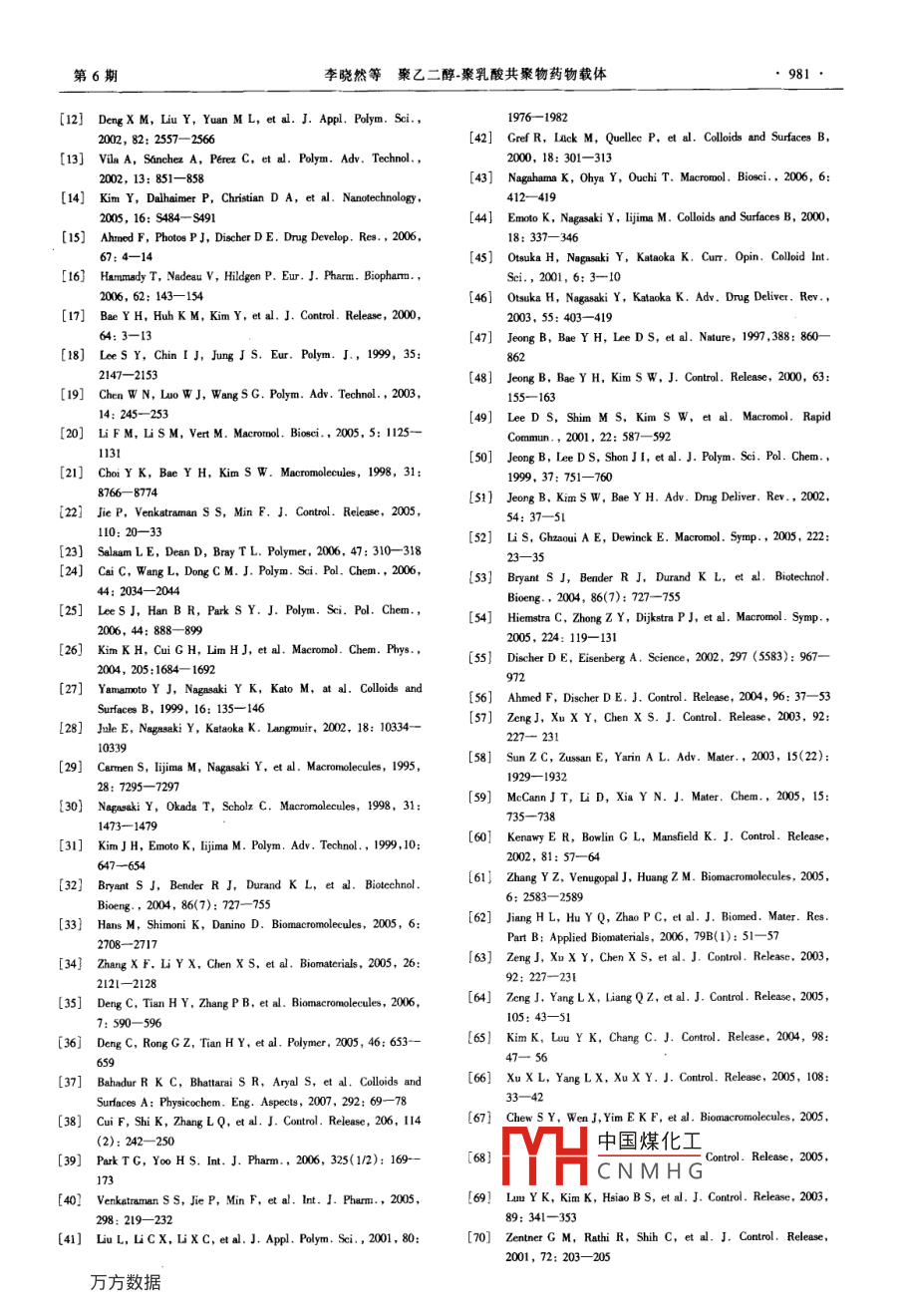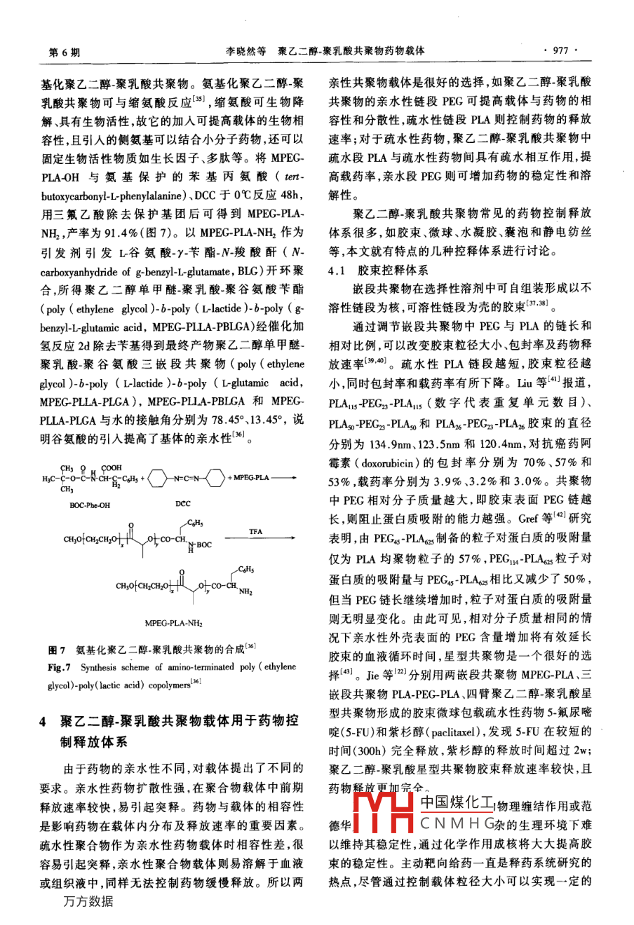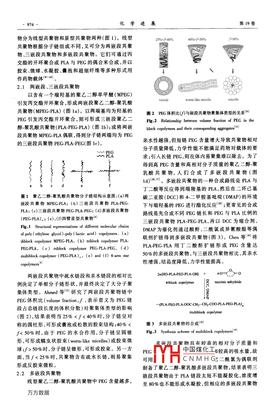 第19卷第6期化學(xué)進展Vol.19 No.62007年6月PROCRESS IN CHEMISTRYJune, 2007聚乙二醇-聚乳酸共聚物藥物載體李曉然袁曉燕(天津大學(xué)材料科學(xué)與工程學(xué)院天津 300072) .摘要本文綜述了聚乙二醇與聚乳酸共聚親水改性的最新進展,包括嵌段和星型結(jié)構(gòu)聚乙二醇-聚乳酸共聚物(PEG-PLA)及其端基化衍生物的合成。同時概述了該共聚物以膠束、微粒、水凝膠和囊泡形式擔(dān)載親水、疏水及蛋白類藥物的應(yīng)用,特別介紹了靜電紡絲法制備的PEG-PLA超細纖維載體及其釋藥特性。關(guān)鍵詞聚乙二醇_聚乳酸共聚物 藥物載體控制釋放靜電紡絲中圖分類號: 0631.5; R318.08文獻標(biāo)識碼: A文章編號: 1005-281X(2007 )06-0973-09Poly( Ethylene Glycol)-Poly(Lactic Acid) Copolymers for Drug CarriersLi Xiaoran Yuan Xiaoyan'(School of Materials Science and Engineering, Tianjin University, Tianjin 300072, China)Abstract Recent progress in hydrophilic modification of poly ( lactic acid) copolymerized with poly ( ethyleneglycol) is reviewed in this paper. Synthesis methods of poly( ethylene glycol)- poly(lactic acid) copolymers (PEG-PLA)with block or star structures and their terminated derivatives, including their applications in loading hydrophilic,hydrophobic or protein drugs in forms of micelle, microparticle, hydrogel and vesicle are summaried. Especially, drugrelease behaviors of ultrafine PEG PLA fbers prepared by electrospinning for drug carriers are introduced .Key words poly ( ethylene glycol )-poly ( lactic acid ) copolymers; drug carriers; controlled release;elctrospinning證。PEG的引入不但提高了PLA的親水性,同時還1引言賦予材料新的特性和功能,它可以減少生物體內(nèi)蛋近年來,可生物降解的合成聚合物已廣泛用作白質(zhì)在材料表面的吸附和細胞的黏附,在體內(nèi)不易藥物載體。由于具有良好的生物相容性和生物降解被免疫系統(tǒng)識別;它可以保護被改性的PLA不受免性,聚乳酸(PLA)已成為常用的藥物載體之一,但其疫系統(tǒng)的破壞,且形成的兩親性共聚物具有可修飾親水性較差,結(jié)構(gòu)中缺少官能性基團,降解速率較性,可引人端基活性基團。PEG改性PLA共聚物可慢,降解周期難以調(diào)控。為了滿足不同藥物控釋體.有效地調(diào)控載體的親疏水性、藥物釋放速率和載藥系的要求,PLA的改性研究成為熱點。常見的PLA .率,延長藥物在血液中的循環(huán)時間、加強藥物靶向給親水性改性材料有聚乙二醇(PEG)"、聚乙烯醇藥能力5-71。本文結(jié)合擔(dān)載藥物的典型實例,就近(PVA)[2)、葡聚糖(dextran)[3}、殼聚糖(chitosan)4)等。年來聚乙二醇-聚乳酸共聚親水改性最新進展進行其中PEG以其獨特性質(zhì)受到大家的關(guān)注, PEG具有綜述和評價,并介紹其發(fā)展前景。優(yōu)異的生物相容性,在體內(nèi)能溶于組織液中,分子量2聚7.二醇.聚乳酸共聚物4000以下的PEC能被機體迅速排除體外而不產(chǎn)生中國煤化工任何毒副作用,其安全性已經(jīng)得到了美國FDA的認.MHCNMHG乙二醇~聚乳酸共聚收稿: 2006年8月,收修改稿: 2007年1月*國家自然科學(xué)基金項目(No.50573055)資助* *通訊聯(lián)系人e-mail:yuanxy @ tju . edu. cn●974●化學(xué)進展第19卷物分為線型共聚物和星型共聚物兩種(圖1)。線型259%50%共聚物根據(jù)分子鏈組成不同,又可分為兩嵌段共聚.物、三嵌段共聚物和多嵌段共聚物。它們可通過丙交酯的開環(huán)聚合或PLA與PEG的偶合來合成,并以膠東、微球、水凝膠、囊泡和超細纖維等多種形式用↓作藥物載體[9-14)。2.1兩嵌段、三 嵌段共聚物以含有一個端羥基的聚乙二醇單甲醚(MPEG)vesicleworm-like micellemicelle引發(fā)丙交酯開環(huán)聚合,形成兩嵌段聚乙二醇-聚乳酸共聚物(MPEC-PLA) (圖1a)。以兩端基均為羥基的團2 PEG 體積比()與嵌段共聚物聚集體類型的關(guān)系['5)PEG引發(fā)丙交酯開環(huán)聚合,則可形成三嵌段聚乙二Fig.2 Relationship between volume fraction of PEG in the醇~聚乳酸共聚物(PLA-PEG-PLA) (圖lb);或?qū)汕禸lock copolymers and their corresponding aggregates 15)段共聚物MPEC-PLA偶聯(lián),得到分子鏈兩端均為PEG親水性越強,但短鏈PEG含量增大導(dǎo)致共聚物相對的三嵌段共聚物PEC-PLA-PEG(圖1c)。分子質(zhì)量降低,力學(xué)性能不能滿足藥物對載體的要PLA求;引人長鏈PEG ,則在體內(nèi)易聚集難以除去。為了得到高PEG含量和高相對分子質(zhì)量的聚乙二醇-聚乳酸共聚物,人們合成了多嵌段共聚物(圖1d1)16,1)。多嵌段共聚物的一種合成路線是PLA與丁二酸等反應(yīng)得到端羧基的PLA,然后在二環(huán)已基圖1聚乙二醇-聚乳酸共 聚物分子鏈結(jié)構(gòu)示意圖:(a)兩碳二亞胺(DCC)和4-二甲胺基吡啶(DMAP)的環(huán)境嵌段共聚物MPEC-PLA; (b)三嵌段共棗物PLA-PEG-下與端羥基的PEG進行酯化反應(yīng)[8);更常見的合成PLA; (c)三嵌段共聚物PEC-PLA-PEG; (d)多嵌段共聚物路線是先合成不同PEG鏈長和PEG與PLA比例的(PEC-PLA).; (e),(f)四臂星型共聚物[2)三嵌段共聚物PLA-PEG-PLA,再以DCC 為縮合劑、Fig.1 Structural tepresentations of diferent molecular chainsDMAP為催化劑通過酸酐、二酰氯或異氰酸酯等偶o(jì)f poly ( elhylene gyol)-poly (lactic acid) copolymers. (a)聯(lián)劑擴鏈得到多嵌段共聚物(圖3)。Chen 等[9)將diblock copolymer MPEG-PLA,(b) triblock copolymer PLA-PLA-PEC-PLA用丁二酸酐擴鏈形成PEG含量達PEG-PLA,(c) triblock copolymer PEG-PLA-PEG, (d)multiblock copolymer (PEC-PLA)。,(e) and (f) 4-am star50%的多嵌段共聚物,與三嵌段共聚物相比,其親水性增強,結