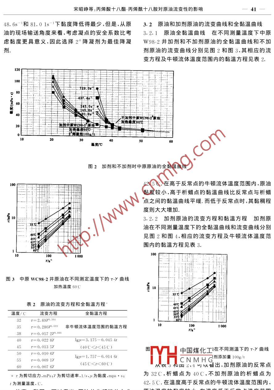 003年1西安石油學(xué)院學(xué)報(bào)(自然科學(xué)版)第18卷第1期Journal of Xi'an Petroleum Institute(Natural Science Edition)Vol. 18 No文章編號(hào):1001-5361(2003)01-0039-04丙烯酸十八酯-丙烯酰十八胺對(duì)原油流變性的影響Effect of Octodecyl Acrylate-octyodecyl Acrylamide Copolymer on theFlowability of Waxy Crude at Low Temperature宋昭崢,葛際江2,張國(guó)忠2,趙福麟(1.石油大學(xué)化工學(xué)院,北京昌平102249;2.石油大學(xué)石油工程學(xué)院,山東東營(yíng)257061)摘要:研究了丙烯酸十八酯-丙烯酰十八胺共聚物對(duì)中原wC98-2井原油流變性的影響,探討了降凝劑的篩選、不加劑和加劑原油的全黏溫曲線的測(cè)定、重復(fù)加熱和高速剪切對(duì)加劑效果的影響和降凝劑的改性效果的時(shí)效性.試驗(yàn)表明:降凝劑使原油的凝點(diǎn)和反常點(diǎn)降低,原油的牛頓流體溫度范圍變寬,并且使非牛頓流體溫度下的黏度減小,但是,牛頓流體溫度范圍內(nèi)的黏度基本沒(méi)有變化;重復(fù)加熱的溫度高于原油的反常點(diǎn)100C以上時(shí),重復(fù)加熱對(duì)降凝劑的改性效果沒(méi)有顯著影響.但是,重復(fù)加熱溫度低于原油的反常點(diǎn),重復(fù)加熱顯著惡化降凝劑的改性效果;在原油的反常點(diǎn)以上高速剪切對(duì)降凝劑的改性效果無(wú)眀顯的影響.在原油析蠟髙峰區(qū)溫度范圍內(nèi)髙速剪切,將大大惡化降凝劑的改性效果.關(guān)鍵詞:降凝劑;全黏溫曲線;重復(fù)加熱;高速剪切中圖分類號(hào):TE358-.12文獻(xiàn)標(biāo)識(shí)碼:A在原油中加入降凝劑,可以改變?cè)椭邢灥慕Y(jié)在室內(nèi)開(kāi)發(fā)研制了丙烯酸十八酯-丙烯酰十八胺共晶形態(tài),使其不易形成空間網(wǎng)絡(luò)結(jié)構(gòu),達(dá)到降凝、減聚物,作為原油降凝劑以改善原油在管線中的流動(dòng)黏,改善原油低溫流變性的目的5.降凝劑是一類性能,使油品在低溫下能連續(xù)流動(dòng)、加入量很少但效果顯本文探討了這類降凝劑對(duì)原油低溫流變性的影著的添加劑.近年來(lái),原油降凝劑的研究取得了較大響,著重研究了以下幾方面的內(nèi)容:降凝劑的篩選的進(jìn)展.在我國(guó),原油降凝劑的研究已進(jìn)入實(shí)用階不加劑和加劑原油的流變性曲線和全黏溫曲線的測(cè)段,國(guó)內(nèi)魯寧、中洛、馬惠寧等長(zhǎng)距離輸油管線已正定、重復(fù)加熱和高速剪切對(duì)原油低溫流變性的影響式應(yīng)用原油降凝劑均實(shí)現(xiàn)了原油不加熱常溫輸送,以及降凝劑改性效果的時(shí)效性.試驗(yàn)結(jié)果表明:!艸停燒了沿途加熱站,節(jié)約了大量燃料費(fèi)用.但是,國(guó)降凝劑對(duì)中原wC98-2井原油具有較好的改善原油內(nèi)目前所用的原油降凝劑仍然是以EVA為主的復(fù)低溫流變性的效果.配型藥劑.EVA原油降凝劑具有較好的適應(yīng)性,同時(shí)也具有一定的降黏效果.針對(duì)一些特定的原油特1試驗(yàn)儀器材料別是含有高碳蠟的原油,其降凝和降黏效果并不理想,且在管線和泵的剪切作用下,加劑原油的凝點(diǎn)和1.1試驗(yàn)原油黏度回升較快,這樣不利于原油的低溫輸送.此外,中原WC8-2井原油的物性為:凝點(diǎn)為34CEVA的成本較高,這也是該藥劑的缺點(diǎn)之(蠟)為24.4%;o(膠質(zhì))為8.0%;vo(瀝青)為為了解決某些含蠟原油,特別是含高碳蠟原油1中國(guó)煤化工的降凝輸送問(wèn)題,提高加劑原油在管線流動(dòng)性和多1次過(guò)泵的抗剪切行為,降低原油降凝劑的生產(chǎn)成本,CNMH叫r八胺共聚物,分子結(jié)構(gòu)收稿日期:2001-08-25作者簡(jiǎn)∮錚(1972-),男,山東曲阜人,博士,講師,主要從事油田化學(xué)方面的研究工作西安石油學(xué)院學(xué)報(bào)(自然科學(xué)版)式為測(cè)量溫度.測(cè)量其黏度和剪切應(yīng)力,并回歸出相應(yīng)的長(zhǎng)CH2CH+m∈CH2CH流變方程,即τγ關(guān)系方程.在測(cè)得不同溫度流變方COOR程的基礎(chǔ)上,作出原油的全黏溫曲線,回歸出黏溫方其中,m為丙烯酸十八酯的聚合度:為丙烯酰十八程胺的聚合度;R為nC1H27對(duì)于原油的流變方程和全黏溫方程,加熱溫度為60C,其他條件與加劑原油相同2.3重復(fù)加熱在60C加熱條件下,加入降凝劑,冷卻至50C裝樣,然后以0.5~1.0C/min的冷卻速率降溫至測(cè)量溫度,再升溫至重復(fù)加熱溫度后,以0.1.0C/min降溫速率降溫至28C,測(cè)量原油在不同000350030002500200015001000500剪切速率下的黏度,并與前述黏度對(duì)比2.4高速剪切圖Ⅰ丙烯酸十八酯-丙烯酰十八胺共聚物的紅外光譜圖加劑原油在恒溫器中加熱至60℃,然后在降溫圖1中,3400,3300·320cm-三峰為含胺基速率為0.5~1.oC/min的降溫過(guò)程中,模擬管流的對(duì)稱、反對(duì)稱吸收峰;2900,2850cm-1強(qiáng)峰為剪切速率為48.60s-…,當(dāng)溫度降至模擬輸油泵剪切CH2,CH3的振動(dòng)吸收峰;1735cm峰為羰基溫度時(shí)改用1312s-的剪切速率高速剪切2min,然C=O振動(dòng)吸收峰;1620cm-峰為變形的含氮振動(dòng)后繼續(xù)以48.60s-的剪切速率和0.5~1.0C/min吸收峰;1375cm-峰為—CH2的對(duì)稱變形吸收峰;降溫速率剪切降溫.當(dāng)溫度降至測(cè)溫28C,測(cè)量不1260,1160cm-峰為C-O基帶形寬峰;725cm同剪切速率下的黏度,并與未經(jīng)受高速剪切,其他實(shí)驗(yàn)條件相同情況下的黏度進(jìn)行對(duì)比峰為_(kāi)CH峰平面搖擺吸收峰在合成過(guò)程中,固定丙烯酸十八酯的含量,改變25時(shí)