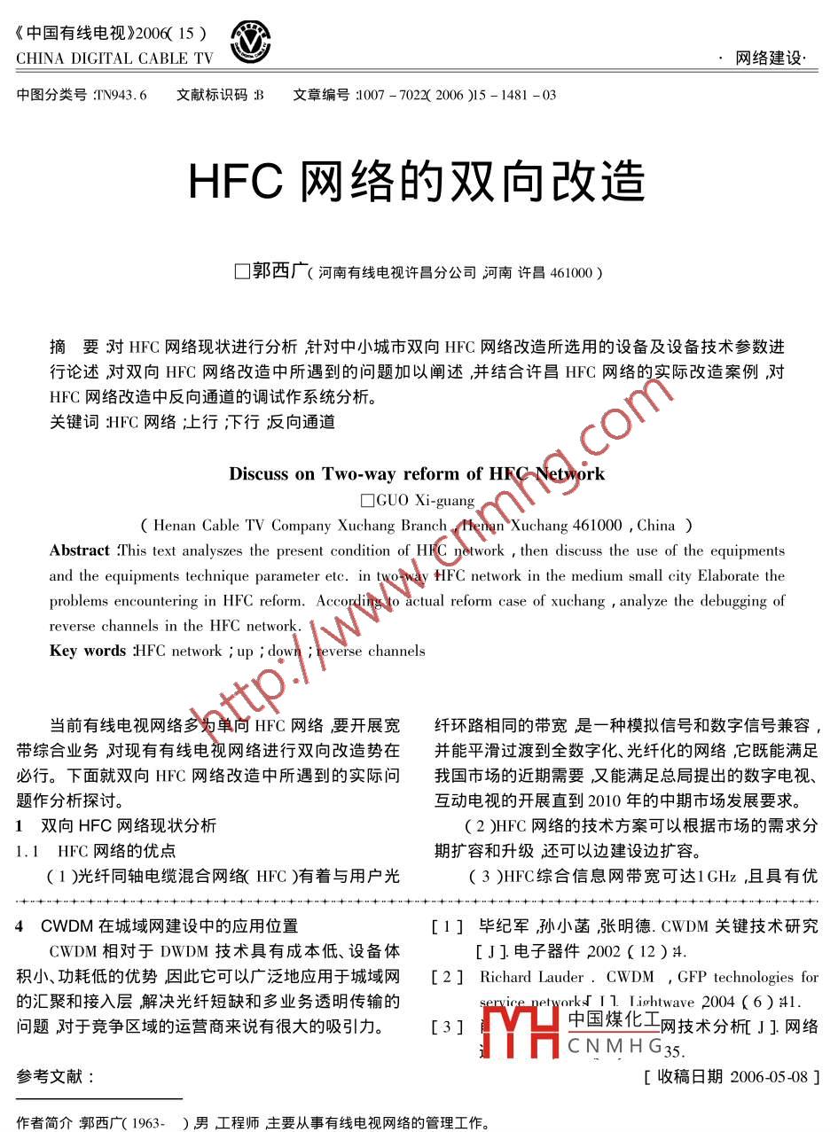《中國有線電視》200615)CHINA DIGITAL CABLE TV②·網(wǎng)絡(luò)建設(shè)中圖分類號TN943.6文獻標(biāo)識碼文章編號:007-702x(2006)5-1481-0HFC網(wǎng)絡(luò)的雙向改造口郭西廣(河南有線電視許昌分公司河南許昌46100摘要對HFC網(wǎng)絡(luò)現(xiàn)狀進行分析計對中小城市雙向HFC網(wǎng)絡(luò)改造所選用的設(shè)備及設(shè)備技術(shù)參數(shù)進行論述對雙向HFC網(wǎng)絡(luò)改造中所遇到的問題加以闡述并結(jié)合許昌HFC網(wǎng)絡(luò)的實際改造案例對HFC網(wǎng)絡(luò)改造中反向通道的調(diào)試作系統(tǒng)分析關(guān)鍵詞HFC網(wǎng)絡(luò)止行;行反向通道Discuss on Two-way reform of HFC NetworkaGUo Xi-guangHenan Cable TV Company Xuchang Branch, Henan Xuchang 461000, ChinaAbstract This text analyszes the present condition of HFC network then discuss the use of the equipmentand the equipments technique parameter etc. in two-way HFC network in the medium small city Elaborate theproblems encountering in HFC reform. According to actual reform case of xuchang, analyze the debugging ofreverse channels in the hfc networkKey words HFC network up down reverse channels當(dāng)前有線電視網(wǎng)絡(luò)多為單向HFC網(wǎng)絡(luò)要開展寬纖環(huán)路相同的帶寬是一種模擬信號和數(shù)字信號兼容帶綜合業(yè)務(wù)對現(xiàn)有有線電視網(wǎng)絡(luò)進行雙向改造勢在并能平滑過渡到全數(shù)字化、光纖化的網(wǎng)絡(luò),它既能滿足必行。下面就雙向HFC網(wǎng)絡(luò)改造中所遇到的實際問我國市場的近期需要漢能滿足總局提出的數(shù)字電視、題作分析探討?;与娨暤拈_展直到2010年的中期市場發(fā)展要求。1雙向HFC網(wǎng)絡(luò)現(xiàn)狀分析(2)HFC網(wǎng)絡(luò)的技術(shù)方案可以根據(jù)市場的需求分1.1HFC網(wǎng)絡(luò)的優(yōu)點期擴容和升級還可以邊建設(shè)邊擴容(1)光纖同軸電纜混合網(wǎng)絡(luò)(HFC)有著與用戶光(3)HFC綜合信息網(wǎng)帶寬可達1GHz且具有優(yōu)中·…+…十十”十…+”十十“十…十”十…十十…+十十“+++…十…++4CWDM在城域網(wǎng)建設(shè)中的應(yīng)用位置[1]畢紀(jì)軍孫小菡張明德.CWDM關(guān)鍵技術(shù)研究CWDM相對于DWDM技術(shù)具有成本低、設(shè)備體[J]電子器件2002(12)積小、功耗低的優(yōu)勢因此它可以廣泛地應(yīng)用于城域網(wǎng)「2] Richard lauder.CWDM, GFP technologies for的匯聚和接入層解決光纖短缺和多業(yè)務(wù)透明傳輸?shù)膐rk I 1. Lightwave 2004(6)41問題對于競爭區(qū)域的運營商來說有很大的吸引力。[3]中國煤化工網(wǎng)技術(shù)分杌J]網(wǎng)絡(luò)CNMHG35參考文獻[收稿日期2006-0508]作者簡介郭西廣(1963-)男工程師主要從事有線電視網(wǎng)絡(luò)的管理工作1481郭西廣出FC網(wǎng)絡(luò)的雙向改造《中國有線電視》2006年第15期異的性能價格比是最適合我國目前國情的寬帶接入30~52dBmⅤ。網(wǎng)同時也是解決信息高速公路最后1km寬帶接入網(wǎng)(3)向工作頻率范圍5~42MHz的最佳方案。4)向損耗均差=(正向損耗最高電平+正向4)現(xiàn)有HFC網(wǎng)絡(luò)多采用星-樹型結(jié)構(gòu)對于有損耗最低電平y(tǒng)2。線電視光節(jié)點擴容、分路器下推極為方便易于擴容升5)向損耗均差=(反向損耗最高電平+反向級改造改造的同時減少了光節(jié)點所帶的戶數(shù)相應(yīng)地?fù)p耗最低電平)2減少了反向噪聲的匯聚6從樓放的輸岀端到用戶終端正向電平損耗1.2HFC網(wǎng)絡(luò)的缺點不超過30~35dBμW以750MHz為標(biāo)準(zhǔn)1)上行帶寬過窄只能夠使用5~65MHz由于(7)樓放至用戶終端反向損耗25~30dBμV以外界因素的干擾,般只能使用20~65MHz因此,上40MHz為標(biāo)準(zhǔn))行帶寬實際可利用的頻帶只有45MHz8)樓放所帶小區(qū)各單元用戶端正向電平損耗均(2)回傳通道匯聚噪聲形成漏斗效應(yīng)不利于反差不超過±3dBμⅤ。向的傳輸。9)樓放所帶小區(qū)各單元用戶CM發(fā)射電平或放(3)朊端供電技術(shù)復(fù)雜、成本高大器反向模塊輸入電平均差不超過±1.5dBμⅤ。2設(shè)備選型10)整個反向鏈路的損耗不能大于60dBμV。2.1中心機房數(shù)據(jù)設(shè)備和終端設(shè)備的選型(11)每個反向信道在其業(yè)務(wù)帶寬內(nèi)的CN值應(yīng)對于中小城市有線電視臺來說要大規(guī)模改造雙≥25dB。向HFC網(wǎng)絡(luò)發(fā)展數(shù)據(jù)業(yè)務(wù)資金明顯不足加上回傳(12)每個光站所帶正向)用戶在500戶以下。噪聲的影響,因而選擇美國 Terayon公司基于4雙向改造注意事項CDMA技術(shù)的CMTs( Cable Modem termination systen)(1)用戶分配網(wǎng)和 CM Cable Modem)原有的HFC網(wǎng)絡(luò)基本不做大的①盡可能選擇屏蔽系數(shù)高的電纜(屏蔽系數(shù)最好改動既克服了HFC網(wǎng)絡(luò)中的噪聲干擾,又降低了投≥100dB)資成本解決了中小城市有線電視臺在資金不足的情②盡可能使電纜有效接地克服電纜網(wǎng)的天線效況下發(fā)展數(shù)據(jù)業(yè)務(wù)的需求應(yīng)2.2反向光發(fā)射模塊的選擇③對無需雙向的支路加高通濾波器進行隔離原有的光接收機是單向接收雙向改造需加反向少反向噪聲的匯聚?;貍鞴獍l(fā)射模塊。反向光發(fā)射模塊有兩種:一種是采④施工中要嚴(yán)格施工工藝特別是各種接頭質(zhì)量,用FP激光器其發(fā)射功率為1mW光鏈路損耗較小、這將有利于防水和減少電纜電容效應(yīng)及回傳噪聲的影傳輸距離短價格便宜但它僅能傳輸數(sh