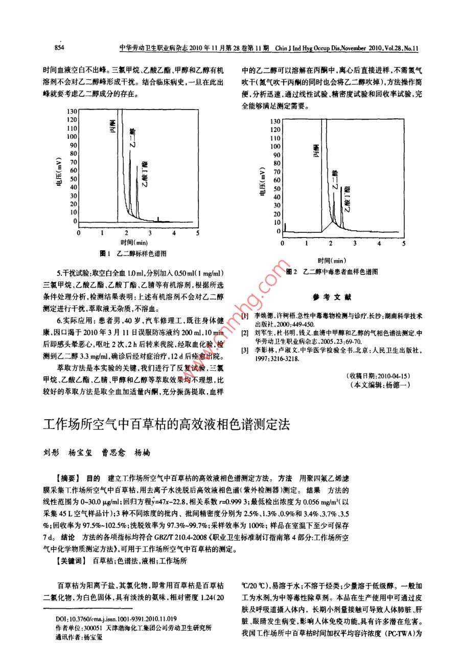 中華勞動衛(wèi)生職業(yè)病雜志2010年11月第28卷第11期 Chin Ind Hy853監(jiān)測與檢驗技術(shù)血液中乙二醇的氣相色譜檢測法陳禮明杜書明陳姿如【摘要】目的建立簡便快速檢測血樣中乙二醇的毛細管柱氣相色譜法。方法取中毒患者靜脈血3.0ml于肝素鋰抗凝管中,取1.0ml全血于具塞玻璃試管中,加入0.9mg/ml乙酸丁酯50l(內(nèi)標(biāo))加1.0ml丙酮充分振蕩萃取,取丙酮層于錐形試管中,取1.0進樣以保留時間定性峰面積內(nèi)標(biāo)法定量。結(jié)果乙二醇線性范圍0.5~5.0mg/ml,回歸方程:y=0.2908x+0.0126,0.9992:平均回收率96.0%102.2%;日內(nèi)和日間相對標(biāo)準(zhǔn)偏差(RSD)分別為:2.97%~4.12%和3.31%4.78%,最低檢出濃度為0.2mg/ml。結(jié)論本方法簡便快速,靈敏度高,分離雜峰少且容易判定,可以滿足檢測需要?!娟P(guān)鍵詞】乙二醇;血液;色譜法氣相乙二醇(ethyleng glycol,EG)又名“甘醇”,為無色無臭有試管中,取1.0進樣甜味液體,作為汽車防凍液和玻璃清潔劑廣泛應(yīng)用于汽車修二結(jié)果與討論配行業(yè)和裝修行業(yè),工人因種種原因誤服防凍液而引起中毒1線性范圍和最低檢出濃度乙二醇檢測線性范圍0.5的病例常年均有發(fā)生血液中乙二醇檢測成為臨床診斷和治5.0mg/ml,最低檢出濃度為0.2mg/ml,回歸方程y=0.2908x+療的一種重要指標(biāo)。為此我們建立了一種快速簡便的血樣0.0126,0.9992乙二醇氣相色譜檢測方法2.精密度試驗:取體檢正常人全血5.0ml,分別配制0.5、一、材料與方法1.5、3.0mg/ml高、中、低3種乙二醇濃度標(biāo)準(zhǔn)樣品,加0.91.儀器與試劑:9790型氣相色譜儀(浙江溫嶺福立分析mg/ml乙酸丁酯50μl,分別吸取1.0m加丙酮1.0ml充分振儀器有限公司),氫火焰檢測器(FID)F9500譜工作站蕩萃取5min。然后以3000r/mi離心10min取上清丙酮層(浙江福立分析儀器有限公司)。乙二醇標(biāo)準(zhǔn)品為分析純(于錐形玻璃試管中,取1.0進樣。在同一日不同時間及不津市北方天醫(yī)化學(xué)試劑廠)丙酮、三氯甲烷、乙酸乙酯、甲同日間按上述方法萃取樣品,在相同色譜條件下測定乙二醇醇、乙醇均為分析純,0.9mgml乙酸丁酯(內(nèi)標(biāo))標(biāo)準(zhǔn)貯備液濃度,計算日內(nèi)日間相對偏差,見表1。的配制:準(zhǔn)確吸取乙二醇0.5ml置于100ml容量瓶中,用丙表1精密度試驗結(jié)果(n=5)酮定容至刻度,配成5.55mg/ml乙二醇標(biāo)準(zhǔn)貯備液。乙二醇濃度日內(nèi)日間2.色譜條件:S-54毛細管色譜柱:(30mx0.25mmD),(gml)x相標(biāo)準(zhǔn)偏差(%)x相對標(biāo)準(zhǔn)偏差(%氣化室溫度250℃檢測器柱溫:200℃柱溫:100恒溫操0.50.480.0204.120.50200244.78作。載氣:0.12MPa,氫氣:0.1MPa,空氣0.03MPa,衰減51.51.550.0754.841.480.0553.723標(biāo)準(zhǔn)曲線的繪制:取乙二醇標(biāo)準(zhǔn)貯備液用正常人全3.03.100.0922.973.080.1023.31血配制0.10.50、、1.50、.050g/ml的乙二醇標(biāo)準(zhǔn)系列,各管加入0.9mg/ml乙酸丁酯50μ,分別吸取1.0ml3.回收率試驗:取體檢正常人全血5.0ml,分別配制標(biāo)樣加1.0ml丙酮充分振蕩萃取5min。然后以3000rmin0.50、1.5.05.00mml乙二醇標(biāo)準(zhǔn)樣品,加0.9mg/ml離心10min。取上清丙酮層于錐形玻璃試管中取1.0進乙酸丁酯50山,分別吸取1.0ml加酮1.0ml充分振蕩萃樣。保留時間定性,峰面積內(nèi)標(biāo)法定量。按上述血樣萃取方法取5min然后以300rmn離心10min取上清內(nèi)酮層于錐做5次平行試驗,分別記錄峰面積。以乙二醇峰面積與乙酸形玻璃試管中,取1.0μ測定,見表2丁酯峰面積比值(y)對血液乙二醇濃度(x)進行回歸,并計算表2回收率試驗結(jié)果(n=5)回歸方程,以3倍信噪比計算該方法的最低檢出濃度。乙二醇濃度平均測定值回收率相對標(biāo)準(zhǔn)差4.樣品測定:取中毒患者靜脈血3.0ml于肝素鋰抗凝試(mg/ml)(mg/ml)(%)(rsd%)管中,取1.0ml全血于具塞玻璃試管中,加0.9mg/ml乙酸丁0.50.4896.03.74酯50l,加1.0ml丙酮充分振蕩萃取,取丙酮層于錐形試管1.51.399264.65中,取1.0μ進樣。3.03.04101.34.125.血樣空白試驗取健康人血液1.0ml,加0.9mg/ml乙5.05.11102.23.98酸丁酯50,用1.0ml丙充分振蕩萃取,取丙酮層于錐形4.乙二醇定性與保留時間:從乙二醇標(biāo)樣和中毒患者血doI:10.3760/cma issn0-391.2010.11.018樣色譜圖分析,在上述色譜條件下乙二醇出峰的保留時間約作者單位:300162天津武警醫(yī)學(xué)院附屬醫(yī)院毒檢中心為2.178min(見標(biāo)樣色譜圖1,患者血樣色譜圖2),在此保留54中華勞動衛(wèi)生職業(yè)病雜志2010年11月第28卷第11期 Chin Ind Hyg Occup DisNovember20v.n時間血液空白不出峰。三氯甲烷、乙酸乙酯甲醇和乙醇有機中的乙二醇可以溶解在丙酮中離心后直接進樣,不需氮氣溶劑不會對乙二醇峰形成干擾。結(jié)合臨床病史,一旦在此出吹干(氮氣吹干丙酮的同時也會將乙二醇吹掉)方法操作簡蜂就要考慮乙二醇成分的存在。便,分析迅速,通過線性試驗、精密度試驗和回收率試驗,完全能夠滿足測定需要。1301200000000000000110100098790506040一N0123時間(min)00001231乙二醇標(biāo)樣色譜圖時間(min)5.干擾試驗:取空白全血1.0ml,分別加入0.50ml(1mg/ml)圖2乙二醇中毒患者血樣色譜圖三氯甲烷、乙酸乙酯、乙酸丁酯、乙等有機溶劑,根據(jù)所選條件處理分析,檢測結(jié)果表明:上述有機溶劑不會對乙二醇參考文獻測定進行干擾,萃取液無雜質(zhì),不溶血。6實際應(yīng)用:患者男,40歲汽車修理工,既往身體健李煥德許樹梧急性中毒卷物檢測與診療長沙:湖南科學(xué)技術(shù)出版社