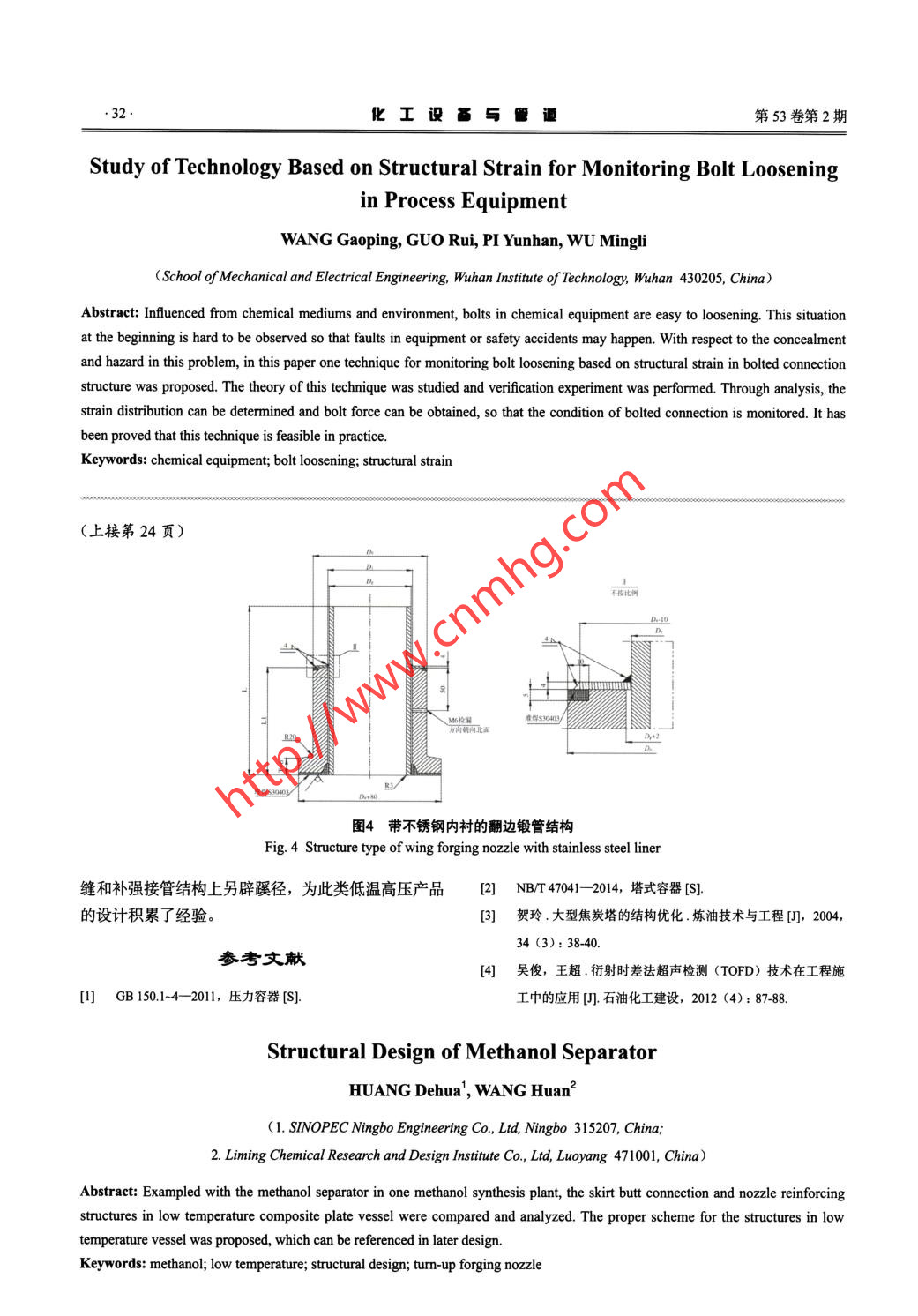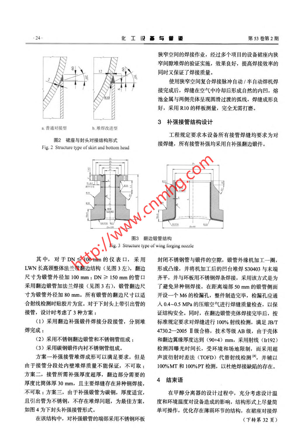 .24.化工設(shè)備與管譴第53卷第2期狹窄空間的焊接作業(yè),經(jīng)過多個項目的設(shè)備裙座內(nèi)狹窄間隙堆焊的驗證實施,效果良好,提高焊接效率的12同時又保證了焊接質(zhì)量。使用狹窄空間復(fù)合焊接脈沖自動/半自動焊機焊接完成后,焊縫在空氣中冷卻后形成自然的內(nèi)凹,熔池金屬與兩側(cè)殼體呈現(xiàn)圓滑過渡的弧線,焊縫成形良好,采用R10的樣板測量,完全無需打磨。3補強接 管結(jié)構(gòu)設(shè)計a.普通對接型b.堆焊改進型工程規(guī)定要求本設(shè)備所有接管焊縫均要求為對圖2裙座與封頭對接結(jié)構(gòu)形式接焊縫,所有接管補強均采用自補強翻邊鍛件。Fig. 2 Structure type of skirt and bottom headR1938 電/\R193810/圖3翻邊鍛管結(jié)構(gòu)Fig. 3 Structure type of wing forging nozzle其中,對于DN≤100 mm的儀表口,采用封閉不銹鋼管與鍛件的空隙,鍛管外緣機加工- -圈,LWN長高頸整體法蘭帶翻邊結(jié)構(gòu)(見圖3左),翻邊形成凸緣,并將機加工后的凹臺堆焊S30403 與末端尺寸為鍛管外徑加100mm;DN≥150mm的管口齊平,并與環(huán)板用不銹鋼焊條焊接,采用該方式是為采用翻邊鍛管加法蘭焊接(見圖3右),鍛管翻邊尺了避免異種鋼焊接。在距離端部50mm的鍛管側(cè)面寸為鍛管外徑加80mm。所有鍛管的翻邊尺寸以適開設(shè)-一個M6的檢漏孔,整件制造完畢,檢漏孔應(yīng)通合射線檢測時貼膠片為宜。對于下封頭上帶引出管的入0.4~0.5 MPa的壓縮空氣進行焊縫質(zhì)量檢查,以保接管,設(shè)計時考慮了3種方案:證結(jié)構(gòu)安全。同時,在翻邊鍛管殼體焊接完畢后,按(1)采用翻邊補強鍛件焊接分段接管,分別堆標準規(guī)定要求對焊縫進行100%射線檢測,滿足JB/T焊完成;4730.2- -2005 I級合格,技術(shù)等級AB級,由于殼體(2)采用不銹鋼翻邊鍛管和不銹鋼管組成;和翻邊翼緣厚度達到(90+4) mm,采用射線(Ir192)(3)采用碳鋼鍛件內(nèi)襯不銹鋼管組成。檢測因曝光時間長,受環(huán)境和場地限制,而采用超方案一補強接管堆焊成形可以滿足要求,但是聲波衍射時差法(TOFD)代替射線檢測4,并輔以由于接管分段處內(nèi)壁堆焊質(zhì)量不能保證,不可取;100%MT和100%PT檢測,以杜絕焊接缺陷的存在。方案二,接管所需補強厚度超厚,翻邊部分需要的厚度比簡體厚30 mm,且主要焊縫存在異種鋼焊接,4結(jié)束語不可取;方案三,由于補強鍛管為碳鋼,厚度適宜,在甲醇分離器的設(shè)計過程中,充分考慮設(shè)計溫且引出管為不銹鋼,不存在堆焊問題,為最佳方案,度和環(huán)境溫度對設(shè)備造成的影響,結(jié)構(gòu)形式上盡量簡如圖4為下封頭補強接管形式。單可操作,優(yōu)化存在薄弱環(huán)節(jié)的結(jié)構(gòu),在裙座對接焊在該結(jié)構(gòu)中,對補強鍛管的端部采用不銹鋼環(huán)板(下轉(zhuǎn)第32頁)..32.化工設(shè)晶與管道第53卷第2期Study ofTechnology Based on Structural Strain for Monitoring Bolt Looseningin Process EquipmentWANG Gaoping, GUO Rui, PI Yunhan, WU Mingli(School of Mechanical and Elecrical Enginering, Wuhan Institute of Technology, Wuhan 430205, China)Abstract: Infuenced from chemical mediums and environment, bolts in chemical equipment are easy to loosening. This situationat the beginning is hard to be observed so that faults in equipment or safety accidents may happen. With respect to the concealmentand hazard in this problem, in this paper one technique for monitoring bolt loosening based on structural strain in bolted conectionstructure was proposed. The theory of this technique was studied and verification experiment was performed. Through analysis, thestrain distribution can be determined and bolt force can be obtained, so that the condition of bolted connection is monitored. It hasbeen proved that this technique is feasible in practice.Keywords: chemical equipment; bolt loosening; structural strain(上接第24頁)不樓比網(wǎng)D-10堆50403/萬向朝向北面上n,王堆型SJ0H0Y圖4帶不銹鋼內(nèi)襯的翻邊鍛管結(jié)構(gòu)Fig. 4 Structure type of wing forging nozzle with stainless steel liner縫和補強接管結(jié)構(gòu)上另辟蹊徑,為此類低溫高壓產(chǎn)品[2] NB/T 47041- -2014, 塔式容器[S].的設(shè)計積累了經(jīng)驗。3] 賀玲.大型焦炭塔的結(jié)構(gòu)優(yōu)化.煉油技術(shù)與工程[], 2004,34 (3): 38-40.參考文獻4] 吳俊,王超.衍射時差法超聲檢測(TOFD)技術(shù)在工程施1] GB150.1-4- -2011, 壓力容器[S].工中的應(yīng)用[J].石油化工建設(shè),2012 (4): 87-88.Structural Design of Methanol SeparatorHUANG Dehua', WANG Huan2(1. SINOPEC Ningbo Engineering Co., Ltd, Ningbo 315207, China;2. Liming Chemical Research and Design Institute Co., Ltd, Luoyang 471001, China)Abstract: Exampled with the methanol separator in one methanol synthesis plant, the skirt butt connection and nozzle reinforcingstructures in low temperature composite plate vessel were compared and analyzed. The proper scheme for the structures in lowtemperature vessel was proposed, which can be referenced in later design.Keywords: methanol; low temperature; structural design; turn-up forging nozzle.