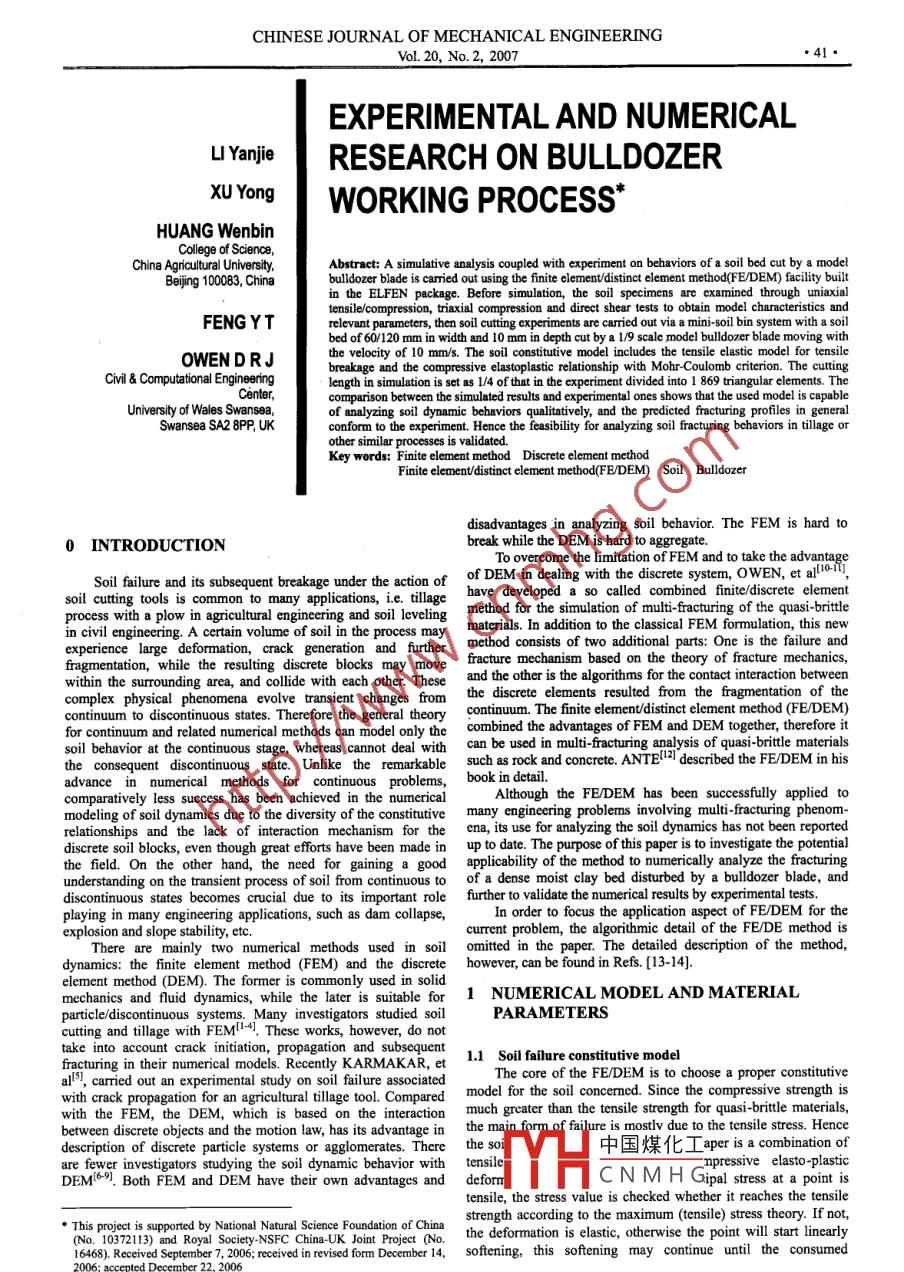 CHINESE JOURNAL OF MECHANICAL ENGINEERINGVol. 20, No. 2, 2007●41●EXPERIMENTAL AND NUMERICALL YanjieRESEARCH ON BULLDOZERXU YongWORKING PROCESS*HUANG WenbinCollge of Science,China Agiutural Universily,Beijing 10083, Chinain theELFEN package. Before snmlation the soil spcimes are cxamined yhrough wrixiaitesilecompression, trixia! copression and direet shear ests to obltin mode: Cacacristits andFENG YTrelevant paramneters, then soil cuting experiments are caried out vIaamini-son binsystem wIthasonlbed of 60/120 mm in widh and 10 mm in deph cut bya.1/9 scale model blldoer blade moving withOWEN DRJthe velocity of 10 mp/s. The soil cositive model includes the ensile castite me for tensilebreakage and the compressive eatplastic rlationship with Mohr-Coulomb crterion. The cutingCivil & Computational Engineringlength in simulatiou is set as 14 of tha in the xerimet dvided into 1 869 tiangular cemems. TheCenter. ,comparison betwen the simulated results and experimental ones shows that the used model is capableUniversityof Wales Swansea,of analyzing soil dynamic behaviors qualitatively, and the predicted fracturing profles in generalns;Swansea SA2 8PP UKconform to the experiment. Hence the feasibility for analyzing soil fracturing bchaviors in tllage orother similar proceses is validated.Key words: Finite element method Discrete element methodFinite elementdistinct clement method(FE/DEM) Soil Bulldozerdisadvantages in analyzing soil behavior. The FEM is hard to0 INTRODUCTIONbreak while the DEM is hard to aggregate.To overcome the limitation ofFEM and to take the advantageSoil failure and its subsequent breakage under the action ofof DEM in dealing with the discrete system, OWEN, et alu“,soil cutting tools is common to may applications, i.e. tllagehave developed a so called combined finite/discrete elementpross with a plow in gricitural nginering and soil lveig mehod for the simolaton of muiatrini of the qusibritein civil engineering. A certain volume of soil in the process maymaterials. In addition to the classical FEM formulation, this newexperience large deformation, crack generation and furthermethod consists of two additional parts: One is the failure andfragmentation, while the resulting discrete blocks may movefracture mechanism based on the theory of fracture mechanics,wibin he suroundingn are, and Colide wih each otber. These and he other is the agoritimis for the conter ieretieon betveencomplex physical phenomena evolve transient changes fromthe discrete elements resulted from the fragmentation of thecontinuum to discontinuous states. Therefore the general theorycontinum. The finite element/distinct element method (FE/DEM)for (nuumnd related numerical methods can mnodel ooly the combined the advantages of FEM and DEM together, therefore itsoil behavior at the continuous stage, whereas cannot deal withcan be used in multi-fracturing analysis of quasibritle materialsthe consequent discontinuous state. Unlike the remarkablesuch as rock and concrete. ANTE4I described the FE/DEM in hisadvance in numerical methods for continuous problems,book in detail.comparatively less success has been achieved in the numericalAlthoughhe FE/DEM has been scessfully applied tomodeling of soil dynamics due to the diversity of the constitutive many eginering problems involving multifacturing phenom-relationships and the lack of iteraction mechanism for the ena, its use for analyzing the soil dynamics has not bee reporteddiscrete soil blocks, even though great efforts have been made inup to date. The purpose of this paper is to investigate the potentialthe field. On the other hand, the need for gaining a gooapplicability of the method to numerically analyze the fracturingunderstanding on the transient process of soil from continuous toof a dense moist clay bed disturbed by a bulldozer blade, anddiscontinuous states becomes crucial due to its important role further to validate the numeriricalresultsuts by' experimental teplaying in many engineering applications, such as dam collapse,In order to focus the application aspect of FE/DEM for theexplosion and slope stability, etc.current problem, the algorithmic detail of the FE/DE method isThere are mainly two numerical methods used in soil omitted in the paper. The detailed description of the method,dynamics: the finite element method (FEM) and the discrete however, can be found in Refs. [13-14].element method(DEM). The former is commonly used in solid1 NUMERICAL MODEL AND MATERIALmechanics and fluicdynamics, whilethe later is suitable forparticle/discontinuous systems. Many investigators studied soilPARAMETERScutting and tllage with FEM[+4. These works, however, do nottake into account crack initiation, propagation and subsequent1.1 Soil failure constitutive modelfracturing in their numerical models. Recently KARMAKAR, etThe core of the FE/DEM is to choose a proper constitutiveals, carried out an experimental study on soil failure associatedwith crack popagation for an aigcuturat tlgeg tl Compared model for the soil concemed. Sine the compresive stengh iswith the FEM, the DEM, which is based on the iteraction much greater than the tnsile strengh for qusibittle materialsbetween discrete objects and the motion law, has its advantage inthe main form of failure is mostlv due to the tensile stress. Hencedescription of discrete particle systerms or agglomerates. There the soi中國煤化工aper is a combination ofare fewer investigators studying the soil dynamic behavior with tensile:npressive elasto-plasticDEM[69. Both FEM and DEM have their own advantages and deformCNMHGipalstresatapointistensile, the stress value is checked whether it reaches the tensile* This project is supported by National Natural Science Foundation of Chinastrength according to the maximum (tensile) stress theory. If not,(No.10372113) and Royal Society-NSFC China-UK Joint Project (No.the deformnation is elastic, otherwise the point will start linearly16468). Reeved September 7. 20060 reeived in 