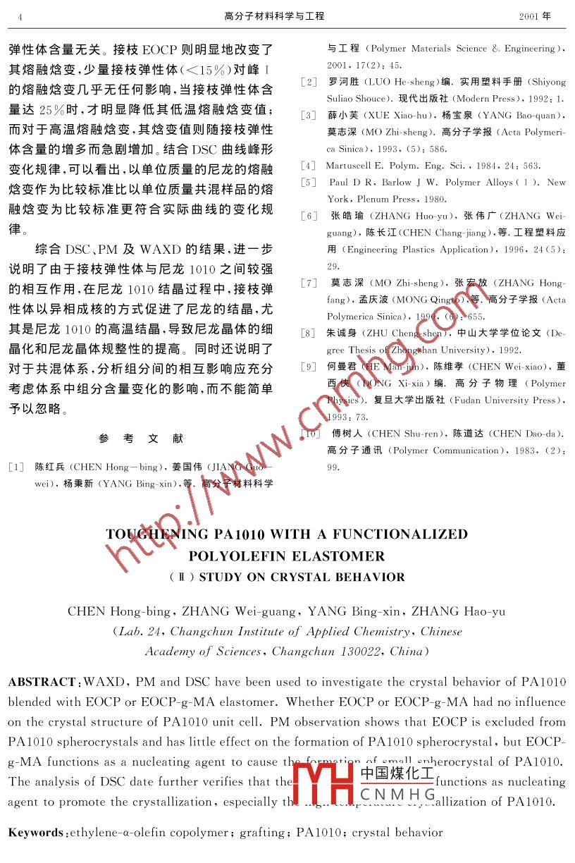 第17卷第4期高分子材料科學與工程Vol. 17. No. 42001年7月POLYMER MATERIALS SCIENCE AND ENGINEERING官能化聚烯烴彈性體增韌PΔ1010體系Ⅱ.結晶行為的研究陳紅兵,張偉廣,楊秉新,張皓瑜中國科學院長春應用化學研究所24室,吉林長春130022)摘要:用WAXD、偏光顯微鏡(PM及DSC研究了聚烯烴彈性體乙烯-α烯烴共聚物(EOCP)對PA1010結晶行為的影響。WAXD結果顯示純彈性體(EOCP)和接枝彈性體( EOCP-g-MA)對PA1010的晶型均不產生影響。PM觀察則表明共混體系中EOCP與PA1010的相互作用很弱,在PA1010結晶過程中,大部分EOCP被排除在球晶之外;而接枝FOCP與PAl010存在較強的相互作用,大量的 EOCP-g-MA作為成核劑,使PA1010球晶向細晶化方向發(fā)展,而且隨彈性體含量的增多而加強。DSC分析證實了接枝EOCP以異相成核劑的方式促進了PA1010的結晶,尤其是促進了PA1010的高溫結晶關鍵詞:乙烯-α-烯烴共聚物;接枝;尼龍1010;結晶行為中圖分類號:TQ323.6文獻標識碼:A文章編號:1000-7555(201)04-0074-04一種新的不含有雙鍵的烯烴彈性體EOCP物材料開發(fā)中心;EOCP接枝馬來酸酐(EOCP-成功地應用于增韌尼龍1010。PA1010是的物8-MA):實驗室自制,接枝率為0.51%(質量)種結晶性較好的聚合物材料,其許多優(yōu)良的物使用前經(jīng)40C真空干燥12h。理性質,如優(yōu)異的力學性能、良好的耐油和耐溶1.2樣品的制備劑性、較高的使用溫度范圍等均與其結晶性密將干燥過的PA1010和 EOCP-g-MA或切相關2EOCP按比例(質量比)先充分混勻,用雙螺桿共混體系中結晶聚合物的結晶行為不僅受擠出機熔融共混,流動空氣冷卻,牽引造粒。使其本身的分子結構、結晶條件的影響34,而且用前粒料經(jīng)110℃真空干燥12h。所用儀器為與體系中組分間相互作用的密切程度有關SH-30型雙螺桿配料混煉擠岀機,南京橡塑機烯烴彈性體EOCP的馬來酸酐化顯著地增強械廠制造,螺杄直徑φ=30mm,長徑比L/了它與PA1010之間的界面粘合,改善了它們28,溫度設置:188-200-213-215(,轉速之間的相容性,導致了材料性能的提高口,也必100r/min,喂料電壓:15V,共混物配比及編號然會影響到PA1010的結晶行為。本文綜合運見Tab.1用多種表征手段,考察并比較 EOCP-g-MA及1.3測試與表征EOCP對共混體系中PA1010結晶行為的影1.3.1廣角Ⅹ射線衍射(WAXD)分析響,進一步建立起結構與性能之間的關系PA1010及共混粒料經(jīng)230C熔融5min,再壓成1mm厚的樣板,空氣中冷卻后用于測試1實驗部分凵中國煤化工PW170X射線衍射1.1主要原料牌A2型產品,使用前10c真空干燥12h“輻射 CNMHG,定時記數(shù)取點。C山Ka尼龍1010(PA1010):上海賽璐珞廠三鹿石墨單色濾波器烯-a-烯烴共聚物(EOCP):購于北京普利高聚收稿日方數(shù)據(jù)-17陳紅兵(1974-),男,博士高分子材料科學與工程2001年Tb1 Compositions of PA1010/ EOCP-g-MA EOCP-g-MA和EOCP共混后的PA1010,其or PA1010/EOCP blends(mass %(002)晶面衍射峰強度無明顯變化,但(010,PA1010OCPPA1010110)晶面衍射峰強度則均有所減弱,但減弱的NGI幅度不大且與彈性體是否接枝MA無關,表明彈性體的加入對尼龍分子鏈沿(010,110)晶面NG385PT3的結晶有一定的阻礙作用。對于(100)晶面,經(jīng)彈性體改性后的PA1010,其衍射峰強度均有所增強,而且接枝彈性體改性后的增幅更大,表明彈性體的加入,尤其是接枝MA彈性體的加PT6入明顯地促進了尼龍分子鏈在垂直于氫鍵所在1.3.2偏光(PM)觀察:將樣品于230C熔面方向的有序排列,結晶的完善程度提高。融,進行壓片處理,產生很薄的熔體涂層,再置2.2球晶的偏光觀察于250℃的烘箱中5min以消除熱歷史,取出Fig.2給出了純PA1010和彈性體改性后于空氣中自然冷卻。用XPR2型偏光顯微鏡觀的PA1010偏光顯微照片。可以看出,純察球晶形態(tài)并拍照。PA1010具有球晶特有的黑十字消光環(huán),而且1.3.3差示掃描量熱法(DSC)分析:采用球晶尺寸較大。相對于純PA1010,在PA1010/Perkin- Elmer dsc-7型差示掃描量熱儀對樣EOCP共混體系中,PA1010球晶有所變小,但品進行熱分析,所有的樣品均先快速升溫至變化的幅度不大而且?guī)缀跖c體系中EOCP的250C,停留5min以消除熱歷史,然后在空氣含量無關;對于 EOCP-g-MA改性PA1010體中自然冷卻至室溫,再以10C/min升溫至系,少量彈性體(5%)的加入,球晶即明顯地向250C,記錄升溫曲線。細晶化方向發(fā)展,而且隨接枝彈性體含量的增加,這一趨勢變得更加明顯。球晶的生長受晶核的生成速率和晶體的生長速率兩方面的制約低溫不利于晶體的生長,高溫不利于晶核的生成9。由于EOCP與PA1010相容性很差,分子PT6間的相互作用很弱,在PA1010結晶過程中,大PA1010部分EOCP被排除在球晶之外,對PA1010晶體的生長并不產生明顯的影響;而 EOCP-gMA與PA1010在擠出過程中,分子間發(fā)生化Fig. 1 X-ray diffraction of PA1010, NG6 and PT6學反應,產生新的化學鍵,改善了 EOCP-gMA與PA1010的相容性,加強了 EOCP-g2結果與討論MA與PA1010分子間的相互作用。在PA10102.1WAXD分析結晶過程中, EOCP-g-MA以異相成核的方式Fig.1為PA1010及其共混物的廣角X射為PA1010結晶提供了大量晶核,促使尼龍晶線衍射圖,其中PT6、NG6的彈性體含量為體向細晶化方向發(fā)展而且隨體系彈性體含量30%。可以看出,相對于PA1010,無論是加入的增多,晶核的數(shù)量也隨之增加,細晶化的趨勢EOCP還是加入 EOCP-g-MA,共混物的衍射中國煤化工圖中既無新的衍射峰出現(xiàn),也無任何衍射峰消CNMHG失,而且衍射峰的峰形和位置均無明顯變化,表Pig.3為個同嗶性體含量的PA1010/明 EOCP-g-MA和EOCP對尼龍1010的晶型EOCP及PA1010/ EOCP