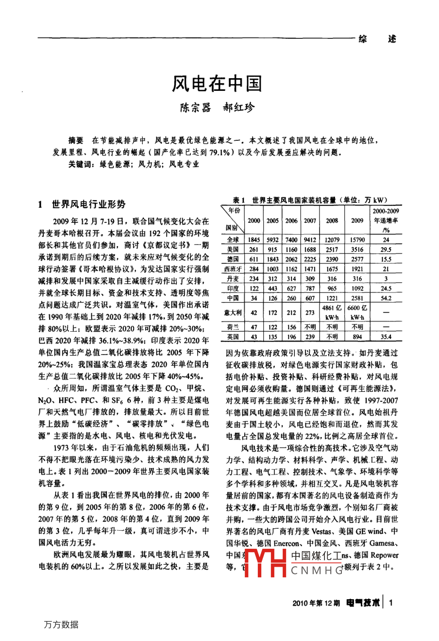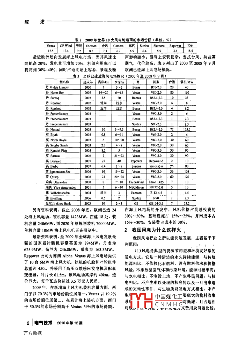 綜述風電在中國陳宗器郝紅珍摘要在節(jié)能減排聲中,風電是最優(yōu)綠色能源之一,本文概述了我國風電在全球中的地位,發(fā)展里程、風電行業(yè)的崛起(國產(chǎn)化率已達到79%)以及今后發(fā)展亟應解決的問題關(guān)鍵詞:綠色能源;風力機;風電專業(yè)1世界風電行業(yè)形勢表1世界主要風電國家裝機容量(單位:萬kW)份丹麥哥本哈根召開。本屆會議由192個國家的環(huán)境別、/2001010041000年遞增2009年12月719日,聯(lián)合國氣候變化大會在部長和其他官員們參加;商討(京都議定書}期 593217400(9412 12079 5790 249516016851735629.5承諾到期后的后續(xù)方案,就未來應對氣候變化的全德國1843206222252390257715.5球行動簽署《哥本哈根協(xié)議》,為發(fā)達國家實行強制西班牙28410016214716511減排和發(fā)展中國家采取自主減緩行動作出了安排,丹麥2343231430416316并就全球長期目標、資金和技術(shù)支持、透明度等焦965109216260607[12212581542點問題達成廣泛共識。對溫室氣體,美國作出承諾6億600億巴西20年減排31%39%:日度表示200年不明湖/令在190年礎上到2020年減排17%,到2050年減利“|z2|2121203排80%以上;歐盟表示2020年可減排20%-30%;荷蘭46239單位國內(nèi)生產(chǎn)總值二氧化碳排放將比2005年下降因為依靠政府政策引導以及立法支持。如丹麥通過20%-25%;:我國溫家寶總理表態(tài)2020年單位國內(nèi)征收碳排放稅,對綠色電源實行國家財政補貼,包生產(chǎn)總值二氧化碳排放比2005年下降40%45%括電價補貼、投資補貼、科研經(jīng)費補貼,對風電規(guī)眾所周知,所謂溫室氣體主要是CO2、甲烷、定電網(wǎng)必須收購量。德國則通過《可再生能源法》,N2O、HFC、PFC、和SF66種,前3種主要是煤電對發(fā)展可再生能源實行各種補貼,致使1997-2007廠和天然氣電廠排放的,排放量最大。所以目前世年德國風電超越美國而位居全球首位。風電始祖丹界上鼓勵“低碳經(jīng)濟”、“碳零排放”、“綠色電麥由于國土較小,風電已經(jīng)飽和而退位,然而其發(fā)源”主要指的是水電、風電、核電和光伏發(fā)電。電量占全國總發(fā)電量的22%,比例之高居全球首位。1973年以來,由于石油危機的頻頻出現(xiàn),人們電技術(shù)是一項綜合性的高技術(shù)。它涉及空氣動不得不把眼光落在環(huán)境污染少、技術(shù)成熟的風力發(fā)力學、結(jié)構(gòu)動力學、材料科學、聲學、機械L程、動電上。表1列出2000-2009年世界主要風電國家裝力工程、電氣工程、控制技術(shù)、氣象學、環(huán)境科學等機容量。多個學科和多種領(lǐng)域,并相互交叉。凡是風電裝機容從表1看出我國在世界風電的排位,由2000年量居前的國家,都有本國著名的風電設備制造商作為的第9位,到2005年的第8位,2006年的第6位,技術(shù)支撐。由于風電市場競爭激烈,個別知名廠商被2007年的第5位,2008年的第4位,直到2009年并購,一些大的跨國公司開始介入風電行業(yè)。目前世的第3位,幾乎每年升一級,真可謂進步不小,中界著名的風電廠商有丹麥 vestas,美國 GE wind、中國風電活力無窮。國華銳、德國 Enercon、中國金風、西班牙 Gamesa、歐洲風電發(fā)展最為耀眼,其風電裝機占世界風中國中國煤化工ns、德國 Repower電裝機的60%以上。之所以發(fā)展如此之快,主要是等CNMHG額列于表2中。2010年第12期電氣技術(shù)1綜述表22009年世界10大風電制造商的市場份額(單位:%)Vestas GE Wind華銳 Enercon金風Gmes東汽 Suzlon Siemens Repower其他最近歐洲趨向發(fā)展海上風電市場,因其風速比聲影響面小。但海上安裝復雜,要抗臺風、防鹽霧陸地高20%,發(fā)電量可增加70%,機組利用率可以潮氣,代價較高。表3列出了2000至2008年9月提高到30%40%;同時占地比陸上容易,景觀及噪歐洲已造海上風電場概況表3全球已建近海風電場概況(2000年至2008年9月)建成年離岸km水深佃m□丿商臺數(shù)裝機Mw丹 Midde Landen2000BonasB76202040丹 Horns Rer00214~206~12v80-20803520Bmus8:423_103丹丹丹丹近岸淺水001近岸淺水32423Vestas丹FreB82423丹 Frederiksharm20035~9.5B82423l65.6英Byh2003Vestas66-2.0英 Scorby Sands234~8stasV80-20Kentish Flatsv90-3.0英721~23veas英荷荷v80-2.06000000000瑞典 Utgranden20007-10 Enron Wind Enron1,4257瑞典 Yhre stengrunden2016-10 NEGMicon NM72-20德 Wilhelmshafen2004近岸3Enercon EI12-45德 Breitling愛爾蘭 rklow Bank03102~3GEGE10436另有資料表明,截止2008年底,歐洲已造24在海上風電場的開發(fā)中,風機價格占到總投資的處海上風電場,裝機容量1423MW,在建18處,裝30%~50%:基礎設施占15%~25%:并網(wǎng)成本占機容量2406MW,到2020年總規(guī)劃裝機700001%6~30%,安裝費占成本的30%單機容量10MW海上風電機正在研制中。2我國風電為什么這樣火最新資料表明,至2009年全球海上風電發(fā)展最我國風電行業(yè)之所以能快速發(fā)展,主要基于下猛的國家累計裝機容量英國為894MW,丹麥為列原因6259MW,荷蘭為2468MW,瑞典為163.3MW(1)風電是典型的資源節(jié)約型和環(huán)境友好型的Repower公司為德國 Alpha Ventas海上風電場提供發(fā)電方式。它是一種清潔的永久持續(xù)能源,與傳統(tǒng)了10臺6MW海上風力機,該機的機艙和葉輪組件能源相比,不依賴化石燃料,沒有燃料供求和價格總重達450,并采用了高壓雙饋感應發(fā)電機及配套風險,不排放溫室氣體和污染環(huán)境,能源回報率高;變流器,葉片長615m。該風電場離岸約40km,造與水電相比,不淹沒土地,不產(chǎn)生移民問題;與核價巨大,