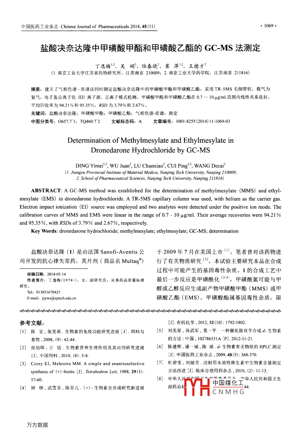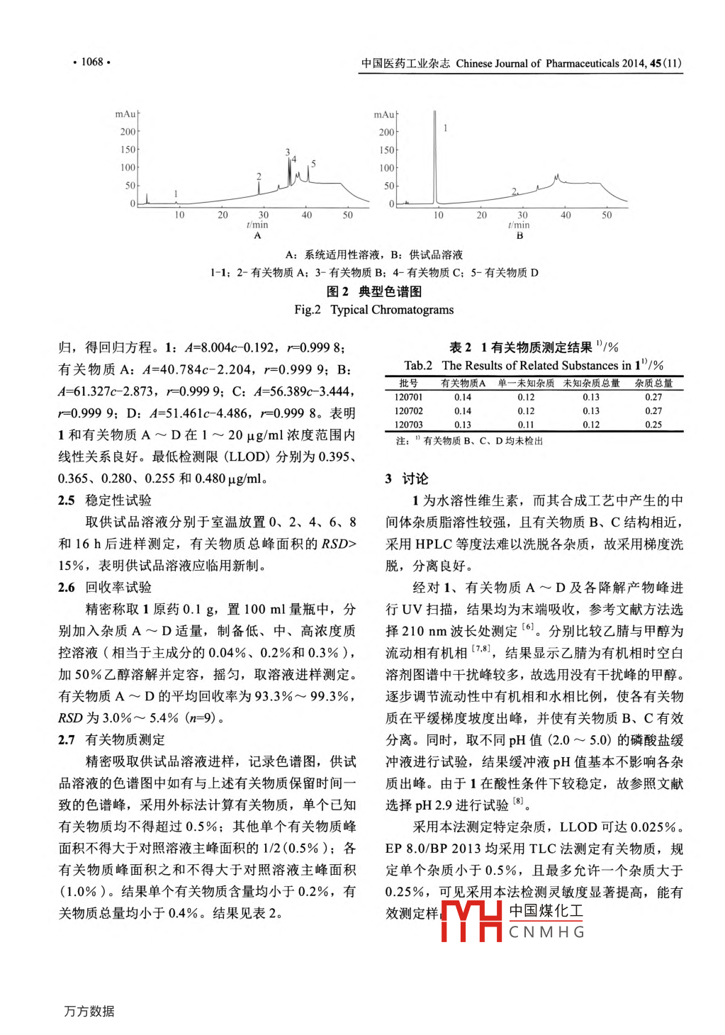 中國(guó)醫(yī)藥工業(yè)雜志 Chinese Journal of Pharmaceuticals2014,45(11)生物素中有關(guān)物質(zhì)的HPLC法測(cè)定陳雪帆3,胡楚楚冫,趙盼盼2,鄭國(guó)鋼(1.浙江工業(yè)大學(xué)長(zhǎng)三角綠色制藥協(xié)同創(chuàng)新中心,浙江杭州310014:2.浙江省食品藥品檢驗(yàn)研究院,浙江杭州310004;3.杭州艾品醫(yī)藥科技有限公司,浙江杭州310014)摘要:建立了高效液相色譜法測(cè)定生物素的有關(guān)物質(zhì)。采用C1色譜柱,以16.7 mmol/L磷酸鹽緩沖液(pH29):甲醇為流動(dòng)相,梯度洗脫,檢測(cè)波長(zhǎng)210nm。在上述色譜條件下生物素與各中間體及降解產(chǎn)物均能有效分離,4種已知有關(guān)物質(zhì)在1~20ug/m1范圍內(nèi)線性關(guān)系良好,平均回收率為933%~99.3%,最低檢測(cè)限分別為0.365、0.280、0.255和0.480μgml關(guān)鍵詞:生物素;有關(guān)物質(zhì);高效液相色譜:測(cè)定中圖分類號(hào):O65772:TQ460.72文獻(xiàn)標(biāo)志碼:A文章編號(hào):1001-8255(2014)11066-04Determination of Related Substances in Biotin by hPlcCHEN Xuefan", HU Chuchu, ZHAO Panpan, ZHENG Guogang(1. Zhejiang University of Technology Collaborative Innovation Center of Yangtze River Delta Region Green Pharmaceuticals, Hangzhou 3100142. Zhejiang Institute for Food and Drug Control, Hangzhou 310004; 3. Hangzhou Irvine Pharmaceutical Services, Hangzhou 310014)ABSTRACT: An HPLC method was established for the determination of the related substances in biotin. A CI8column was used, with the mobile phase of PBS (16.7 mmol/L, pH 2.9): methanol by gradient elution, at the detectionwavelength of 210 nm. Biotin and the related substances were well separated. The calibration curves for related substancesA-D were linear in the range of 1-20 Hg/mL. Their average recoveries were 93.3%-99.3%, and the low limits ofdetection were 0.365, 0.280, 0. 255 and 0.480 ug/ml, respectivelyKey words: biotin; related substance; HPLC; determination生物素(1)是多種羧化酶的輔酶,在羧化酶反效果好,專屬性強(qiáng),方法簡(jiǎn)便。應(yīng)中起CO2載體的作用,它以游離形式或與蛋白1儀器與試劑質(zhì)結(jié)合的形式廣泛分布于動(dòng)植物組織中(2。除經(jīng)典1260型組合式全自動(dòng)高效液相色譜儀,含G1311B型的合成路線外,另有采用(3aS,6aR)-六氫-2-氧四元泵、G4212B型二極管陣列紫外檢測(cè)器和G1329BALS代-1,3-二芐基-1H噻吩并[3,4-d咪唑-4烯戊酸型自動(dòng)進(jìn)樣器(美國(guó) Agilent公司)。為原料,通過氫化、脫芐、環(huán)合制得15,該合成1對(duì)照品(中國(guó)食品藥品檢定研究院,批號(hào)過程中會(huì)產(chǎn)生有關(guān)物質(zhì)A~D,結(jié)構(gòu)式見圖1。歐100291-200402);1原藥(含量994%,批號(hào)120701;含量洲藥典8.0版(EP8.0)采用TLC法控制1(經(jīng)典路93%,批號(hào)120702和120703)及有關(guān)物質(zhì)A~D(色譜線)中的有關(guān)物質(zhì)。1含量及有關(guān)物質(zhì)測(cè)定已有報(bào)純度均大于95%)均由浙江圣達(dá)藥業(yè)有限公司提供。甲醇道均不能有效測(cè)定后一種方法中產(chǎn)生的有關(guān)乙醇為色譜純,磷酸二氫鉀、磷酸均為分析純,水為重蒸水。物質(zhì)A~D。故本研究建立了HPLC法測(cè)定,分離2方法與結(jié)果21溶液制備收稿日期:201402-13:修回日期:201409-08作者簡(jiǎn)介:陳雪帆(1978-),男,副教授,從事化學(xué)藥物的質(zhì)量研供試品溶液:精密稱取1原藥適量,加50%乙宄與控制,藥品質(zhì)量標(biāo)準(zhǔn)的制訂、復(fù)核及生物利用度的研究等。醇溶解并稀街m1的淀跡,搖勻,作為供Tel:013819183280試品溶液。中國(guó)煤化工E-mail:xfchen@aliyun.comCNMHG中國(guó)醫(yī)藥工業(yè)雜志 Chinese Journal of pharmaceuticals2014,45(11)1067人COOHy-cHeCOOCH,圖1有關(guān)物質(zhì)A~D的結(jié)構(gòu)Fig 1 Structures of Related Substances A-D系統(tǒng)適用性溶液:分別精密稱?、駥?duì)照品與靈敏度,使有關(guān)物質(zhì)A色譜峰的峰高約為滿量程有關(guān)物質(zhì)A~D100mg,各置100ml量瓶中,加的20%;調(diào)節(jié)流速使1色譜峰的保留時(shí)間約7~50%乙醇溶解并定容,搖勻;精密量取上述溶液各10min,各組分出峰順序依次為1、有關(guān)物質(zhì)A、B、m,置同一100ml量瓶中,加流動(dòng)相定容,搖勻,C和D,1與各有關(guān)物質(zhì)的分離度應(yīng)符合規(guī)定;理制成混合溶液(0μgm),作為系統(tǒng)適用性溶液。論板數(shù)按1峰計(jì)不低于3000。色譜圖見圖2。可見22色譜條件與系統(tǒng)適用性試驗(yàn)各色譜峰分離完全,理論板數(shù)以1峰計(jì)大于4000色譜柱 Agilent CIt8柱(46mm×250mm,5um)23專屬性試驗(yàn)流動(dòng)相16.7mmol/L磷酸鹽緩沖液(取磷酸二氫鉀取本品50mg,共5份,各置50m1量瓶中227g,加水至IL,用磷酸調(diào)至pH2.9;A)∶甲醇加50%乙醇5ml搖勻,分別進(jìn)行酸、堿、氧化、(B),梯度洗脫(程序見表1);流速1.0ml/min:檢強(qiáng)光和高溫破壞,分別取上述溶液用50%乙醇定容測(cè)波長(zhǎng)210m:進(jìn)樣量20μl。(酸、堿破壞樣品須中和),搖勻,進(jìn)樣。結(jié)果表明,1峰與各中間體、降解產(chǎn)物峰分離良好,1在表1梯度洗脫程序酸、堿性條件下較不穩(wěn)定,1與主要降解產(chǎn)物均在Tab 1 Gradient elution Procedure210nm波長(zhǎng)附近有較大吸收0→875:2524線性試驗(yàn)8→3575:25→20:80精密稱取1對(duì)照品和有關(guān)物質(zhì)A~D適量,20:8020:80→75:25加50%乙醇溶解并稀釋,制成1、2.5、5、7.5、10、15和20中國(guó)煤化工,記錄色譜圖。取系統(tǒng)適用性溶液注入液相色譜儀,調(diào)節(jié)檢測(cè)以濃度c為CNMH