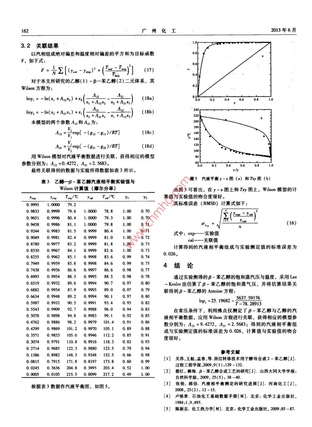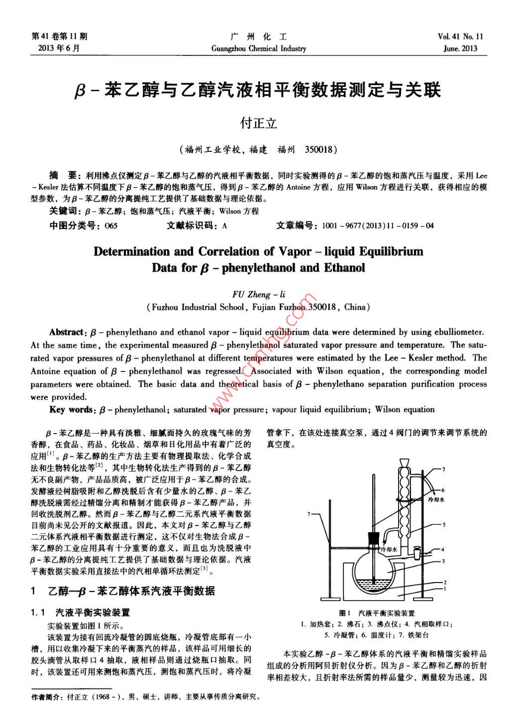 第41卷第11期廣州化工Vol 41 No. 112013年6月Guangzhou Chemical IndustryJune 2013β-苯乙醇與乙醇汽液相平衡數(shù)據(jù)測(cè)定與關(guān)聯(lián)付正立(福州工業(yè)學(xué)校,福建福州350018)摘要:利用沸點(diǎn)儀測(cè)定B-苯乙醇與乙醇的汽液相平衡數(shù)據(jù),同時(shí)實(shí)驗(yàn)測(cè)得的B-苯乙醇的飽和蒸汽壓與溫度,采用LeeKesler法估算不同溫度下β-苯乙醇的飽和蒸氣壓,得到B-苯乙醇的 Antoine方程,應(yīng)用 Wilson方程進(jìn)行關(guān)聯(lián),獲得相應(yīng)的模型參數(shù),為B-苯乙醇的分離提純工藝提供了基礎(chǔ)數(shù)據(jù)與理論依據(jù)關(guān)鍵詞:B-苯乙醇;飽和蒸氣壓;汽液平衡; Wilson方程中圖分類(lèi)號(hào):065文獻(xiàn)標(biāo)識(shí)碼:A文章編號(hào):1001-9677(2013)11-0159-04Determination and Correlation of Vapor-liquid EquilibriumData for B-phenylethanol and EthanolZheng-liFuzhou Industrial School, Fujian Fuzhou 350018, China)Abstract: B-phenylethano and ethanol vapor-liquid equilibrium data were determined by using ebulliometerAt the same time, the experimental measured B- phenylethanol saturated vapor pressure and temperature. The saturated vapor pressures of B- phenylethanol at different temperatures were estimated by the Lee-Kesler method. TheAntoine equation of B- phenylethanol was regressed. Associated with Wilson equation, the corresponding modelparameters were obtained. The basic data and theoretical basis of B-phenylethano separation purification processwere providedKey words: B- phenylethanol; saturated vapor pressure; vapour liquid equilibrium; Wilson equationB-苯乙醇是一種具有淡雅、細(xì)膩而持久的玫瑰氣味的芳管拿下,在該處連接真空泵,通過(guò)4閥門(mén)的調(diào)節(jié)來(lái)調(diào)節(jié)系統(tǒng)的香醇,在食品、藥品、化妝品、煙草和日化用品中有著廣泛的真空度。應(yīng)用。B-苯乙醇的生產(chǎn)方法主要有物理提取法、化學(xué)合成法和生物轉(zhuǎn)化法等2,其中生物轉(zhuǎn)化法生產(chǎn)得到的B-苯乙醇無(wú)不良副產(chǎn)物,產(chǎn)品品質(zhì)高,被廣泛應(yīng)用于B-苯乙醇的合成。發(fā)酵液經(jīng)樹(shù)脂吸附和乙醇洗脫后含有少量水的乙醇、B-苯乙醇洗脫液需經(jīng)過(guò)精餾分離和精制才能獲得β-苯乙醇產(chǎn)品,并冷卻水回收洗脫劑乙醇。然而B(niǎo)-苯乙醇與乙醇二元系汽液平衡數(shù)據(jù)目前尚未見(jiàn)公開(kāi)的文獻(xiàn)報(bào)道。因此,本文對(duì)B-苯乙醇與乙醇二元體系汽液相平衡數(shù)據(jù)進(jìn)行測(cè)定,這不僅對(duì)生物法合成B-苯乙醇的工業(yè)應(yīng)用具有十分重要的意義,而且也為洗脫液中1冷卻水β-苯乙醇的分離提純工藝提供了基礎(chǔ)數(shù)據(jù)與理論依據(jù)。汽液平衡數(shù)據(jù)實(shí)驗(yàn)采用直接法中的汽相單循環(huán)法測(cè)定3。1乙醇-β-苯乙醇體系汽液平衡數(shù)據(jù)1.1汽液平衡實(shí)驗(yàn)裝置圖1汽液平衡實(shí)驗(yàn)裝置實(shí)驗(yàn)裝置如圖1所示。1.加熱套;2.沸石;3.沸點(diǎn)儀;4.汽相取樣口該裝置為接有回流冷凝管的圓底燒瓶,冷凝管底部有一小5.冷凝管;6.溫度計(jì);7.鐵架臺(tái)槽,用以收集冷凝下來(lái)的平衡蒸汽的樣品,該樣品可用細(xì)長(zhǎng)的膠頭滴管從取樣口4抽取,液相樣品則通過(guò)燒瓶口抽取。同本實(shí)驗(yàn)乙醇-B-苯乙醇體系的汽液平衡和精餾實(shí)驗(yàn)樣品時(shí),該裝置還可用來(lái)測(cè)飽和蒸汽壓,測(cè)飽和蒸汽壓時(shí),將冷凝組成的分析用阿貝折射儀分析。因?yàn)锽-苯乙醇和乙醇的折射率相差較大,且折射率法所需的樣品量少,測(cè)量較為迅速,因作者簡(jiǎn)介:付正立(1968-),男,碩士,講師,主要從事傳質(zhì)分離研究廣州化工2013年6月此本實(shí)驗(yàn)適用。折射率是物質(zhì)的一個(gè)特征數(shù)值。溶液的折射率和蒸汽壓,下面就對(duì)B-苯乙醇飽和蒸汽壓進(jìn)行測(cè)定與組成有關(guān),因此測(cè)得一系列已知濃度的溶液折射率,做出在2.1B-苯乙醇飽和蒸汽壓的測(cè)定定溫度下溶液的折射率一組成工作曲線(xiàn),就可以按內(nèi)插法得本實(shí)驗(yàn)測(cè)定飽和蒸汽壓的裝置如圖3所示。到這種未知溶液的組成。測(cè)定時(shí),保持溫度在30℃,測(cè)得乙醇-B-苯乙醇的組成折光率工作曲線(xiàn)如圖2所示,得到乙醇-B-苯乙醇溶液中乙醇的質(zhì)量分?jǐn)?shù)y與折光率n的關(guān)系為y=6.17ln2-23.67ln+21.775y=61711n2-23.671n+21.75R2=0.9999毅0圖3飽和蒸汽壓測(cè)定裝置1.加熱套;2.沸石;3.燒瓶;4.放空口;5.真空泵;6.鐵架臺(tái)該裝置通過(guò)真空泵抽氣,并通過(guò)放空口的調(diào)節(jié)來(lái)保持系統(tǒng)壓力的穩(wěn)定,當(dāng)燒瓶?jī)?nèi)溶液沸騰且溫度穩(wěn)定后,從溫度計(jì)上讀得溫度,從真空泵上的真空表讀得壓力,這樣就能得到燒瓶?jī)?nèi)折光率n液體的飽和蒸汽壓P,與溫度T的數(shù)據(jù)。圖2乙醇-B-苯乙醇溶液的阿貝折射儀標(biāo)準(zhǔn)曲線(xiàn)(30℃)實(shí)驗(yàn)測(cè)得的B-苯乙醇的飽和蒸汽壓與溫度如表2所示。1.2實(shí)驗(yàn)步驟表2B-苯乙醇飽和燕汽壓實(shí)驗(yàn)值實(shí)驗(yàn)測(cè)定乙醇-B-苯乙醇體系汽液平衡的步驟如下(1)配制某一濃度的β-苯乙醇-乙醇混合液,加入沸點(diǎn)儀(2)搭好裝置,開(kāi)始加熱,當(dāng)混合液沸騰且溫度穩(wěn)定約169.5min后,汽相及液相各取一個(gè)樣;l86.1(3)用阿貝折射儀測(cè)定汽相和液相樣品的折射率;(4)在原