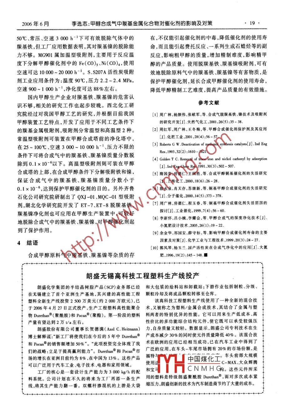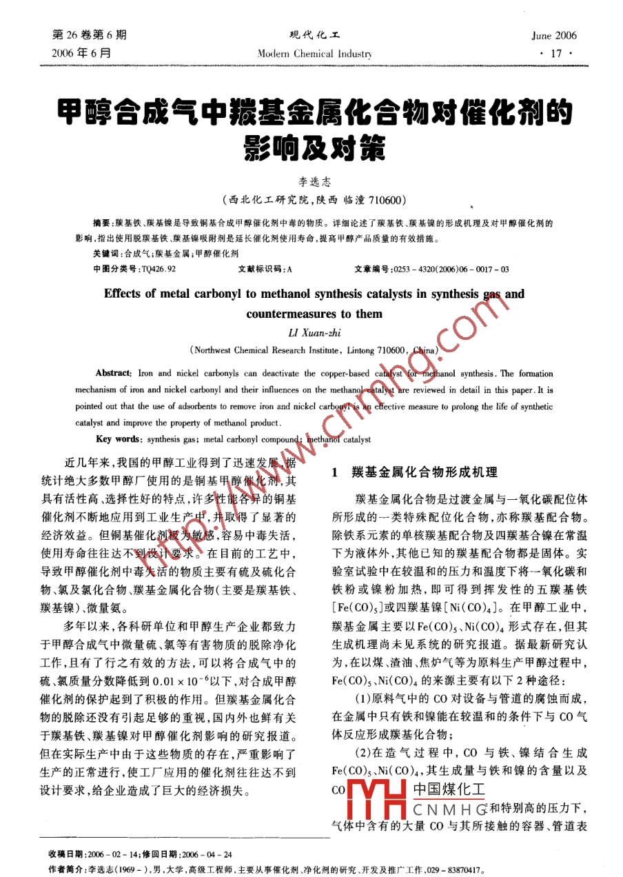 第26卷第6期現(xiàn)代化工une2006年6月Modern Chemical Industry甲醇合成氣中基金屬化合物對(duì)催化劑的影響及對(duì)策李選志(西北化工研究院,陜西臨潼710600摘要:羰基鐵、羰基鎳是導(dǎo)致銅基合成甲醇催化劑中毒的物質(zhì)。詳細(xì)論述了羰基鐵、羰基鎳的形成機(jī)理及對(duì)甲醇催化劑的影響,指出使用脫羰基鐵、羰基鎳吸附劑是延長催化劑使用壽命,提高甲醇產(chǎn)品質(zhì)量的有效措施。關(guān)鍵詞:合成氣;羰基金屬;甲醇催化劑中圖分類號(hào):TQ426.92文獻(xiàn)標(biāo)識(shí)碼:A文章編號(hào):0253-4320(2006)06-0017-03Effects of metal carbonyl to methanol synthesis catalysts in synthesis gas andcountermeasures to therLI Xuan-zhiNorthwest Chemical Research Institute, Lintong 710600, China)Abstract: Iron and nickel carbonyls can deactivate the copper-based catalyst for methanol synthesis. The formationmechanism of iron and nickel carbonyl and their influences on the methanol catalyst are reviewed in detail in this paper. It ispointed out that the use of adsorbents to remove iron and nickel carbonyl is an effective measure to prolong the life of syntheticanalyst and improve the property of methanol productKey words: synthesis gas: metal carbonyl compound; methanol catalyst近幾年來,我國的甲醇工業(yè)得到了迅速發(fā)展,據(jù)統(tǒng)計(jì)絕大多數(shù)甲醇廠使用的是銅基甲醇催化劑,其1羰基金屬化合物形成機(jī)理有活性高選擇性好的特點(diǎn),許多性能各異的銅基羰基金屬化合物是過渡金屬與一氧化碳配位體催化劑不斷地應(yīng)用到工業(yè)生產(chǎn)中,并取得了顯著的所形成的一類特殊配位化合物,亦稱羰基配合物。經(jīng)濟(jì)效益。但銅基催化劑極為敏感,容易中毒失活除鐵系元素的單核羰基配合物及四羰基合鎳在常溫使用壽命往往達(dá)不到設(shè)計(jì)要求。在目前的工藝中下為液體外,其他已知的羰基配合物都是固體。實(shí)導(dǎo)致甲醇催化劑中毒失活的物質(zhì)主要有硫及硫化合驗(yàn)室試驗(yàn)中在較溫和的壓力和溫度下將一氧化碳和物、氯及氯化合物、羰基金屬化合物(主要是羰基鐵、鐵粉或鎳粉加熱,即可得到揮發(fā)性的五羰基鐵羰基鎳)、微量氨。[Fe(CO)s]或四羰基鎳[Ni(C)4]。在甲醇工業(yè)中多年以來,各科研單位和甲醇生產(chǎn)企業(yè)都致力羰基金屬主要以Fe(CO)5、N(CO)4形式存在,但其于甲醇合成氣中微量硫、氯等有害物質(zhì)的脫除凈化生成機(jī)理尚未見系統(tǒng)的研究報(bào)道。據(jù)最新研究認(rèn)工作,且有了行之有效的方法,可以將合成氣中的為,在以煤、渣油焦?fàn)t氣等為原料生產(chǎn)甲醇過程中硫、氯質(zhì)量分?jǐn)?shù)降低到0.01×106以下,對(duì)合成甲醇Fe(CO)s、N(CO)4的來源主要有以下2種途徑催化劑的保護(hù)起到了積極的作用。但羰基金屬化合(1)原料氣中的CO對(duì)設(shè)備與管道的腐蝕而成,物的脫除還沒有引起足夠的重視,國內(nèi)外也鮮有關(guān)在金屬中只有鐵和鎳能在較溫和的條件下與CO氣于羰基鐵、羰基鎳對(duì)甲醇催化劑影響的研究報(bào)道。體反應(yīng)形成羰基化合物但在實(shí)際生產(chǎn)中由于這些物質(zhì)的存在,嚴(yán)重影響了(2)在造氣過程中,CO與鐵、鎳結(jié)合生成生產(chǎn)的正常進(jìn)行,使工廠應(yīng)用的催化劑往往達(dá)不到Fe(CO)s、Ni(CO)4,其生成量與鐵和鎳的含量以及設(shè)計(jì)要求,給企業(yè)造成了巨大的經(jīng)濟(jì)損失。CO中國煤化工CNMHG和特別高的壓力下氣體中含有的大量CO與其所接觸的容器、管道表收稿日期:2006-02-14;修回日期:2006-04-24作者簡介:李選志(1969-),男,大學(xué),高級(jí)工程師,主要從事催化劑、凈化劑的研究、開發(fā)及推廣工作,029-83870417現(xiàn)代化工第26卷第6期面組分發(fā)生反應(yīng),或者與原料渣油帶入的鐵、鎳雜質(zhì)通過對(duì)某化肥廠使用的甲醇催化劑新鮮樣和失活樣進(jìn)行反應(yīng)形成Fe(CO)5、N(CO)4從動(dòng)力學(xué)角度進(jìn)行對(duì)比評(píng)價(jià)分析發(fā)現(xiàn),在相同條件下失活催化劑看高的CO分壓和高溫有利于這些羰基金屬化合活性只能達(dá)到新鮮催化劑活性的57%(外層)和物的形成;但是從熱力學(xué)角度看,低溫有利于羰基金8.1%(內(nèi)層)。采用原子吸收光譜法測定失活催化屬化合物的形成,最佳形成溫度為100~200℃。劑中的毒物含量,發(fā)現(xiàn)催化劑中N質(zhì)量分?jǐn)?shù)達(dá)到2羰基金屬化合物對(duì)催化劑的影響10%。周廣林等對(duì)銅基甲醇合成催化劑失活原因進(jìn)行了探討,通過對(duì)某化肥廠使用的MK01甲醇眾所周知,催化劑的表面性質(zhì)是不均一的,具有催化劑新鮮樣和失活樣進(jìn)行對(duì)比評(píng)價(jià)分析發(fā)現(xiàn),在催化活性的物質(zhì)按照一定的規(guī)律高度分散在催化劑定溫度下失活催化劑的活性只能達(dá)到新鮮催化劑表面上形成一系列催化劑活性中心。這些活性中心活性的3.87%。而采用原子吸收光譜法測定失活一旦遭到破壞,催化劑便很快喪失活性或引起其他催化劑中的毒物含量表明,催化劑中N質(zhì)量分?jǐn)?shù)為副反應(yīng)。研究認(rèn)為,催化劑的中毒現(xiàn)象是引起中毒5.805×10-3,Fe質(zhì)量分?jǐn)?shù)為839×10-5,因此可以的物質(zhì)被牢牢地吸附在催化劑的表面形成薄膜,使認(rèn)為鎳和鐵是催化劑失活的原因之表面喪失活性或引起其他副反應(yīng)。Fe(CO)s、實(shí)驗(yàn