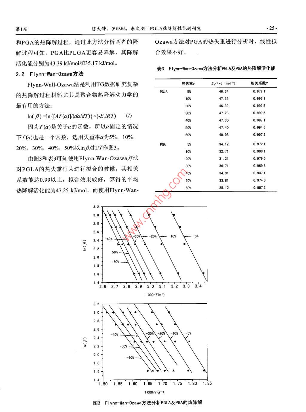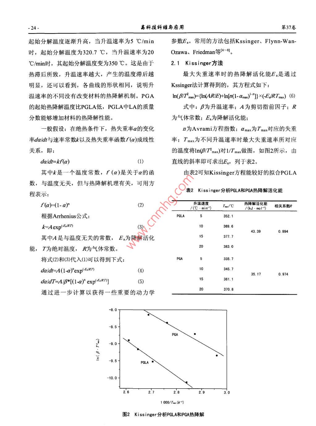第37卷第1期高料技纖維與應(yīng)用Vol 37 No. 12012年2月Hi-Tech Fiber ApplicationFeb.2012PGLA熱降解性能的研究陳大鐘,羅琳琳,李文剛東華大學(xué)纖維材料改性國家重點(diǎn)實(shí)驗(yàn)室,上海201620)摘要:使用熱重分析儀(TG)對聚乙丙交酯(PGLA)與聚乙交酯(PGA)的熱降解性能進(jìn)行測試,并通過 Kissinger、Flynn-wan-ozawa和 Friedman3種方法計(jì)算其降解過程中的活化能E。結(jié)果表明,PGLA的熱穩(wěn)定性較PGA更好,3種方法均能較好的分析其降解過程,當(dāng)使用Fymn- wan-ozawa法擬合時(shí),其線性相關(guān)性較好.關(guān)鍵詞:聚乙丙交酯;熱降解;性能;研究中圖分類號(hào):TQ34287文獻(xiàn)標(biāo)識(shí)碼:A文章編號(hào):1007-9815(2012)01-0022-05Kinetics of thermal degradation for PGla and pgaCHEN Da-zhong, LUO Lin-lin, LI Wen-gang(State Key Laboratory for Chemical Fibers Modification and Polymer Materials, Donghua University, Shanghai201620, China)Abstract: The thermal degradation for PGLA, PGA was studied using the conventional static and dynamic thermogravimetric techniques in a flowing nitrogen atmosphere. The thermal degradation activation energy E was calcu-lated using kissinger, finn-wan-ozawa and friedman method respectively, the results show: the stability of PGLAwas much better than PGA, the kissinger and flynn-wan-ozawa could anylasis the degradation dynamics processKey words: PGLA; thermal degradation; property; research聚乙內(nèi)交酯(PGLA)為乙交酯(GA)和丙交酯來一定困難。聚丙交酯(PLA)是繼PGA之后(LA)的共聚物,一般為線性共聚物。其結(jié)構(gòu)如第二類經(jīng)FDA批準(zhǔn)可用于人體的可降解聚合物材料。PLA無毒,無刺激,強(qiáng)度高,具有良好的生物降解性、生物相容性和可加工性,已廣泛應(yīng)用0-C-CH20C-CH-到組織工程支架制備中PGLA重復(fù)單元為此,人們研究開發(fā)了 PGA/PLA的共聚物一聚乙交酯(PGA)是第一個(gè)被美國FDA批PGLA。PGLA兼具兩種聚合組分的優(yōu)點(diǎn),減緩準(zhǔn)用作可吸收手術(shù)縫合線的聚合物,它是一種線了PGA的降解速度。PGLA的抗斷裂強(qiáng)度和初始性脂肪族聚酯,結(jié)晶度髙,力學(xué)性能好;但是模量較PGA均有所下降,斷裂伸長則有所增加PGA的熔點(diǎn)較高而且纖維柔性差,給熔融紡絲帶其柔性與PGA相比有所改善,將有利于編織順利收稿日期:2012-02-27作者簡介:陳大鐘(1985-),男,福建漳州人,碩七研究生,主修生物可降解高分于材料專業(yè),(電話)18205903425(電子信箱)cdz665@163.com。第1期陳大鐘,羅琳琳,李文剛:PGLA熱降解性能的研究23進(jìn)行,這種聚合物通過熔融紡絲后能制得性能良2結(jié)果與討論好的可降解纖維,被應(yīng)用于醫(yī)藥領(lǐng)域,具有良好的應(yīng)用前景。從圖1可以看出,在不同的升溫速度下,差示硏究聚合物的熱降解過程,針對其降解性能熱解質(zhì)量法(DTG)曲線只呈現(xiàn)一個(gè)峰,這說明及其影響因素,選擇采取合適的溫度,為加工和PGLA和PGA的熱分解都只有一個(gè)分解過程。根應(yīng)用提供理論依據(jù)等具有重要意義,實(shí)驗(yàn)使用熱據(jù)圖1可以得表1重分析儀(TG)對PGLA和PGA在氮?dú)庵械臒峤涤杀?可知,隨著升溫速度的增加,PGLA的解動(dòng)力學(xué)進(jìn)行分析,了解其熱降解性能。表1PGLA與PGA的熱降解溫度實(shí)驗(yàn)部分升溫速率起始分解終止分解分解速率最/(℃.min")溫度/℃溫度/℃大的溫度/℃320.7366.5原料:韓國三養(yǎng)公司切片370.3實(shí)驗(yàn)儀器:采用TG209 FlAirs型TG,固定氮344.8377.70氣流速20ml/mins測試方法:測定不同升溫速率下的熱失重行253.8361.8為,樣品用量約為0.8mg。測定的TG數(shù)據(jù)采用268,8363.7345.78Kissinger、 Flynn-wan-ozawa和 Friedman方法計(jì)算27290.8反應(yīng)活化能E。279.098.2370.805℃/min20℃/min10℃/mit10℃/min-2015℃/m15℃/min100200300400500溫度/℃溫度/℃100%20℃/min5℃/min10℃/min20℃/min50100150200250300350溫度/℃溫度/℃圖1PGLA與PGA的TG與DTG曲線高料披纖維島應(yīng)用第37卷起始分解溫度逐漸升高,當(dāng)升溫速率為5℃/min參數(shù)En。常用的方法包括 Kissinger、 Flynn-Wan-時(shí),起始分解溫度為320.7℃,當(dāng)升溫速率為20Ozawa、 Friedman等℃min時(shí),其起始分解溫度變?yōu)?50℃。這是由于2.1 Kissinger方法熱滯后所致,升溫速率越大,產(chǎn)生的溫度滯后越最大失重速率時(shí)的熱降解活化能E。是通過明顯,還可以看到,各曲線的形狀相同,說明升 Kissinger法計(jì)算得到的,其方程式如下溫速率的不同沒有改變材料的熱降解機(jī)制。PGA1m(B72m){ARE)+nm(1-am)"]}×(ERTm)(6)的起始熱降解溫度比PGLA低,PGLA中LA的質(zhì)量式中:B為升溫速率;A為剪切指前因子;R分?jǐn)?shù)能夠增加材料的熱降解性能。為氣體常數(shù);E為降解活化能;般假設(shè):在絕熱條件下,熱失重率a的變化n為 avrami方程指數(shù);am為Tma對應(yīng)的失重率dad與速率常數(shù)k以及熱失重率函數(shù)f(a)成線性率;Tmx為不同升溫速率時(shí)最大失重速率所對應(yīng)關(guān)系,即:的溫度將ln(B72m3x)對1/Tma做圖,如圖2所示,由dadt=kf(a)直線的斜率即可求出Ea,列于表2。其中k是一個(gè)溫度常數(shù),f(a)是關(guān)于a的函由表2可知 Kissinger方程能較好的擬合PGLA數(shù),與溫度無關(guān),但與熱降解機(jī)理有關(guān),可用方程表示:表2 Kiss inger分析PGLA和PA熱降解活化能f(a)=(1-a)7C/(kJ.m)相關(guān)系數(shù)根據(jù) Arrhenius公式:PGLA352.1k=Aexp-EdRn369.643.39其中A是與溫度無關(guān)的常數(shù),E為降解活化能,T為絕對溫度,R為氣體常
