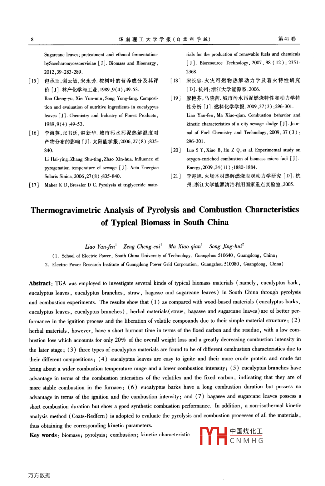 華南理工大學(xué)學(xué)報(自然科學(xué)版第41卷第8期Journal of South China University of TechnologyVol 41 No 82013年8月Natural Science Edition)2013文章編號:1000565X(2013)08-0001-08中國南方典型生物質(zhì)熱解及燃燒特性熱重分析廖艷芬!曾成才1馬曉茜宋景慧2(1.華南理工大學(xué)電力學(xué)院,廣東廣州510640;2.廣東電網(wǎng)公司電力科學(xué)研究院,廣東廣州510080)摘要:采用熱重分析儀對中國南方典型生物質(zhì)(桉樹皮、桉樹葉、桉樹枝、秸稈、甘蔗渣、甘蔗葉)進(jìn)行熱解及燃燒實(shí)驗(yàn)研究結(jié)果表明:相比于木質(zhì)類材料(桉樹皮、桉樹葉、桉樹枝),草本類材料(秸稈、甘蔗)由于材料組成結(jié)構(gòu)簡單,脫揮和著火過程性能較好;但固定碳和殘留物的燃盡時間短,而且燃燒失重率只占整體失重的20%左右,燃燒強(qiáng)度在后期大大降低.桉樹的3個物料中,組成成分的不同導(dǎo)致燃燒特性有較大的差異.桉樹葉易著火,而且由于含有較多的粗蛋白和粗脂肪,其燃燒區(qū)間拉長,但燃燒強(qiáng)度較低;桉樹枝則在揮發(fā)分以及固定碳的燃燒強(qiáng)度上具有優(yōu)勢,說明其在爐內(nèi)燃燒時具有更妤的穩(wěn)燃性;桉樹皮盡管燃燒持續(xù)時間長,但在著火特性以及燃燒強(qiáng)度方面并無優(yōu)勢.甘蔗類燃燒持續(xù)時間短,綜合燃燒特性好.文中還采用 Coats- Redfern積分法進(jìn)行動力學(xué)擬合推斷,獲得了各物料的熱解和燃燒動力學(xué)參數(shù).關(guān)鍵詞:生物質(zhì);熱解;燃燒;動力學(xué)特性中圖分類號:TK6doi:10.3969/jiss.1000565X.2013.08.001隨著能源短缺和二氧化碳排放問題的加劇,生2.6×10°hm2,居世界第三2;糖料甘蔗大面積種植物質(zhì)作為可再生和潔凈能源得到越來越廣泛的應(yīng)于廣西、廣東、海南、云南,占我國蔗糖產(chǎn)量的95%用,其中以高效直接燃燒發(fā)電為代表的生物質(zhì)發(fā)電以上.合理利用這些生物質(zhì)資源將有效緩解能源技術(shù)已經(jīng)在丹麥、瑞典、芬蘭、荷蘭以及巴西和印度危機(jī)和減少環(huán)境污染等國家得到廣泛應(yīng)用.我國生物質(zhì)資源豐富,根據(jù)可考慮到生物質(zhì)資源的季節(jié)性以及南方地區(qū)收集再生能源中長期發(fā)展規(guī)劃,到2020年我國生物質(zhì)發(fā)半徑的經(jīng)濟(jì)性,南方地區(qū)生物質(zhì)燃燒及發(fā)電項(xiàng)目采電裝機(jī)容量將達(dá)到3000萬千瓦我國南方地區(qū)生物用多來源生物質(zhì)燃料,涉及農(nóng)業(yè)以及林業(yè)廢棄物由質(zhì)資源主要以稻桿、甘蔗殘留物以及林業(yè)殘留物為于不同種類生物質(zhì)的燃燒特性差異較大,進(jìn)行燃料主據(jù)推算,南方地區(qū)現(xiàn)有主要農(nóng)作物秸稈數(shù)量占全更換以及混燒時,容易出現(xiàn)燃燒不充分、燃燒工況較國比例為84.48%口;華南熱帶地區(qū)是林木質(zhì)能源難控制等問題國內(nèi)外已有不少學(xué)者對生物質(zhì)的燃集中分布區(qū)和可利用的優(yōu)先區(qū)域,其中桉樹生長迅燒機(jī)理做了較為詳細(xì)的研究,張斌等探討了木粉速、總生物量大、輪伐期短和高密度等特性,決定了酸水解殘?jiān)湍咎窃捌淠噶系臒峤馓匦? Silva其作為生物能源具有顯著的優(yōu)勢,目前桉樹人工林等對藻類進(jìn)行了熱解、燃燒以及氣化特性的研已經(jīng)遍及南方17省、600多個縣市,種植面積約為究;Su等6研究了氮?dú)夂脱鯕鈿夥障履静牡臒岱纸馐崭迦掌?2013-01-16*基金項(xiàng)目:國家“973”計(jì)劃項(xiàng)目(2011CB201500,2013CB228101);國家自然科學(xué)基金資助項(xiàng)目(50906025);華南理工大學(xué)能源高效清潔利用廣東普通高校重點(diǎn)實(shí)驗(yàn)室項(xiàng)目(KLBl004);華南理工大學(xué)中本科研業(yè)務(wù)費(fèi)專項(xiàng)資金資助項(xiàng)目(2012Z70022中國煤化工作者簡介:廖艷芬(1976-),女,教授,博士生導(dǎo)師,主要從事固體廢棄物高效低CNMHGscut. edu. cn華南理工大學(xué)學(xué)報(自然科學(xué)版)第41卷過程;Wang等對生物質(zhì)三大組分的熱解過程及其高,對于燃燒裝置的除塵以及相關(guān)設(shè)備將有更高的相互影響進(jìn)行了分析等要求.一般生物質(zhì)原料由于硫和氮含量低,具有較好由于生物質(zhì)燃料具有地域特性,文中選用中國的清潔能源優(yōu)越性但檢測發(fā)現(xiàn)桉樹葉和甘蔗葉硫南方地區(qū)—廣東省的典型生物質(zhì)(秸稈、桉樹皮、含量較高而且桉樹葉氮含量也高達(dá)2.2%,故對燃桉樹葉、桉樹枝、甘蔗葉以及甘蔗渣)作為原料,進(jìn)燒后期污染物SO,、NO2的處理有較高的要求行熱解和燃燒熱重實(shí)驗(yàn)研究,分析各生物質(zhì)燃料的2.1熱裂解特性脫揮特性、固定碳燃燒特性,以及燃燒氣氛和升溫速率等條件對燃料著火特性的影響規(guī)律,并采用圖1為幾種物料熱解的TG和DTG曲線從圖Coats- Redfern積分法進(jìn)行動力學(xué)擬合推斷,獲得其中可以看到,各物料熱解區(qū)間均在473~673K之動力學(xué)參數(shù),以期為中國南方地區(qū)生物質(zhì)燃燒發(fā)電間除甘蔗葉體現(xiàn)為雙峰特性外,其他物料的熱解及其優(yōu)化設(shè)計(jì)、運(yùn)行提供基礎(chǔ)數(shù)據(jù).DTG曲線均為帶肩狀峰的單峰結(jié)構(gòu).一般而言,生物質(zhì)的主要成分—纖維素的熱解通常從513~實(shí)驗(yàn)材料和方法543K開始,并在633~663K左右處出現(xiàn)最大失重實(shí)驗(yàn)采用的生物質