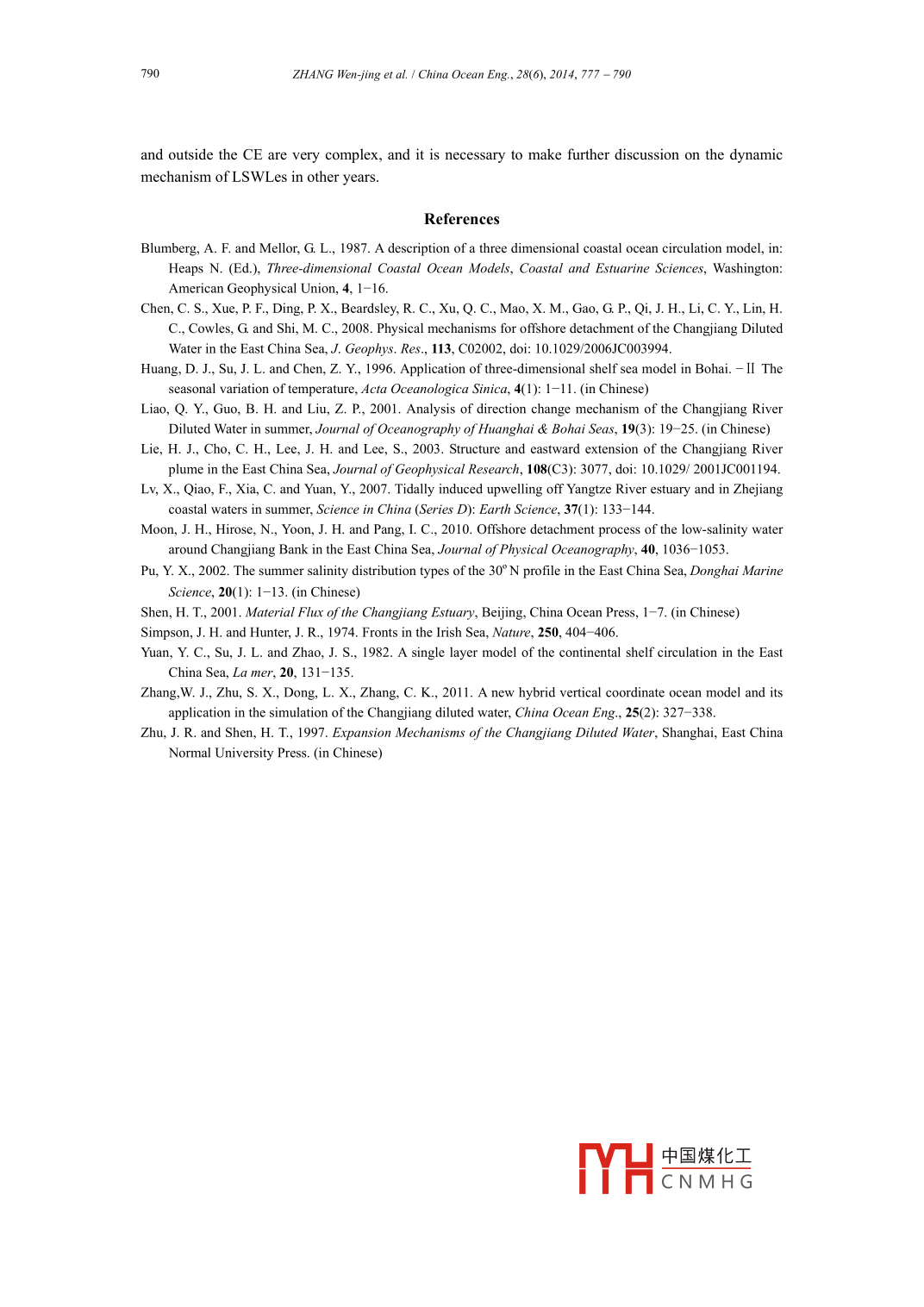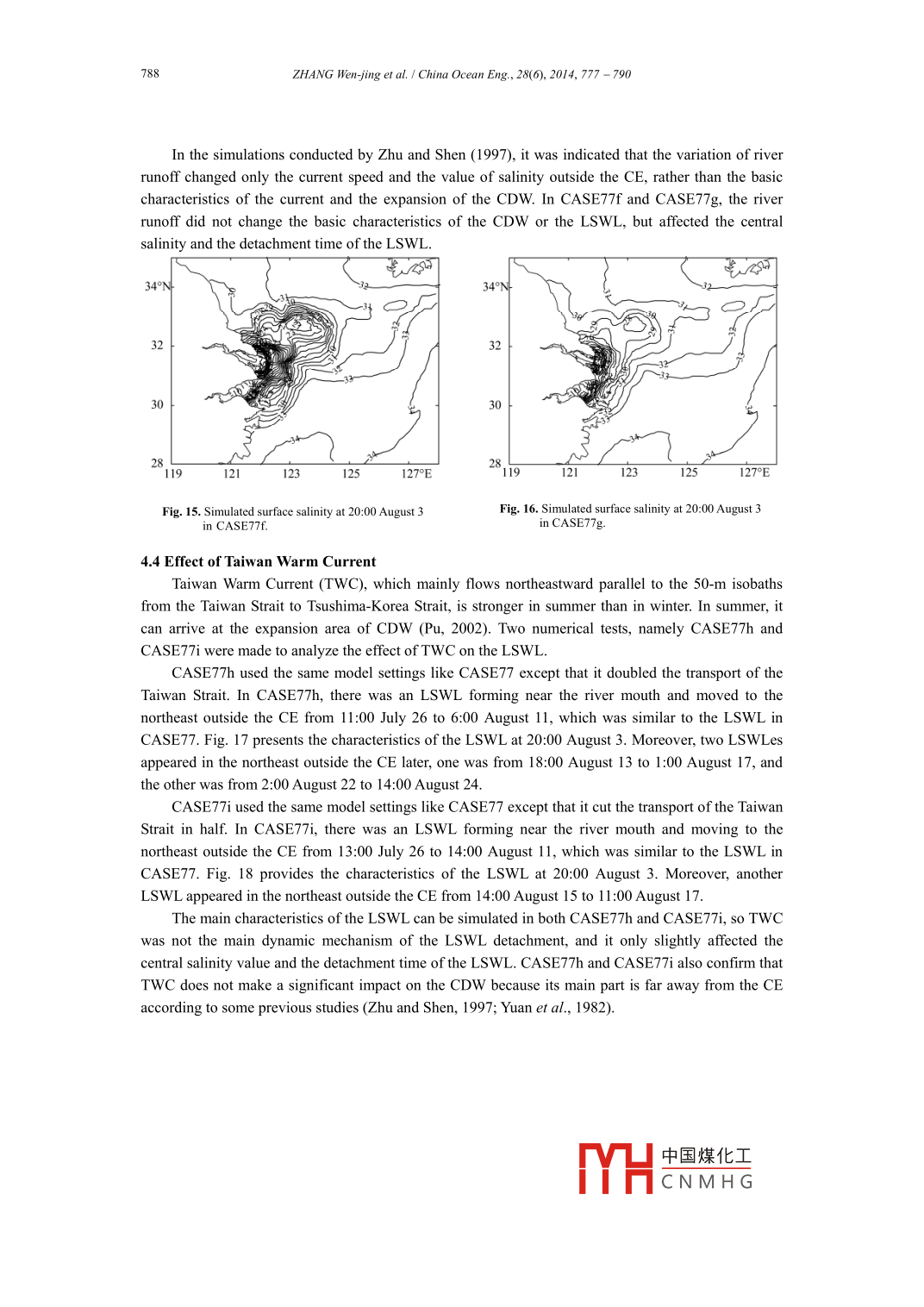 China Ocean Eng, Vol. 28, No.6, pp. 777- 790◎2014 Chinese Ocean Engineering SocietyDOI 10.1007/s 13344-014-0060-1,ISSN 0890-5487Numerical Simulation and Dynamical Analysis for Low Salinity Water Lensin the Expansion Area of the Changjiang Diluted W aterZHANG Wen-jing (張文靜), ZHU Shou xian (朱首賢)"1, LI Xun-qiang (李訓(xùn)強(qiáng)),RUAN Kun(阮鯤), GUAN Wei-bing (管衛(wèi)兵)f and PENG Jian(彭劍)"College of Meteorology and Oceanography, PLA University of Science and Technology,Nanjing 211101, Chinab College of Harbor, Coastal and Ofshore Engineering, Hohai University, Nanjing 210098, China。State Key Laboratory of Satelite Ocean Environment Dynamics, Second Instiute of "Oceanography,Hangzhou 310012, China(eceived 23 October 2012; received revised form 30 July 2013; acepted 16 Dcember 2013)ABSTRACTThe low salinity water lenses (LSWLes) in the expansion area of the Changjiang diluted water (CDW) exist in acertain period of time in some years. The impact of realistic river runoff, ocean currents and weather conditions need to betaken into account in the dynamical analysis of LSWL, which is in need of research. In this paper, the POM-0-z model isused to set up the numerical model for the expansion of the CDW. Then LSWL in summer 1977 is simulated, and itsdynamic mechanism driven by wind, tide, river runoff and the Taiwan Warm Current is also analyzed. The simulatedresults indicate that the isolated LSWL detaches itself from the CDW near the river mouth, and then moves towards thenortheast region outside the Changjiang Estuary. Its maintaining period is from July 26 to August 11. Its formation anddevelopment is mainly driven by two factors. One is the strong southeasterly wind lasting for ten days. The other is thevertical tidal mixing during the transition from neap tide to spring tide.Key words: Changjiang diluted water; low salinity water lens; numerical simulation; dynamic mechanism1. IntroductionThe Changjiang River is the largest river in China, and its annual average discharge is about9322.7* 108 m3 (Shen et al, 2001). Its huge freshwater spreads to the Changjiang Estuary (CE), theEast China Sea (ECS) and the Yellow Sea (YS), and forms a strong plume front. The Changjiangdiluted water (CDW) and its plume front make an enormous impact on the current, water mass,sediment movement and environment of the CE, ECS and YS. So they are always the emphases ofocean engineering and physical oceanography research.Observations also indicate that the CDW is not always continuous, and sometimes there are someisolated low salinity water lenses (LSWLes),which change the plume front of the CDW. Recently,This project was supported by the National Natural Science Foundation of China (Grant Nos. 40906044, 41076048 and 41376012),the Fundamental Research Funds for the Central Universities (Grant No. 2011B05714) and the Doctoral Starting up Foundation ofCollege of Meteorology and Oceanography of the PLA University of Science and Technology, China.Corresponding author. E mail: zhushouxian@vip.sina.com中國煤化工MYHCNMH G778ZHANG Wen-jing et al.1 China Ocean Eng, 28(6), 2014, 777 - 790some studies on the mechanism of the LSWL have been made. By analysing the observed data in theeast of Cheju Island, Lie et al. (2003) suggested that CDW patches separated from the shelf shallowarea and then were advected offshore toward Cheju Island as a series of LSWLes were affected bysouth wind in summertime. Under the climatology condition, Chen et al. (2008) used theunstructured-grid, Finite-Volume Coastal Ocean Model (FVCOM) to simulate some LSWLes in thesea west of 123° E, and proposed that the detachment of the LSWL is associated with eddies generatedby the baroclinic instability across the plume front. Using the Regional Ocean Modeling System(ROMS), Moon et al. (2010) simulated the LSWL under the idealized wind, tide and runoff conditions,and suggested that the strengthening of the tidal mixing during spring tide plays an important role inthe formation of the LSWL. The analysis of the salinity observation in August of thirteen years (Pu,2002) showed that LSWLes only existed in seven years. In August of these years, the difference oftides was ltte, but there was a significant difference among runoff, circumfluence (namely the residualcurrent) and atmospheric conditions. Therefore, it is necessary to make further research of the LSWLunder the real runoff, current and atmosphere conditions. In this paper, the real LWSL in summer 1977is simulated to analyze its characteristics and dynamical mechanism.2. The Numerical Model for CDWPOM-σ-Z mode (Zhang et al., 2011) is used in the simulation of the CDW, which is developedfrom POM (Blumberg and Mellor, 1987). As shown in Fig. 1, σ coordinate is for the currentcalculation, and the transform is:z-7 _ z-η_(1)H+η Dwhere H is the bottom topography, η is the surface elevation, and D=H +η is the total waterdepth. As shown in Fig. 2, σ-Z coordinate is for the salinity calculation. The water is divided into twoparts in the vertical direction, and z=-H。 is the interface. σ coordinate is used in the water abovethe interface, and the transform isH +ηH≤H。(2)H。+nH> H。Z coordinate is used in the water below the interface.The computational domain covers the Bohai Sea, the YS and the ECS. The numerical grids areshown in Fig. 3. The length of the smallest grid near the CE is 1540 m, and that of the largest grid faraway from the CE is about 25000 m. In the vertical direction, the current calculation uses 20 σ verticallayers, and the values of σ for these layers are -0.00056, -0.00167, -0.00335, -0.00670, -0.01339,-0.02679, -0.05357, -0.10714, -0.17857, -0.25000, -0.32143, -0.39286, -0.46429, -0.53571,- 0.60714,- 0.67857, - 0.75000, - 0.82143,- -0.89286, and - 0.96429, respectively. The salinitycalculation is in σ-z layers, which have eight uniform σ layers in the upper water and 24 z layers in the中國煤化工MYHCNMH GZHANG Wen-jing et al.1 Ch