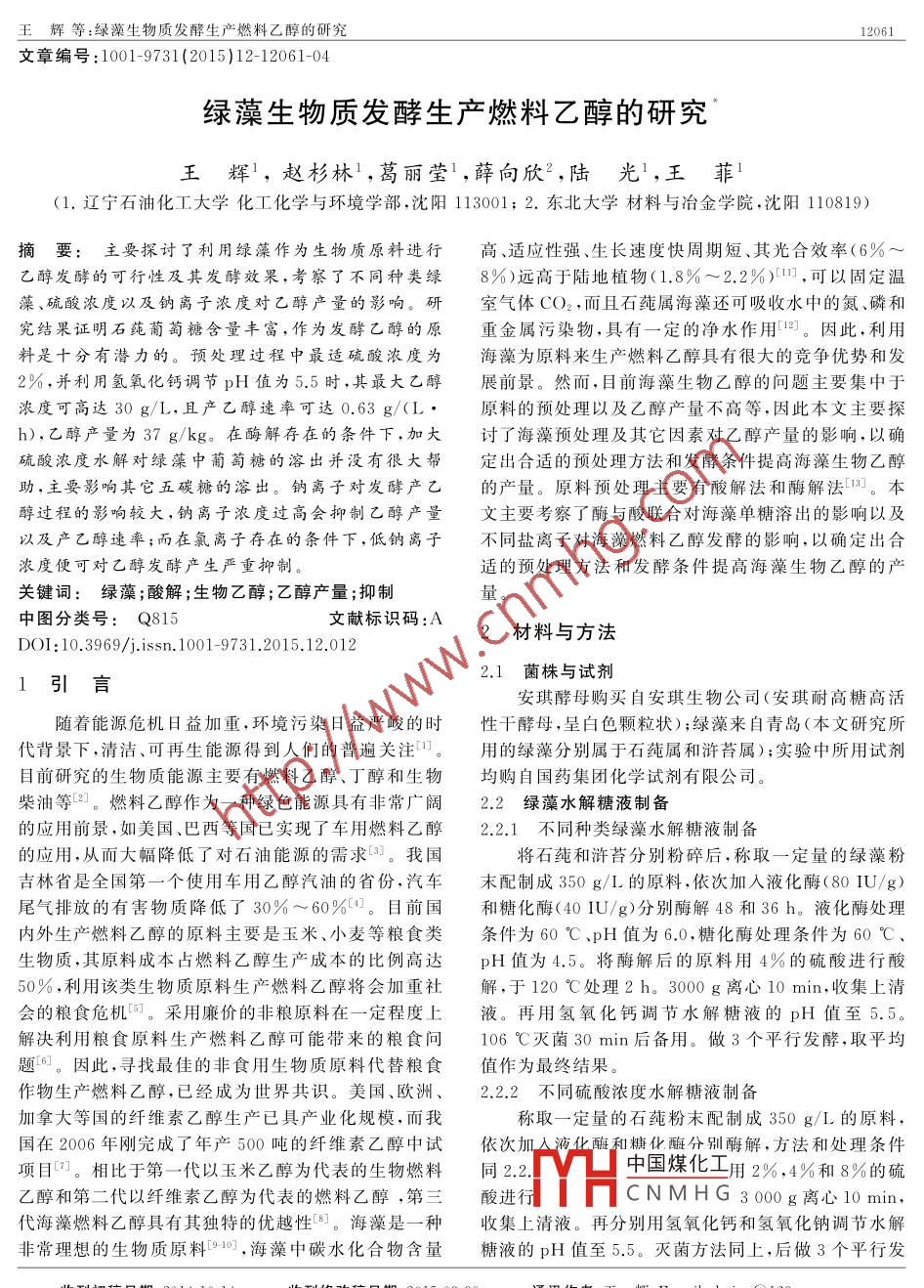 王輝等:綠藻生物質(zhì)發(fā)酵生產(chǎn)燃料乙醇的研究文章編號:1001-9731(2015)12-12061-04綠藻生物質(zhì)發(fā)酵生產(chǎn)燃料乙醇的研究王輝1,趙杉林,葛麗瑩1,薛向欣2,陸光,王菲(1.遼寧石油化工大學(xué)化工化學(xué)與環(huán)境學(xué)部,沈陽113001;2.東北大學(xué)材料與冶金學(xué)院,沈陽110819)摘要:主要探討了利用綠藻作為生物質(zhì)原料進(jìn)行高、適應(yīng)性強(qiáng)、生長速度快周期短、其光合效率(6%乙醇發(fā)酵的可行性及其發(fā)酵效果,考察了不同種類綠8%)遠(yuǎn)高于陸地植物(1.8%~2.2%),可以固定溫藻、硫酸濃度以及鈉離子濃度對乙醇產(chǎn)量的影響。研室氣體CO2,而且石莼屬海藻還可吸收水中的氮、磷和究結(jié)果證明石莼葡萄糖含量豐富,作為發(fā)酵♂醇的原重金屬污染物,具有一定的凈水作用1。因此,利用料是十分有潛力的。預(yù)處理過程中最適硫酸濃度為海藻為原料來生產(chǎn)燃料乙醇具有很大的競爭優(yōu)勢和發(fā)2%,并利用氫氧化鈣調(diào)節(jié)pH值為5.5時,其最大乙醇展前景。然而,目前海藻生物乙醇的問題主要集中于濃度可高達(dá)30g/L,且產(chǎn)乙醇速率可達(dá)0.63g/(L原料的預(yù)處理以及乙醇產(chǎn)量不高等,因此本文主要探h),乙醇產(chǎn)量為37g/kg。在酶解存在的條件下,加大討了海藻預(yù)處理及其它因素對乙醇產(chǎn)量的影響,以確硫酸濃度水解對綠藻中葡萄糖的溶岀并沒冇很大幫定岀合適的預(yù)處理方法和發(fā)酵條件提高海藻生物乙醇助,主要影響其它五碳糖的溶岀。鈉離子對發(fā)酵產(chǎn)♂的產(chǎn)量。原料預(yù)處理主要有酸解法和酶解法Ⅵ。本醇過程的影響較大,鈉離子濃度過高會抑制廴醇產(chǎn)量文主要考察了酶與酸聯(lián)合對海藻單糖溶岀的影響以及以及產(chǎn)乙醇速率;而在氯離子存在的條件下,低鈉離子不同鹽離子對海藻燃料♂醇發(fā)酵的影響,以確定出合濃度便可對乙醇發(fā)酵產(chǎn)生嚴(yán)重抑制適的預(yù)處理方法和發(fā)酵條件提高海藻生物乙醇的產(chǎn)關(guān)鍵詞:綠藻;酸解;生物乙醇;乙醇產(chǎn)量;抑制量中圖分類號:Q815文獻(xiàn)標(biāo)識碼:ADOI:10.3969/isn.1001-9731.2015.12.0122材料與方法引言2.1菌株與試劑安琪酵母購買自安琪生物公司(安琪耐高糖高活隨著能源危機(jī)日益加重,環(huán)境污染日益嚴(yán)峻的時性干酵母,呈白色顆粒狀);綠藻來自青島(本文硏究所代背景下,清潔、可再生能源得到人們的普遍關(guān)注口。用的綠藻分別屬于石莼屬和滸苔屬);實驗中所用試劑目前研究的生物質(zhì)能源主要有燃料乙醇、丁醇和生物均購自國藥集團(tuán)化學(xué)試劑有限公司。柴油等2。燃料乙醇作為一種綠色能源具有非常廣闊2.2綠藻水解糖液制備的應(yīng)用前景,如美國、巴西等國已實現(xiàn)了車用燃料乙醇2.2.1不同種類綠藻水解糖液制備的應(yīng)用,從而大幅降低了對石油能源的需求3。我國將石莼和滸苔分別粉碎后,稱取一定量的綠藻粉吉林省是全國第一個使用車用乙醇汽油的省份,汽車末配制成350g/L的原料,依次加入液化酶(80IU/g尾氣排放的有害物質(zhì)降低了30%~60%。目前國和糖化酶(40IUg)分別酶解48和36h。液化酶處理內(nèi)外生產(chǎn)燃料乙醇的原料主要是玉米、小麥等糧食類條件為60℃、pH值為6.0,糖化酶處理條件為60℃生物質(zhì),其原料成本占燃料乙醇生產(chǎn)成本的比例高達(dá)pH值為4.5。將酶解后的原料用4%的硫酸進(jìn)行酸50%,利用該類生物質(zhì)原料生產(chǎn)燃料乙醇將會加重社解,于120℃處理2h。3000g離心10min,收集上清會的糧食危機(jī)。采用廉價的非糧原料在一定程度上液。再用氫氧化鈣調(diào)節(jié)水解糖液的pH值至5.5。解決利用糧食原料生產(chǎn)燃料乙醇可能帶來的糧食問106℃滅菌30min后備用。做3個平行發(fā)酵,取平均題。因此,尋找最佳的非食用生物質(zhì)原料代替糧食值作為最終結(jié)果作物生產(chǎn)燃料乙醇,已經(jīng)成為世界共識。美國、歐洲、2.2.2不同硫酸濃度水解糖液制備加拿大等國的纖維素乙醇生產(chǎn)已具產(chǎn)業(yè)化規(guī)模,而我稱取一定量的石莼粉末配制成350g/L的原料國在2006年剛完成了年產(chǎn)500噸的纖維素乙醇中試依次加人液化酶和糖化酶分別酶解,方法和處理條件項目。相比于第一代以玉米乙醇為代表的生物燃料同2.2中國煤化工士用2%,4%和8%的硫乙醇和第二代以纖維素乙醇為代表的燃料乙醇,第三酸進(jìn)CNMHG3000g離心10min代海藻燃料乙醇具有其獨特的優(yōu)越性。海藻是一種收集上清液。再分別用氫氧化鈣和氫氧化鈉調(diào)節(jié)水解非常理想的生物質(zhì)原料10,海藻中碳水化合物含量糖液的pH值至5.5。滅菌方法同上,后做3個平行發(fā)*收到初稿日期:2014-10-14收到修改稿日期:2015-03-30通訊作者:王輝,E-mail:hui-w(a163.com作者簡介:王輝(1981—),女,沈陽人,講師,博士,從事環(huán)境工程及光催化材料研究12062幼私材料2015年第12期(46)卷酵,取平均值作為最終結(jié)果。因而導(dǎo)致了產(chǎn)乙醇能力上的差別。由于酵母產(chǎn)乙醇主2.2.3不同濃度鈉離子水解糖液制備要利用的是葡萄糖,而無法利用木糖和鼠李糖,顯然在稱取一定量的石莼粉末配制成350g/L的原料,采用酶解和硫酸水解的預(yù)處理條件下石莼比滸苔用于依次加人液化酶和糖化酶分別酶解,方法和處理條件產(chǎn)乙醇的原料更為