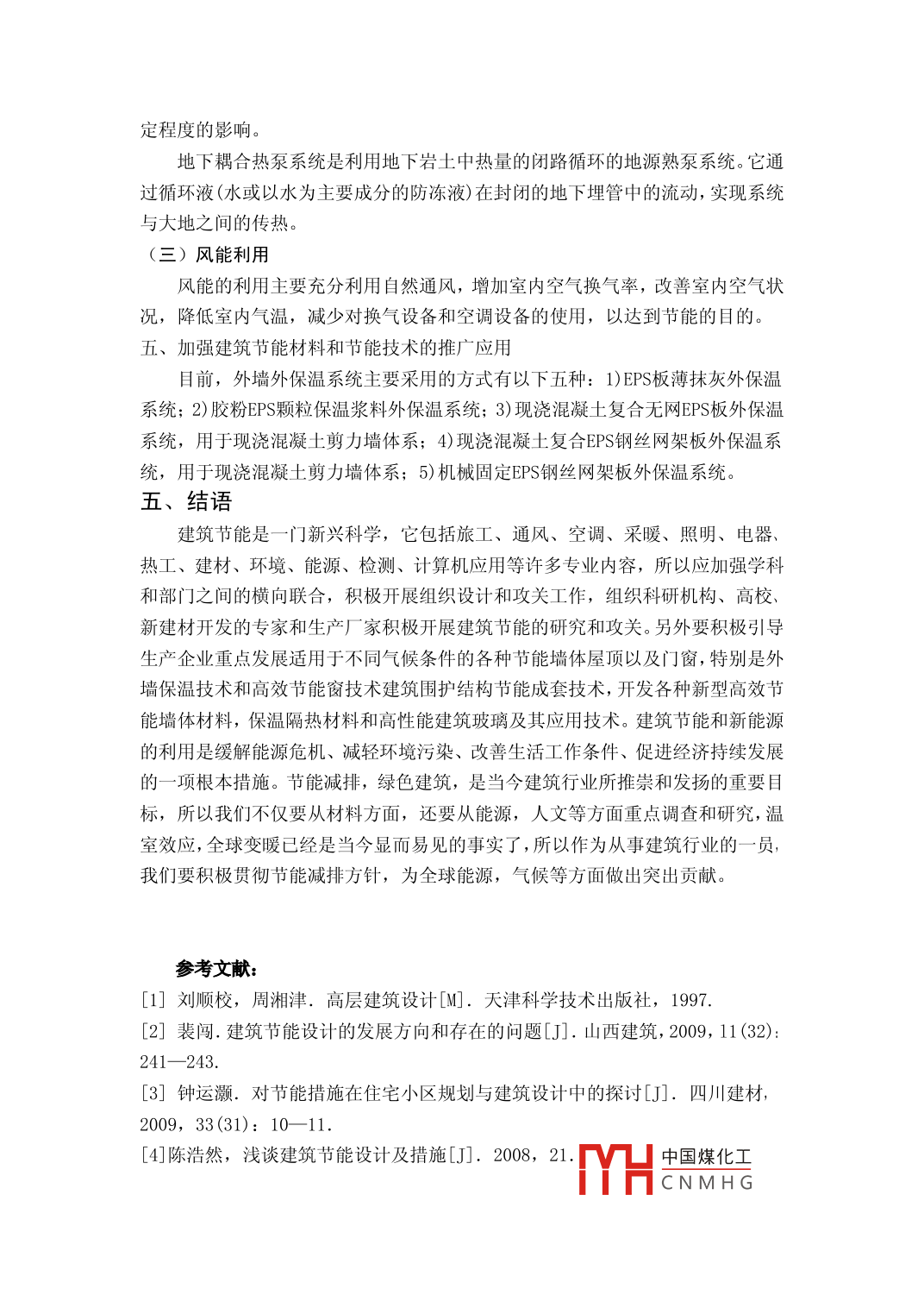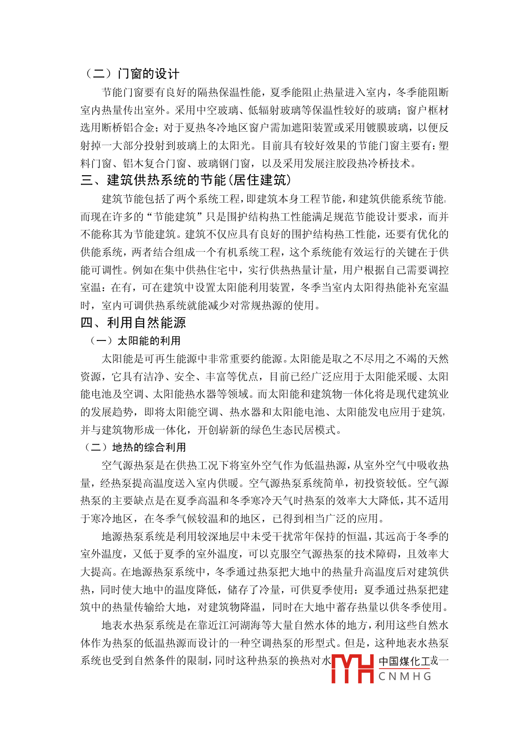 建筑節(jié)能李濤1,王上飛2(1中國(guó)礦業(yè)大學(xué),徐州221116;2.中國(guó)礦業(yè)大學(xué),徐州221116摘要:隨著科學(xué)技術(shù)的日新月異,能源短缺已不容忽視,建筑節(jié)能已成為全社會(huì)共同關(guān)注的問題。本文從建筑的設(shè)計(jì)、自然能源等方面探析了建筑節(jié)能。關(guān)鍵詞:建筑節(jié)能建筑設(shè)計(jì)自然能源隨著經(jīng)濟(jì)的發(fā)展和人們生活水平的提高,建筑能耗在不斷增大,建筑節(jié)能已成為當(dāng)今人類社會(huì)面臨的重大問題。目前,建筑能耗占全社會(huì)總能耗的27%左右,根據(jù)發(fā)達(dá)國(guó)家的經(jīng)驗(yàn),這個(gè)比例將逐漸提高到35%左右;而且我國(guó)的建筑能耗比同等氣候條件下發(fā)達(dá)國(guó)家的能耗高2倍~3倍。因此,我們必須從可持續(xù)發(fā)展的戰(zhàn)略岀發(fā),采取各種技術(shù)措施降低建筑能耗。建筑節(jié)能理念的提出及其含義我國(guó)于20世紀(jì)80年代初提岀民居設(shè)計(jì)的采暖能耗標(biāo)準(zhǔn),到《民用建筑節(jié)能管理規(guī)定》的發(fā)布,我國(guó)全面啟動(dòng)了居住建筑節(jié)能的工作。節(jié)能型民居的含義有兩層,一是保證住宅的功能和舒適度,二是按照國(guó)家標(biāo)準(zhǔn)節(jié)能50%的既定目標(biāo),降低能耗并盡量實(shí)現(xiàn)資源的循環(huán)利用,打造資源節(jié)約型住宅。要實(shí)現(xiàn)建筑節(jié)能,就要在工程設(shè)計(jì)中運(yùn)用科學(xué)的規(guī)劃布局和合理的建筑結(jié)構(gòu)造型。具體來(lái)講,就是要根據(jù)各地的氣候特點(diǎn),進(jìn)行合理的住宅分區(qū),在保證健康衛(wèi)生和充足采光的前提下,確保建筑物的平面布置和整體規(guī)劃有利于日照、避風(fēng)以及通風(fēng),并根據(jù)小區(qū)的住宅層數(shù)和人口規(guī)模,進(jìn)行合理的配置綠化,降低硬化地面比例,構(gòu)建良好的小區(qū)環(huán)境,充分滿足小區(qū)居民的居住和生活需要。二、建筑維護(hù)結(jié)構(gòu)的節(jié)能(一)墻體的設(shè)計(jì)墻體是建筑物外圍護(hù)結(jié)構(gòu)的主體,墻體所用材料的保溫效果直接影響著建筑的耗熱量。一般而言,墻面應(yīng)該使用蓄熱性能比較好的蓄熱材料、裝飾材料和隔熱材料。例如,在冬季。如果墻體有隔熱材料和蓄熱材料,室內(nèi)的熱量就不容易散失,而在夏季。這些材料還能減少室外溫度和太陽(yáng)輻射對(duì)墻體表面溫度的影響以確保室內(nèi)溫度的穩(wěn)定,這樣就達(dá)到了節(jié)約能源的目的?,F(xiàn)代建筑中,一種保溫復(fù)合墻體設(shè)計(jì)正在被廣泛應(yīng)用。它主要是把高效的保溫隔熱材料附著或者填人墻體內(nèi),以提高墻體的熱阻能力,從長(zhǎng)遠(yuǎn)來(lái)看,外保溫的保溫效果遠(yuǎn)遠(yuǎn)高于內(nèi)保溫效果。中國(guó)煤化工CNMHG(二)門窗的設(shè)計(jì)節(jié)能門窗要有良好的隔熱保溫性能,夏季能阻止熱量進(jìn)入室內(nèi),冬季能阻斷室內(nèi)熱量傳出室外。采用中空玻璃、低輻射玻璃等保溫性較好的玻璃;窗戶框材選用斷橋鋁合金;對(duì)于夏熱冬冷地區(qū)窗戶需加遮陽(yáng)裝置或采用鍍膜玻璃,以便反射掉一大部分投射到玻璃上的太陽(yáng)光。目前具有較好效果的節(jié)能門窗主要有:塑料門窗、鋁木復(fù)合門窗、玻璃鋼門窗,以及采用發(fā)展注膠段熱冷橋技術(shù)。三、建筑供熱系統(tǒng)的節(jié)能(居住建筑)建筑節(jié)能包括了兩個(gè)系統(tǒng)工程,即建筑本身工程節(jié)能,和建筑供能系統(tǒng)節(jié)能而現(xiàn)在許多的“節(jié)能建筑”只是圍護(hù)結(jié)構(gòu)熱工性能滿足規(guī)范節(jié)能設(shè)計(jì)要求,而并不能稱其為節(jié)能建筑。建筑不僅應(yīng)具有良好的圍護(hù)結(jié)構(gòu)熱工性能,還要有優(yōu)化的供能系統(tǒng),兩者結(jié)合組成一個(gè)有機(jī)系統(tǒng)工程,這個(gè)系統(tǒng)能有效運(yùn)行的關(guān)鍵在于供能可調(diào)性。例如在集中供熱住宅中,實(shí)行供熱熱量計(jì)量,用戶根據(jù)自己需要調(diào)控室溫:在有,可在建筑中設(shè)置太陽(yáng)能利用裝置,冬季當(dāng)室內(nèi)太陽(yáng)得熱能補(bǔ)充室溫時(shí),室內(nèi)可調(diào)供熱系統(tǒng)就能減少對(duì)常規(guī)熱源的使用。四、利用自然能源(一)太陽(yáng)能的利用太陽(yáng)能是可再生能源中非常重要約能源。太陽(yáng)能是取之不盡用之不竭的天然資源,它具有潔凈、安全、豐富等優(yōu)點(diǎn),目前已經(jīng)廣泛應(yīng)用于太陽(yáng)能采暖、太陽(yáng)能電池及空調(diào)、太陽(yáng)能熱水器等領(lǐng)域。而太陽(yáng)能和建筑物一體化將是現(xiàn)代建筑業(yè)的發(fā)展趨勢(shì),即將太陽(yáng)能空調(diào)、熱水器和太陽(yáng)能電池、太陽(yáng)能發(fā)電應(yīng)用于建筑,并與建筑物形成一體化,開創(chuàng)嶄新的綠色生態(tài)民居模式。(二)地?zé)岬木C合利用空氣源熱泵是在供熱工況下將室外空氣作為低溫?zé)嵩?從室外空氣中吸收熱量,經(jīng)熱泵提高溫度送入室內(nèi)供暖??諝庠礋岜孟到y(tǒng)簡(jiǎn)單,初投資較低??諝庠礋岜玫闹饕秉c(diǎn)是在夏季高溫和冬季寒冷天氣時(shí)熱泵的效率大大降低,其不適用于寒冷地區(qū),在冬季氣候較溫和的地區(qū),已得到相當(dāng)廣泛的應(yīng)用地源熱泵