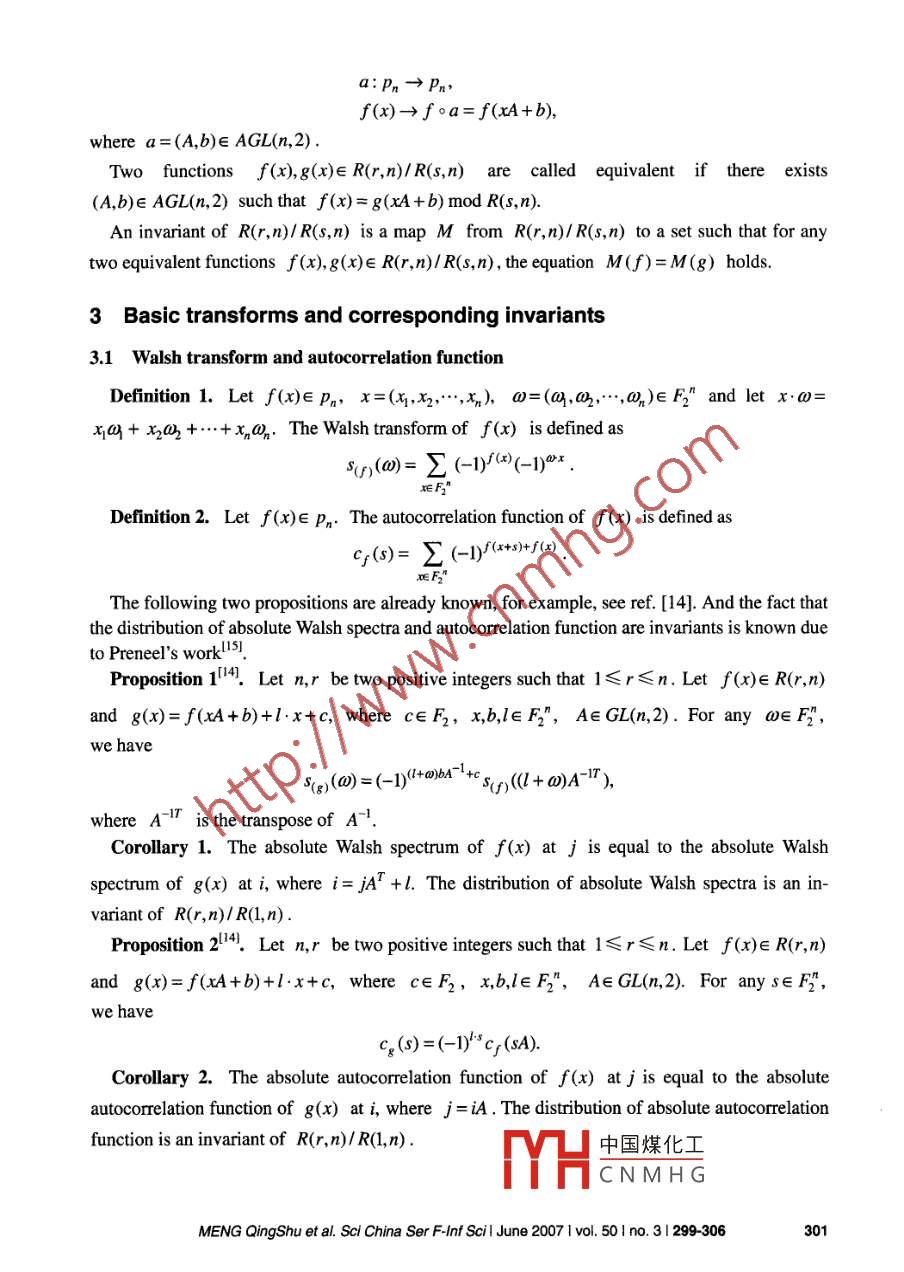 Science in China Series F: Information Sciences◎2007Science in China Press包SingrVeragAnalysis of affinely equivalent BooleanfunctionsMENG QingShu1*, ZHANG HuanGuo'2, YANG Min3 & WANG ZhangYi'1 Computer School, Wuhan University, Wuhan 430074, China;2 State Key Laboratory of Software Engineeing, Wuhan University, Wuhan 430074, China;3 Intemational School of Sotware, Wuhan University, Wuhan 430074, ChinaBy some basic transforms and invariant theory, we give two results: 1) an algorithm,which can be used to judge if two Boolean functions are affinely equivalent and toobtain the equivalence relationship if they are equivalent. This is useful in studyingBoolean functions and in engineering. For example, we classify all 8-variable ho-mogeneous bent functions of degree 3 into two classes; 2) Reed-Muller codesR(4,6)/R(1,6), R(3,7)/R(1,7) are classified efficiently.Boolean functions, Reed-Muller code, affinely equivalent, invariant1 IntroductionBoolean functions are widely used in science and engineering, like in circuit design, cryptographyand error-correction coding. The affine classification of Boolean functions is meaningful. In thedesign of combinational circuit, if one circuit is well designed, all Boolean functions that are af-finely equivalent to the circuit can be implemented through this circuit. Out of the need of circuitdesign, many scholars discussed the classification of Boolean functionsl-s in the 1960s of the20th century. In cryptography, as Boolean functions are widely used in block ciphers and streamciphers, many scholars'ts discussed the cryptographic properties of affinely equivalent Booleanfunctions. All affinely equivalent Boolean functions have similar cryptographic properties. Inerror-correction coding area, the classification of Boolean functions was discussed too'. In short,studying the classification of Boolean functions is very necessary.There are two main research problems in the analysis of affinely equivalent Boolean functions.The first one is the classification of Reed-Muller codes and the second is deciding whether twoBoolean functions are affinely equivalent and getting the equivalence relationship when they areequivalent. There are a lot of results about the first problem. All 5-variable Boolean functions wereclassified into 48 equivalence classes by Berlekamp and Welch!S!. By decomposing 6 variableReceived July 14, 2006; acepted March 27, 2007中國煤化工doi: 10.1007s11432007 0030-9Corresponding author (email: mqseagle@sohu.com)出CNMHGSupported by the National Natural Science Foundation of China (Grant Nos. 699730.+. wisuor,wus1)www.scichina.com www.springerlink.comSci China Ser F-Inf Scil June 2007 Ivol. 50 I no. 3 I 299-306Boolean functions into 5-variable Boolean functions and using AGL(5,2) on 5-variable Booleanfunctions, Maioranall classified all 6-variable Boolean functions into 150357 equivalence classes.Another good result is that the formula for calculating the number of orbits of R(r,m)/ R(s,m)under the action of the general afine group was given by Houl89. For m= 6 and 7, the numberwas calculated out in ref. [9], which makes it possible to classify the R(6,6)/R(1,6) andR(7,7)/R(1,7) using invariant theory. For example, using invariant theory, Houl8l classifiedR(3,7)/R(2,7), R(3,8)/ R(2,8) and Brier and Langevin10] classified R(3,9)/ R(2,9). However,the classification of R(r,m)1R(s,m) for r-s>1 is seldom discussed. On the second researchproblem, we can only find two papersh”. However, both methods fail in the case of bent functions.Using basic transforms and invariant theory, we give two results: 1) an algorithm, which can beused to judge if two Boolean functions are affinely equivalent and to obtain the equivalence rela-tionship when they are equivalent. This is useful in studying Boolean functions and in engineer-ng. For example, we classify all 8-variable homogeneous bent functions of degree 3 into twoclasses; 2) Reed-Muller codes R(4,6)/ R(1,6),R(3,7)/R(1,7) are classified efficiently. Recentlyand independently, also using invariant Braeken, Borisov, Nikova, et al."13] classfiedR(4,6)/ R(1,6), R(3,7)/R(1,7).2 PremilinariesThe Galois field with two elements is denoted by F2 and the vector space of dimension n overF2 is denoted by F2". For each subset sC {L,2,.",n}, there exists a corresponding vector(<,S2,",sn) by letting s;=1 if element i isin s else letting s; = 0. And the binary vector(s,2..",sn) can be denoted by an integer s whose 2-adic expansion is just the vector(5.52.,.',sn). Obviously, the set, the vector and the integer are isomorphic. In this paper, if con-fusion is not caused, we will use the three notations for description convenience.The set of all Boolean functions in n variables is denoted by pn. For each subsets∈{,2.,.,n},we have x° =] xq∈ pr. The algebraic normal form of a Boolean function canESbe witten as f(x)=a,x",where ag∈F. The degree of f(x) is defined as deg(f)=s=s.01,--.2" -1}.x0maxH(s),where H(s) is the Hamming weight of s. Let R(r,n)={f(x)∈Pn |deg(f)≤r} be the rth order Reed-Muller code. For 0≤s