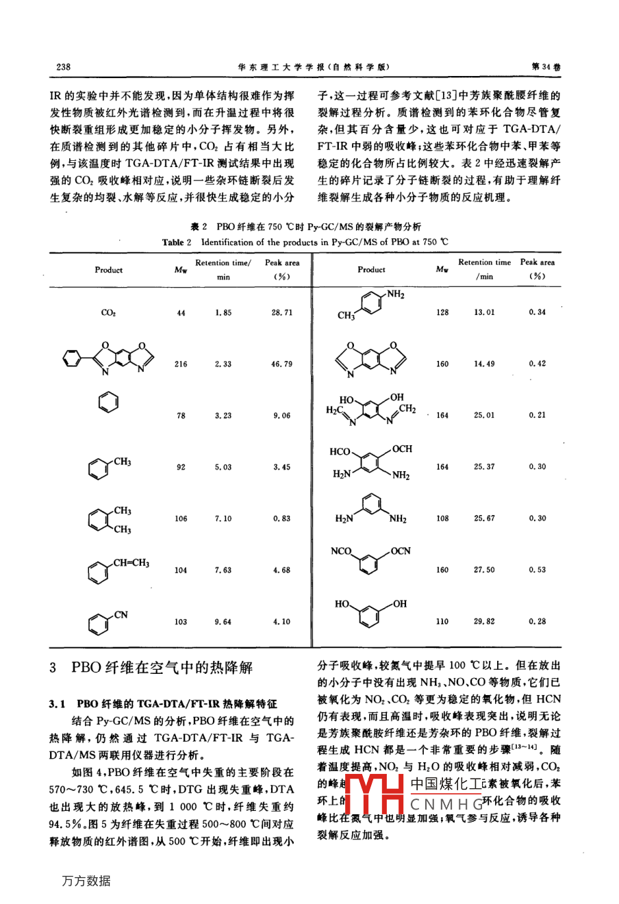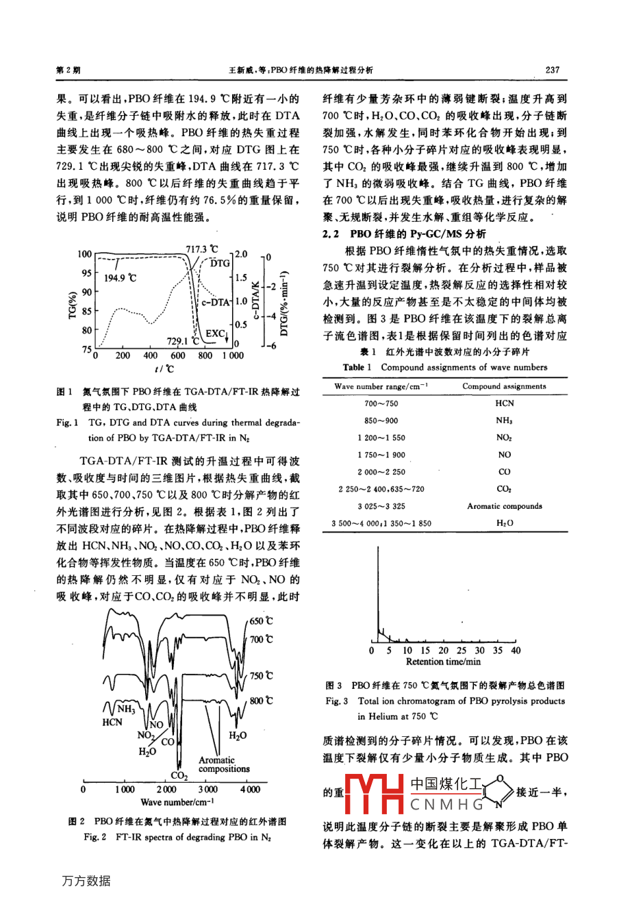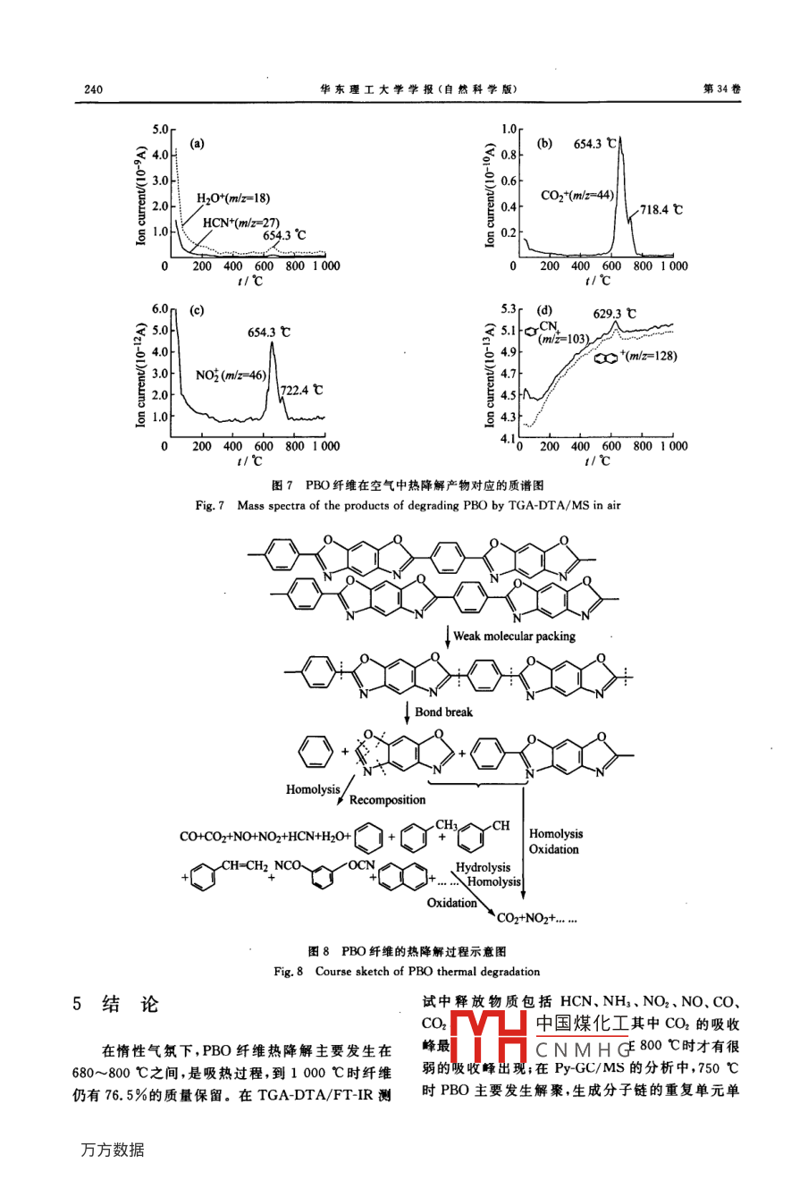Vol 34 No. 2華東理工大學(xué)學(xué)報(bào)(自然科學(xué)版)2008-04Journal of East China University of Science and Technology (Natural Science Edition)文章編號(hào):1006-3080(2008)02023507PBO纖維的熱降解過程分析王新威,胡祖明,劉兆峰(東華大學(xué)纖維材料改性國家重點(diǎn)實(shí)驗(yàn)室,上海200051)摘要:運(yùn)用裂解-色譜/質(zhì)譜(PyGC/MS)、熱失重紅外( TGA-DTA/FTIR)、熱失重質(zhì)譜(TGA-DTA/MS)等聯(lián)用技術(shù)分析聚對(duì)苯撐苯并雙嗎唑(PBO)纖維的熱降解行為。其中,PBO纖維在PyGC/MS中迅速裂解產(chǎn)生的碎片記錄了分子鏈斷裂的過程,而在 TGA-DTA/FTIR、TGADTA/MS中連續(xù)升溫的熱降解特征及其釋放物反映了纖維受熱后分子鏈的斷裂、重組等過程。升溫到1000℃時(shí),在惰性氣體中,PBO纖維的熱失重剩余量為76.5%,而在空氣中幾乎完全失重,氧化作用對(duì)纖維的失重影響很大。在兩種氣氛下降解產(chǎn)物均以小分子物質(zhì)為主,其中CO2占最大比例。關(guān)鍵詞:PBO;熱失重紅外;裂解-色譜/質(zhì)譜;熱失重-質(zhì)譜;釋放產(chǎn)物中圖分類號(hào):TQ560;0657.33文獻(xiàn)標(biāo)識(shí)碼:AThermal degradation Process of PBO FiberWANG Xin-wHU Zu-ming, LIU Zhaofeng(State Key laboratory for Modi fication of Chemical Fibers and Polymer materialsDonghua University, Shanghai 200051, China)Abstract: The thermal degradation behaviors of Poly( p-phenylene-2, 6-benzoxazole)(PBO) fiber werestudied using pyrolysis-gas chromatography/mass spectrometry(Py-GC/MS), thermogravimetric analysiscoupled with mass spectrometry(TGA-DTA/ MS) and thermogravimetric analysis coupled with Fouriertransform infrared spectroscopy (TGA-DTA/FT-IR). Py-GC/MS affords the advantages to detect tempo-rarily thermal stability and volatile fragments, and the rupture process of molecular chain can be recorded.TGA-DTA/FFIR and TGA-DTA/MS undertake the continuous heated processes, and the thermal proper-ties and volatiles illustrate the chemical reactions of decomposed PBO, which involving scission, recompo-sition and so on can be illustrated. Ascending the temperature to 1 000 C, Pbo fiber keeps the residues of76.5% in inert gas and almost losses all mass in air. Oxidation takes a great effect on mass loss. In bothinert gas and air, the little molecular volatiles of thermal degradation are the main products and cO2 keepsKey words: PBO; TGA-DTA/FT-IR; Py-GC/MS: TGA-DTA/MS; volatiles聚對(duì)苯撐苯并雙嗎唑(Poly( p-phenylene2,6-物纖維印,其極限氧指數(shù)(LOI)為68,在有機(jī)纖維benzoxazole),PBO)是迄今耐高溫性能最好的高聚中為量亮值煒別是在燃由產(chǎn)生很少的一氧化中國煤化工收稿日期:2007-03-02CNMHG作者簡介:王新威(1978-),男,博士生,從事高性能纖維及納米纖維的研究。 E-mail, wav@ maiL. dhu,edu,cn通訊聯(lián)系人:胡祖明,E-mailshzm@dhu.edu.cn236華東理工大學(xué)學(xué)報(bào)(自然科學(xué)版)第34卷碳、氰化氫等有毒氣體(。HM型PBO纖維在400譜儀(美國 Nicolet公司, NETXUS750型)進(jìn)行放出℃時(shí)彈性模量值為室溫下的70%AS、HM型的組分的圖譜分析。將STA的熱天平出口與FTRPBO纖維在空氣中300℃處理100h后,強(qiáng)度保持的氣體池之間用聚四氟乙烯管連接測試前把聚四率分別為48%42%左右;到500℃時(shí),強(qiáng)度值仍保氟乙烯管和紅外氣體池預(yù)熱到280℃。實(shí)驗(yàn)過程中持室溫下的40%3-4樣品熱降解產(chǎn)生的產(chǎn)物通過載氣吹掃進(jìn)入紅外測試關(guān)于PBO纖維的熱性能分析, Tadao Kuroki氣體池,采用氘化硫酸三甘肽(DTGS)的熱釋電檢等將PBO纖維和芳族聚酰胺纖維的耐熱性能進(jìn)測器進(jìn)行分析,光譜范圍為400~4000cm-2,分辨行了比較,發(fā)現(xiàn)PBO纖維比對(duì)位芳香族聚酰胺纖維率為1cm-2的分解溫度高約100℃,而且燃燒過程中釋放的有PyGC/Ms測試中,采用單點(diǎn)裂解器(日本毒氣體量也比芳族聚酰胺纖維少得多。 Nielsen Frontier分析儀器公司,PY-2020is型)和氣相色譜/等采用紅外光譜和熱重分析的方法研究了PBO質(zhì)譜聯(lián)用儀(日本島津分析儀器公司,GC/Ms在500℃和600℃的熱氮?dú)饧盁峥諝鈿夥罩械氖е豎P2010)。裂解條件:裂解溫度為750℃,裂解時(shí)間速率揮發(fā)性產(chǎn)物和降解產(chǎn)物的情況。 Serge Bour為12s將樣品置于白金小舟中,依靠自由落體方式bigot等-系統(tǒng)比較了PBO纖維與其他纖維的耐將樣品舟跌落到垂直安置的石英裂解管中。色譜條高溫優(yōu)勢(shì),并利用FTIR和固相NMR等手段研究件:DB5石英毛細(xì)管柱(30m×0.25mm,0.25了PBO和聚對(duì)苯二甲酰對(duì)苯二氨PPTA分解過程m),載氣為氦氣,壓力方式控制流量。進(jìn)樣口壓力的氣相和固相產(chǎn)物,發(fā)現(xiàn)PBO纖維比PPTA分解34kPa;總流量84.3mL/min;柱流量0.80mL/溫度更高熱分解氣體釋放量也少,且釋放需要的時(shí)min;吹掃氣體流量3.0mL/min;分流比100:1;柱間更長,同時(shí)PBO纖維熱處理后有固相碳化物生溫40℃時(shí)保持3min;升溫速率10℃/min,300℃成; Serge bourbigot等還運(yùn)用不變動(dòng)力學(xué)參數(shù)的保持10min。采用歸一法計(jì)算峰相對(duì)面積。質(zhì)譜方法分析了PBO與PPTA纖維在氮?dú)馀c空氣氛圍條件:EI源離子源溫度200℃,電子能量70eV,接下的熱降解情況。另外, Newell等0采用PBO纖口溫度300℃,質(zhì)荷比(m/z)范圍29~600。采用維作為制備碳纖維的母體材料,不用經(jīng)過預(yù)氧化處Nist107庫譜進(jìn)行搜索理,直接進(jìn)行連續(xù)碳化石墨化制得碳纖維。這主要TGA-DTA/MS聯(lián)用中的熱分析儀(德國是由于PBO纖維大分子鏈