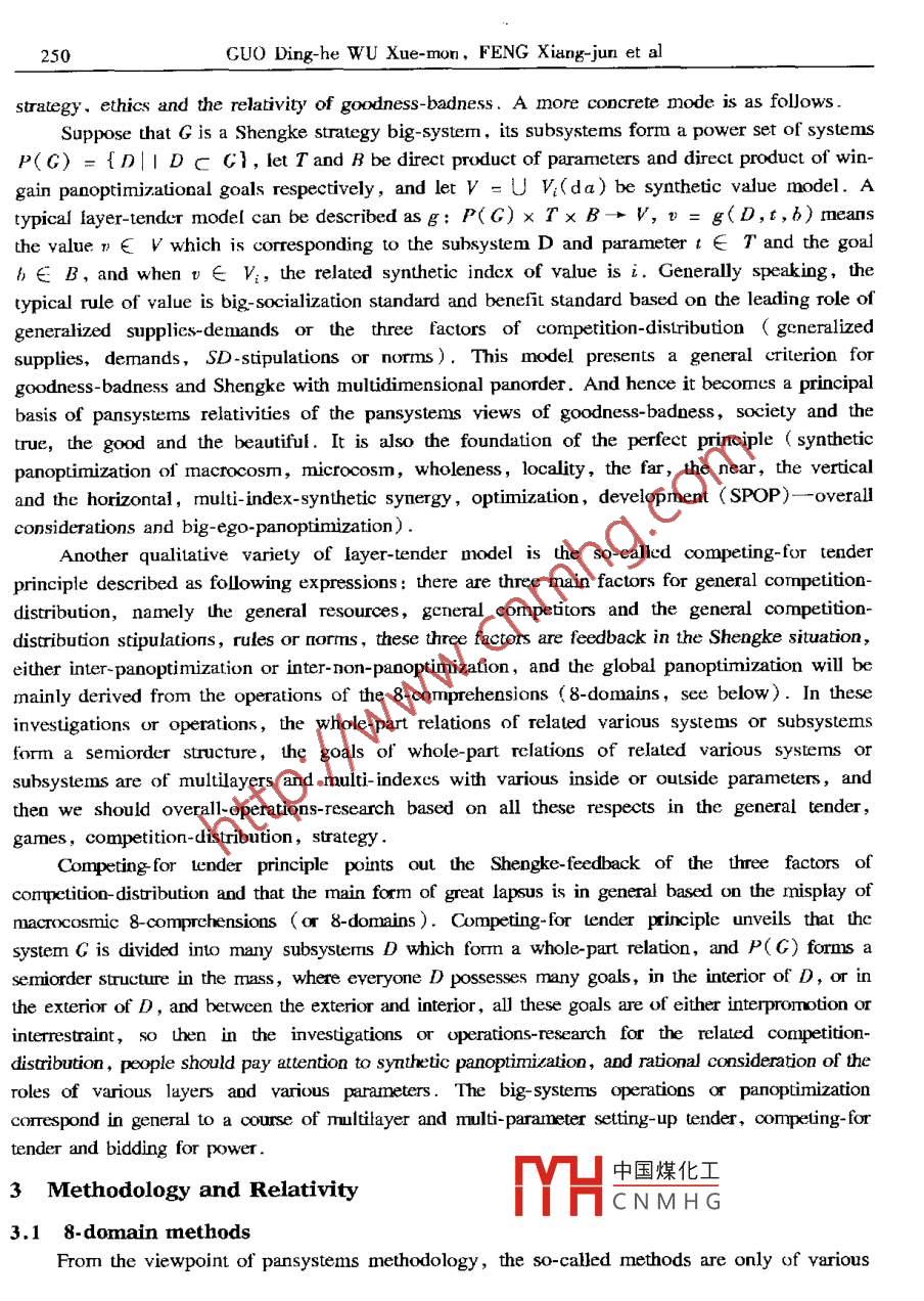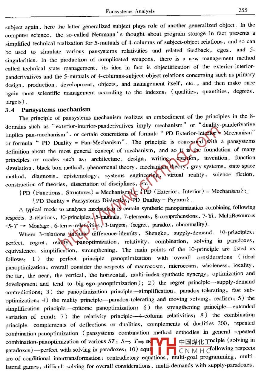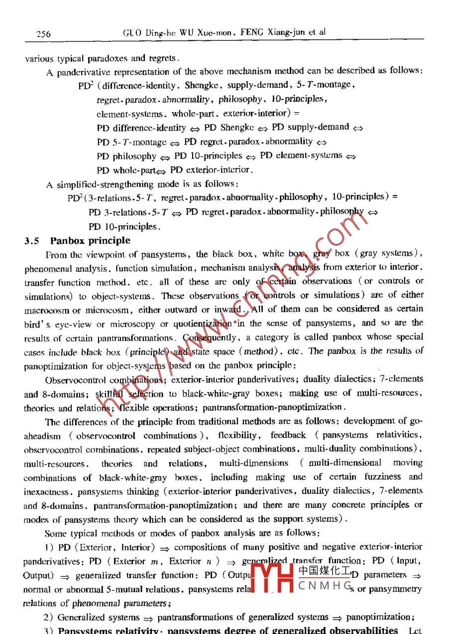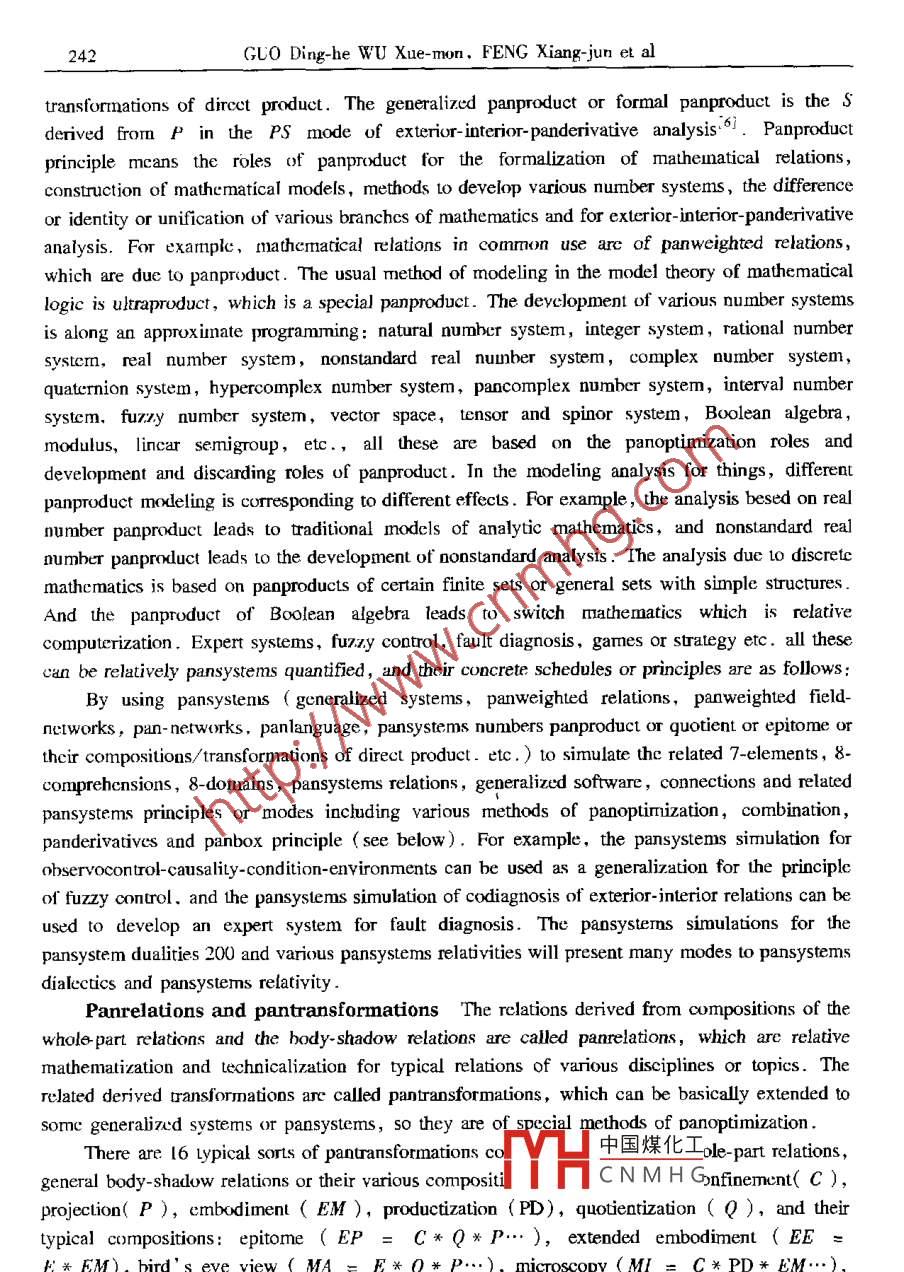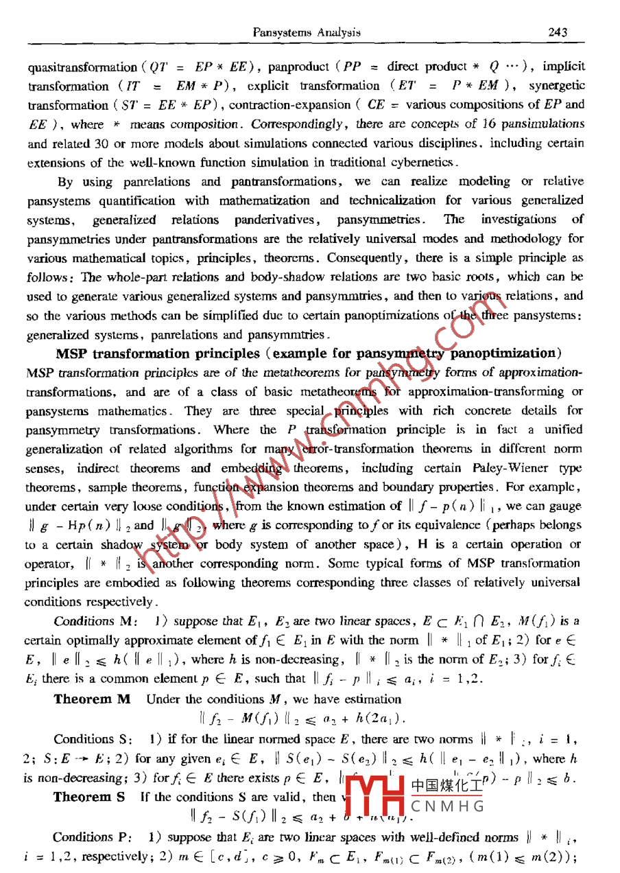 Applied Mathematics and MechanicsPublished by Shanghai University ,( English Edition, Vol 22. No 2,F(xiàn)eb 2001)Shanghai, ChinaArticle ID: 0253-4827(2001 )02- 0237-24PANSYSTEMS ANALYSIS: MATHEMATICS, METHODOLOGY,RELATIVITY AND DIALECTICAL THINKING*GUO Ding-he (郭定和)',WU Xue-mou (吳學(xué)謀)= ,FENG Xiang-jun (馮向軍)', LI Yong-li (李永禮)4(1. Physics Department, Hubei University, Wuhan 430062, P R China; .2. Wuhan Digital Engineering Institute, Wuhan 430074,P R China;3. Storage Technology Division, IBM,Silicon Valley, USA;4. Department of land Surveying and Geo-infornatics, The Horg KongPolytechnic University, Hong Kong, P K China)(Paper from WU Xue -mon, Mermber of Fditorial Comittee, AMM)Abstract: Based on new analysis modes and new definitions with relative mathemuticaticnand simplification or strengthening forms for concepts of generalized systems, .panderivaives,pansymmetry, panbox principle, pansystems relativiry, etc., theframework and related principles of pansystens methodology (and pansystems relativity aredeveloped. Related contenus include: pansystems with relatively universul mathemutizingforms,200 types of dualities, duality transformation ,pansymmetry transformation,pansystems dialectics ,he 8-domain method, pansystems mathemarical methods ,generalized quantification, the principles of approximation- transforming,pan-equivalencetheorems,supply- demand analysis ,thinking experiment, generalized gray systems, etc .Key words; pansystems methodology; relativity; systems; pansymmetry transformation ;dialectical logic; postumodermismCLC numbers: N941.6; 0412: B811Document code: AIntroductionAs an enrolled new discipline in Chinese library classification pansystems theory is atransfield multilayer network like research with the emphasis on pansystems, which exploresccrtain combinations of mathematical thinking ,systems thinking ,dialectical thinking und poetryhinking , and emphasizes particularly on the investigations of the building bricks ,basic blocks,fundamental categories, elementary networks and relativity of pansystems. One of her efforts isinclincd Lto develop a kind of methodology and systems science with postmodernism style,including certain methodology of half- mathematization with relativc operatability, and pursues todiscover some principles and modes of pansystems whose transitive closure is alnost everywhere中國(guó)煤化工* Received date: 2000-03-15; Revised date: 2000-11-.DYHCNMHGBiographies: GLO Ding-he (1955 - ), Associate Professor;WU Xuc-mou (1935- ), Rescarch Fellow237238GUO Ding-he WU Xue-mon, FENG Xiang-jun et aldense in principles of many disciplines and topics. And he investigation on various forms ofrelativity of pansysterms is called the pansystems relativity .Pasystems principles and modes:= The 4-mutuals (interconnection, intertransformation,interderivative and inerpronotion ) or 5- mutuals ( intcronnection, intertansformation,interderivative. interpromotion and inerrestraint, simply denoted by臺(tái)) of various principles .Pansystems relativity: = pansystems theory:= 4-mutuals or nctwork conmection of variousprinciples. It is coresponding w: natural number system:≈rational number system:= rcalnumber system: = complex number system, hypercormplex umber system, fuzy numbersystcm: > various mathematical structures.The present paper extends the past investigations ([1-5]) in some new forms, developsthe framework and related principles of pansystcms methodology and pansystems relativity, andpresents new analysis modes aod new definitions with relaive mathematization and sinmplificationor strengthening forms for concepts of generalized systems, panderivatives, pansymmety ,panbox principle, pansystems relativity, etc . Related contents inchudc: pansystems wih relativelyuniversal forms ( T-ary pansystems, high power pansystems, charm pansystems S:二varioussystems,various mathematical strucuress and various word-descriptions), 200 types of dualties,duality rapsformation, pansymmetry transformation, pansystems dialectics, the 8-domainmethod, pansystems mathematical methods, generalized quantification, the principles ofapproximation-ransforming,pan- equivalencetheorems,supply-demand analysis, thinkingexperiment, generalized gray systems, etc1 Basic Concepts and Pansystems Mathematics1.1 Pansystems and generalized systemsIn the pansystems theory, the category of pansysterms means generalized systerms ,generalized relations or their various compositions ( duality-type definition), σr embodies thethought, investigations and operations research to generalized (or pan-ize) the So-called7-elermeots of pansystems with the tendency 1o connct various disciplines and topics (7-element-type definition) :Pan * (7-elements; ..xtrior interior, observocontrol, clustering discoupling, subject-object,difference identity,body- shadow,panorder, suply-demand, causality-environment, “ ) =strengthen certain 4 mutuals or 5- mutuals of various disciplines or topics.Where the so-called 7-elemenls imply the typical sub-concepts of pansystems category suchas: generalized systems, relations, symmetry ( pansynmetry ),Shengke, transformations( panlransformations), oprimization ( panoptimization),infinitesinal calculus ( panderivative). .Things/ Principles≈Pansysterms●Transitive Closure/ Repcated Operaions-Transformations-Applications (similar to generalized chaotic dynamics and neural networks)≈Certain 4-mutualsof various disciplines or topics .In a certain sense,pansystems theory pursues certa中國(guó)煤化工or modes whoseransitive closure is almost everywhere dense in principl.MHCNM.HGr topis.The generalized systerms can be represented in mathematical form as certain formalcombination of the generalized hardware A and generalized software B, or a sort of hard-softunified snix.s = (A,B). Where A is certain given thing-set, including certain well-definedPansystems Analysis239pansystems set, and B is ccrtain rclations or panweighl composition of re