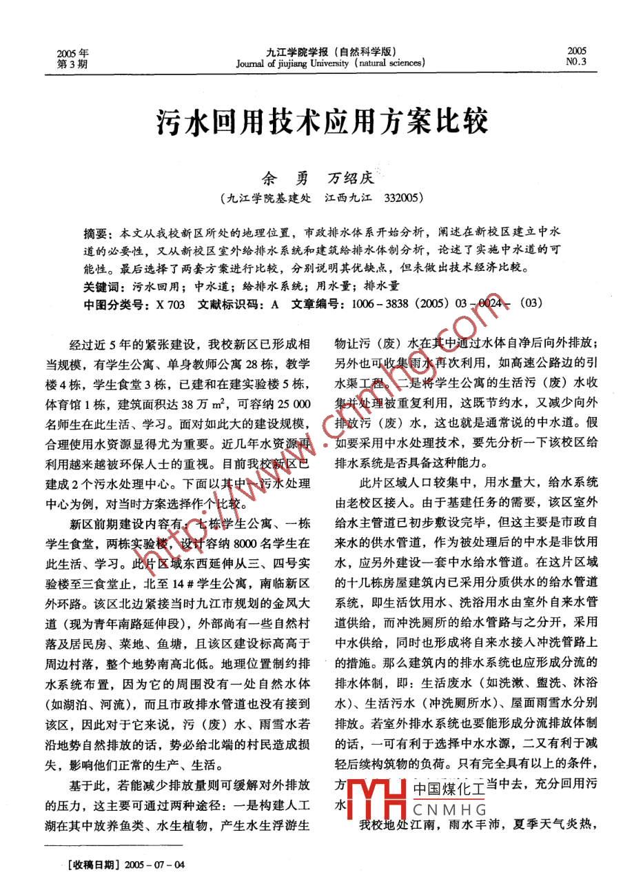 2005年九江學(xué)院學(xué)報(bào)( 自然科學(xué)版)2005第3期Joumal of jujiang University (natural sciences)N0.3污水回用技術(shù)應(yīng)用方案比較佘勇萬紹慶(九江學(xué)院基建處江西九江332005)摘要:本文從我校新區(qū)所處的地理位置,市政排水體系開始分析,闡述在新校區(qū)建立中水道的必要性,又從新校區(qū)室外給排水系統(tǒng)和建筑給排水體制分析,論述了實(shí)施中水道的可能性。最后選擇了兩套方案進(jìn)行比較,分別說明其優(yōu)缺點(diǎn),但未做出技術(shù)經(jīng)濟(jì)比較。關(guān)鍵詞:污水回用;中水道;給排水系統(tǒng);用水量;排水量中圖分類號(hào): x 703文獻(xiàn)標(biāo)識(shí)碼: A文章編號(hào): 1006- 3838 (2005) 03- 0024- (03)經(jīng)過近5年的緊張建設(shè),我校新區(qū)已形成相物讓污(廢)水在其中通過水體自凈后向外排放;當(dāng)規(guī)模,有學(xué)生公寓、單身教師公寓28棟,教學(xué)另外也可收集雨水再次利用,如高速公路邊的引樓4棟,學(xué)生食堂3棟,已建和在建實(shí)驗(yàn)樓5棟,水渠工程。二是將學(xué)生公寓的生活污(廢)水收體育館1棟,建筑面積達(dá)38萬m2,可容納25 000集并處理被重復(fù)利用,這既節(jié)約水,又減少向外名師生在此生活、學(xué)習(xí)。面對如此大的建設(shè)規(guī)模,排放污(廢)水,這也就是通常說的中水道。假合理使用水資源顯得尤為重要。近幾年水資源再如要采用中水處理技術(shù),要先分析一下該校區(qū)給利用越來越被環(huán)保人士的重視。目前我校新區(qū)已排水系統(tǒng)是否具備這種能力。建成2個(gè)污水處理中心。下面以其中一污水處理此片區(qū)域人口較集中,用水量大,給水系統(tǒng)中心為例,對當(dāng)時(shí)方案選擇作個(gè)比較。由老校區(qū)接人。由于基建任務(wù)的需要,該區(qū)室外新區(qū)前期建設(shè)內(nèi)容有:七棟學(xué)生公寓、一棟給水主管道已初步敷設(shè)完畢,但這主要是市政自學(xué)生食堂,兩棟實(shí)驗(yàn)樓,設(shè)計(jì)容納8000名學(xué)生在來水的供水管道,作為被處理后的中水是非飲用此生活、學(xué)習(xí)。此片區(qū)域東西延伸從三、四號(hào)實(shí)水,應(yīng)另外建設(shè)一套中水給水管道。 在這片區(qū)域驗(yàn)樓至三食堂止,北至14#學(xué)生公寓,南臨新區(qū)的十幾棟房屋建筑內(nèi)已采用分質(zhì)供水的給水管道外環(huán)路。該區(qū)北邊緊接當(dāng)時(shí)九江市規(guī)劃的金鳳大系統(tǒng),即生活飲用水、洗浴用水由室外自來水管道(現(xiàn)為青年南路延伸段),外部尚有一些自然村道供給,而沖洗廁所的給水管路與之分開,采用落及居民房、菜地、魚塘,且該區(qū)建設(shè)標(biāo)高高于中水供給,同時(shí)也形成將自來水接人沖洗管路上周邊村落,整個(gè)地勢南高北低。地理位置制約排的措施。那么建筑內(nèi)的排水系統(tǒng)也應(yīng)形成分流的水系統(tǒng)布置,因?yàn)樗闹車鷽]有一處自然水體排水體制,即:生活廢水(如洗漱、盥洗、沐浴(如湖泊、河流),而且市政排水管道也沒有接到水)、生活污水(沖洗廁所水)、屋面雨雪水分別該區(qū),因此對于它來說,污(廢)水、雨雪水若排放。若室外排水系統(tǒng)也要能形成分流排放體制沿地勢自然排放的話,勢必給北端的村民造成損的話,一可有利于選擇中水水源,二又有利于減失,影響他們正常的生產(chǎn)、生活。輕后續(xù)構(gòu)筑物的負(fù)荷。只有完全具有以上的條件,基于此,若能減少排放量則可緩解對外排放方I中國煤化工當(dāng)中去,充分回用污的壓力,這主要可通過兩種途徑:一是構(gòu)建人工MHCNMH G湖在其中放養(yǎng)魚類、水生植物,產(chǎn)生水生浮游生我校地處江南,雨水豐沛,夏季天氣炎熱,[收稿日期] 2005-07- 042005年第3期九江學(xué)院學(xué)報(bào)(自然科學(xué)版)25●冬季較為寒冷,從這- - 方面來看,用水量是不平表漫流后,匯人雨水管道被最終排放。因此完整衡的。但地處我校北部的這片區(qū)域人口較為固定,的雨水排放體系是不可缺少的。被處理后中水主學(xué)習(xí)生活周期性強(qiáng),寒暑假三個(gè)月將是用水低峰,要可用于:①?zèng)_廁、道路清洗、綠化、洗車、施而其它幾個(gè)月氣候較為適宜,因此總體來說用水工 等城市雜用水;②噴水景觀用。又會(huì)相對平衡。在正常的教學(xué)周期中,會(huì)有8 000根據(jù)中水水源不同的水質(zhì)情況及中水用途,名左右的師生生活在這里,以每人每日用水150L可采用兩套中水處理 方案:考慮,則每日的總用水量為1200m, 日排水量以第一種方案選用較為潔凈的優(yōu)質(zhì)的雜排水作用水量的80%~90%計(jì)算,那么這里的日排水量為中水水源,如洗浴、盥洗用水,再輔以一定量應(yīng)在960~ 1080m3之間,這么大的排水量若能重復(fù)的雨水來調(diào)節(jié)水量、水質(zhì)。經(jīng)過簡單的物化處理利用的話,無疑是一件非常有意義的事。生活排后,中水主要用于沖洗廁所。若此片區(qū)域每人每水中主要污染物是有機(jī)物及懸浮物質(zhì),另外,學(xué)日用于洗浴、盥洗的用量為80L則共計(jì)640m3/d,生食堂排水中還含有大量的油污水,即高濃度的那么排放量約為512m3/d,而用于沖洗廁所用水以BOD、COD,而雨雪水則較為潔凈,含有一些固體每人每日60L計(jì)算共需約480m'/d。生活廢水的排顆粒物質(zhì)。放量約是中水水量的1.1 倍弱,所