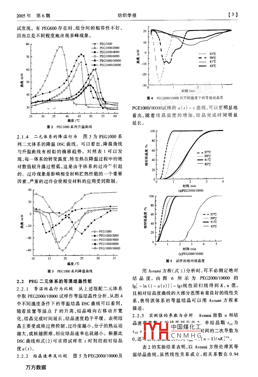 第26卷第6期紡織學(xué)報(bào)Vol 26. No 6005年12月Journal of Textile Research科研報(bào)告二元聚乙二醇體系相變行為的研究王瑋玲1,于偉東2(1.鹽城工學(xué)院紡織工程系,江蘇鹽城224003;2.東華大學(xué)紡織學(xué)院,上海200051)摘要釆用差示掃描量熱法(DsC)對二元聚乙二醇(PEG)體系的等速升降溫性能及等溫結(jié)晶性能進(jìn)行了研究,并對各溫度特征參數(shù)及熔融、結(jié)晶熱作了表征。關(guān)鍵詞聚乙二醇;相變材料;等速升降溫;等溫結(jié)晶中圖分類號:T1qu.92文獻(xiàn)標(biāo)識碼:A文章編號:02539721(2005)06-0001-04tudy on the phase change behavior of two component polyethylene glycol systemWANG Wei-ling, YU Wei-don(1. Department of Textile Engineering, Yancheng Institute of Technology, Yancheng, Jiangsu 224003, China;2. College of Textile, Donghua University, Shanghai 200051, China)Abstract Differential scanning calorimetry ( DSC)was used to study the constant rate heating and cooling and the isothermalcrystallizing behavior of the two component PEG system. The characteristic parameters at different temperatures were examined andthe heat of exotherms and endotherms was measuredKey words PEG; phase change material; constant rate heating and cooling isothermal crystallization聚乙二醇(PEG)是一種較好的高分子化合物類化學(xué)純(CP)試劑。這類不同分子量的PEG可溶于的相變材料,其分子鏈較長,但不均一,且結(jié)晶不水、乙醇、丙酮等。常溫下除PEG600為粘性液體完善,因此相變過程有一定的溫度范圍,不像低分子外,均為固體。量的物質(zhì)為明顯的熔融尖峰。這種熔融峰特征,使12試樣準(zhǔn)備材料的相變過程較為平穩(wěn)和可控,不易出現(xiàn)過冷現(xiàn)將不同分子量的PEG進(jìn)行兩兩混配,質(zhì)量百分象和相分離。該材料在固體狀態(tài)時成形性較好,本比為50:50。為使混合物混合均勻,在密封玻璃管身腐蝕性小,性能較穩(wěn)定,毒性小,成本低2。單一內(nèi)將混合物加熱至清亮的液體,冷卻后再研磨成細(xì)組分的PEG熔融吸熱量和熔融溫度以及其它性能粉,取樣供DSC測試之用。均與其分子量存在很大的依存性,其分子量越大,13相變行為表征熔點(diǎn)溫度越高,熔融熱越大。理論上雖能選擇不采用 Perkin-Elmer Pyrisul DSC差示掃描量熱儀,同分子量的PEG來滿足實(shí)際要求,但材料的加工難對混配PEG的相變行為測量,質(zhì)量控制在8~10mg度較高。將不同分子量的PEG混合可克服此問題,內(nèi),并密封于標(biāo)準(zhǔn)鋁坩鍋內(nèi)。在氮?dú)獗Wo(hù)下做等速尤其合理混配不同分子量的聚乙二醇,可得到適于升、降溫相變行為測量,即從-30℃以20℃/mn的服用自適性相變纖維材料的工作物質(zhì)。對此二元聚速度升溫掃描至100℃,恒溫1min,再以20℃/min的乙二醇體系的相變行為進(jìn)行分析,可提供較優(yōu)的配速度降溫掃描至-30℃,記錄升降溫曲線,以及等伍方式。溫掃描測量,即升溫至100℃后,恒溫1min,然后以100℃/min的速率降溫至指定溫度恒溫掃描直至完1實(shí)驗(yàn)部分全結(jié)晶1.1實(shí)驗(yàn)試劑對中國煤化工為:相變開始點(diǎn)采用中國醫(yī)藥集團(tuán)上?;瘜W(xué)試劑公司提供的溫度CNMHG(℃);相變最高PEC600、10020.00600100,.均為點(diǎn)溫度T(℃);熔融吸熱量△Hn(Jg,從升溫曲線作者簡介:王瑋玲(1976-),女,講師,碩士。主要從事新型纖維性能與應(yīng)用方面的研究。【2紡織學(xué)報(bào)2005年第6期峰面積獲得);結(jié)晶放熱量△H(J/g,從降溫曲線峰特征指標(biāo)見表1。由圖1看出,PEG二元體系的DSC面積獲得);過冷溫差△T等。圖譜并不是體系中兩組分單獨(dú)時DSC圖譜的簡單對于等溫掃描測量釆用 Avrami3方程的指標(biāo):相加,而是出現(xiàn)了2個大小不一的吸熱峰和放熱峰,lg-ln(1-a(t)]=nlgt+lgk(1)這說明不同分子量的PG兩組分混合前后所處的a(t)sX(t)x。(t=∞)=物理狀態(tài)不同,混合體系內(nèi)發(fā)生了某種物理變化,使dH2(t),/r…"dH。(t)得PEG大分子重新排序、取向,結(jié)晶相發(fā)生改變。dt同時,在較低溫度區(qū)內(nèi)PEG存在其它轉(zhuǎn)變,尤其是式中,x。(t)為t時刻的結(jié)晶度;X。(t)為結(jié)晶終了低分子量的PEG混合物,升溫曲線在0℃不到和時的結(jié)晶度;dH(t)dt為t時刻的熱流速度;K為3℃左右有峰;降溫曲線在0℃附近亦有峰。結(jié)晶速率常數(shù),與成核機(jī)理和晶體生長速度有關(guān);n為 avrami指數(shù)。00由lg[-ln(1-a(t))]對lgt作圖。從直線斜率求得n值,由截距求得K值。令a(t)=1/2可算出半結(jié)晶期t102結(jié)果與討論3021等速升降溫的DSC分析結(jié)果2.1.1典型PEG二元體系的相變行為曲線圖溫度/℃為典型的PEG二元體系的升降溫相變行為曲線,其圖1PEC60020000的DC掃描圖譜裘1等速變溫過程中PEG二元體系熔融和結(jié)晶性能PEG二元體系過冷37,518.91.270.466.5261,101174325,5210.21435.739,219061.420440.940.2750.984.715.17600/200032.640.I101.65138,431.22533.847,283.3899136.350.72000/1000059.356.475.51725.92000/20000220004000192,40627,7180600/600043.7115.0332.1.2各混配的特征參數(shù)通過DSC熱分析測試態(tài)。實(shí)驗(yàn)表明PEG二元體系的過冷不明顯,對貯熱曲線,可以得出各種樣品發(fā)生相轉(zhuǎn)變的溫度、相轉(zhuǎn)變實(shí)用影響不大。熱,從而為選取適合應(yīng)用于調(diào)溫服的相變材料體系2.13元體系的升溫行為圖2為PEG0提供重要依據(jù)。表1中特征參數(shù)的下標(biāo)1,2分別表列中國煤化工由此可看出,二元體示升溫和降溫,其相變行為特征值明