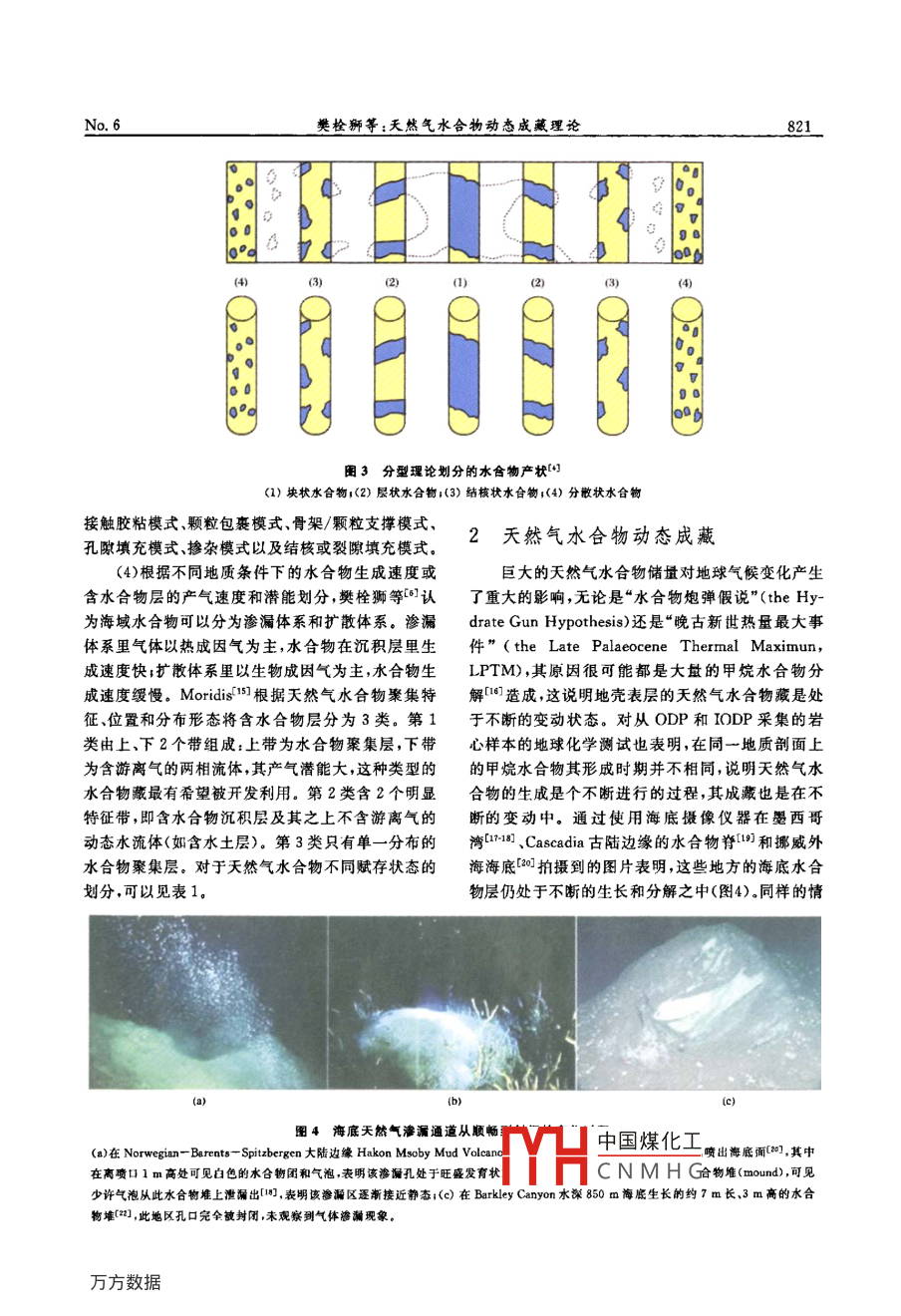 第18卷第6期天然氣地球科學(xué)Vol 18 No 62007年12月NATURAL GAS GEOSCIENCE2007天然氣水合物天然氣水合物動(dòng)態(tài)成藏理論樊栓獅13,關(guān)進(jìn)安23,梁德青2,寧伏龍1.華南理工大學(xué)傳熱強(qiáng)化與過程節(jié)能敉育部重點(diǎn)實(shí)驗(yàn)窒,廣東廣州,510640;2.中國科學(xué)院廣州能源研究所,廣東廣州510640;3.中國科學(xué)院廣州天然氣水合物研究中心,廣東廣州5106404.中國科學(xué)院研究生院,北京100039;5.中國地質(zhì)大學(xué)工程學(xué)院,湖北武漢430074)摘要:總結(jié)了天然氣水合物的賦存狀態(tài)及其分類,從生成和分解速度角度提出了天然氣水合物的動(dòng)態(tài)成巖理論,并依據(jù)凍土層鉆井氣體噴溢、海底水合物露頭和海底羽狀氣泡流等實(shí)例論證了這種動(dòng)態(tài)成藏理論。指出天然氣水合物賦存狀態(tài)主要有3種類型,即成長型(滲透型、擴(kuò)散型)、成熟型和消退型,認(rèn)為我國南海北部陸坡區(qū)的西沙海槽、東沙群島東南坡、臺西南盆地、筆架南盆地等區(qū)域有可能存在著仍處于發(fā)育階段的滲透型或擴(kuò)散型水合物層,兩青藏高原羌塘盆地則是屬于消退型水合物,祁連山地區(qū)、準(zhǔn)噶爾盆地等的烴類氣體泄漏表明在我國西北和東北的凍土帶也可能存在著含氣水合物層。關(guān)鍵詞:天然氣水合物;儲層;分類;動(dòng)態(tài)成蕆;理論中圖分類號:TE122文獻(xiàn)標(biāo)識碼:A文章編號:1672-1926(2007)06-0819-08前言的分類,不少學(xué)者4分別從生成水合物的氣體來源和水合物在沉積層中的賦存狀態(tài)、水合物的賦存范天然氣水合物是由小“客體”分子(<0.9mm)圍以及水合物儲層的演變過程等方面總結(jié)了水合物如CH4等在一定溫度壓力條件下接觸到水分子而的分類特征。形成的白色似冰的籠型結(jié)晶化合物(,具有單位能無論是從水合物在沉積層的產(chǎn)狀還是從水合物量密度高、分布廣、規(guī)模大、埋藏淺、成藏物化條件佳氣體的來源等角度考慮對天然氣水合物分類,都沒等優(yōu)點(diǎn),具廣泛分布于世界各大洋海底與陸地永凍有涉及到其自身的一項(xiàng)重要特征,即天然氣水合物層,(圖1)。從圖1中可以看出水合物在凍土帶和是一種并不穩(wěn)定的固體,即使在合適的熱力學(xué)條件大陸邊緣陸坡廣泛存在, Klauda and Sandler認(rèn)下,水合物自身也會不斷分解,這一點(diǎn)對于分析天然為全球海域的天然氣水合物中儲存有74000Gt的氣水合物在自然界的賦存狀態(tài)非常重要。本文根據(jù)甲烷(,其數(shù)量之大,是全世界常規(guī)天然氣儲量的3天然氣水合物的熱穩(wěn)定特性認(rèn)為其在自然界中的個(gè)數(shù)量級??梢娝衔餁赓Y源量極其豐富,被譽(yù)為聚集是一種生成和分解同時(shí)存在的過程,據(jù)此提出21世紀(jì)的可代替能源了水合物的動(dòng)態(tài)成藏理論,并且通過3個(gè)自然界水天然氣水合物在沉積物地層中聚集形成具有一合物形成的實(shí)例來論證。定儲量規(guī)模的礦藏是一個(gè)復(fù)雜的過程,它必須有充足的烴類氣源合適的相平衡溫壓條件和良好的圈1天然氣水合物的賦存狀態(tài)閉條件。為了合理開發(fā)利用天然氣水合物資源,需目前,對于天然氣水合物在自然界的賦存狀態(tài)要根據(jù)水合物生成和儲存狀態(tài)的特點(diǎn)對其進(jìn)行恰當(dāng)通常分為以下∏中國煤化工收稿日期:2007-07-23;修回日期:2007-09-28基金項(xiàng)目:中國科學(xué)院創(chuàng)新項(xiàng)目(編號:KGCX2sW-224);國家自然科學(xué)CNMHG學(xué)基金重點(diǎn)(編號:052001130)聯(lián)合資助作者簡介:樊栓獅(1965-),男,陜西蒲織人,教授博士生導(dǎo)師,主要從事天然氣水合物化工分離等研究.Emai; fanss(@ms, iee.acnVol 18■勘保證實(shí)了的陸地水合物●勘探證實(shí)了的海洋水合物口推測存在的陸地水合物O推測存在的海洋水合物圖1天然氣水合物在全球的分布地點(diǎn)預(yù)測(1)根據(jù)天然氣水合物的物質(zhì)組分劃分,有氣源合物的自保護(hù)效應(yīng)能聚集更大量的天然氣13說與水源說2類。天然氣水合物是由氣體和水溫度℃)組成的一種固體物質(zhì),其籠型結(jié)構(gòu)里包容了不同尺寸的氣體分子。根據(jù)烴類氣體成分比值[R=C1/(C2+C3)]和甲烷的碳同位素8C值來判別甲烷氣HMZ體的成因,此即為氣源說。在美國墨西哥灣水合物區(qū)塊的研究工作表明形成水合物的烴類氣體共有3種成因:熱成因氣、生物成因氣和混合成因氣1天然氣水合物在海底沉積物里生成和分解時(shí),會導(dǎo)致孔隙水中陰離子(Cl-、SO等)、陽離子(Ca2+Mg2+等)和氫氧同位素的的異常12,對孔隙水進(jìn)行地球化學(xué)檢測可以指示水合物的存在情況,此即為水源說圖2凍土帶中HSZ與HMZ的分布范圍(2)根據(jù)天然氣水合物存在的地理地質(zhì)環(huán)境和左圖顯示HMZ通常處于水合物相平衡線外熱穩(wěn)定性劃分,可以分為陸地凍土層天然氣水合物右圖表明殘余水合物通常被冰包裹和海洋天然氣水合物。天然氣水合物廣泛存在(3)根據(jù)水合物在沉積層里的生成產(chǎn)狀劃分,有手全世界各地的海洋和內(nèi)陸溺中,特別是在大陸邊不同的劃分方法.Mne等(首先對海洋水合物緣的淺海里。另外一個(gè)水合物富集的地域是大陸凍產(chǎn)狀進(jìn)行了多年研究,他們運(yùn)用分型理論(此理論是士層,在西伯利亞阿拉斯加等地區(qū