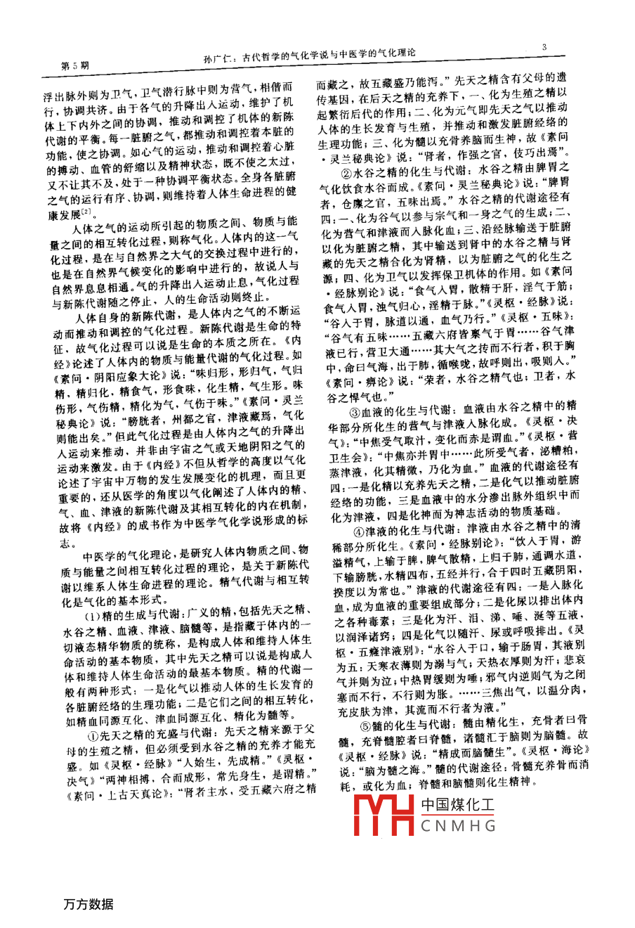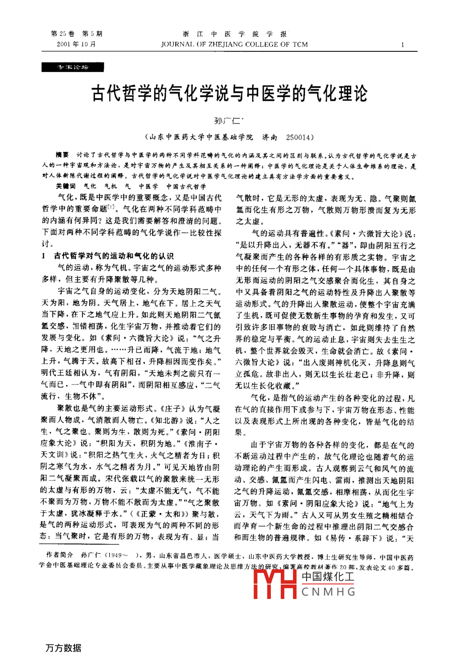 第25卷第5期浙江中醫(yī)學院2001年10月JOURNAL OF ZHEJIANG COLLEGE OF TCM家論拓古代哲學的氣化學說與中醫(yī)學的氣化理論孫廣仁(山東中醫(yī)藥大學中醫(yī)基礎(chǔ)學院濟南250014)擄要討論了古代哲學與中醫(yī)學的兩種不同學科范疇的氣化的內(nèi)涵及其之間的區(qū)別與聯(lián)系,認為古代哲學的氣化學說是古人的一種宇宙觀和方法論,是對宇宙萬物的產(chǎn)生及其櫚互關(guān)系的一種闡釋;中醫(yī)學的氣化理論是關(guān)于人體生命維系的理論,是對人體新陳代謝過程的闡釋。古代晢學的氣化學說對中醫(yī)學氣化理論的建立具有方法學方面的重要意義。關(guān)鍵詞氣化氣機氣中醫(yī)學中國古代哲學氣化,既是中醫(yī)學中的重要概念,又是中國古代氣散時,它是無形的太虛,表現(xiàn)為無、隱。氣聚則氤哲學中的重要命題口。氣化在兩種不同學科范疇中氳而化生有形之萬物,氣散則萬物形潰而復(fù)為無形的內(nèi)涵有何異同?這是我們需要解答和澄清的問題。之太虛。下面對兩種不同學科范疇的氣化學說作一比較性探氣的運動具有普遍性?!端貑枴ち⒅即笳摗氛f:“是以升降出入,無器不有?!薄捌鳌?即由陰陽五行之1古代哲學對氣的運動和氣化的認識氣凝聚而產(chǎn)生的各種各樣的有形質(zhì)之實物。宇宙之氣的運動,稱為氣機。宇宙之氣的運動形式多種中的任何一個有形之體,任何一個具體事物,既是由多樣,但主要有升降聚散等幾種無形而運動的陰陽之氣交感聚合而化生,其自身之宇宙之氣自身的運動變化,分為天地陰陽二氣。中又具備著陰陽之氣的運動特性及升降出入聚散等天為陽,地為陰。天氣居上,地氣在下。居上之天氣運動形式。氣的升降出入聚散運動,使整個宇宙充滿當下降,在下之地氣應(yīng)上升。如此則天地陰陽二氣氤了生機,既可促使無數(shù)新生事物的孕育和發(fā)生,又可氳交感,淚錯相蕩,化生宇宙萬物,并推動著它們的引致許多舊事物的衰敗與消亡,如此則維持了自然發(fā)展與變化。如《素問·六微旨大論》說:“氣之升界的穩(wěn)定與平衡。氣的運動止息,宇宙則失去生生之降,天地之更用也?!讯?氣流于地;地氣機,整個世界就會毀滅,生命就會消亡。故《素問上升,氣騰于天。故高下相召,升降相因而變作矣?!绷⒅即笳摗氛f:“出入廢則神機化滅,升降息則氣明代王廷相認為,氣有陰陽,“天地未判之前只有一立孤危。故非出入,則無以生長壯老已;非升降,則氣而已.一氣中即有陰陽”,而陰陽相互感應(yīng),“二氣無以生長化收藏?!绷餍?生物不休氣化,是指氣的運動產(chǎn)生的各種變化的過程,凡聚散也是氣的主要運動形式?!肚f子》認為氣凝在氣的直接作用下或參與下,宇宙萬物在形態(tài)、性能聚而人物成,氣消散而人物亡?!吨庇巍氛f:“人之以及表現(xiàn)形式上所出現(xiàn)的各種變化,皆是氣化的結(jié)生·氣之聚也。聚則為生,散則為死?!薄端貑枴り庩柟?。應(yīng)象大論》說:“積陽為天,積陰為地?!薄痘茨献佑捎谟钪嫒f物的各種各樣的變化,都是在氣的天文訓(xùn)》說:“積陽之熱氣生火,火氣之精者為日;積不斷運動過程中產(chǎn)生的,故氣化理論也隨著氣的運陰之寒氣為水,水氣之精者為月?!笨梢娞斓亟杂申巹永碚摰漠a(chǎn)生而形成。古人觀察到云氣和風氣的流陽二氣凝聚而成。宋代張載以氣的聚散來統(tǒng)一無形動、交感、氤氳而產(chǎn)生閃電、雷雨,推測出天地陰陽的太虛與有形的萬物,云:“太虛不能無氣,氣不能之氣的升降運動,氤氳交感,相摩相蕩,從而化生宇不聚而為萬物,萬物不能不散而為太虛。”“氣之聚散宙萬物。如《素問·陰陽應(yīng)象大論》說:“地氣上為于太虛,猶冰凝釋于水?!?《正蒙·太和》)聚與散,云,天氣下為雨?!惫湃擞挚蓮哪信持嘟Y(jié)合是氣的兩種運動形式,可表現(xiàn)為氣的兩種不同的形而孕育一個新生命的過程中推理出陰陽二氣交感合態(tài):當氣聚時,它是有形的萬物,表現(xiàn)為有、顯;當和而生物的普遍規(guī)律。如《易傳·系辭下》說:“天作者簡介孫廣仁(1949男,山東省昌邑市人,醫(yī)學碩士,山東中醫(yī)藥大學教授,博土生研究生導(dǎo)師,中國中醫(yī)藥學會中醫(yī)基礎(chǔ)理論專業(yè)委員會委員主要從事中醫(yī)學藏象理論及思維方法的研究編高校教材著作20部,發(fā)表論文40多篇中國煤化工CNMHG浙江中醫(yī)學院學報第25卷地氤氳,萬物化醇;男女構(gòu)精,萬物化生?!庇捎诰鰜?。因而氣的運動與氣化過程實際上是“分之為氣自身的升降運動,天地陰陽之氣的交感合和,宇宙二,合之為一”的概念。氣的運動及其維持的氣化過間萬物發(fā)生了紛繁的變化,有新事物的產(chǎn)生,也有舊程是永恒的、不間斷的,它們是宇宙萬物發(fā)生發(fā)展變事物的消亡。故《易傳·系辭上》說:“生生謂之易。”化的內(nèi)在動力《莊子·至樂》說:“氣變而有形,形變而有生。”《素(2)氣化過程有化與變兩個不同的類型。《內(nèi)問·六節(jié)藏象論》說:“氣合而有形,因變以正名?!苯?jīng)》將“化”與“變”作為氣化的兩種不同的類型《素問·天元紀大論》說:“物生謂之化,物極謂之變可產(chǎn)生于氣化過程中的不同階段。如《素問·天元紀在天化氣,在地成形,形氣相感而化生萬物矣?!贝笳摗氛f:“物生謂之化,物極謂之變。”“化”,是指在氣的運動的促進作用下,自然界的萬事萬