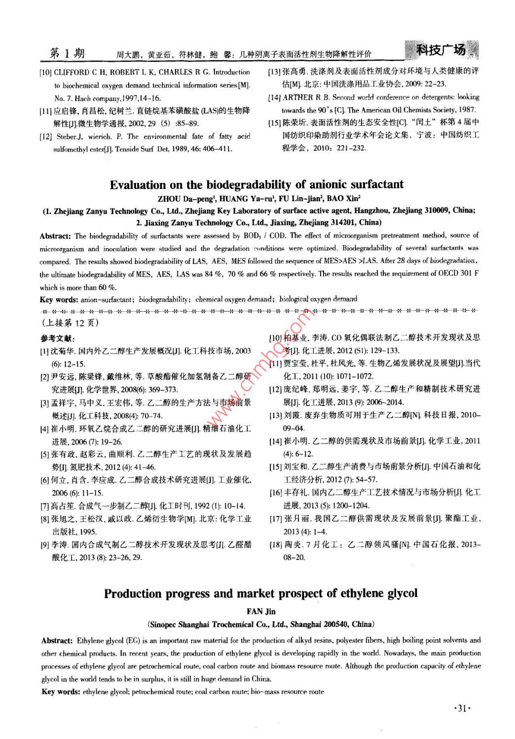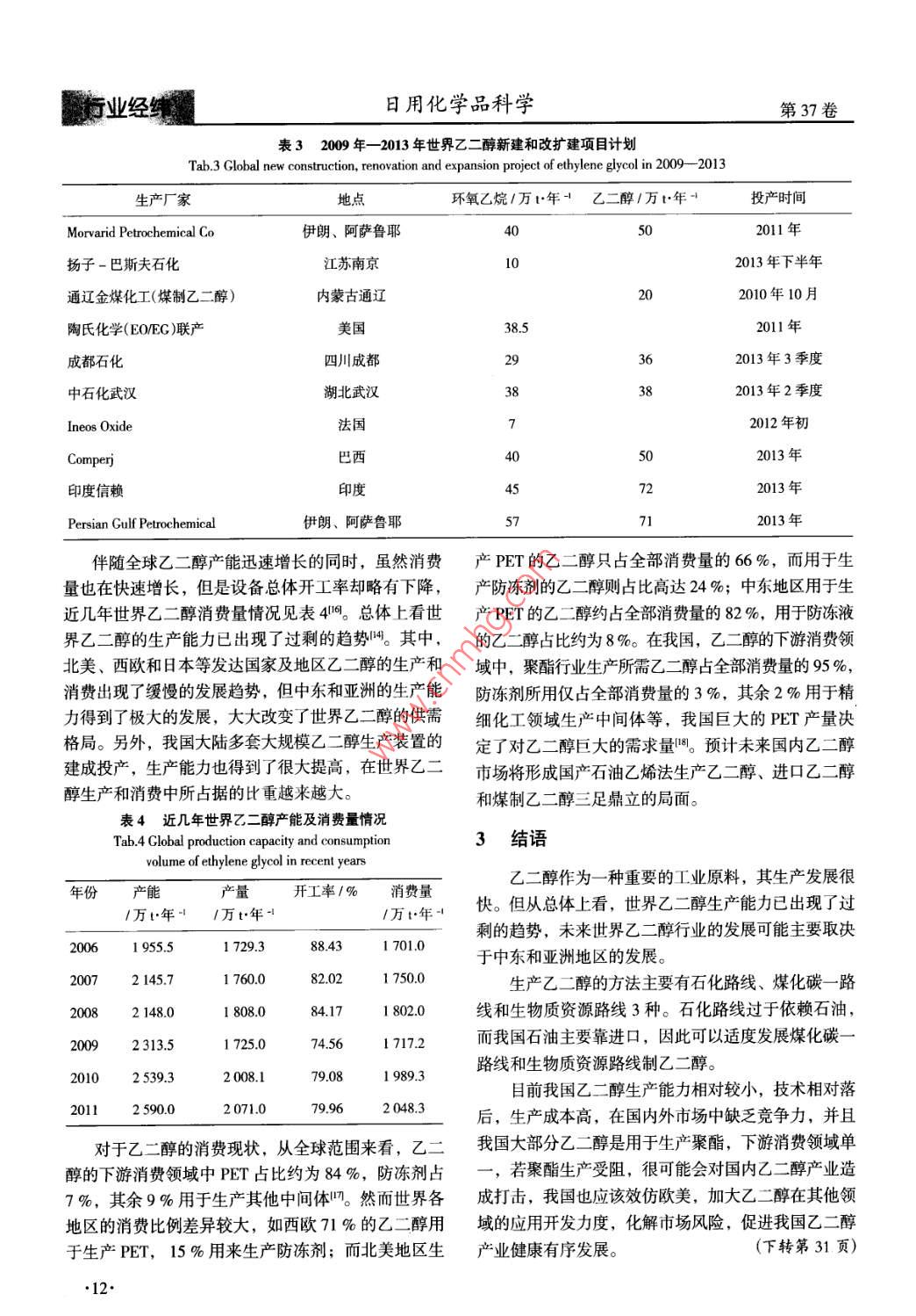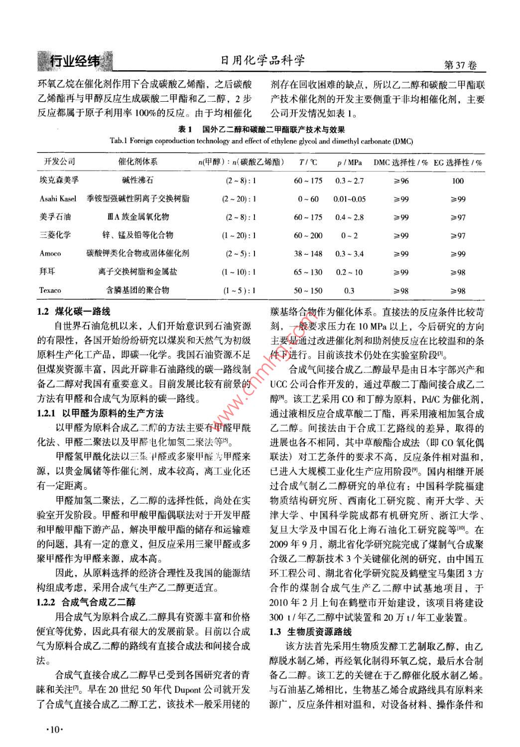 第37卷第1期日用化學(xué)品科學(xué) Vol.37 No.12014年1 DETERGENT COSMETICSJan.2014乙二醇的生產(chǎn)技術(shù)進(jìn)展及市場(chǎng)前景分析范進(jìn)(中國(guó)石化上海石油化工股份有限公司,上海200540)摘要:乙二醇(EG)是生產(chǎn)醇酸樹(shù)脂、聚酯纖維和高沸點(diǎn)溶劑等化工產(chǎn)品的重要原料。對(duì)目前常用的3種乙二醇生產(chǎn)技術(shù):石化路線、煤化碳一路線和生物質(zhì)資源路線進(jìn)行了概述。分析了乙二醇的生產(chǎn)能力及市場(chǎng)前景,世界上乙二醇已出現(xiàn)了過(guò)剩的趨勢(shì),但我國(guó)對(duì)乙二醇的需求量仍然巨大。關(guān)鍵詞:乙二醇;石化路線;煤化碳一路線;生物質(zhì)資源路線中圖分類號(hào):TQ423文獻(xiàn)標(biāo)識(shí)碼:A文章編號(hào):00-264(21401-000do:10.13222/j.cnki.dc.2014.01.002乙二醇(EG),俗稱甘醇,是最簡(jiǎn)單和最重要的水解反應(yīng)器,水解后停留約30min,操作壓力約為脂肪族二元醇,更是一種重要的有機(jī)化工原料它2.23MPa。生成的乙二醇水溶液中乙二醇質(zhì)量分?jǐn)?shù)大既可以作為生產(chǎn)醇酸樹(shù)脂、聚對(duì)苯二甲酸乙二醇酯、約在10%左右。其不足之處是生產(chǎn)工藝流程長(zhǎng)、設(shè)聚酯纖維和聚酯塑料的重要原料,也可以作為高沸點(diǎn)備多、能耗高,這些因素直接影響乙二醇的生產(chǎn)成溶劑,其中用于生產(chǎn)聚酯纖維的乙二醇消費(fèi)量約占本。目前此生產(chǎn)技術(shù)基本上由英荷殼牌(Shell)、美全球產(chǎn)量的54%。隨著近幾年全球聚酯產(chǎn)品市場(chǎng)消國(guó) Halcom--以及美國(guó)聯(lián)碳化學(xué)公司(UCC)3家公費(fèi)的增加和乙二醇生產(chǎn)工藝的不斷創(chuàng)新,世界范圍內(nèi)司所壟斷乙二醇的生產(chǎn)發(fā)展很快,2006年一2011年的6年間,1.1.2環(huán)氧乙烷催化水合法世界范圍乙二醇消耗量增長(zhǎng)了20%針對(duì)環(huán)氧乙烷直接水合法生產(chǎn)乙二醇工藝中存在本文介紹了目前世界上常用的乙二醇生產(chǎn)方法以的不足,國(guó)內(nèi)外相繼開(kāi)展了環(huán)氧乙烷直接催化水合法及世界范圍內(nèi)乙二醇的生產(chǎn)能力,并對(duì)其市場(chǎng)前景及的研究,這一方法的關(guān)鍵是催化劑的研制與開(kāi)發(fā)供求關(guān)系進(jìn)行了分析。水合催化劑的開(kāi)發(fā),大致可分為均相催化水合法1乙二醇的生產(chǎn)方法和非均相催化水合法兩大類。 Shell公司早期曾采用氟磺酸離子交換樹(shù)脂催化劑,隨后又開(kāi)發(fā)了一系列具乙二醇生產(chǎn)技術(shù)主要分為石化路線、煤化碳一路有正電中心的固體物質(zhì)為催化劑,但其壽命短且耐熱線和生物質(zhì)資源路線。性能差。 Shell公司又研制了與鹽相絡(luò)合的大環(huán)螯合1.1石化路線合成乙二醇化合物為催化劑。對(duì)于非均相反應(yīng),大環(huán)螯合化合物在石化路線中有環(huán)氧乙烷直接水合法、環(huán)氧乙烷催化劑的熱穩(wěn)定性比較高,與樹(shù)脂催化劑在相同的條催化水合法及碳酸乙烯酯法。這些方法的基礎(chǔ)是乙烯件下,反應(yīng)5h時(shí)環(huán)氧乙烷轉(zhuǎn)化率大于99%,乙二氧化生成環(huán)氧乙烷,因而環(huán)氧乙烷的產(chǎn)率直接關(guān)系到醇選擇性最高可達(dá)95%石化路線生產(chǎn)乙二醇的成本1.1.3碳酸乙烯酯法111環(huán)氧乙烷直接水合法碳酸乙烯酯法合成乙二醇是由二氧化碳和環(huán)氧乙環(huán)氧乙烷直接水合法是目前國(guó)內(nèi)外工業(yè)化生產(chǎn)乙烷在催化劑作用下反應(yīng)生成碳酸乙烯酯,再經(jīng)水解制二醇的主要方法,該方法在高溫高壓下進(jìn)行,將環(huán)氧得乙二醇。該方法又分為乙二醇和碳酸二甲酯聯(lián)產(chǎn)法乙烷與水以一定摩爾比混合,然后與離開(kāi)水解反應(yīng)器和碳酸乙烯酯水解法的乙二醇和水的混合物換熱,預(yù)熱到一定溫度后進(jìn)入乙二醇和碳酸二甲酯聯(lián)產(chǎn)法是首先將二氧化碳和收稿日期:2013-12-14作者簡(jiǎn)介:范進(jìn)(1977-),女,上海人,工程師。9行業(yè)經(jīng)緯日用化學(xué)品科學(xué)第37卷環(huán)氧乙烷在催化劑作用下合成碳酸乙烯酯,之后碳酸劑存在回收困難的缺點(diǎn),所以乙二醇和碳酸二甲酯聯(lián)乙烯酯再與甲醇反應(yīng)生成碳酸二甲酯和乙二醇,2步產(chǎn)技術(shù)催化劑的開(kāi)發(fā)主要側(cè)重于非均相催化劑,主要反應(yīng)都屬于原子利用率100%的反應(yīng)。由于均相催化公司開(kāi)發(fā)情況如表1表1國(guó)外乙醇和碳酸二甲酯聯(lián)產(chǎn)技術(shù)與效果 Tab. Foreign coproduction technology and effect of ethylene glycol and dimethyl carbonate(DMC)開(kāi)發(fā)公司催化劑體系n(甲醇):n(碳酸乙烯酯)T℃p/ MPa DMC選擇性1%eg選擇性1%??松梨趬A性沸石(2~8):160~1750.3~2.7≥96100 Asahi Kasel季銨型強(qiáng)堿性陰離子交換樹(shù)脂2~20):10~600.01~0.05≥99≥99美孚石油ⅢA族金屬氧化物(2-8):160~1750.4~2.8≥99≥97三菱化學(xué)鋅、錳及鉛等化合物(1~20):160~2000~2≥99≥97 Amoco碳酸鉀類化合物或固體催化劑2~5:138~1480.33.4≥99≥99拜耳離子交換樹(shù)脂和金屬鹽(1~10):165~1300.2~10≥99≥98 Texaco含膦基團(tuán)的聚合物(1-5):150~1500.3≥98≥981.2煤化碳一路線羰基絡(luò)合物作為催化體系。直接法的反應(yīng)條件比較苛自世界石油危機(jī)以來(lái),人們開(kāi)始意識(shí)到石油資源刻,一般要求壓力在1
