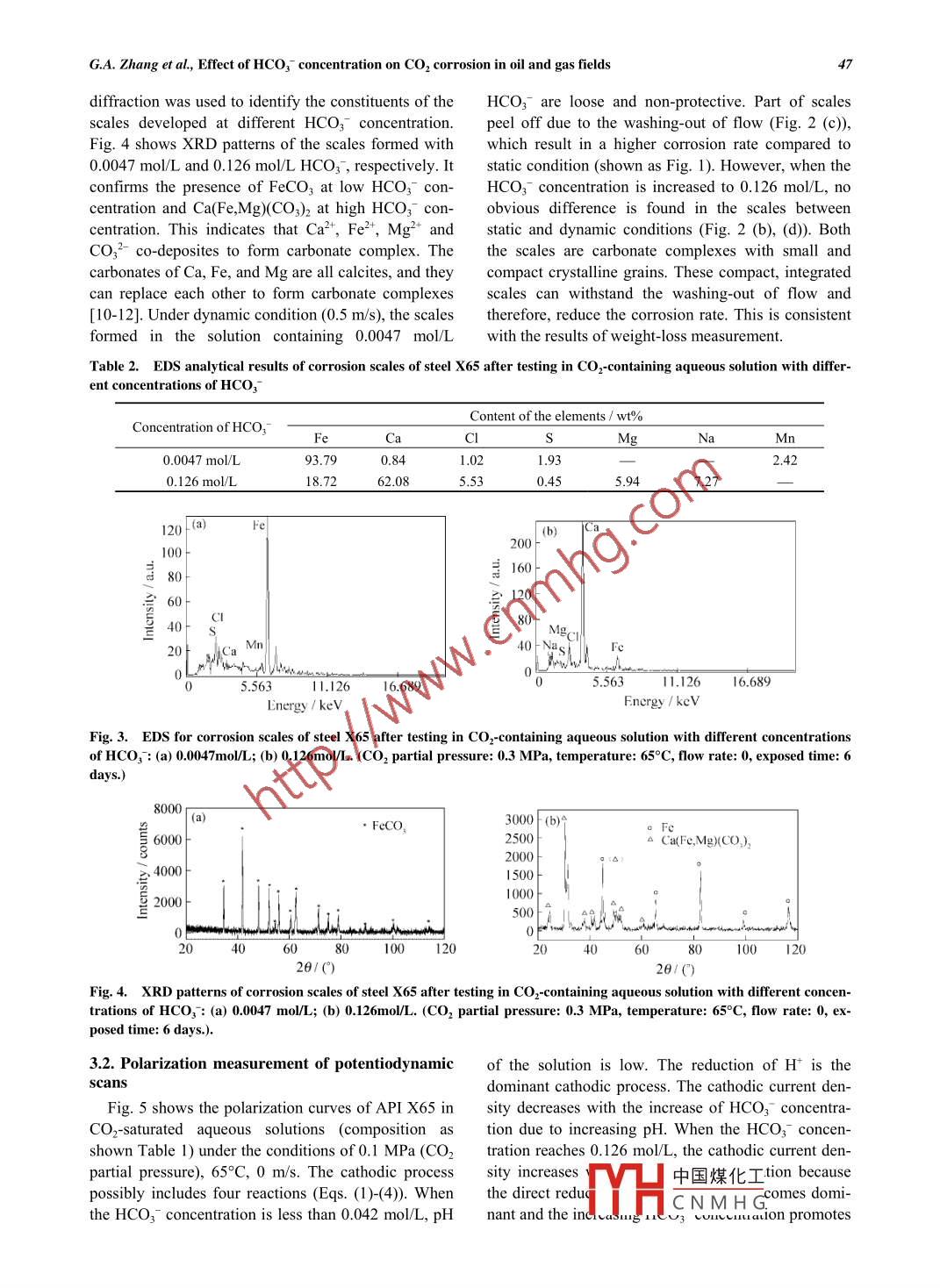 Journal of University of Science and Technology BeijingMaterialsVolume I3, Number I, February 2006, Page 44Effect of HCO3 concentration on CO2 corrosion in oil and gas fieldsGuoan Zhang, Minxu Lu, Chengwen Chai, and Yinshun WuCorrosion and Protection Center, University of Science and Technology Bejing, Beiing 100083, China(Received 2004-09-15)Abstract: The effect of HCO;~ concentration on CO2 corrosion was investigated by polarization measurement of potentiodynamicscans and weight-loss method. Under the conditions of high pressure and high temperature, the corrosion rate of steel X65 decreasedwith the increase of HCO3 concentration, while pH of solution increased. SEM, EDS, and XRD results of the corrosion scales indi-cated that the typical FeCO3 crystallite was found at low HCO;~ concentration but Ca(Fe,Mg)(CO3)2 was found at high HCO3~ con-centration. Ca2+ and Mg + are precipitated preferential to Fe2+ at high pH value. Potentiodynamic polarization curves showed that thecathodic current density decreases with the increase of HCO5 concentration at low HCO3 concentration. When the HCO3 concen-tration reaches 0. 126 mol/L, increasing HCO, concentration promotes cathodic reactions. Anodic behavior is an active process atlow HCO3- concentration and the anodic current density decreases with the increase of HCO3- concentration. An evident active- pas-sive behavior is exhibited in anodic process at 0.126 mol/L HCO3.Key words: oil and gas fields; carbon dioxide corrosion; bicarbonate concentration; polarization curves[This work was financially supported by the National Natural Science Foundation of China Key Program (No.50231020) and theNational Key Basic Research and Development Plan Program (No.G1999065004).]1. Introduction2HCO3- +2e -→2CO32-+H2(3)CO2 corrosion leads to the failure of pipelines and2H2O+2e - > 20H+H2(4)equipment and results in great economic loss andFe-→Fe2++ 2e(5)calamitous accidents. Leakage of crude oil due to CO2corrosion induces fire accidents, water resource, andThe anodic reaction is mainly the dissolution ofenvironmental pollution [1]. It has been one of theiron (Eq. (5)), though it maybe through several steps.most common corrosion problems in oil and gas in-During these processes, a corrosion scale (FeCO3) isdustry because of both a high corrosion rate andformed on the surface of the steel (Eqs. (6)-(8)) andsevere localized corrosion [2-4].the properties and morphologies of the scales influ-When CO2 dissolves into water at high temperatureence the corrosion rate significantly.and high pressure carbonic acid is formed, which isFe2+CO32 -→FeCO3(6)more corrosive to carbon steel than strong acid (suchFe2+ + 2HCO3 -→Fe (HCO3)2(7)as HC1) at the same pH value. Several mechanismshave been proposed for the dissolution of carbon steelFe (HCO3)2→FeCO3 + CO2 + H2O(8in CO2 aqueous solution. The main cathodic reactionsThe formation water in oil and gas fields usuallycan be summarized by four reactions [5-6]. At low pH,contains various salt solutions with different concen-H+ reduction is the dominant cathodic process becausetrations. The concentration of bicarbonate ions hasof the high concentration of H+ (Eq. (1)). When pHimportant effects on the CO2 corrosion of pipeline.increases to 4-6, the direct reductions of HCO3- andHowever, there are still many disputes about the effectH2CO3 become important (Eqs. (2) and (3)). At highof HCO3 concentration on CO2 corrosion. The studiesoverpotential, the dominant cathodic reaction changesof Videm et al. [7] indicated that HCO3- could in-to direct reduction of water (Eq. (4)).2H++ 2e→H2(1)crease the pH中國煤化工rate of car-bon steel. TheyYHCNMHGsivityincar-2H2CO3+2e -→2HCO3+H2(2)bon steel in a correct range of carbon dioxide, bicar-Corresponding author: Guoan Zhang, E-mail: zga2003@ 163.com.G.A. Zhang et al, Effect of HCO3 concentration on CO2 corrosion in oil and gas fields45bonate, sodium chloride, and potential. But a break-genated by bubbling super pure CO2 (99.95%) for4 hdown of this passivity would result in pitting. Jasinskiprior to the experiment. Coupons were then quickly[8] revealed that no obvious difference was found inmounted on the holder and the autoclave was closed.the corrosion rate of carbon steel though HCO; inOne more hour CO2 purge was carried out to deaeratecreases the pH of the solution. XU, et al. [9] suggestedoxygen entering in the mounting process. The tem-that when the temperature and HCO3 concentration isperature and pressure were raised to desired values.lower, the corrosion rate decreases due to inhibition ofAfter testing, coupons were removed from autoclavecathodic reactions. When the temperature is high, theand rinsed with deionized water. They were dividedincrease of HCO; concentration could inhibit the cor-into two groups: the coupons in group one were des-rosion of carbon steel at low concentration of HCO3~caled and the weight loss measured using an electronicwhile promoting corrosion at high concentration ofbalance with the precision of 0.1 mg; the coupons inHCO;.group two were not descaled. The morphology, com-The effect of HCO3- concentration on corrosion be-position and microstructure of the scales were ana-havior of carbon steel was investigated by means oflyzed by SEM, EDS, and XRD.polarization measurement of potentiodynamic scansA Solartron 1280 unit was used for electrochemicaland weight loss method. The morphology, composi-measurement in a bath. A three-electrode test cell wastion and microstructure of the scales were investigatedused with a platinum plane as the counter electrode. Aby Scanning Electron Microscope (SEM), Energysaturated calomel electrode (SCE) was chosen as theDispersive Spectroscopy (EDS), and X-Ray Diffusionreference electrode. All the potentials in this articleanalyzer (XRD).are relative to this reference electrode. API X65 steelrods (φ15 mmx5 mm) were employed as the working2. Experimentalelectrode with an exposed area of 1.77 cm2. CouponsAPI X65 pipeline ste