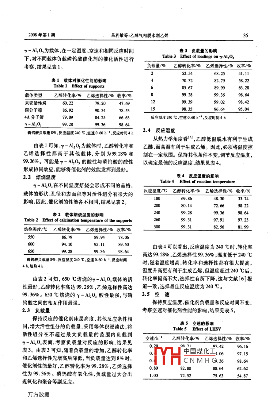 工業(yè)催化Jan.2008第16卷第1期INDUSTRIAL CATALYSISVol 16 No. 1有機(jī)化工與催化】乙醇?xì)庀嗝撍埔蚁﹨卫?王佳,何邦方,孫璐璐,劉純山(華東理工大學(xué)工業(yè)催化所,上海200237)摘要:研究了負(fù)載型磷鎢酸催化劑對(duì)乙醇?xì)庀嗝撍埔蚁┑拇呋饔?。在固定床反?yīng)器上考察了其性能,最佳條件:γ-AL2O3負(fù)載8%的磷鎢酸,溫度240℃,空遠(yuǎn)0.60h-。最佳工藝條件下乙醇轉(zhuǎn)化率達(dá)9928%,乙烯選擇性9.36%。催化劑穩(wěn)定性好,與傳統(tǒng)的液體無(wú)機(jī)酸相比具有催化活性高、環(huán)境友好和能耗低等優(yōu)點(diǎn)。關(guān)鍵詞:有機(jī)合成化學(xué);乙烯;磷鎢酸催化劑;乙醇?xì)庀嗝撍袌D分類號(hào):0643.36;0623411文獻(xiàn)標(biāo)識(shí)碼:A文章編號(hào):10081143(2008)01003403Synthesis of ethylene via vapor phase dehydration of ethanolLO Limin, WANG Jia, HE Bangfang, SUN Lulu, LIU Chunsha( Institute of Industrial Catalysis, East China University of Science and Technology, Shanghai 200237)Abstract: The catalytic behaviors of supported phosphotungstic acid catalyst were studied in a fixed-bedreactor. The optimal reaction condition was as follows: 8% phosphotungstic acid supported on y-A,O,240C, LHSV 0.60 h". Ethanol conversion of 99. 28% and ethylene yield of 99. 36% were obtainedunder the optimal condition. The catalyst is superior to conventional liquid inorganic catalysts, withhigher activity, environmental-friendliness, lower energy consumption and good stability.Key words: organic synthesis chemistry; ethylene; phosphotungsten catalyst; ethanol vapor-phase dehydrationCLC number: 0643. 36: 0623. 411 Document code: A Article ID: 1008-1143(2008 )01-0034-03乙烯是化工產(chǎn)品的重要原料,主要來(lái)源于石油,隨著石油資源的不斷枯竭,尋求新的乙烯生產(chǎn)x1實(shí)驗(yàn)部分藝勢(shì)在必行。乙醇來(lái)源豐富,可以利用天然發(fā)酵法催化劑的制備:以氧化鋁載體為例。氧化鋁球生產(chǎn)由乙醇脫水制乙烯的工藝會(huì)成為以后乙烯生在一定溫度下焙燒4h,然后用一定濃度的磷鎢酸水產(chǎn)的主要工藝。溶液浸漬過(guò)夜,120℃烘干4h,500℃焙燒4h,置于乙醇脫水制乙烯的催化劑報(bào)道很多23,主要干燥器待用。分為液體無(wú)機(jī)酸、固體酸、分子篩和雜多酸等。目采用固定床反應(yīng)器反應(yīng)器長(zhǎng)80cm,直徑20mm,前,大多數(shù)用于液相法脫水的催化劑都存在酸性催催化劑裝填40mL,溫度由可控硅電壓調(diào)整器控制,化劑腐蝕設(shè)備對(duì)反應(yīng)器的要求較高后處理較繁雜乙醇由恒流泵打入反應(yīng)器。和污染環(huán)境的問(wèn)題,而且催化劑比較昂貴,實(shí)際應(yīng)用2結(jié)果與討論上也有很多問(wèn)題。為了克服這些缺點(diǎn),本文將磷鎢酸負(fù)載在載體上4-3,用于乙醇的氣相脫水,并研究2.1載體的選擇了各種因素對(duì)反應(yīng)性能的影響。中國(guó)煤化工篩、44分子篩和CNMHG收稿日期2007;修回日期:2007-12-09作者簡(jiǎn)介:呂利敏年生,女,河南省周口市人,在讀碩士研究生,從事醇催化脫水方向研究。通訊聯(lián)系人:劉純2008年第1期呂利敏等:乙醇?xì)庀嗝撍埔蚁℡-AL2O3為載體,在一定溫度、空速和相同反應(yīng)時(shí)間3負(fù)載量的影響下,對(duì)不同載體負(fù)載磷鎢酸催化劑的催化活性進(jìn)行Table 3 Efect of loadings on rAL,O考察,結(jié)果見(jiàn)表1負(fù)載量/%乙醇轉(zhuǎn)化率/%乙烯選擇性/%收率/%52.5468.表1載體對(duì)催化性能的影響46870.3258.22Table 1 Effect of supports8999載體類型乙醇轉(zhuǎn)化率/%乙烯選擇性/%收率/%99果殼活性炭60.2279.2047.6999.0298.42碳分子篩78.53983596495044A分子篩79.0984.25反應(yīng)溫度240℃,空速0.60h-1,反應(yīng)時(shí)間4hy-A20,9.289.369.64磷鎢酸負(fù)載量8%,反應(yīng)溫度240℃空速060h,反應(yīng)時(shí)間4b2.4反應(yīng)溫度從熱力學(xué)角度看6,乙醇低溫脫水有利于生成由表1可知,y-Al2O3為載體時(shí),乙醇轉(zhuǎn)化率和乙醚而高溫有利于生成乙烯。因此,必須將溫度控乙烯選擇性都高于其他載體,分別為9.28%和制在一定范圍。保持其他條件不變調(diào)節(jié)反應(yīng)溫度936%。可能是y-AL2O3的酸性與磷鎢酸的酸性以確定最佳的反應(yīng)溫度結(jié)果見(jiàn)表4形成協(xié)同效應(yīng),能夠?qū)⒋呋瘎┑男馨l(fā)揮到最好。2.2焙燒溫度表4反應(yīng)溫度的影響y-Al2O3在不同溫度焙燒會(huì)形成不同的晶格,Table 4 Effect of reaction temperature載體的形狀、孔徑和表面積等對(duì)活性組分有很大的反應(yīng)溫度/℃乙醇轉(zhuǎn)化率%乙烯選擇性/%收率/%影響,因此,催化劑的性能各不相同,結(jié)果見(jiàn)表2。69.8648.3033.表2載體焙燒溫度的影響Table 2 Efect of calcination temperature of3197.91焙燒溫度℃乙醇轉(zhuǎn)化率/%乙烯選擇性八收99.3189947860095.11由表4可以看出,反應(yīng)溫度為240℃時(shí)轉(zhuǎn)化率高達(dá)9.28%,乙烯選擇性99.36%;溫度低于240℃磷鎢酸負(fù)載量8%,反應(yīng)溫度240℃,空速0.60h1,反應(yīng)時(shí)間4h焙燒4b時(shí),隨著溫度增高,轉(zhuǎn)化率和選擇性都有很大提高,溫度升高更有利于生成乙烯但溫度超過(guò)240℃后由表2可知,650℃焙燒的γ-Al2O3載體的活轉(zhuǎn)化率提高不大選擇性有所下降,這與文獻(xiàn)[6]報(bào)性最好,乙醇轉(zhuǎn)化率高達(dá)99.28%,乙烯選擇性高達(dá)道一致,選擇最佳反應(yīng)溫度為240℃。9.36%。650℃焙燒的y-AL2O3酸性最強(qiáng),與磷25空速鎢酸之間的相互作用最強(qiáng)保