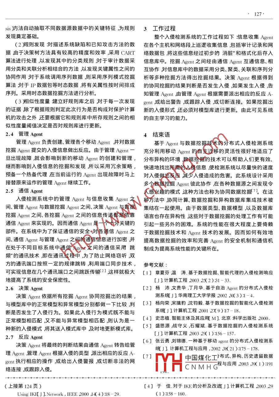 第14卷第3期微機發(fā)展Vol.14_ No. 32004年3月.Microcomputer DevelopmentMar. 2004IKE分析與改進郭豐娟,宋雨(華北電力大學計算機科學與工程系河北保定071003 )摘要因特網(wǎng)密鑰交換協(xié)議( IKE )是-種網(wǎng)絡信息安全協(xié)議。作為-種混合型協(xié)議,由于其復雜性,它的安全性引起了人們的重視。文中針對其安全性進行了探討。介紹了密鑰交換協(xié)議IKE的相關知識及其工作原理,在此基礎上分析了中間人攻擊、重放攻擊及拒絕服務攻擊的基理結合IKE的工作過程分析IKE遭受三種攻擊的方式和可能性提出用聯(lián)鎖協(xié)議”在IKE中防中間人攻擊”通過消息ID防重放攻擊”并研究了用來防止拒絕服務攻擊”的Cookie的生成問題。關鍵詞密鑰交換協(xié)議,中間人攻擊重放攻擊拒絕服務攻擊中圖分類號:TP393.08文獻標識符A文章編號:1005 - 3751( 2004 )03 - 0123 - 02Analysis and Improvement of Internet Key ExchangeGUO Feng-juan ,SONG Yu( Department of Computer Sci. and Eng. , North China Electric Power University ,Baoding 071003 , China)Abstract : IKE is one of proools of Internet information' s security. It is complex because of the construction of itself ,so many re-searchers pay much attention to its security. And in the paper study the security of it. First analyzes the mechanism of IKE and introducesthree kinds of attacks man in middle attack denial of service by floding attack and resending attack. Then discusses the manner and pos-sibility of IKE' s suffering from them. At last gives some advices of improvement such as information ID for resending attack and somesuggestion for Cookie for denial of service.Key words :KE protcol :man in middle attack ;resending attack :denial of service計算機網(wǎng)絡信息安全的研究日益受到人們的重視,網(wǎng)模式。 在主模式下發(fā)起者和響應者一共交換六條消息并絡安全協(xié)議成為其中很重要的一部分。IKE 指定了一個提供 了身份驗證和參數(shù)配置上的靈活性積極模式只交換Internet團體的Internet 標準協(xié)議為網(wǎng)絡安全服務。三條消息其最大的優(yōu)點是速度快,但要以降低協(xié)議的安全性為代價。IKE第二階段的交換有快速模式和新組交1 IKE 介紹及分析換模式二種。第二階段的交換必須以第-階段交換的順I(yè)KE作為因特網(wǎng)密鑰交換協(xié)議,目的是以--種保護的利進行為基礎。方式來協(xié)商安全聯(lián)盟并為它提供經(jīng)過驗證的密鑰生成材IKE第二階段的安全性在很大程度.上依賴于第-階料。它創(chuàng)建在由ISAKMP定義的框架上,沿用了OAK-段密鑰材料的安全性因此文中僅就IKE第一階段進行探LEY的密鑰交換模式以及SKEME的共享和密鑰更新技寸。術還定義了自己的兩種密鑰交換方式。1.2 IKE交換過程1.1 IKE工作原理IKE主模式是ISAKMP身份保護交換的實現(xiàn)交換的文獻1給出了IKE的具體說明。IKE 協(xié)商分為兩個六條消息中 第1 2條消息協(xié)商雙方通信的-些安全關聯(lián)階段第. -階段在ISAKMP進程間建立一個安全 并經(jīng)過驗內(nèi)容、規(guī)范及算法等3 A兩個消息交換Diffie - Hellman的證的信道,同時為IPsecSA(第二階段)產(chǎn)生密鑰材料,即公共值和必要的輔助數(shù)據(jù)例如:當前時間(nonce);此后,完成ISAKMP安全聯(lián)盟( ISAKMP SA ) ;第二階段指協(xié)商通信雙方生成SKEYID并進而衍生一組密鑰,包括加密具體服務所需安全聯(lián)盟,這些服務可以是IPsec 或任何其材料中國煤化工密鑰SKEYID - a以及加它需要密鑰材料以及/或者協(xié)商參數(shù)的服務。秘密JHCNMH:消息5,6是由所協(xié)商算IKE第一階段提供了兩種不同的模式:主模式和積極驗證。積極模式只用了主模式一半的消息,而且不提供身份保護,因此其協(xié)商能力受到很大限制。收稿日期2003 - 08 -21作者簡介郭豐礱救雅一)女 山西人碩士研究生研究方向為軟主模式或積極模式中都允許四種不同的驗證方法數(shù)字簽名、標準公鑰加密、修訂公鑰加密以及預共享件工程。124●微機發(fā)展第14卷密鑰。如此B在第(4)步完整接收整個報文后進行解密驗證就會發(fā)現(xiàn)錯誤從而終止傳輸。2 IKE 安全性分析及改進2.2重 放攻擊的防范2.1中間人攻擊的防范重放攻擊也屬子中間人攻擊”的一種是指攻擊者獲如前文所述,IKE 第一階段用Diffie - Hellman算法生得 了鑒別分組的副本以后將它傳輸?shù)剿哪康牡刂?。收成密鑰材料SKEYID ,IKE中用來驗證消息及保護消息機到了 重復的鑒別IP 分組可能會以某種方式中斷服務或出密性的密鑰材料都是由它衍生出來的,因此Diffe-Hell-現(xiàn)其它一些意想不到的后 果。man的安全性直接影響到IKE交換過程的安全性。該算.針對這一攻擊文獻2]中提出利用消息ID發(fā)起者和法交換過程如圖1所示。響應者之間傳送的每-條消息都應該有不同的消息ID這用戶A用戶B .樣在收到消息時檢測是否存在另-個正在進行的具有同選取q, 0樣ID的消息交換如果存在則被視為一個應答消息再進選取私有密鑰Xs一步 解密內(nèi)容發(fā)現(xiàn)是非法的則將其丟棄。筆者認為在此基礎上還要求發(fā)送者消息的編號不允許出現(xiàn)循環(huán),例如消計算公鑰Ya= a x[q. a ;Y3|選取私有密鑰 X息編號從232-1~1當消息編號到達232-1時發(fā)送者應Y計算公鑰Y= a刈終止這個SA并且協(xié)商具有新密鑰的新的SA否則就會出計算會話密鑰現(xiàn)許多合法分組具有同樣序號的情況。K= YjXK=YaXb2.3拒絕服 務攻擊的防范圖1 Diffe - Hllman算法交換過程拒
