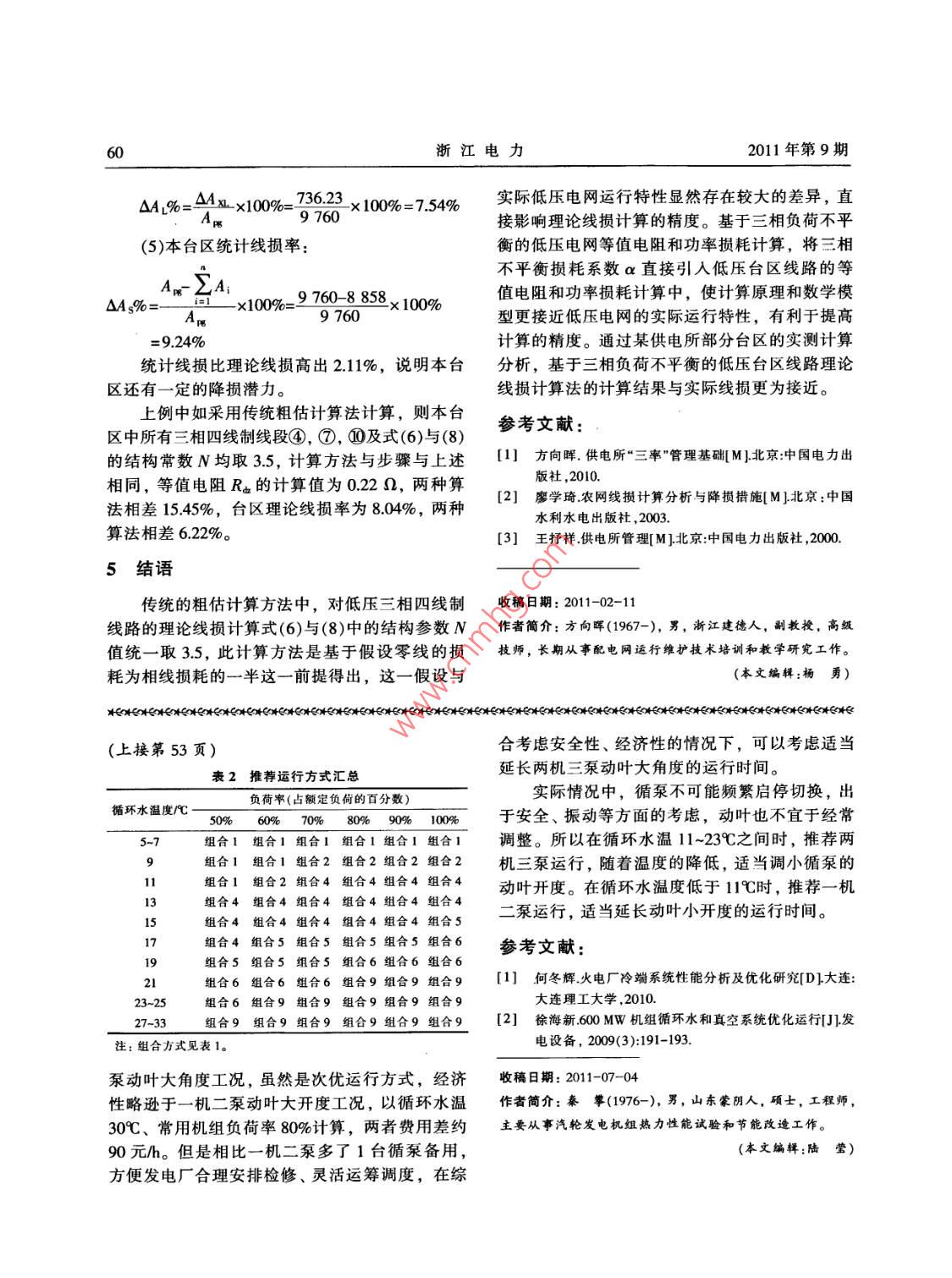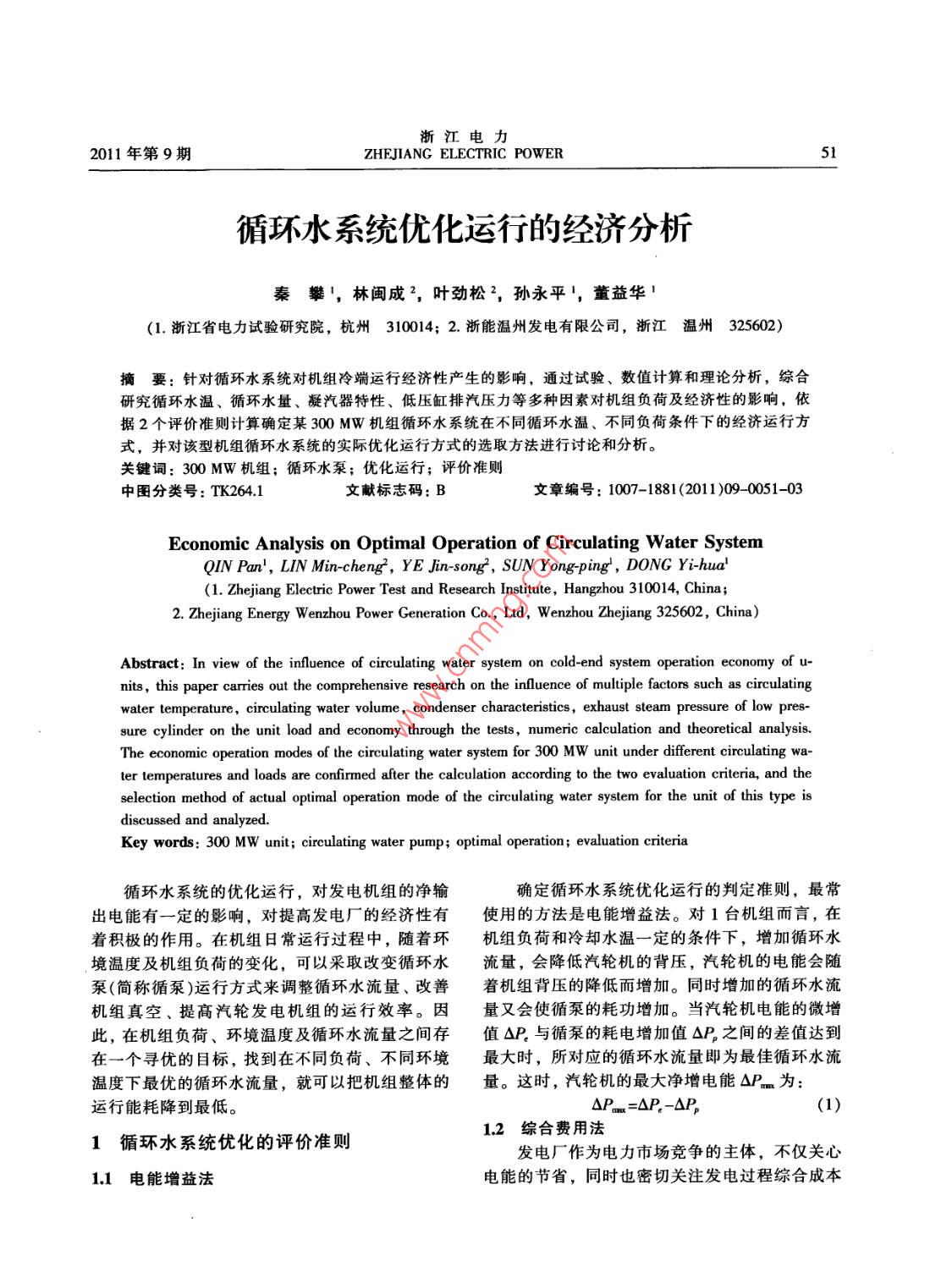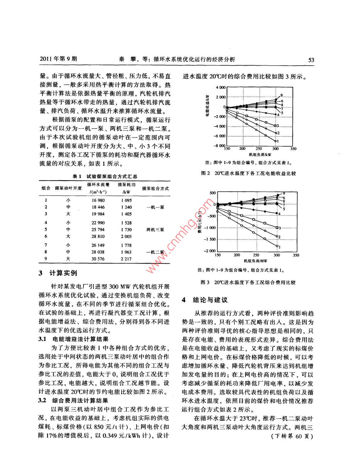 浙江電力2011年第9期ZHEJIANG ELECTRIC POWER51循環(huán)水系統(tǒng)優(yōu)化運行的經(jīng)濟(jì)分析秦攀',林閩成了,葉勁松",孫永平,董益華'(1.浙江省電力試驗研究院,杭州310014; 2. 浙能溫州發(fā)電有限公司,浙江溫州325602)摘要: 針對循環(huán)水系統(tǒng)對機(jī)組冷端運行經(jīng)濟(jì)性產(chǎn)生的影響,通過試驗、數(shù)值計算和理論分析,綜合研究循環(huán)水溫、循環(huán)水量、凝汽器特性、低壓缸排汽壓力等多種因素對機(jī)組負(fù)荷及經(jīng)濟(jì)性的影響,依據(jù)2個評價準(zhǔn)則計算確定某300MW機(jī)組循環(huán)水系統(tǒng)在不同循環(huán)水溫、不同負(fù)荷條件下的經(jīng)濟(jì)運行方式,并對該型機(jī)組循環(huán)水系統(tǒng)的實際優(yōu)化運行方式的選取方法進(jìn)行討論和分析。關(guān)鍵詞: 300 MW機(jī)組;循環(huán)水泵;優(yōu)化運行;評價準(zhǔn)則中圖分類號: TK264.1文獻(xiàn)標(biāo)志碼: B文章編號: 1007-1881(2011 )09 -0051-03Economic Analysis on Optimal Operation of Circulating Water SystemQIN Pan', LIN Min-cheng, YE Jin-song", SUN Yongping' , DONG Yi-hua'(1. Zhejiang Electric Power Test and Research Institute, Hangzhou 310014, China;2. Zhejiang Energy Wenzhou Power Generation Co., Lid, Wenzhou Zhejang 325602, China)Abstract; In view of the influence of circulating water system on cold-end system operation economy of u-nits, thispaper carries out the comprehensive research on the inluence of multiple factors such as circulatingwater temperature, circulating water volume,condenser characteristics, exhaust steam pressure of low pres-sure cylinder on the unit load and economy through the tests, numeric calculation and theoretical analysis.The economic operation modes of the circulating water system for 300 MW unit under different circulating wa-ter temperatures and loads are confirmed after the calculation according to the two evaluation criteria, and theselection method of actual optimal operation mode of the circulating water system for the unit of this type isdiscussed and analyzed.Key words: 300 MW unit; circulating water pump; optimal operation; evaluation criteria循環(huán)水系統(tǒng)的優(yōu)化運行,對發(fā)電機(jī)組的凈輸確定循環(huán)水系統(tǒng)優(yōu)化運行的判定準(zhǔn)則,最常出電能有一定的影響,對提高發(fā)電廠的經(jīng)濟(jì)性有使用的方法是電能增益法。對1臺機(jī)組而言,在著積極的作用。在機(jī)組日常運行過程中,隨著環(huán)機(jī)組負(fù)荷和冷卻水溫一定的條件下,增加循環(huán)水境溫度及機(jī)組負(fù)荷的變化,可以采取改變循環(huán)水流量,會降低汽輪機(jī)的背壓汽輪機(jī)的電能會隨泵(簡稱循泵)運行方式來調(diào)整循環(huán)水流量、改善著機(jī)組背壓的降低而增加。同時增加的循環(huán)水流機(jī)組真空、提高汽輪發(fā)電機(jī)組的運行效率。因量又會使循泵的耗功增加。當(dāng)汽輪機(jī)電能的微增此,在機(jī)組負(fù)荷、環(huán)境溫度及循環(huán)水流量之間存值A(chǔ)P。與循泵的耗電增加值△P,之間的差值達(dá)到在一個尋優(yōu)的目標(biāo),找到在不同負(fù)荷、不同環(huán)境最大時,所對應(yīng)的循環(huán)水流量即為最佳循環(huán)水流溫度下最優(yōu)的循環(huán)水流量,就可以把機(jī)組整體的量。這時,汽輪機(jī)的最大凈增電能△P為:運行能耗降到最低。SP =△P.- OP,(1)1.2 綜合費用法1循環(huán)水系統(tǒng)優(yōu)化的評價準(zhǔn)則發(fā)電廠作為電力市場競爭的主體,不僅關(guān)心1.1 電能增益法電能的節(jié)省,同時也密切關(guān)注發(fā)電過程綜合成本52浙江電力2011年第9期的降低。在機(jī)組負(fù)荷和冷卻水溫一定的條件下,0.02[改變循環(huán)水流量,使綜合成本煤耗率最低的冷端尋優(yōu)方法,稱為綜合費用法。該方法考慮了煤和-0.04電不同能量價值的綜合煤耗率,也把發(fā)電廠供電-0.06煤耗、上網(wǎng)電價和標(biāo)煤價格有機(jī)地聯(lián)系起來,可i -0.08以更加直觀地分析判斷發(fā)電廠的節(jié)能經(jīng)濟(jì)指標(biāo)。-0.1采取該優(yōu)化評價方法時,需把由背壓降低得-0.12520凝汽器壓力Pa .到增益的發(fā)電機(jī)電能,根據(jù)機(jī)組供電煤耗和標(biāo)煤價格,折算得到煤耗收益費用OFm,再根據(jù)上網(wǎng)圖1某300MW機(jī)組滿負(fù)荷時凝汽器壓力與機(jī)組出力的修正曲線電價,推算得到循泵的損耗費用AFa,兩者之差達(dá)最大值時就是發(fā)電廠最優(yōu)成本費用所對應(yīng)的循時,再降低背壓,機(jī)組出力已不再增加,汽輪機(jī)環(huán)水運行方式。這時,汽輪機(jī)的最佳綜合費用末級葉柵發(fā)生“阻塞",即動葉斜切部分的膨脹能△F..為:力已經(jīng)被利用完。如果再降低背壓,蒸汽將在動OF =△Fm-AFs(2)葉斜切部分之外膨脹,末級焓降與電能均不再增以上2種方法是從微增電能和綜合煤耗2個加。若背壓繼續(xù)降低,對應(yīng)的飽和溫度下降,使方面來體現(xiàn)優(yōu)化運行方式的差異,雖然因標(biāo)煤價最低壓力級加熱器的抽汽量增大,致使末級電能格和上網(wǎng)電價的變化而會略有不同,但變化趨勢減小,此時汽輪機(jī)的背壓稱為極限背壓,對應(yīng)的是-致的。通過以上2種方法對某300 MW機(jī)組真空即為極限真空。當(dāng)出現(xiàn)上述極限背壓時,如的循環(huán)水系統(tǒng)進(jìn)行試驗比較,并進(jìn)行計算分析,果水溫還要降低,則可減少循泵運行臺數(shù),減小給出最優(yōu)的運行