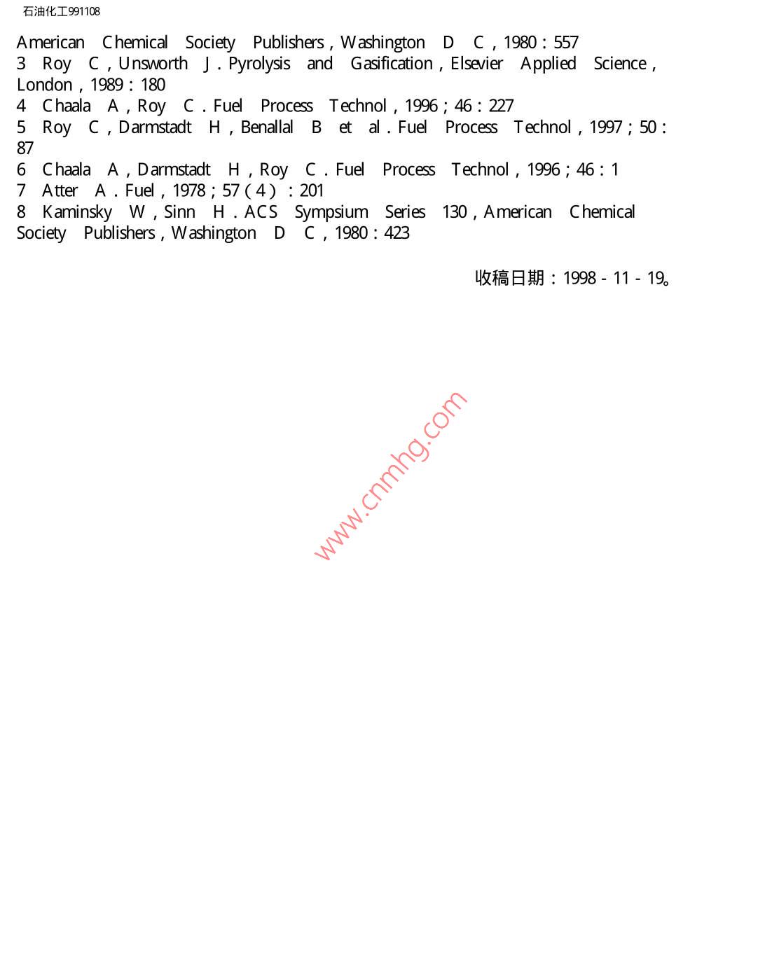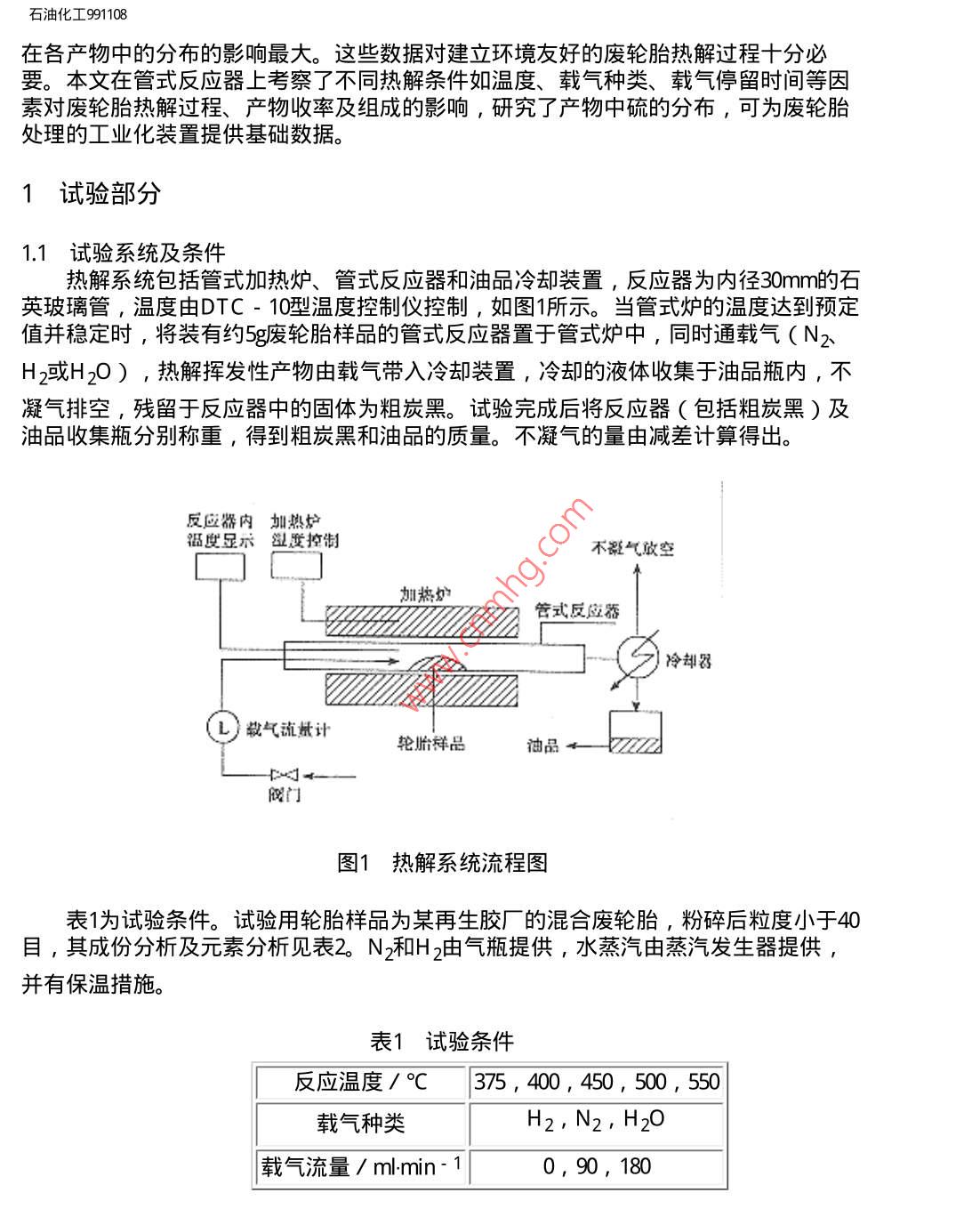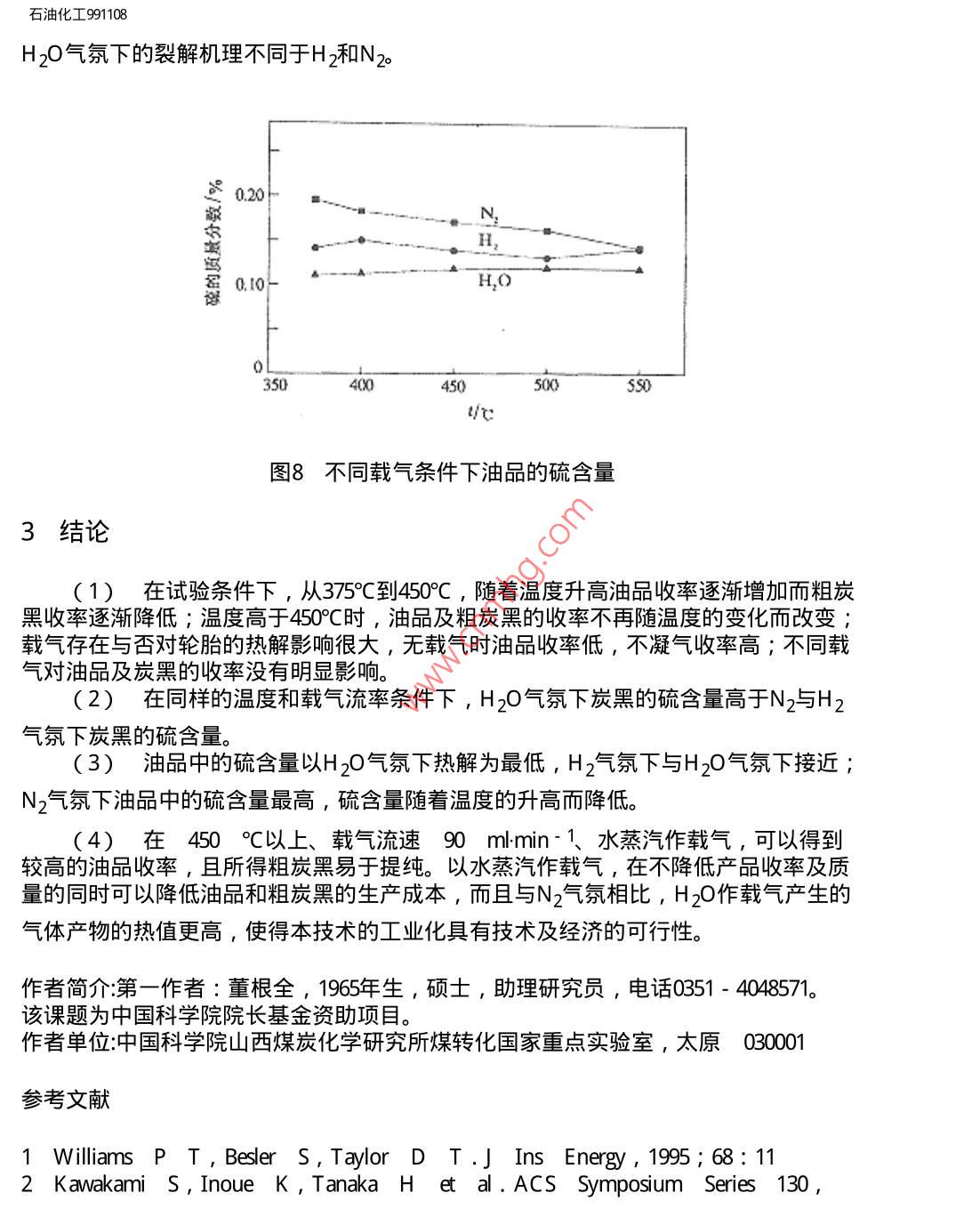 石油化工991108舊石油化工D解知5 PETROCHEMICAL TECHNOLOGY數(shù)化期刊1999年第28卷第11期Vol.28No.111999DIGITIZED PERIODICAL廢輪胎熱解過程及產(chǎn)物的研究董根全崔洪楊建麗程愛蓮劉振宇摘要采用管式反應(yīng)器對廢輪胎熱解過程進(jìn)行了研究??疾炝藦U輪胎在375~550°及在N2H2或H2◎0氣氛下的熱解過程,研究了熱解條件對產(chǎn)物收率和組成的影響。結(jié)果表明,熱解溫度高于450°C時輪胎熱解完全,油品收率高,粗炭黑中有機(jī)物含量很低。載氣對熱解產(chǎn)物收率影響較大。氣體停留時間對產(chǎn)物收率影響很小。不同的載氣氣氛對產(chǎn)物的質(zhì)量影響較大,在H2和N2氣氛下熱解所產(chǎn)生的粗炭黑含硫量最低,水蒸汽熱解產(chǎn)生的油品中的硫含量最低。關(guān)鍵詞廢輪胎熱解炭黑A Study on Pyrolysis of Used TireDONG Gen-quan, CUIHong, YANG Jian-li, CHENG Ai-lian and LIU Zhen-yu( Institute of Coal Chemistry, Chinese Academy of Sciences, Taiyuan 030001)Abstract Pyrolysis of used tirewas studied. the results indicate that tire can be completelypyrolized at temperatures higher than 450C. The use of a carrier gas increases the oil yield anddecreases gas and carbon black yield. The pyrolysis yields are independent of the chemicalnature of the carrier gas. the property of the carrier gas, how-ever, affects the productquality. Use of H2O results in relative low surfur content in oil and high surfur content incarbon blackKeywords: used tire, pyrolysis, carbon black輪胎一般由天然橡膠、合成橡膠、炭黑、化學(xué)助劑(如抗降解劑、硫化劑和溶劑油)等組成。由于廢輪胎難以降解,它的堆放既占用土地又對環(huán)境造成污染,因此廢輪胎的處理利用得到廣泛的重視。目前廢輪胎的處理利用包括:原型及改制使用,這主要用于輪胎翻新或制作再生膠粉,但隨著科技的發(fā)展,質(zhì)優(yōu)價廉的合成橡膠使輪胎翻新和再生膠的市場愈來愈小,用輪胎粉作配料生產(chǎn)道路瀝青也因為成本較高而無法大量使用;將廢輪胎和其它廢棄物一起焚燒以蒸汽或電力的形式回收能量,雖可以大量處理廢輪胎,但資源利用率不高。從烴類利用的角度講,廢輪胎的熱解可以得到高價值的產(chǎn)物,如油品、化學(xué)品、炭黑及高熱值的燃料氣,因此熱處理技術(shù)受到了日益的重視[1-5]。國外已建立一些熱處理裝置[1~3,8],如采用流化床或旋轉(zhuǎn)窯等,但這些過程所需反應(yīng)溫度較高,且以氣態(tài)產(chǎn)物為主。另外除了熱解反應(yīng)器的影響之外載氣種類及載氣流速對輪胎熱解產(chǎn)物的收率和產(chǎn)品組成也有較大的影響,特別是對硫石油化工991108在各產(chǎn)物中的分布的影響最大。這些數(shù)據(jù)對建立環(huán)境友好的廢輪胎熱解過程十分必要。本文在管式反應(yīng)器上考察了不同熱解條件如溫度、載氣種類、載氣停留時間等因素對廢輪胎熱解過程、產(chǎn)物收率及組成的影響,研究了產(chǎn)物中硫的分布,可為廢輪胎處理的工業(yè)化裝置提供基礎(chǔ)數(shù)據(jù)試驗部分1.1試驗系統(tǒng)及條件熱解系統(tǒng)包括管式加熱爐、管式反應(yīng)器和油品冷卻裝置,反應(yīng)器為內(nèi)徑30mm的石英玻璃管,溫度由DTC-10型溫度控制儀控制,如圖1所示。當(dāng)管式爐的溫度達(dá)到預(yù)定值并穩(wěn)定時,將裝有約5g廢輪胎樣品的管式反應(yīng)器置于管式爐中,同時通載氣(N2H2或H2),熱解揮發(fā)性產(chǎn)物由載氣帶入冷卻裝置,冷卻的液體收集于油品瓶內(nèi),不凝氣排空,殘留于反應(yīng)器中的固體為粗炭黑。試驗完成后將反應(yīng)器(包括粗炭黑)及油品收集瓶分別稱重,得到粗炭黑和油品的質(zhì)量。不凝氣的量由減差計算得岀。反應(yīng)器內(nèi)加熱爐溫度顯示沮度控制不凝氣放空加熱爐多管式反應(yīng)器冷卻①D氣流旗計輪胎科品油品閥門圖1熱解系統(tǒng)流程圖表1為試驗條件。試驗用輪胎樣品為某再生膠廠的混合廢輪胎,粉碎后粒度小于40目,其成份分析及元素分析見表2Nz和H2由氣瓶提供,水蒸汽由蒸汽發(fā)生器提供,并有保溫措施。表1試驗條件反應(yīng)溫度/%375,400,450,500,550載氣種類H2,N2,H20載氣流量/ ml- min0,90,180石油化工991108表2廢輪胎的成份分析及元素分析成份分析1),質(zhì)量分?jǐn)?shù)/%元素分析,質(zhì)量分?jǐn)?shù)/%化學(xué)助劑橡膠炭黑灰份「C「H02)N「56.3359.9427.805.9382.777.757.500.61.291)由熱分析天平測得;2)減差值。.2分析方法輪胎樣品、炭黑的元素組成由 Vario el微量元素分析儀測定;油品中硫含量采用上海計算技術(shù)研究所生產(chǎn)的帶FPD檢測器的GC-920色譜儀測定,色譜柱為上煉-1,長0.5m,內(nèi)徑2.3mm,載體為經(jīng)酸洗處理的 Chromosorb,粒度為80~100目,固定液為UCW982,汽化室溫度310°℃,檢測器溫度330°℃C,初始柱溫30°C,升溫速率為10°/min,終溫320°C;輪胎樣品的熱失重數(shù)據(jù)用 Setaraαm公司τGAΩ熱分析儀測定;炭黑中硫的形態(tài)由XRD測定。2結(jié)果與討論21熱解條件對產(chǎn)物收率的影響2.1.1溫度的影響在N2氣氛下,表觀氣體停留時間為1min時,溫度對熱解產(chǎn)物收率的影響見圖2在375~450°℃,隨著溫度的升高,油品的收率從35%(質(zhì)量分?jǐn)?shù),下同)增加到59%粗炭黑的收率從59%降至3%;不凝氣的收率為3%~7%,且隨溫度的升高而略有升高。當(dāng)熱解溫度高于450℃時,熱解產(chǎn)物的收率基本不變,表明熱解溫度為450°C時,廢輪胎中橡膠已完全熱解。不同條件下所得粗炭黑的